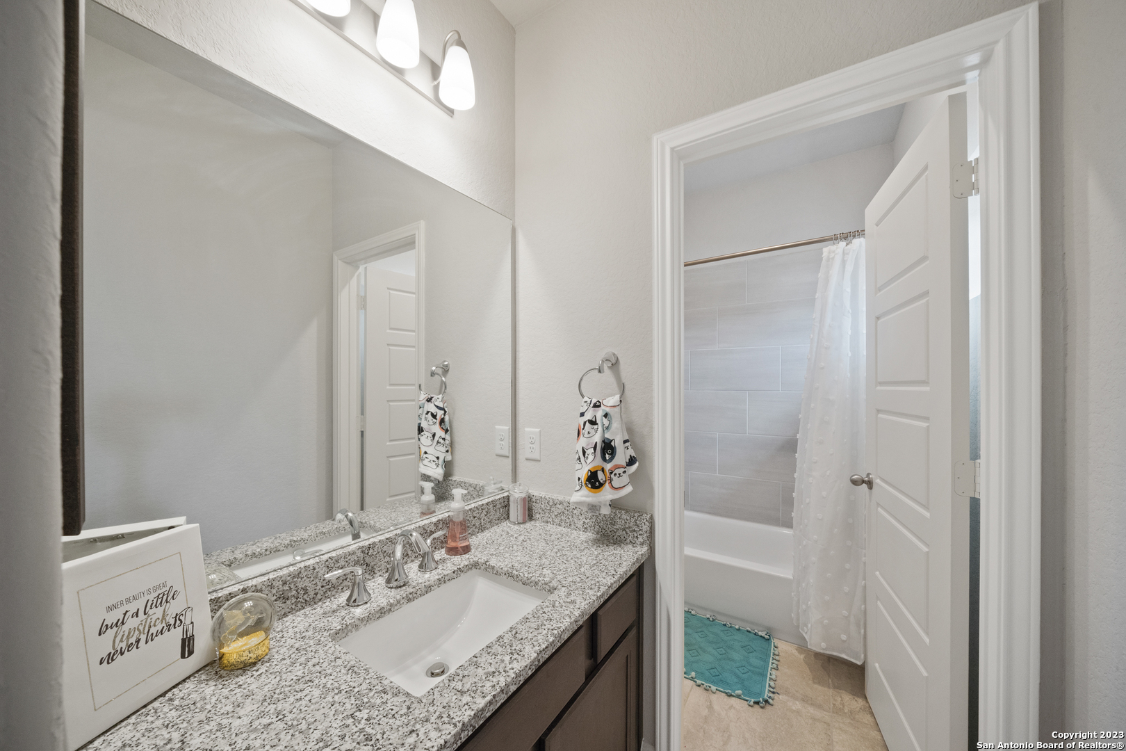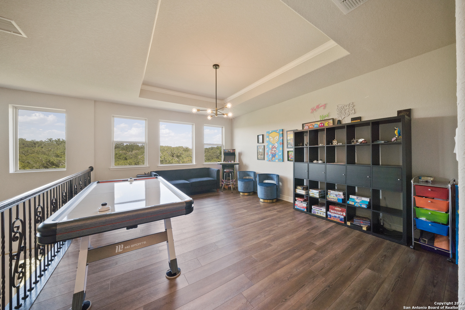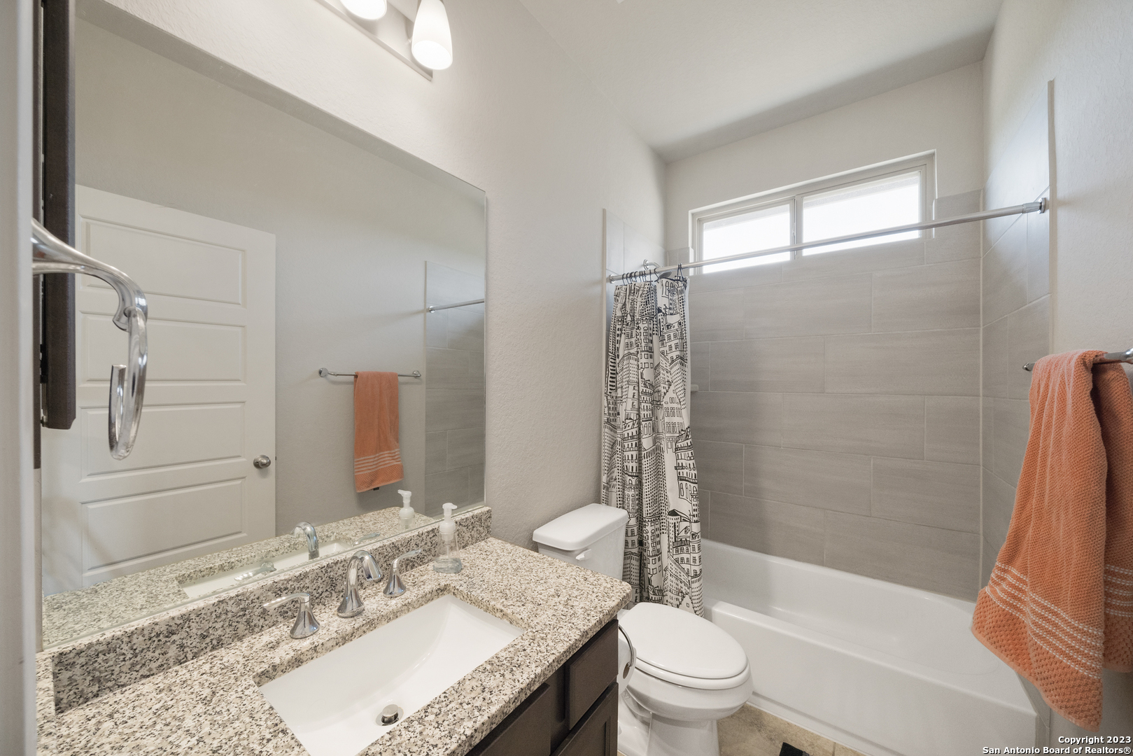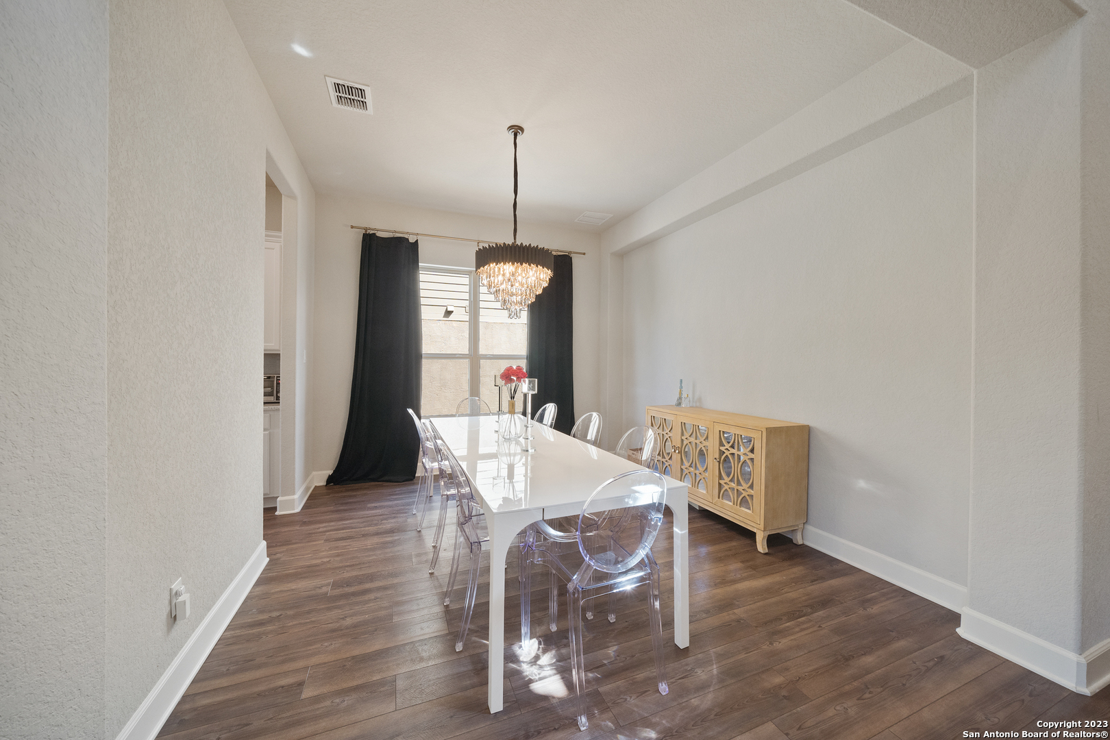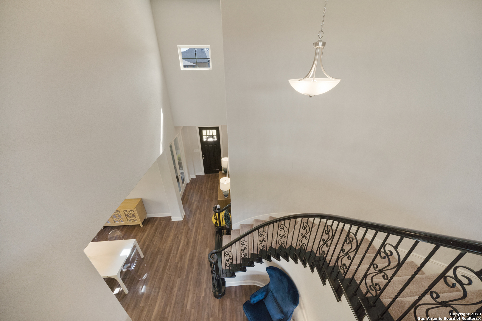 This exquisite two-story home boasts 5 bedrooms, 3.5 baths, plus a study, and spans 3763 square feet of living space. Nestled on a cul-de-sac street, it occupies a 60x120 lot with stunning views of a greenbelt to the rear. The home welcomes with great curb appeal and vinyl wood flooring throughout. The foyer opens up to a striking rear view, and the study is strategically placed at the entrance for privacy. The first floor features an open layout with high ceilings, a spacious living room leading into a gourmet kitchen complete with a large island, stainless steel appliances, built-in oven, microwave, 42-inch cabinets, and ample counter space. A butler's pantry and walk-in pantry connect to the formal dining room, adorned with an elegant chandelier. The lower level also includes a half bath, utility room, and a luxurious master suite with an ensuite bathroom offering dual vanities, a makeup vanity, walk-in closet, linen closets, garden tub, and separate shower. Ascend the wrought iron staircase to discover a game room with captivating views, four additional bedrooms with walk-in closets, and two full bathrooms featuring tiled floors and tub-shower combos. The upper bedrooms are carpeted and well-maintained. Additional amenities include a three-car garage, full sprinkler system, water softener, reverse osmosis, and security system. The backyard's covered patio is perfect for enjoying a glass of wine or morning coffee with views of the rear bluff. Conveniently located near HEB, TX-211, Loop 1604, and an elementary school, the neighborhood offers a pool and playground. This home has much more to offer, making it must-see.