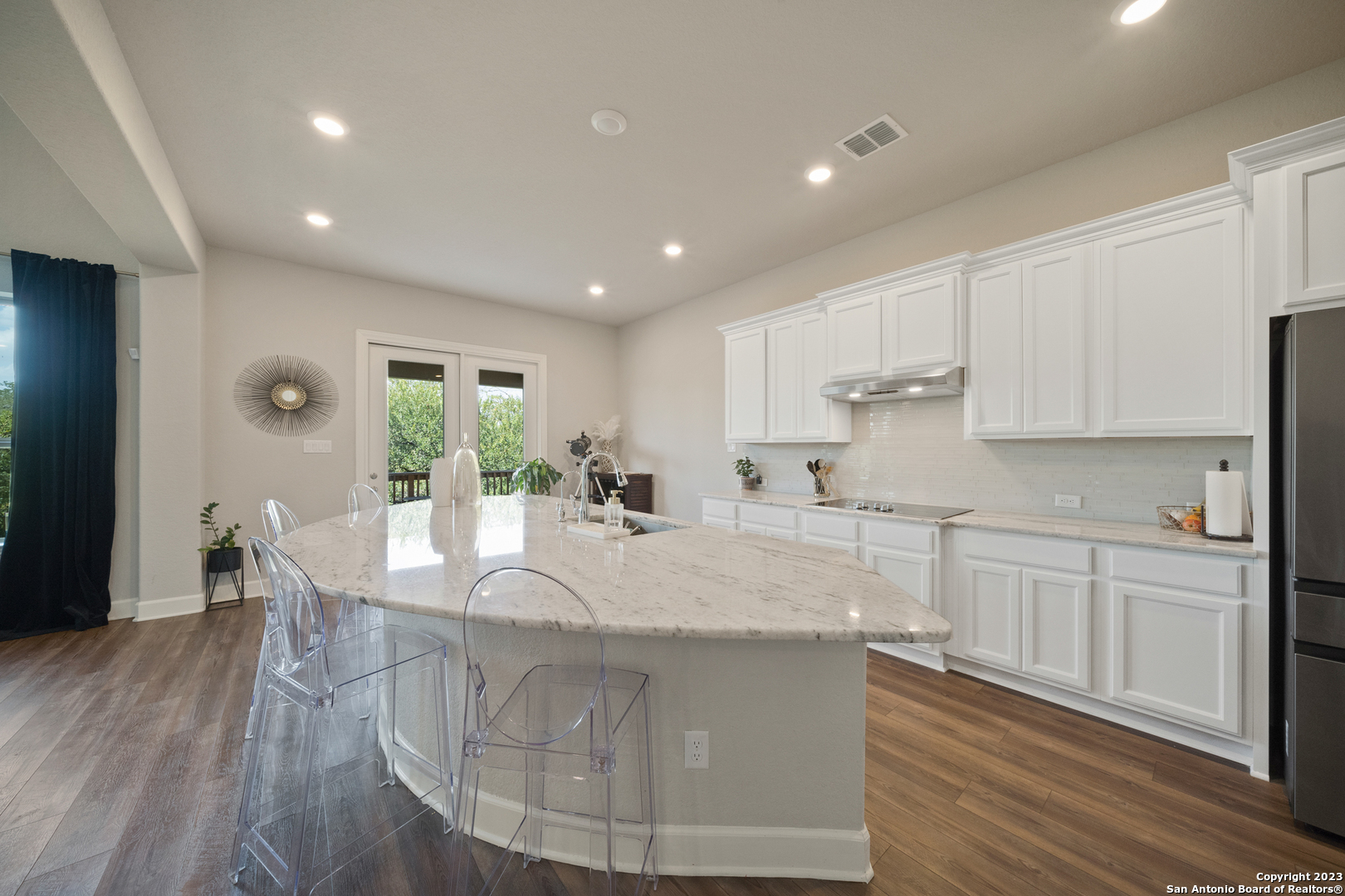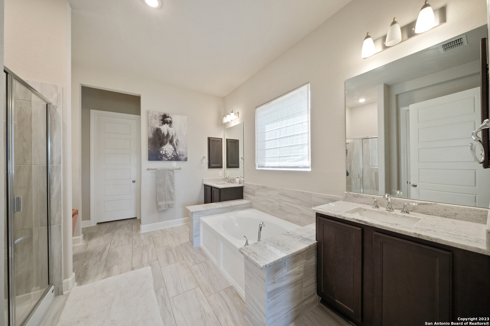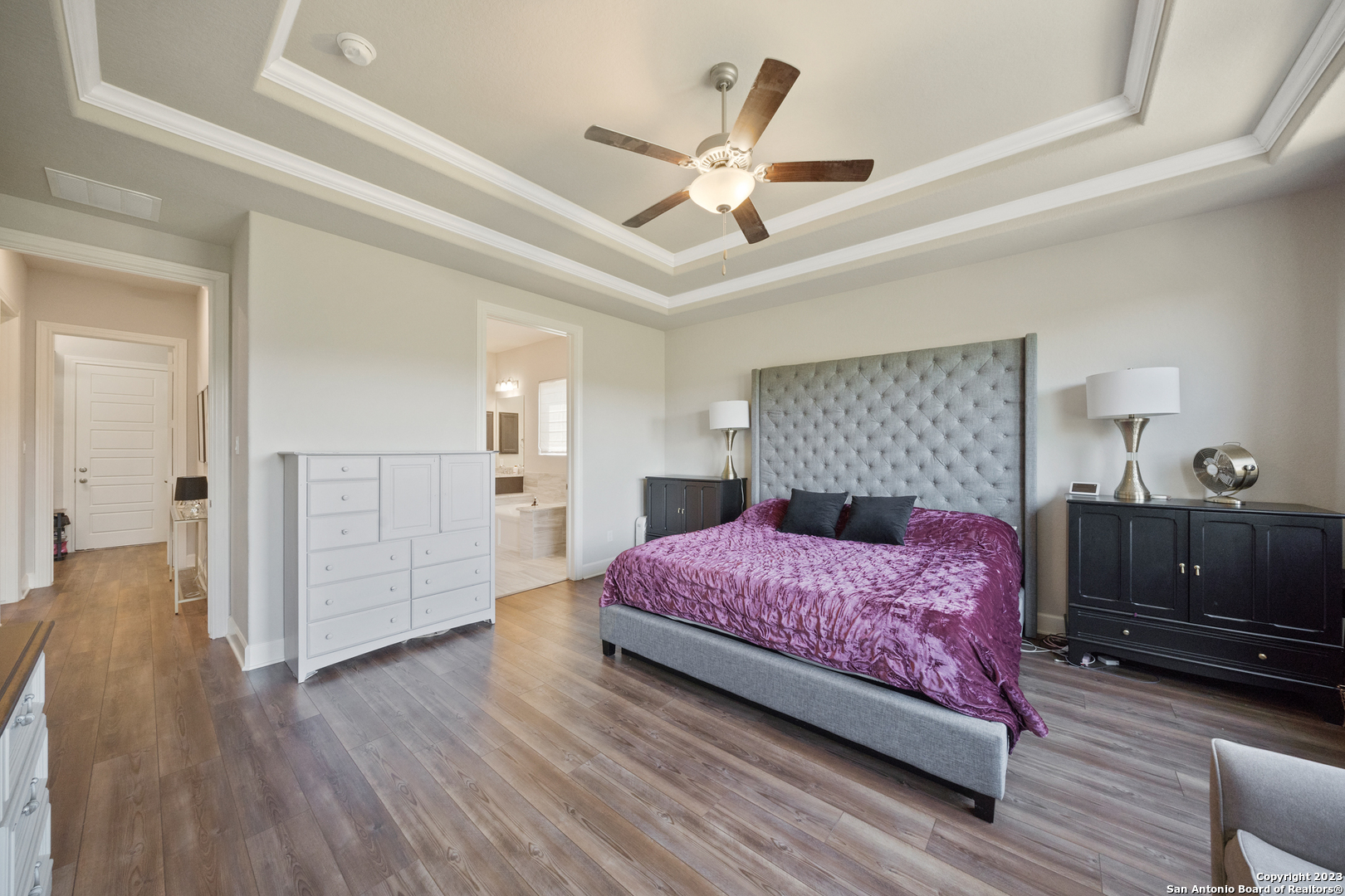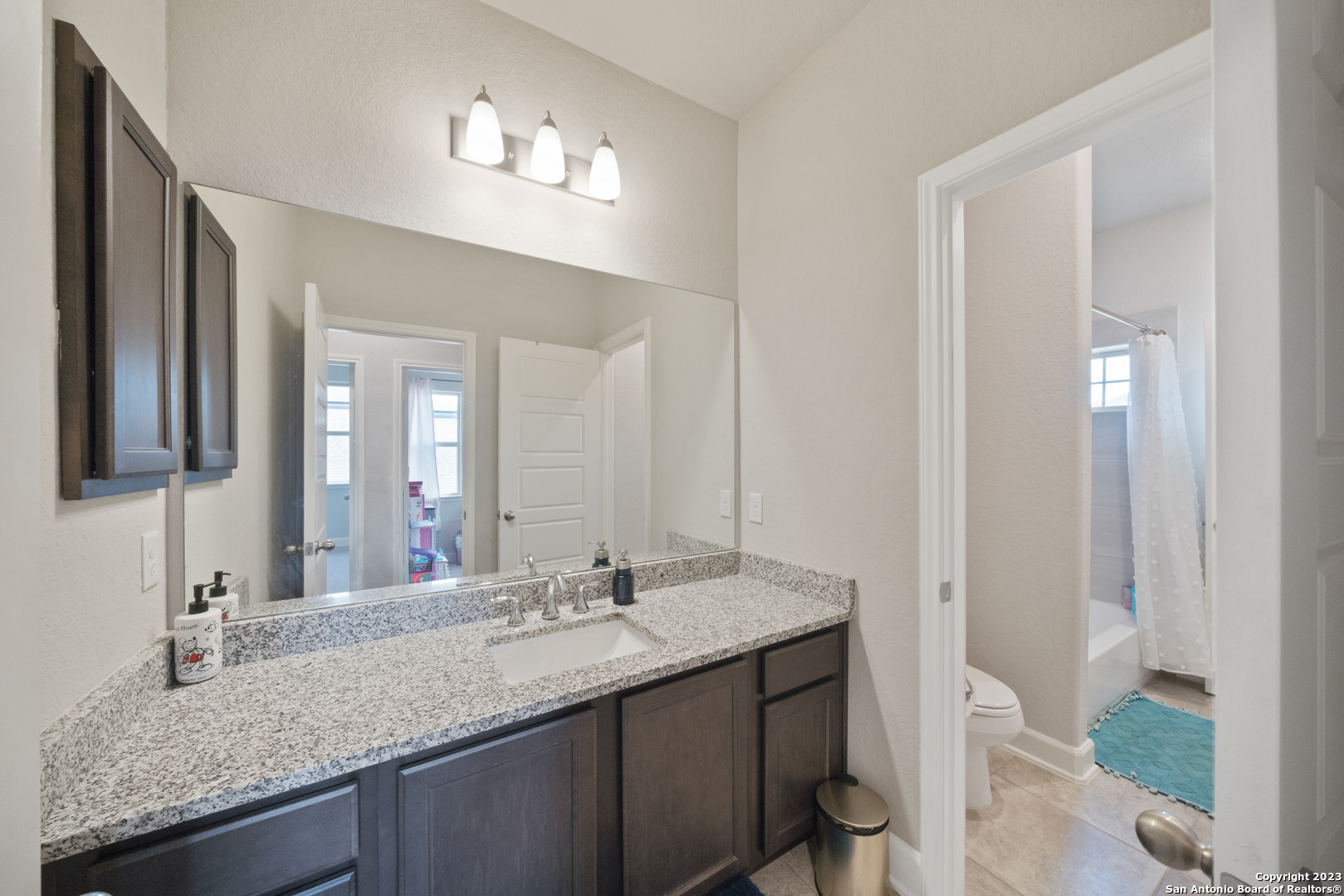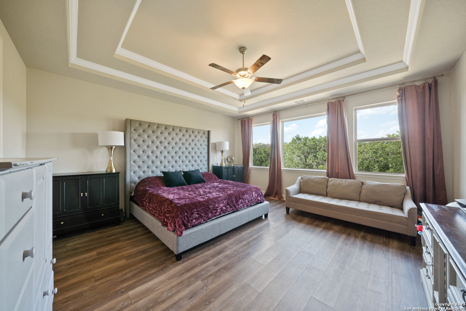 This exquisite two-story home boasts 5 bedrooms, 3.5 baths, plus a study, and spans 3763 square feet of living space. Nestled on a cul-de-sac street, it occupies a 60x120 lot with stunning views of a greenbelt to the rear. The home welcomes with great curb appeal and vinyl wood flooring throughout. The foyer opens up to a striking rear view, and the study is strategically placed at the entrance for privacy. The first floor features an open layout with high ceilings, a spacious living room leading into a gourmet kitchen complete with a large island, stainless steel appliances, built-in oven, microwave, 42-inch cabinets, and ample counter space. A butler's pantry and walk-in pantry connect to the formal dining room, adorned with an elegant chandelier. The lower level also includes a half bath, utility room, and a luxurious master suite with an ensuite bathroom offering dual vanities, a makeup vanity, walk-in closet, linen closets, garden tub, and separate shower. Ascend the wrought iron staircase to discover a game room with captivating views, four additional bedrooms with walk-in closets, and two full bathrooms featuring tiled floors and tub-shower combos. The upper bedrooms are carpeted and well-maintained. Additional amenities include a three-car garage, full sprinkler system, water softener, reverse osmosis, and security system. The backyard's covered patio is perfect for enjoying a glass of wine or morning coffee with views of the rear bluff. Conveniently located near HEB, TX-211, Loop 1604, and an elementary school, the neighborhood offers a pool and playground. This home has much more to offer, making it must-see.