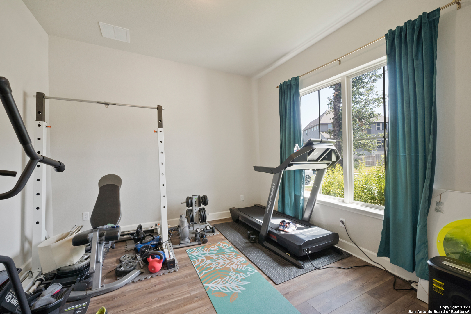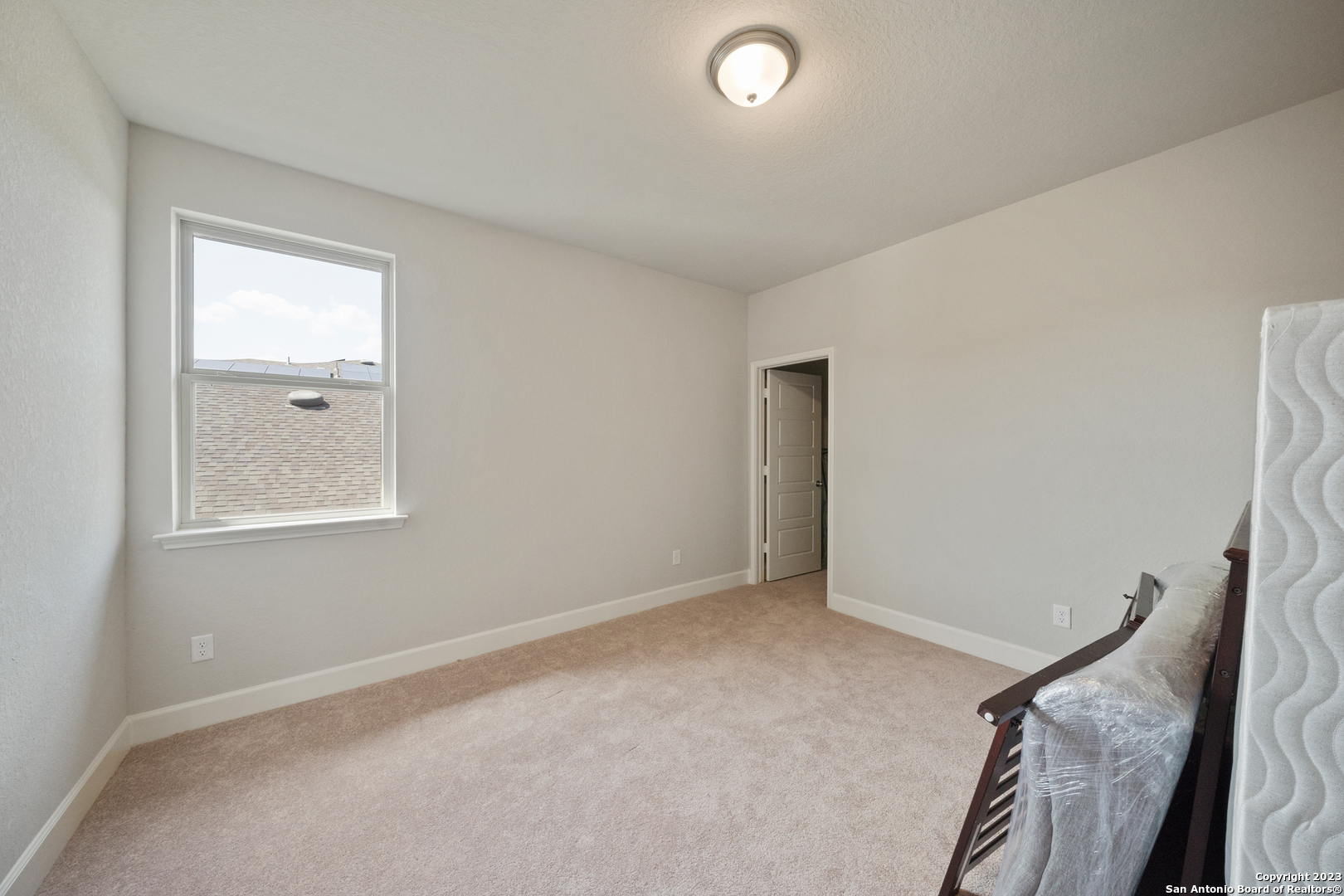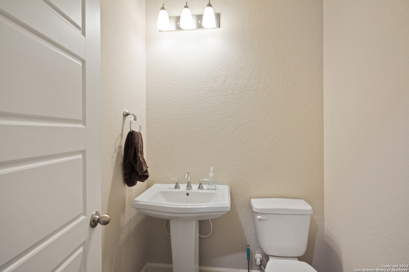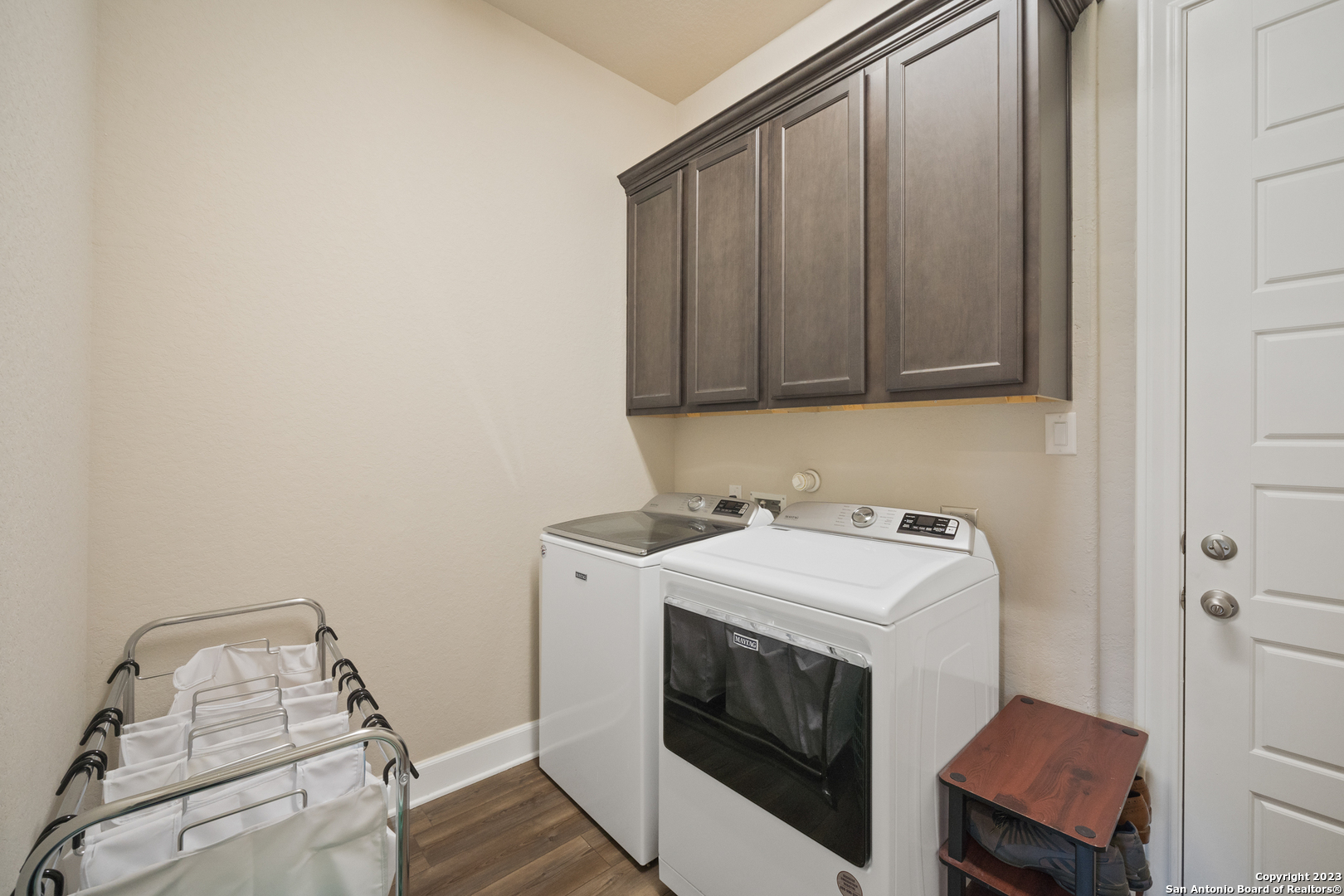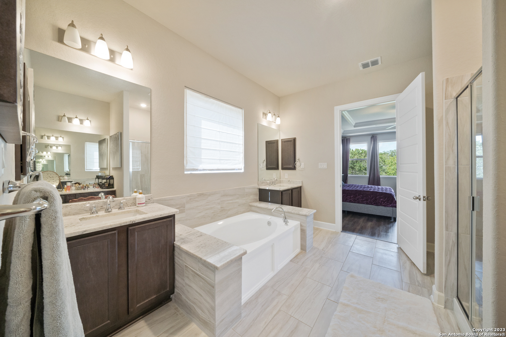 This exquisite two-story home boasts 5 bedrooms, 3.5 baths, plus a study, and spans 3763 square feet of living space. Nestled on a cul-de-sac street, it occupies a 60x120 lot with stunning views of a greenbelt to the rear. The home welcomes with great curb appeal and vinyl wood flooring throughout. The foyer opens up to a striking rear view, and the study is strategically placed at the entrance for privacy. The first floor features an open layout with high ceilings, a spacious living room leading into a gourmet kitchen complete with a large island, stainless steel appliances, built-in oven, microwave, 42-inch cabinets, and ample counter space. A butler's pantry and walk-in pantry connect to the formal dining room, adorned with an elegant chandelier. The lower level also includes a half bath, utility room, and a luxurious master suite with an ensuite bathroom offering dual vanities, a makeup vanity, walk-in closet, linen closets, garden tub, and separate shower. Ascend the wrought iron staircase to discover a game room with captivating views, four additional bedrooms with walk-in closets, and two full bathrooms featuring tiled floors and tub-shower combos. The upper bedrooms are carpeted and well-maintained. Additional amenities include a three-car garage, full sprinkler system, water softener, reverse osmosis, and security system. The backyard's covered patio is perfect for enjoying a glass of wine or morning coffee with views of the rear bluff. Conveniently located near HEB, TX-211, Loop 1604, and an elementary school, the neighborhood offers a pool and playground. This home has much more to offer, making it must-see.