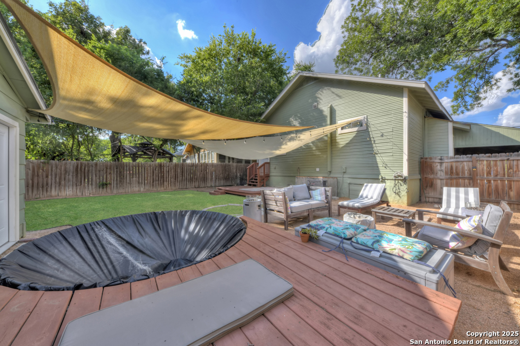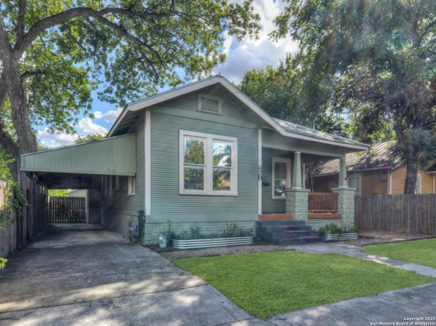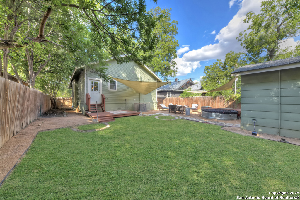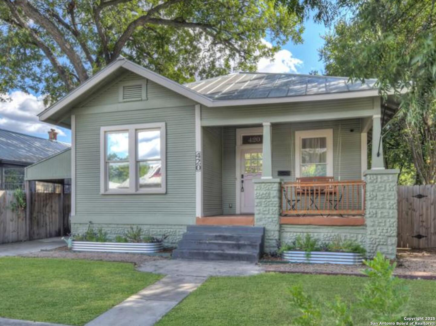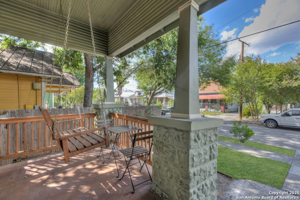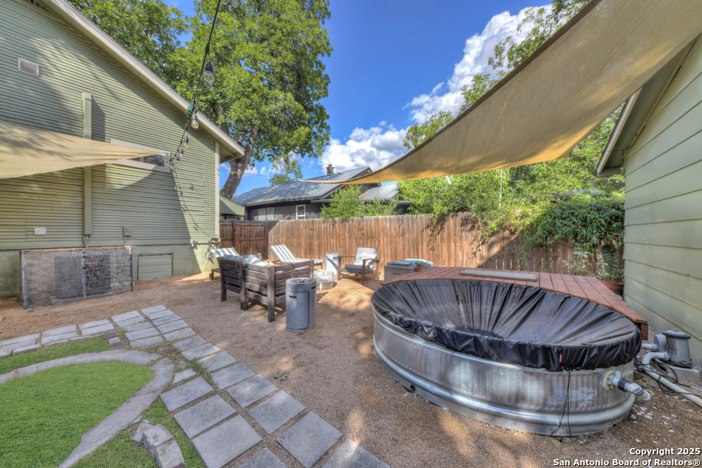 Experience the perfect blend of classic character and modern updates with this 3 bed, 2 bath single story home nestled in the heart of the Lavaca historic neighborhood. Built in 1910, the property highlights its heritage with reclaimed wood doors plus wood flooring while thoughtful renovations provide comfort and style for today's lifestyle. Step inside to an open floor plan that connects the living, dining, and kitchen areas. The island kitchen includes floor to ceiling cabinetry, leather finish granite counters and modern appliances. The primary bath, transformed in 2024, features an oversized shower and double vanity. The updated 2nd bedroom contains a wall length wardrobe with lighted storage. The exterior impresses with recently painted siding and a durable metal roof. A detached alley accessed two-car garage plus single-car carport provide ample parking rarely seen in this area. The backyard oasis is enclosed by a privacy fence and shaded by mature trees. Enjoy warm Texas days in the unique cowboy pool, perfect for cooling off or hosting gatherings. Located near downtown San Antonio and the vibrant King William district, this home places you close to the city's best dining, shopping, and entertainment, while still offering a peaceful retreat in a historic setting.