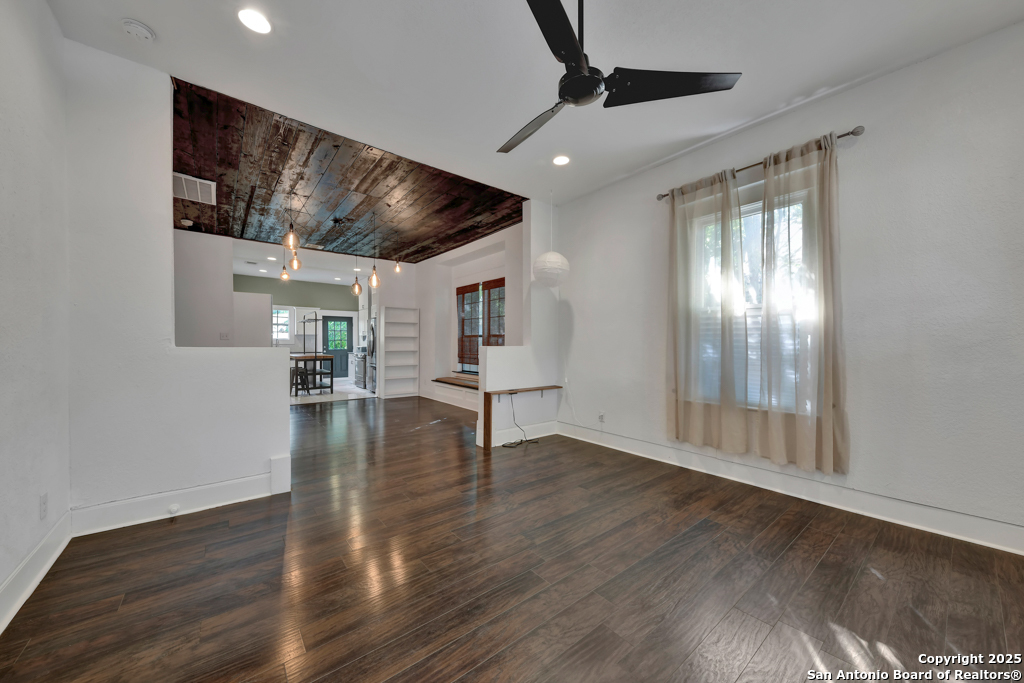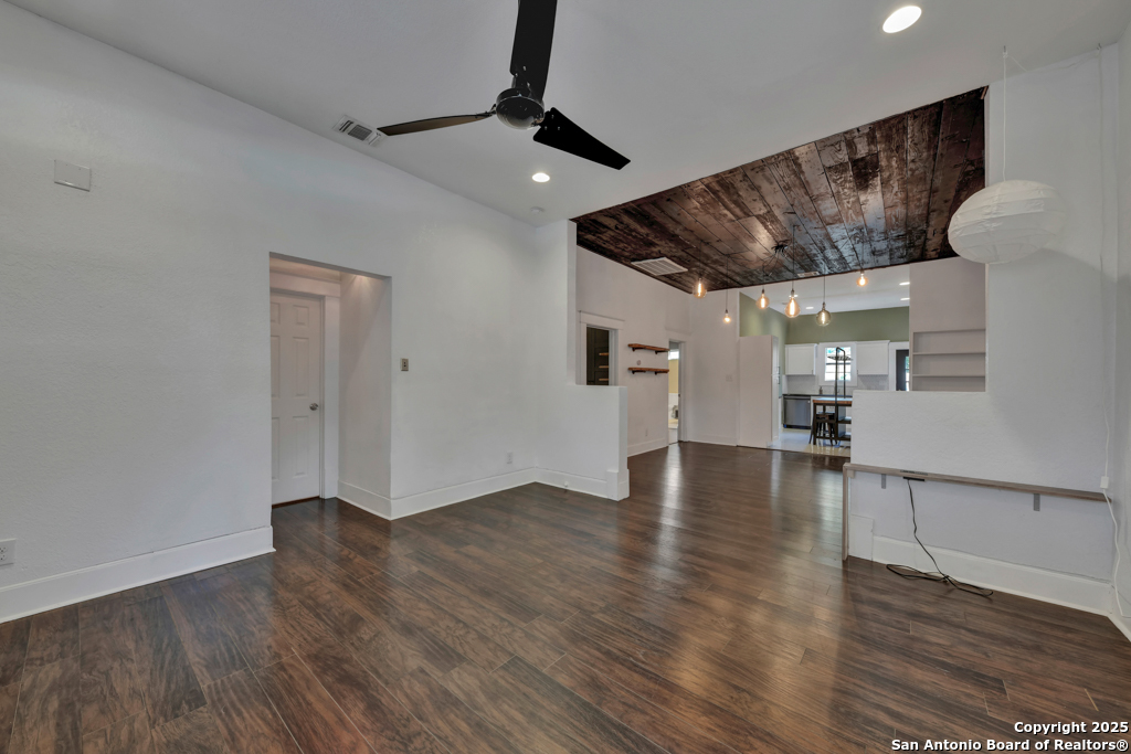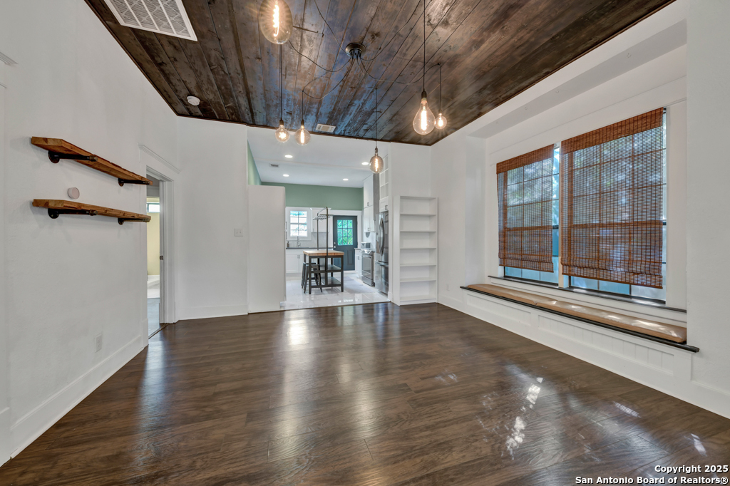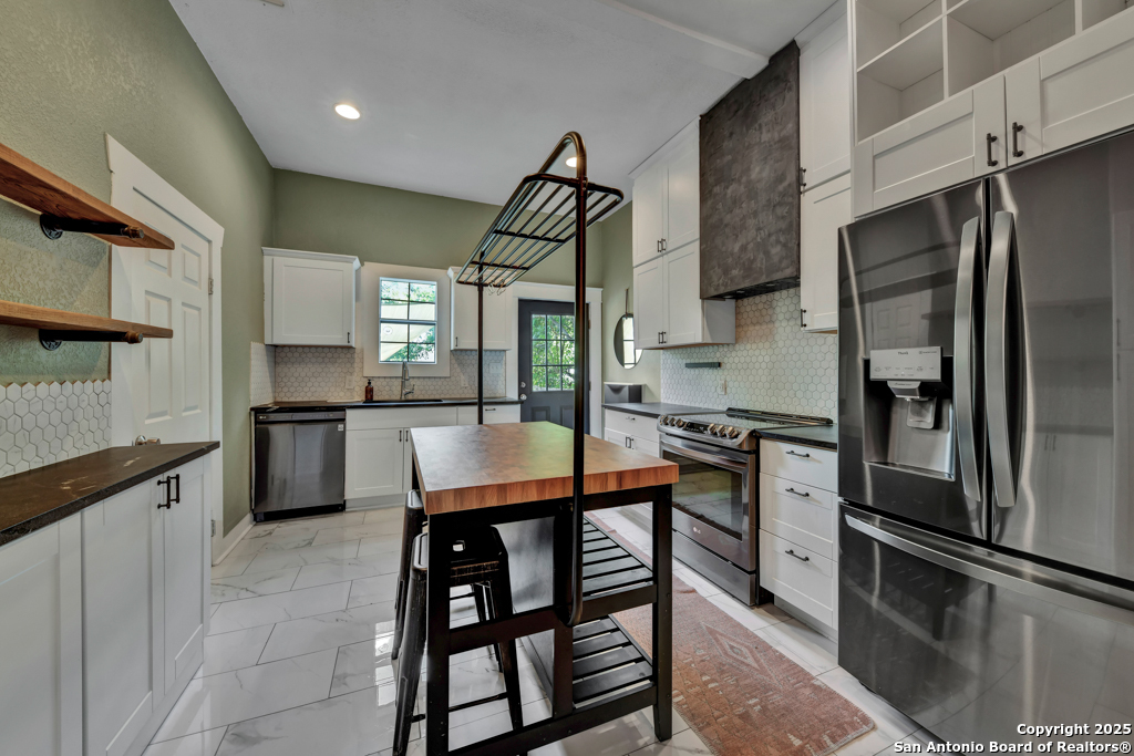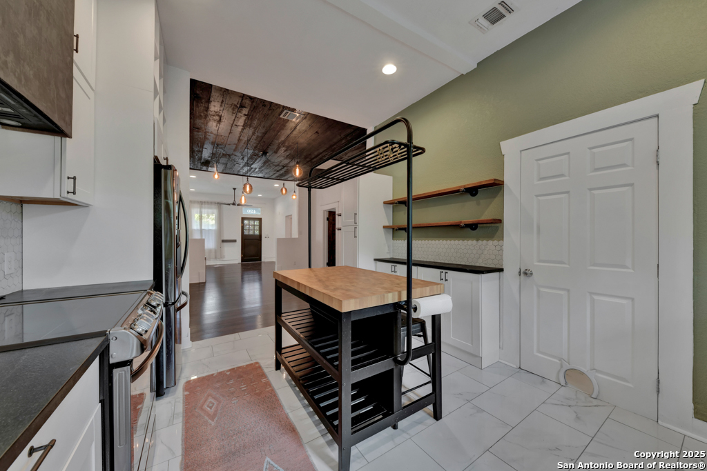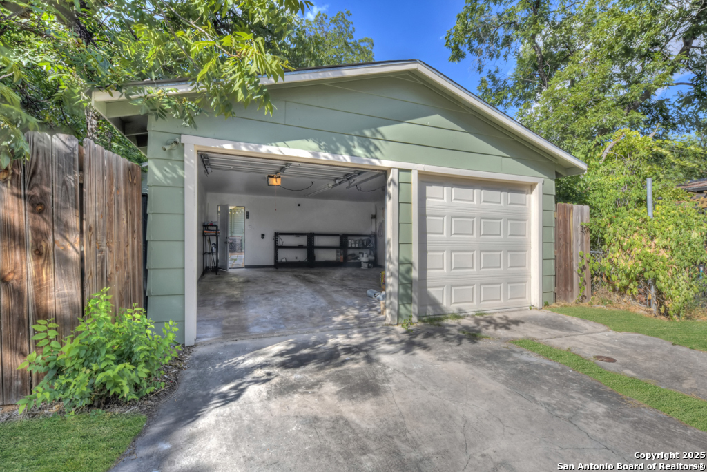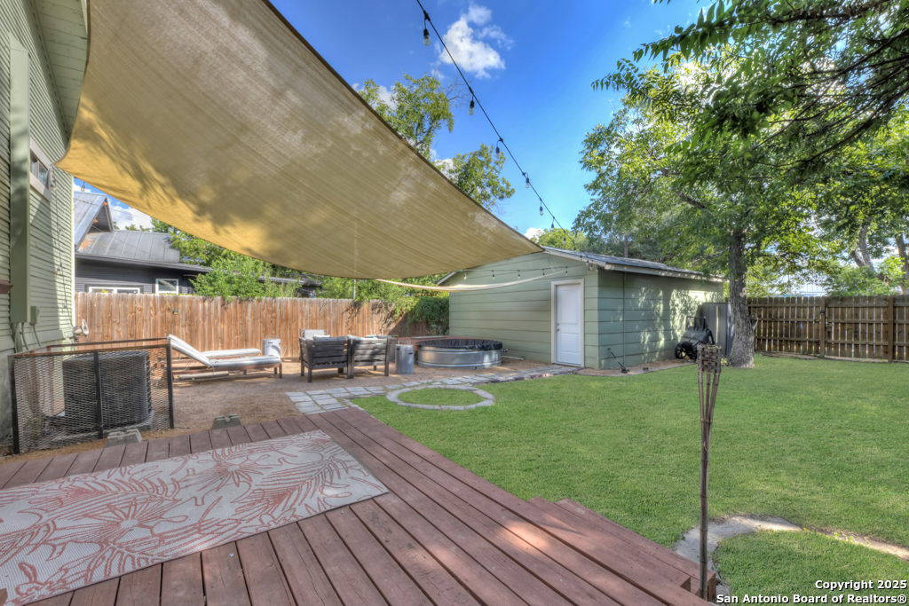 Experience the perfect blend of classic character and modern updates with this 3 bed, 2 bath single story home nestled in the heart of the Lavaca historic neighborhood. Built in 1910, the property highlights its heritage with reclaimed wood doors plus wood flooring while thoughtful renovations provide comfort and style for today's lifestyle. Step inside to an open floor plan that connects the living, dining, and kitchen areas. The island kitchen includes floor to ceiling cabinetry, leather finish granite counters and modern appliances. The primary bath, transformed in 2024, features an oversized shower and double vanity. The updated 2nd bedroom contains a wall length wardrobe with lighted storage. The exterior impresses with recently painted siding and a durable metal roof. A detached alley accessed two-car garage plus single-car carport provide ample parking rarely seen in this area. The backyard oasis is enclosed by a privacy fence and shaded by mature trees. Enjoy warm Texas days in the unique cowboy pool, perfect for cooling off or hosting gatherings. Located near downtown San Antonio and the vibrant King William district, this home places you close to the city's best dining, shopping, and entertainment, while still offering a peaceful retreat in a historic setting.