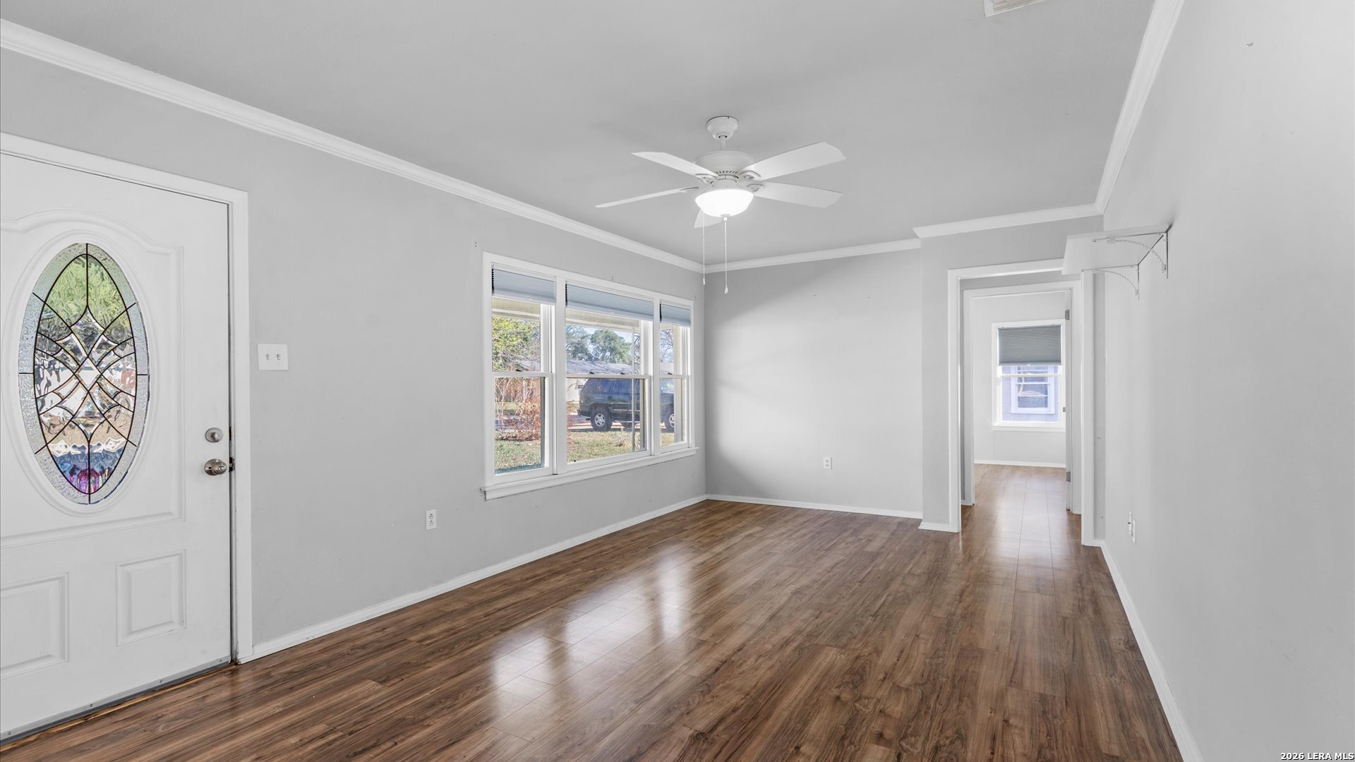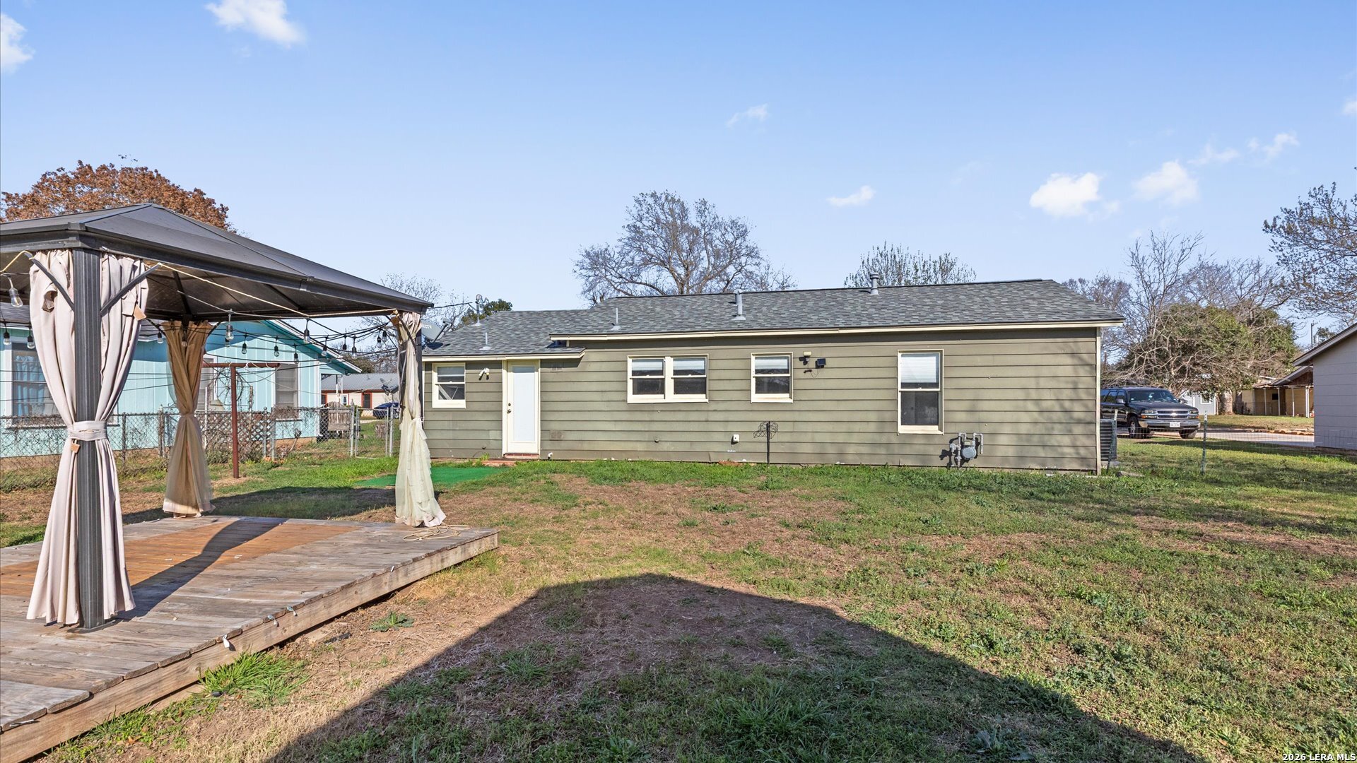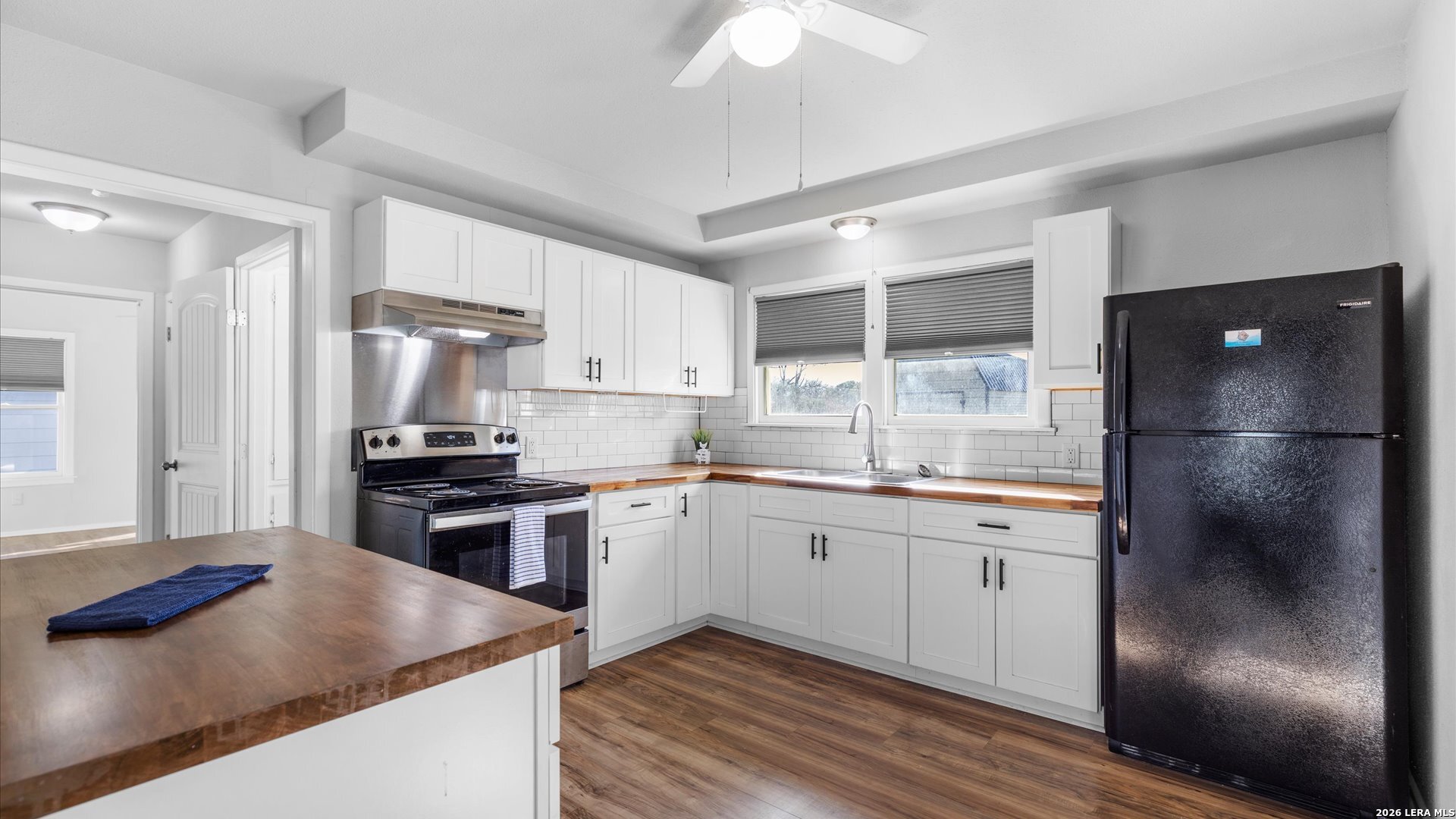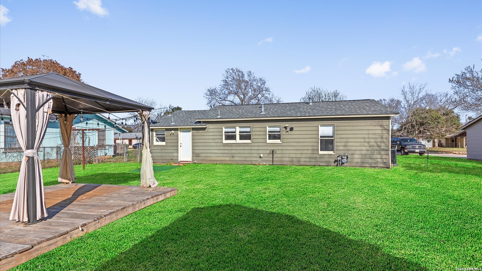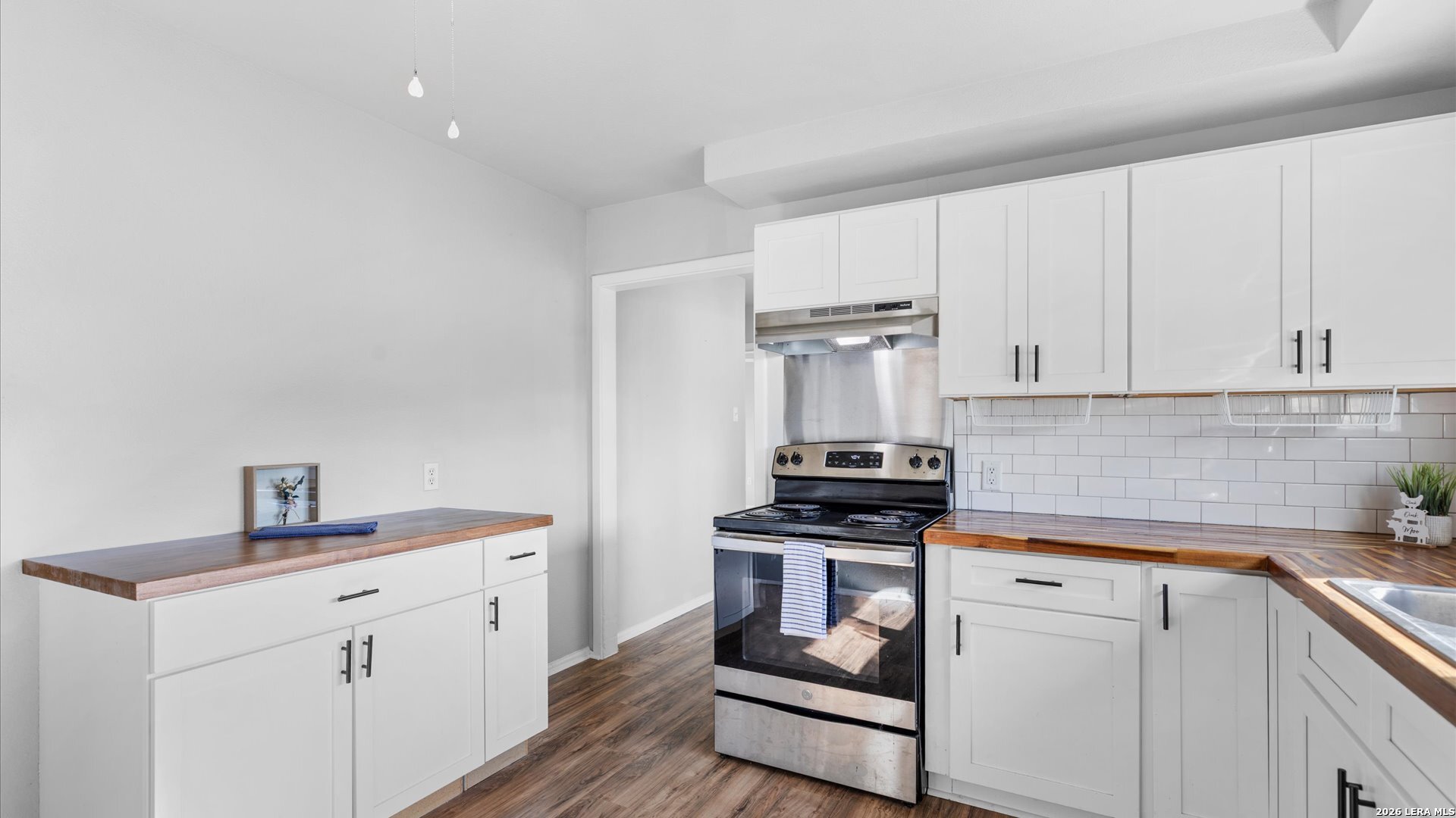 Charming single-story 3-bedroom, 1-bath home filled with natural light and inviting spaces throughout. Step inside to a spacious living room featuring large windows and elegant crown molding, creating a bright and welcoming atmosphere. Laminate wood flooring flows seamlessly throughout the home for easy maintenance and a cohesive look. The charming eat-in kitchen offers butcher block countertops, a classic subway tile backsplash, range, and pantry-perfect for everyday meals and entertaining. The roomy bathroom includes a tile tub/shower. A generously sized laundry area provides additional storage and convenient access to the fenced backyard. Enjoy outdoor living on the expansive 0.25-acre lot complete with a pergola-covered patio, storage shed, and mature trees. With no HOA, you'll appreciate the added flexibility and freedom this property offers.