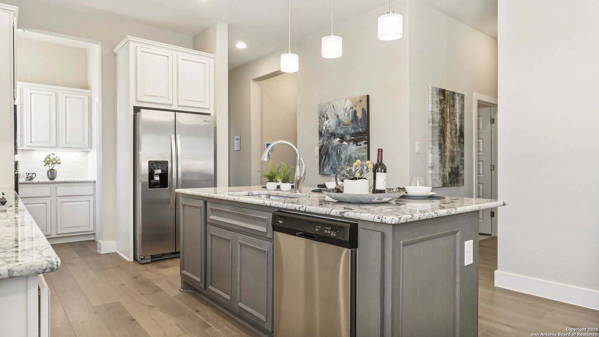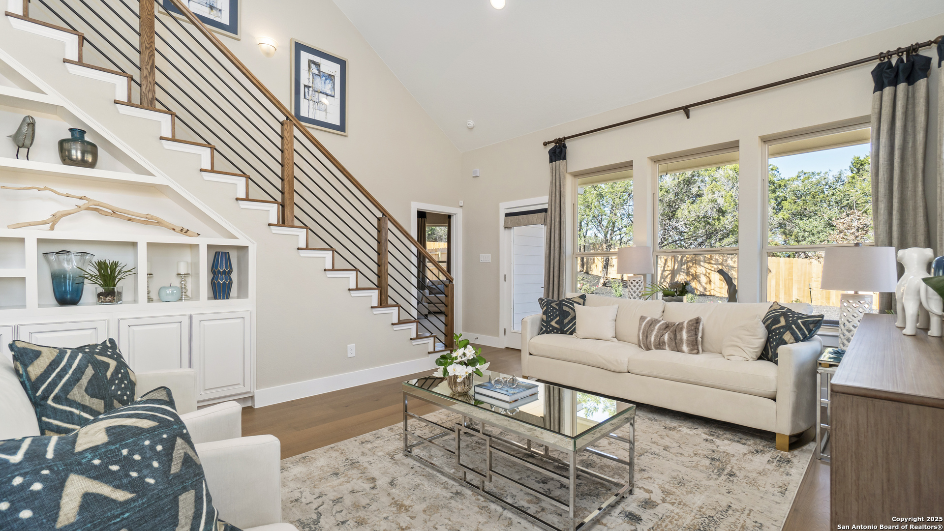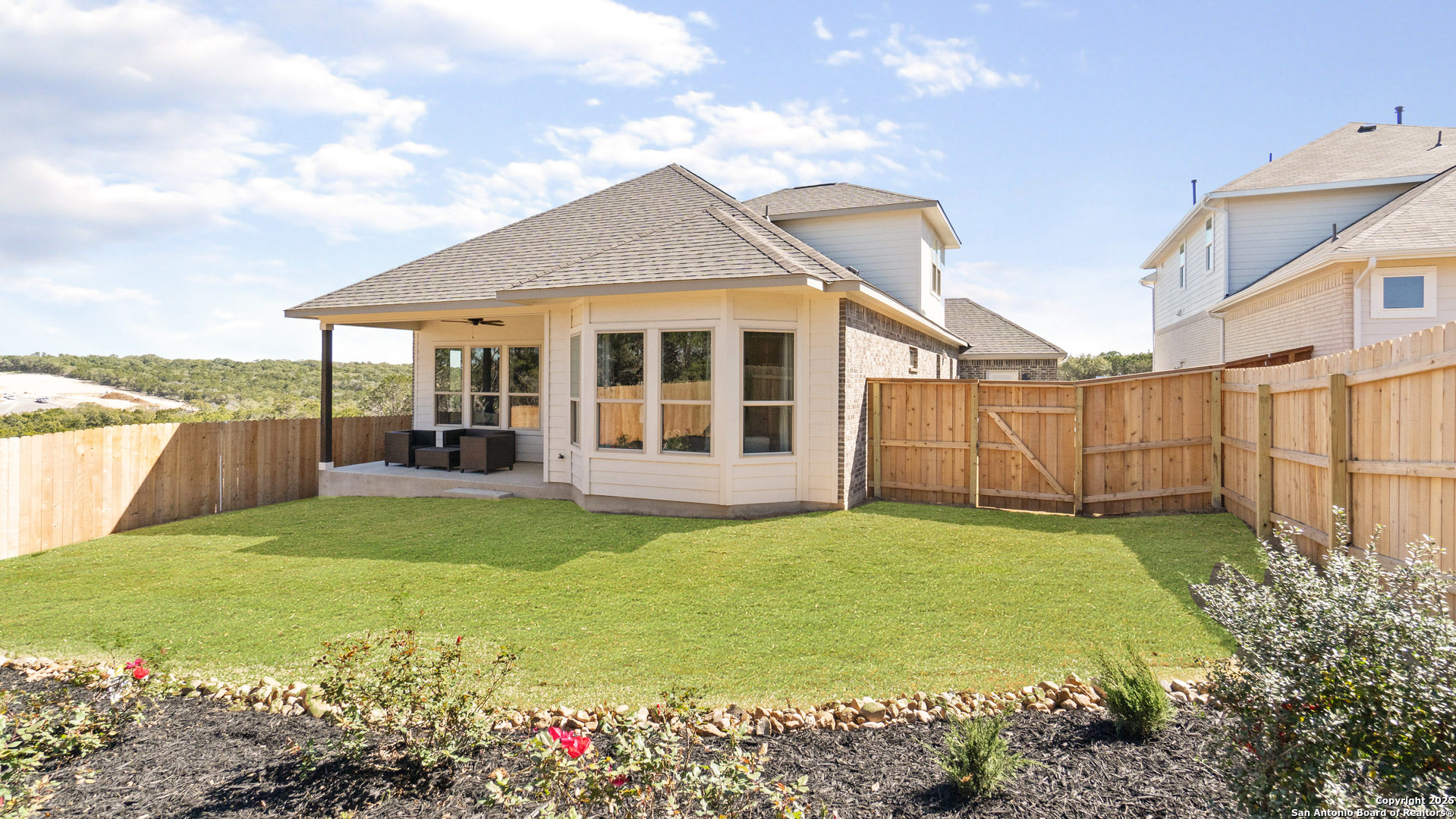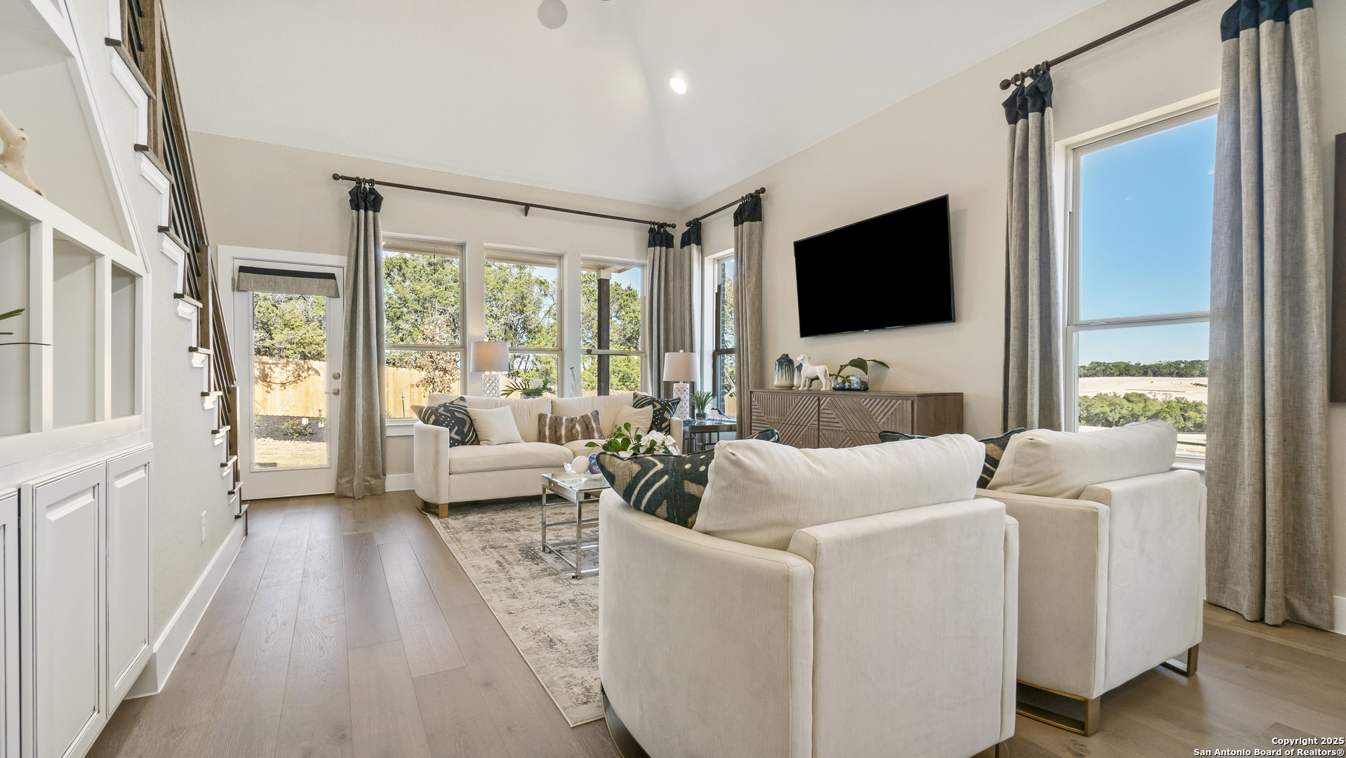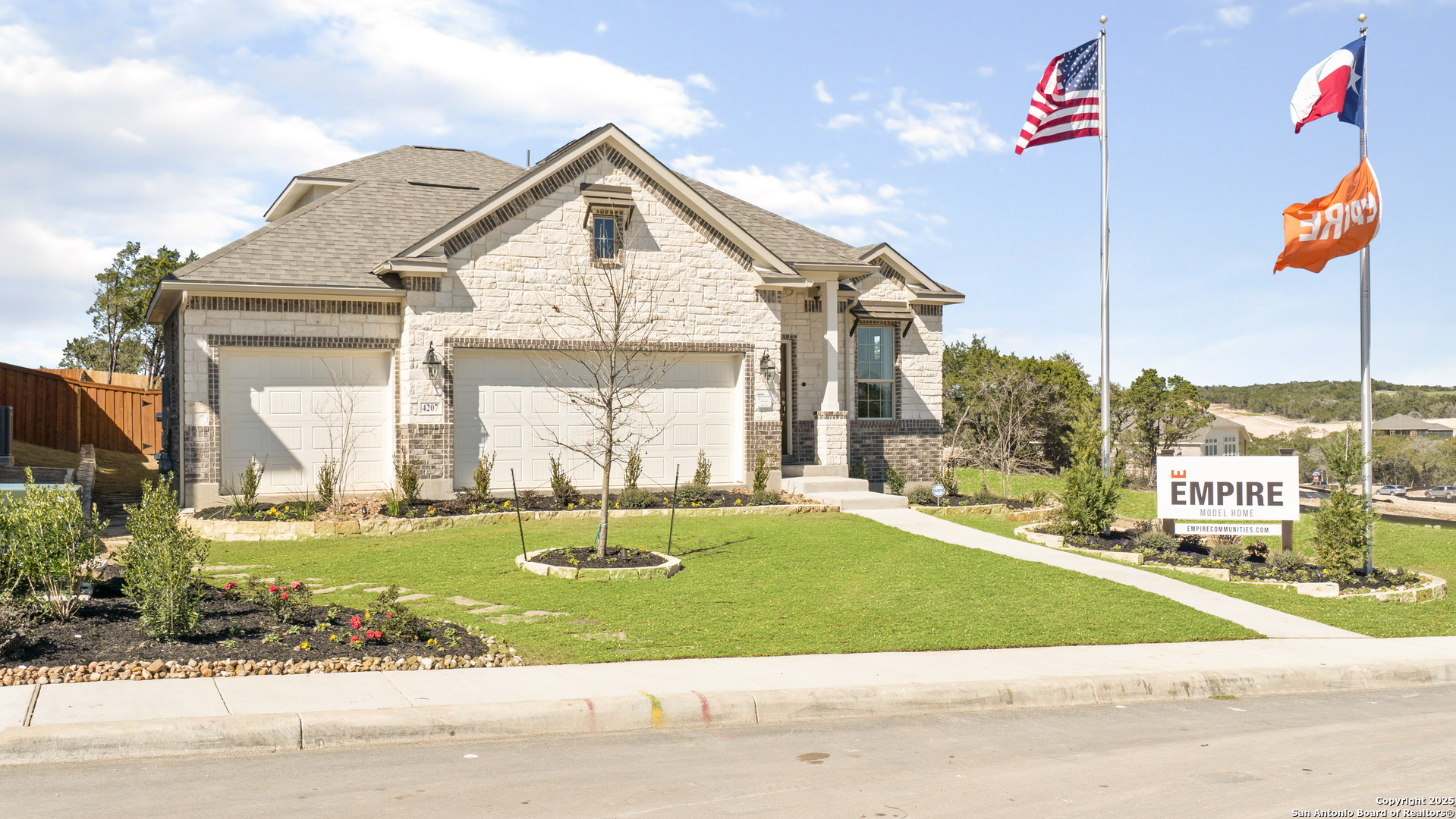 The Rollingwood is a perfect plan to consider whether you are just starting your family or you are empty-nesters wanting to downsize. This former model home is an open-concept floor plan with 3 bedrooms, 3 baths with loft/bonus space up, measuring 2,200 sq. ft. The home comes equipped with GE stainless steel appliances including a built in microwave and single oven, dishwasher, gas cook top, and a side by side stainless steel French door refrigerator. Additional structural and design upgrades include a study with glass barn-doors, level 4 quartz counters throughout, wood flooring in main areas, custom mud-bench off the 3 car garage, morning kitchen/coffee bar with custom cabinetry and two walk-in pantry areas for plenty of storage. The high ceilings with ample lighting at the family and dining area is the perfect place for gathering with family and friends. Venture up to the bonus room for more space to entertain and gather and enjoy the gorgeous view of the hill country. Retreat to the primary suite with bay window, walk-in shower with upgraded tile, linen closet, private water closet and 36" dual vanities. Exit the primary walk-in closet through a door directly into the laundry room for your convenience. The home also includes a home security system, ring door bell, keyless entry front door, tank-less water heater, water softener loop, and garage door opener. The fully sodded front and back yard with additional landscaping comes with a 6 foot privacy fence and in-ground programmable irrigation.