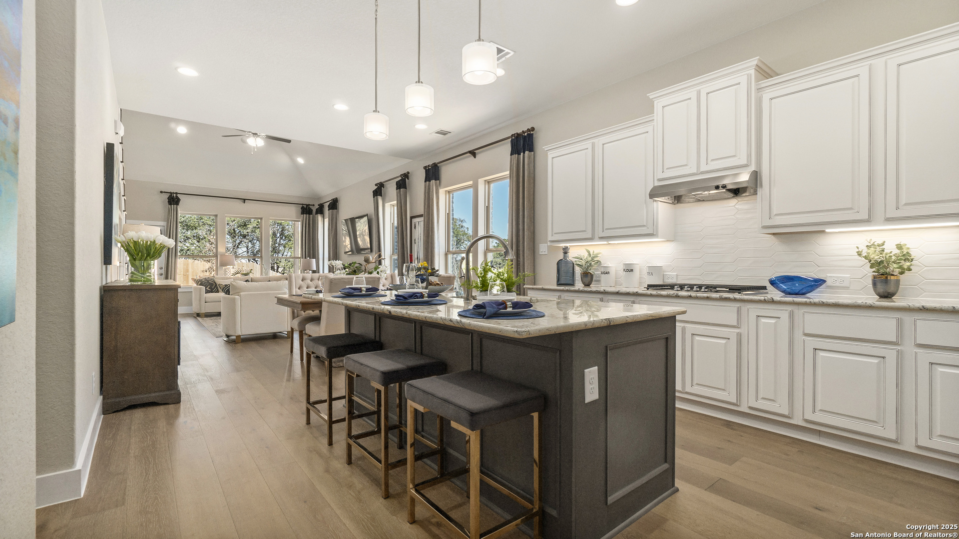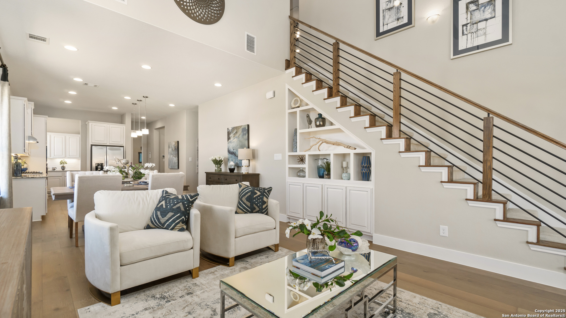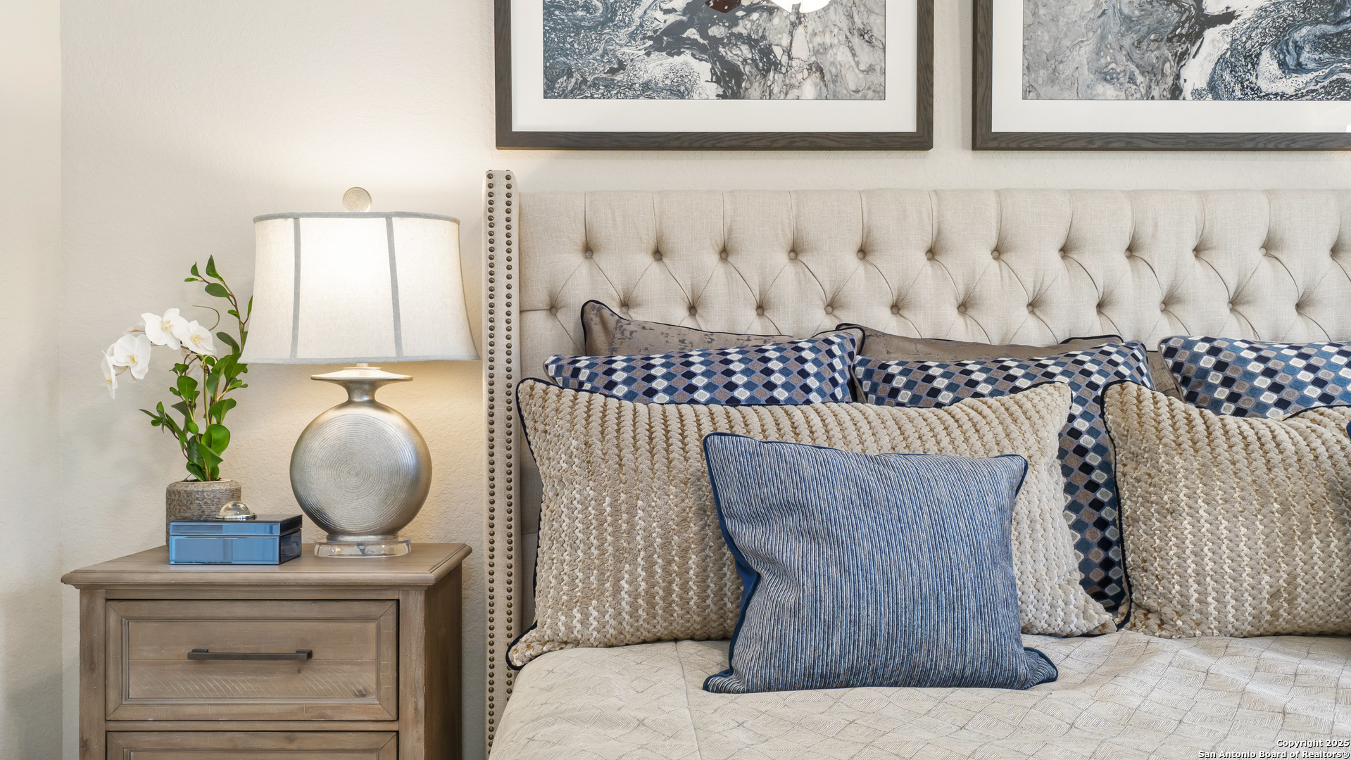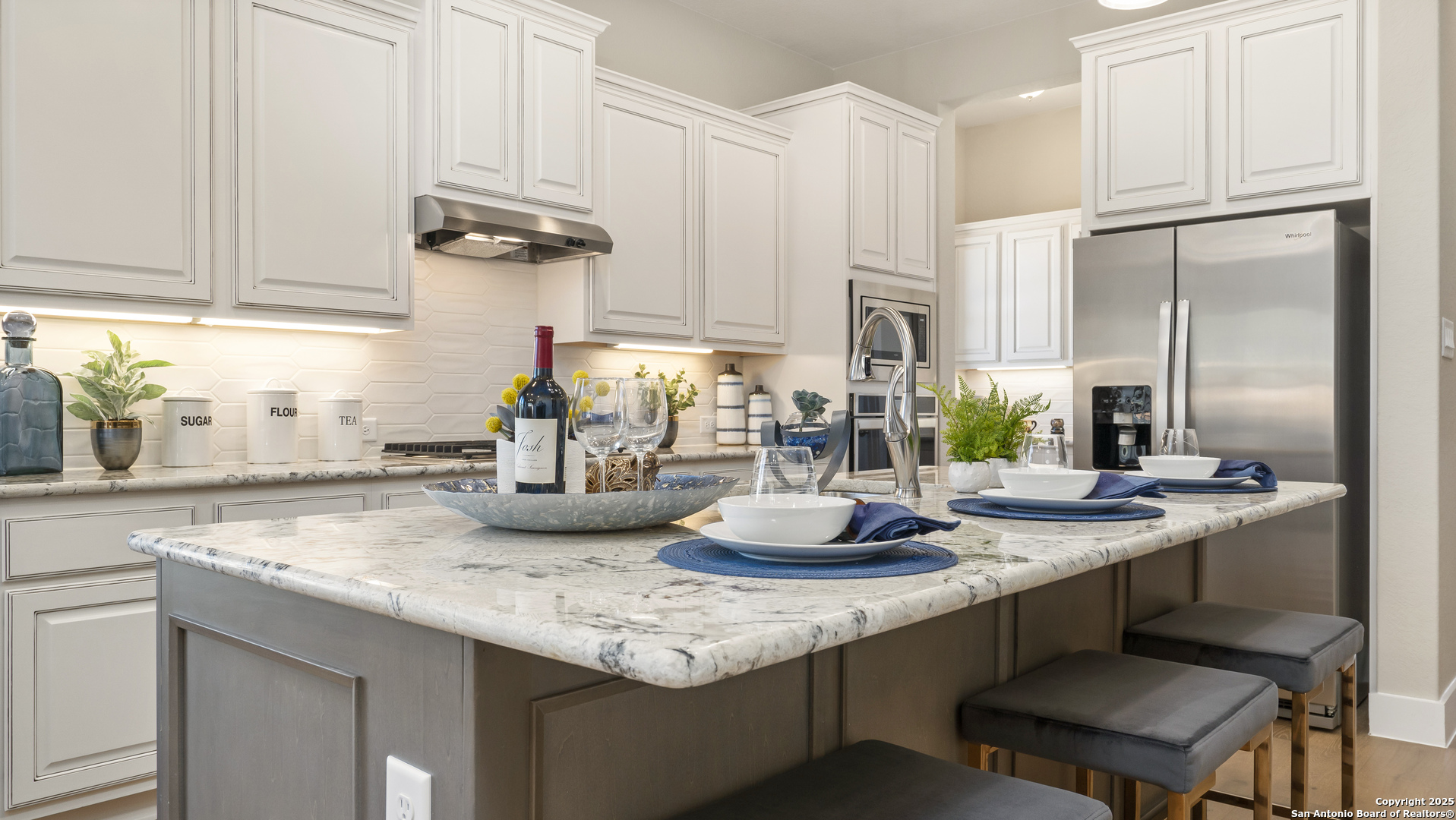 The Rollingwood is a perfect plan to consider whether you are just starting your family or you are empty-nesters wanting to downsize. This former model home is an open-concept floor plan with 3 bedrooms, 3 baths with loft/bonus space up, measuring 2,200 sq. ft. The home comes equipped with GE stainless steel appliances including a built in microwave and single oven, dishwasher, gas cook top, and a side by side stainless steel French door refrigerator. Additional structural and design upgrades include a study with glass barn-doors, level 4 quartz counters throughout, wood flooring in main areas, custom mud-bench off the 3 car garage, morning kitchen/coffee bar with custom cabinetry and two walk-in pantry areas for plenty of storage. The high ceilings with ample lighting at the family and dining area is the perfect place for gathering with family and friends. Venture up to the bonus room for more space to entertain and gather and enjoy the gorgeous view of the hill country. Retreat to the primary suite with bay window, walk-in shower with upgraded tile, linen closet, private water closet and 36" dual vanities. Exit the primary walk-in closet through a door directly into the laundry room for your convenience. The home also includes a home security system, ring door bell, keyless entry front door, tank-less water heater, water softener loop, and garage door opener. The fully sodded front and back yard with additional landscaping comes with a 6 foot privacy fence and in-ground programmable irrigation.