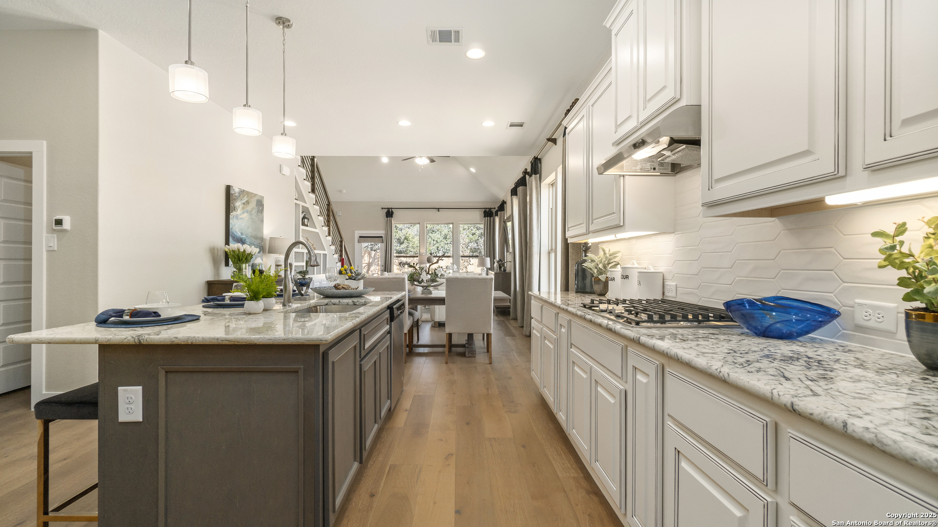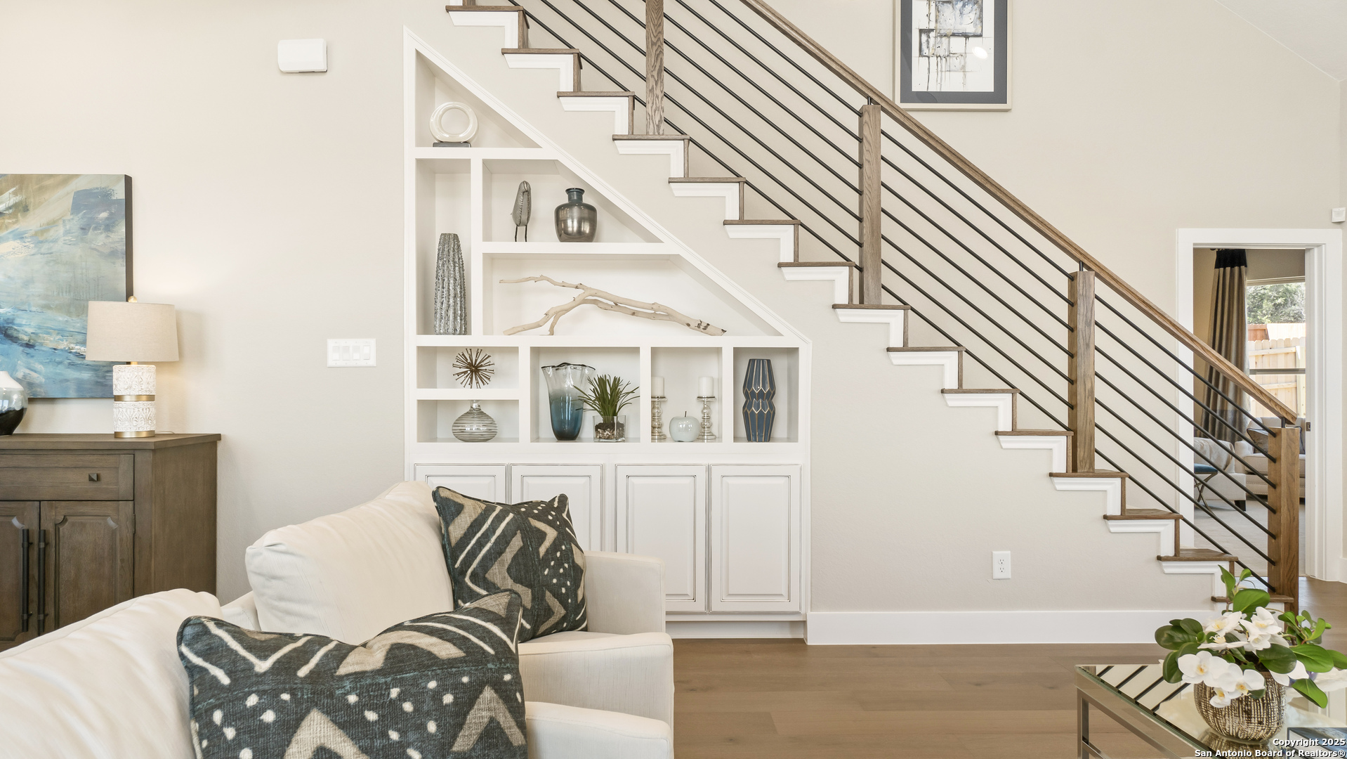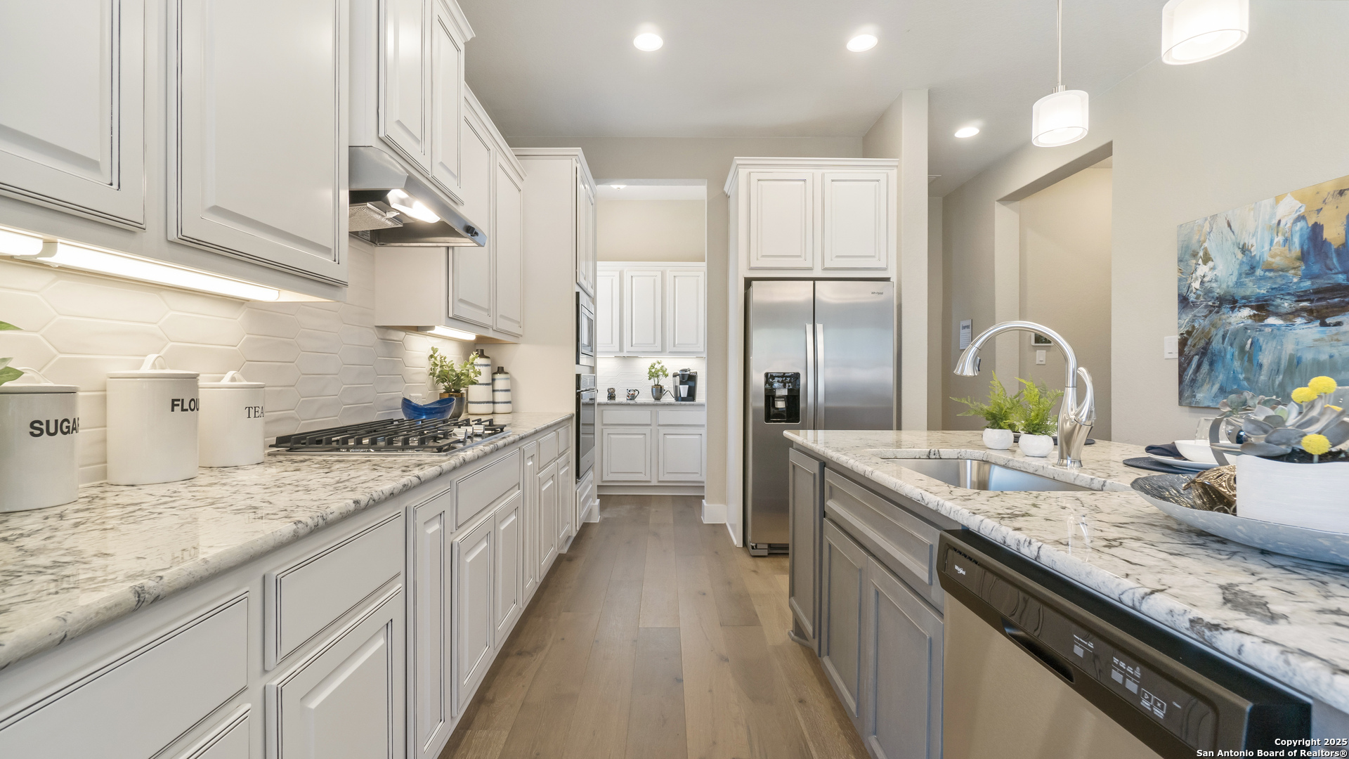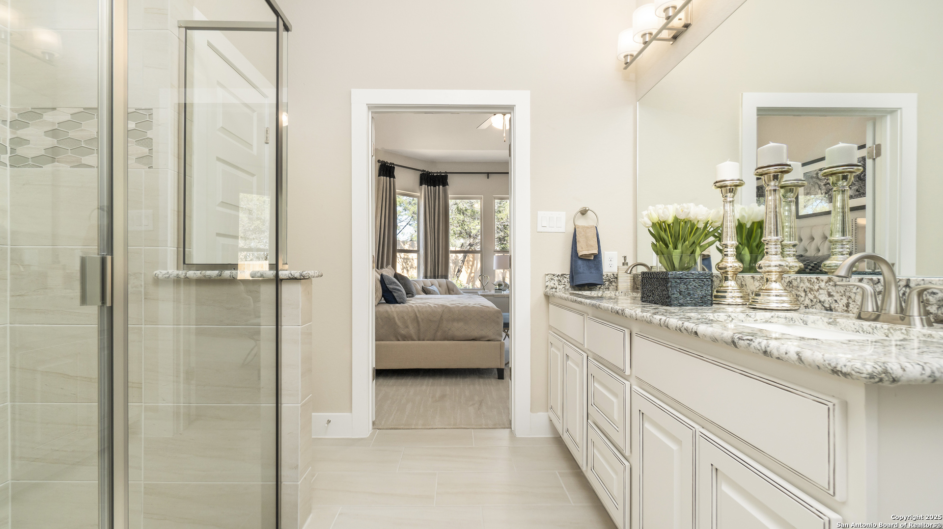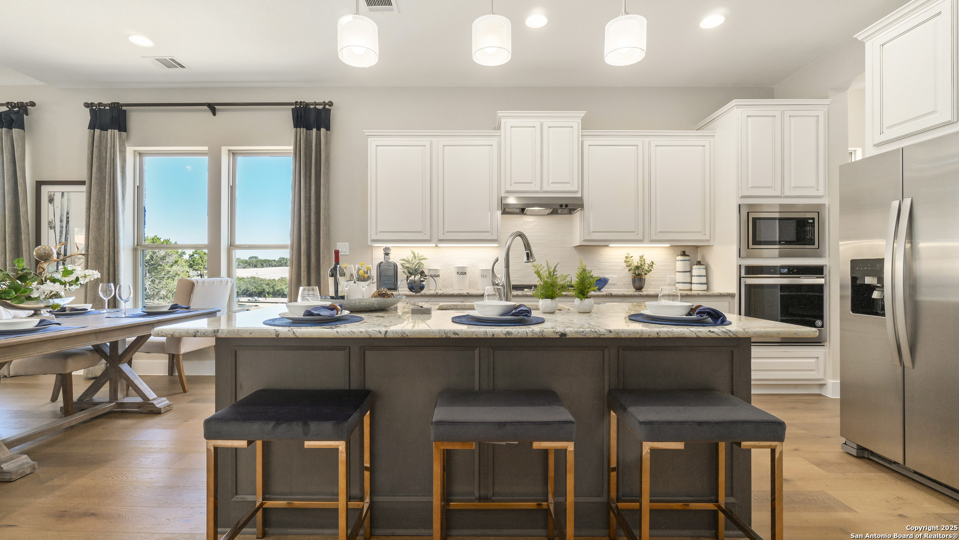 The Rollingwood is a perfect plan to consider whether you are just starting your family or you are empty-nesters wanting to downsize. This former model home is an open-concept floor plan with 3 bedrooms, 3 baths with loft/bonus space up, measuring 2,200 sq. ft. The home comes equipped with GE stainless steel appliances including a built in microwave and single oven, dishwasher, gas cook top, and a side by side stainless steel French door refrigerator. Additional structural and design upgrades include a study with glass barn-doors, level 4 quartz counters throughout, wood flooring in main areas, custom mud-bench off the 3 car garage, morning kitchen/coffee bar with custom cabinetry and two walk-in pantry areas for plenty of storage. The high ceilings with ample lighting at the family and dining area is the perfect place for gathering with family and friends. Venture up to the bonus room for more space to entertain and gather and enjoy the gorgeous view of the hill country. Retreat to the primary suite with bay window, walk-in shower with upgraded tile, linen closet, private water closet and 36" dual vanities. Exit the primary walk-in closet through a door directly into the laundry room for your convenience. The home also includes a home security system, ring door bell, keyless entry front door, tank-less water heater, water softener loop, and garage door opener. The fully sodded front and back yard with additional landscaping comes with a 6 foot privacy fence and in-ground programmable irrigation.