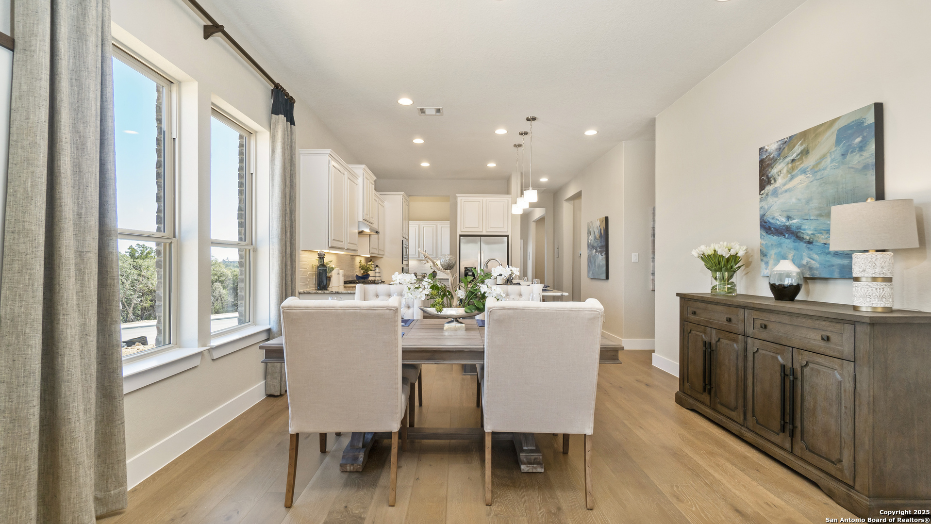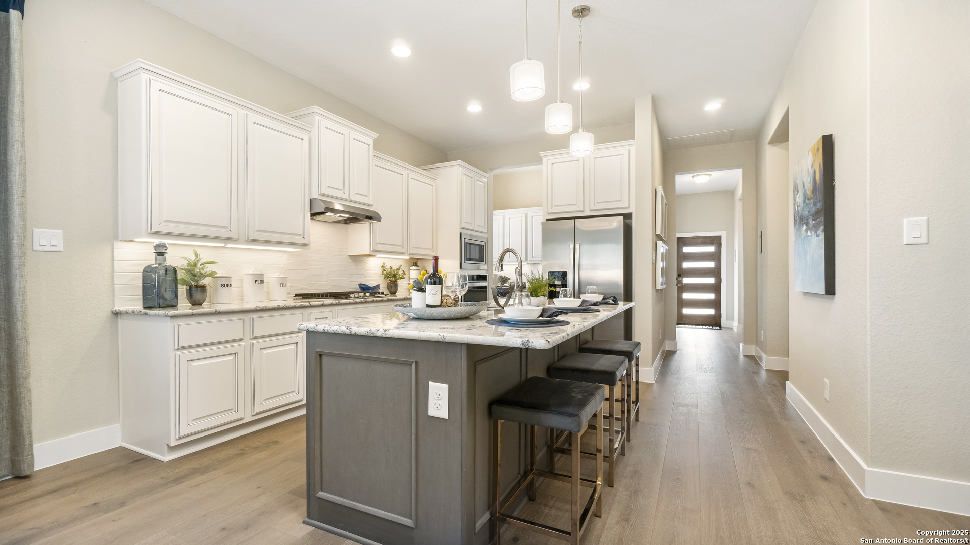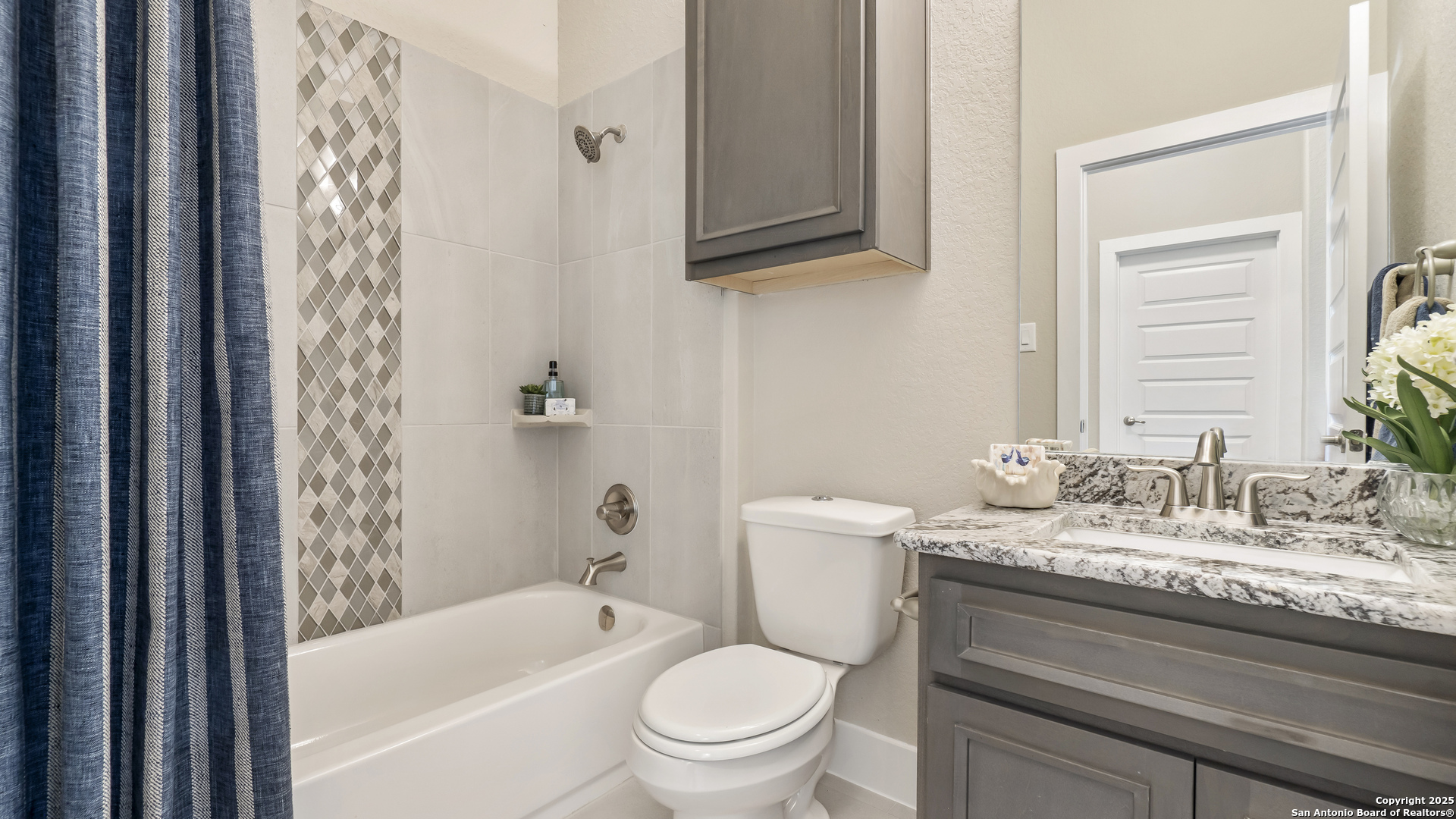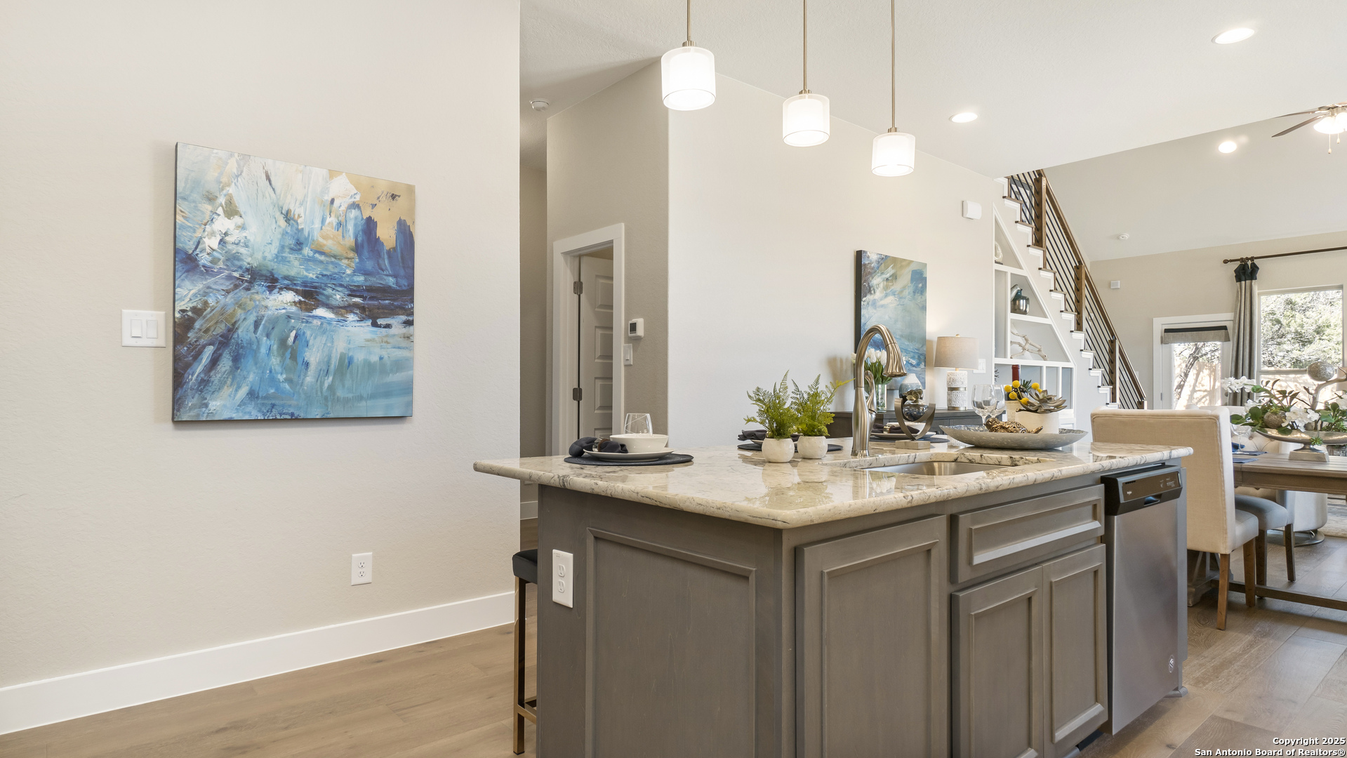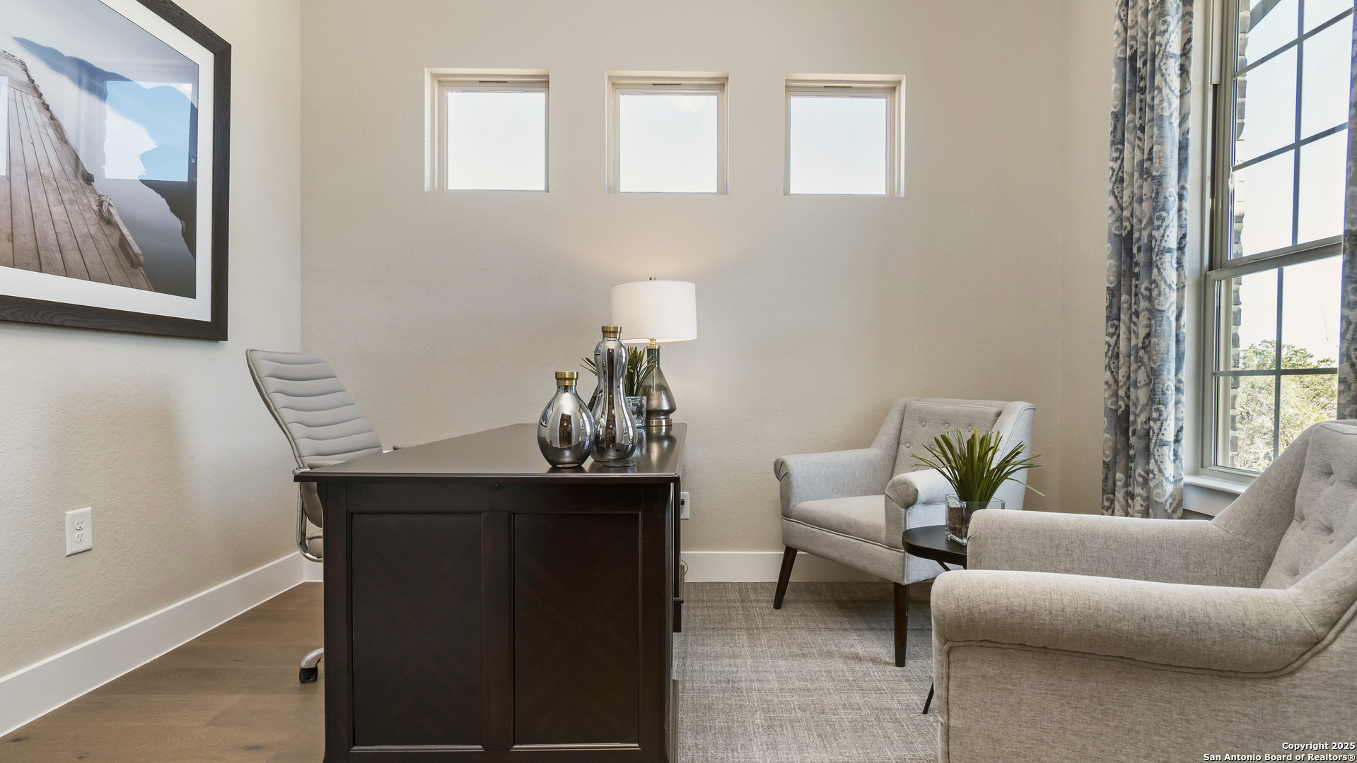 The Rollingwood is a perfect plan to consider whether you are just starting your family or you are empty-nesters wanting to downsize. This former model home is an open-concept floor plan with 3 bedrooms, 3 baths with loft/bonus space up, measuring 2,200 sq. ft. The home comes equipped with GE stainless steel appliances including a built in microwave and single oven, dishwasher, gas cook top, and a side by side stainless steel French door refrigerator. Additional structural and design upgrades include a study with glass barn-doors, level 4 quartz counters throughout, wood flooring in main areas, custom mud-bench off the 3 car garage, morning kitchen/coffee bar with custom cabinetry and two walk-in pantry areas for plenty of storage. The high ceilings with ample lighting at the family and dining area is the perfect place for gathering with family and friends. Venture up to the bonus room for more space to entertain and gather and enjoy the gorgeous view of the hill country. Retreat to the primary suite with bay window, walk-in shower with upgraded tile, linen closet, private water closet and 36" dual vanities. Exit the primary walk-in closet through a door directly into the laundry room for your convenience. The home also includes a home security system, ring door bell, keyless entry front door, tank-less water heater, water softener loop, and garage door opener. The fully sodded front and back yard with additional landscaping comes with a 6 foot privacy fence and in-ground programmable irrigation.
