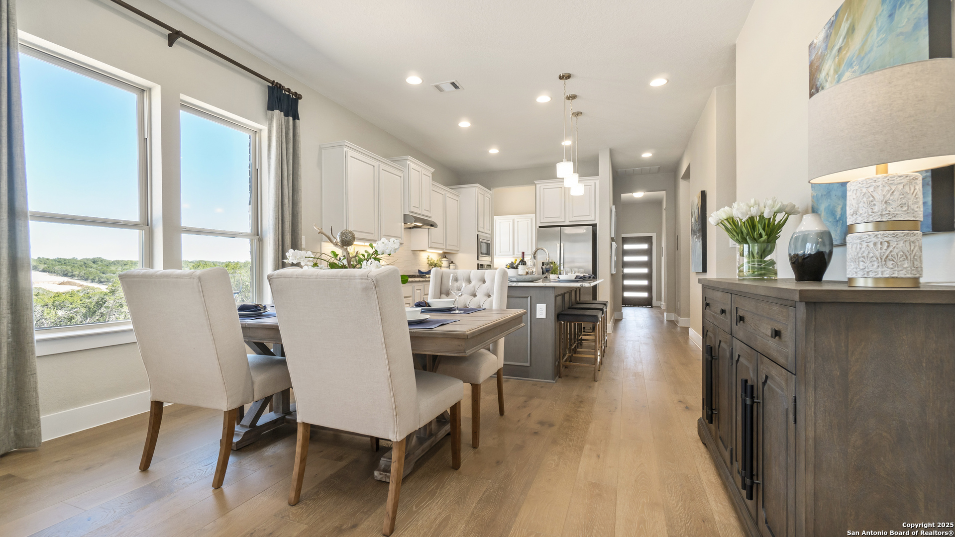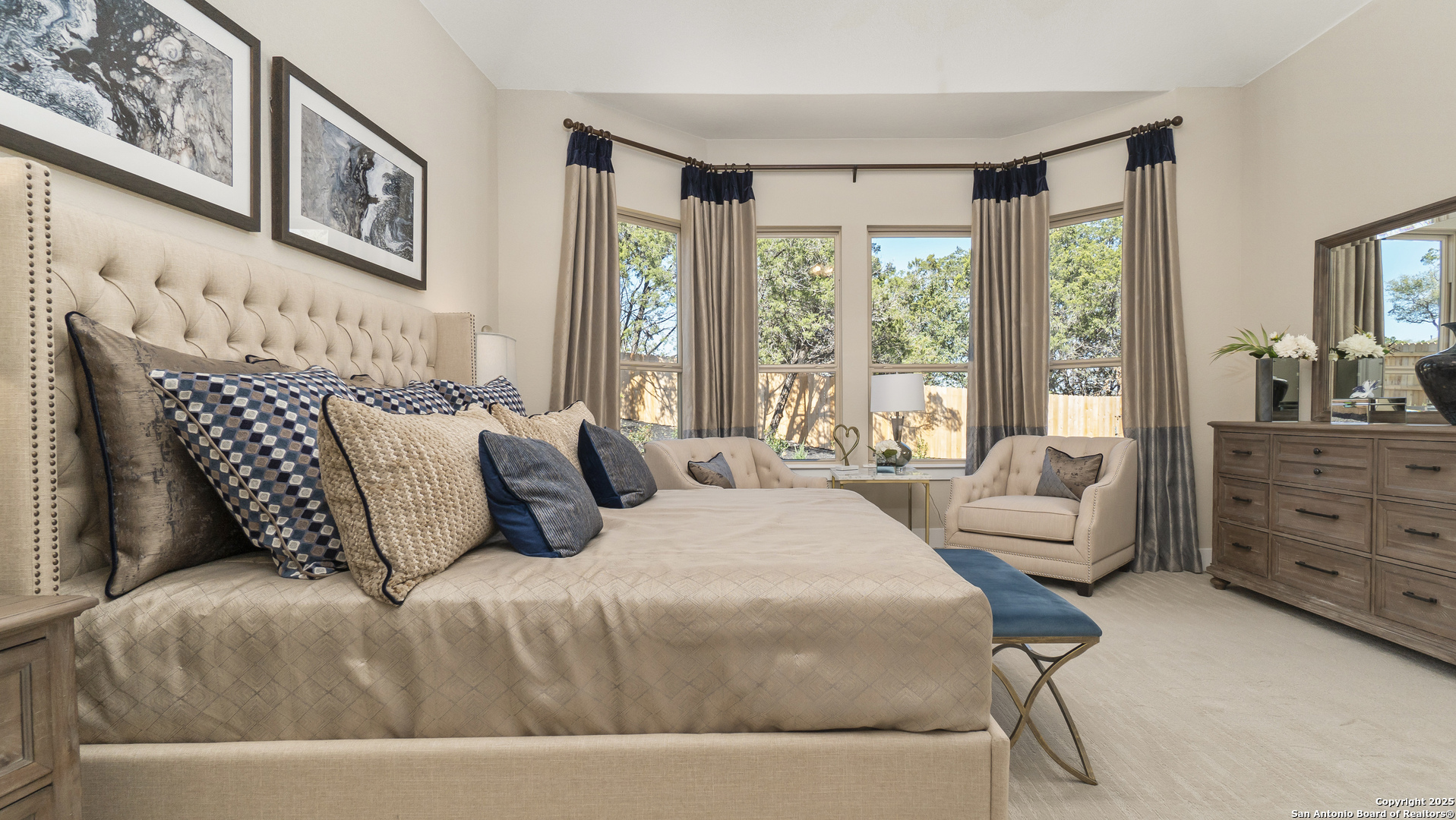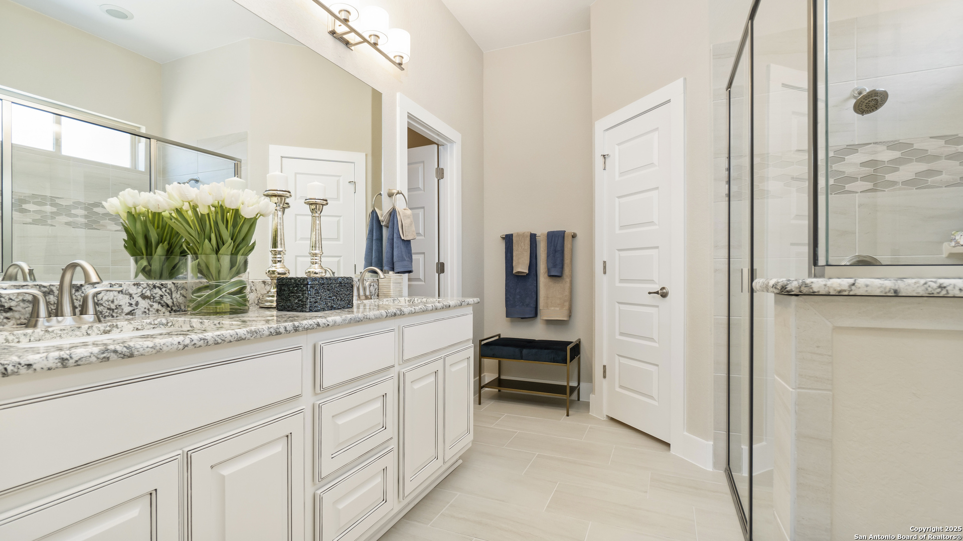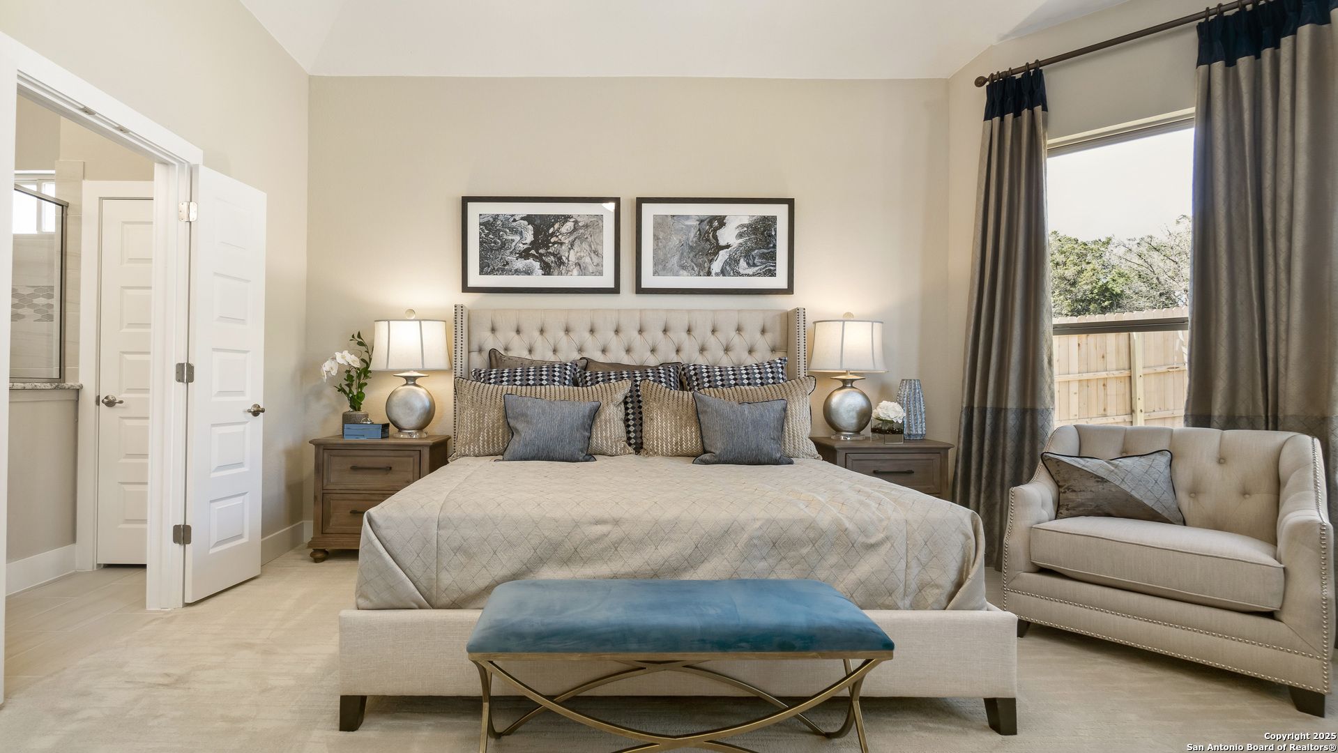 The Rollingwood is a perfect plan to consider whether you are just starting your family or you are empty-nesters wanting to downsize. This former model home is an open-concept floor plan with 3 bedrooms, 3 baths with loft/bonus space up, measuring 2,200 sq. ft. The home comes equipped with GE stainless steel appliances including a built in microwave and single oven, dishwasher, gas cook top, and a side by side stainless steel French door refrigerator. Additional structural and design upgrades include a study with glass barn-doors, level 4 quartz counters throughout, wood flooring in main areas, custom mud-bench off the 3 car garage, morning kitchen/coffee bar with custom cabinetry and two walk-in pantry areas for plenty of storage. The high ceilings with ample lighting at the family and dining area is the perfect place for gathering with family and friends. Venture up to the bonus room for more space to entertain and gather and enjoy the gorgeous view of the hill country. Retreat to the primary suite with bay window, walk-in shower with upgraded tile, linen closet, private water closet and 36" dual vanities. Exit the primary walk-in closet through a door directly into the laundry room for your convenience. The home also includes a home security system, ring door bell, keyless entry front door, tank-less water heater, water softener loop, and garage door opener. The fully sodded front and back yard with additional landscaping comes with a 6 foot privacy fence and in-ground programmable irrigation.