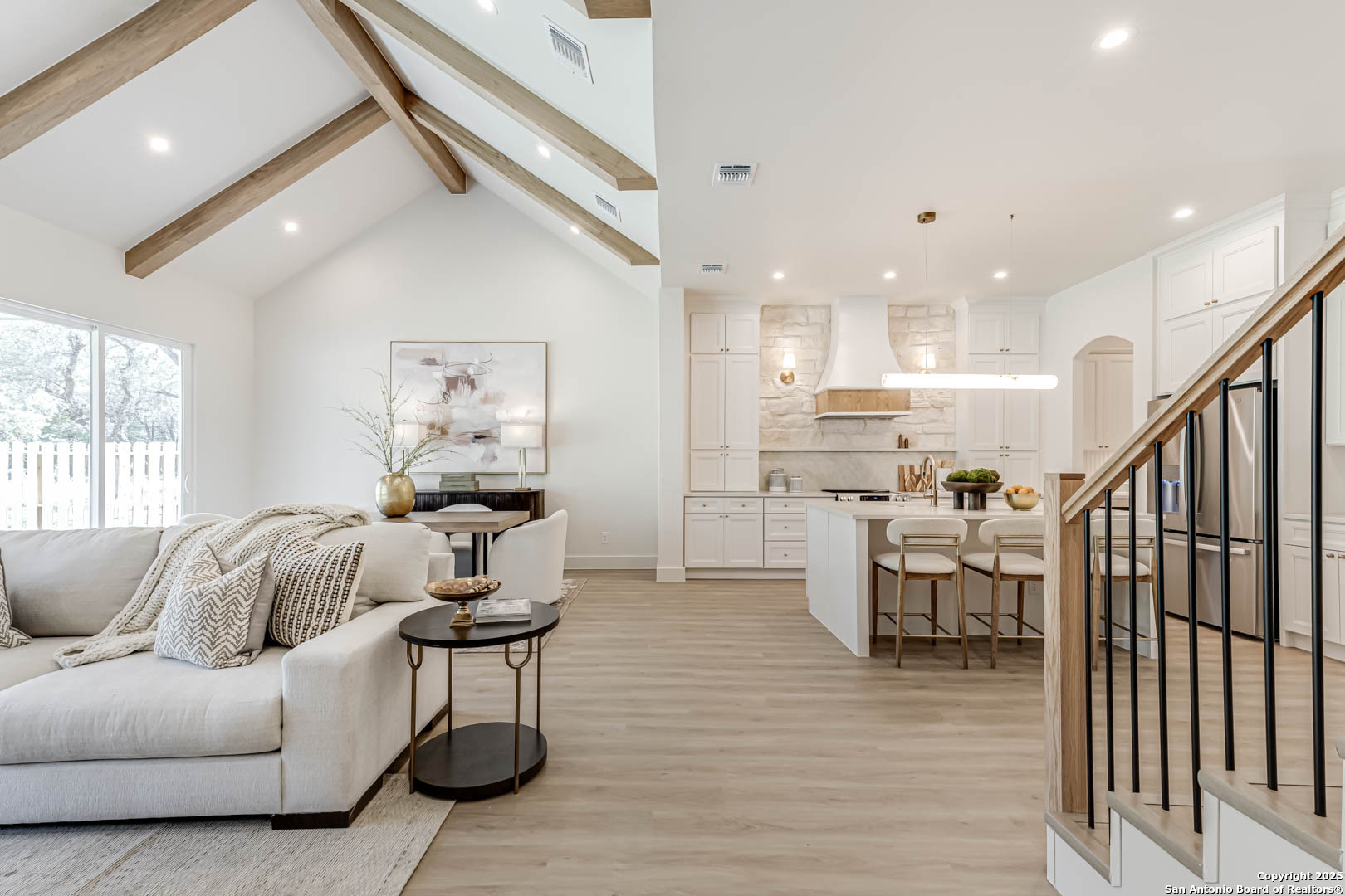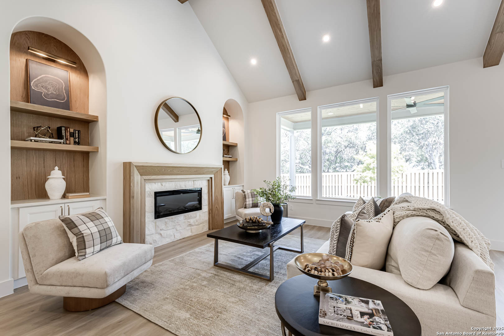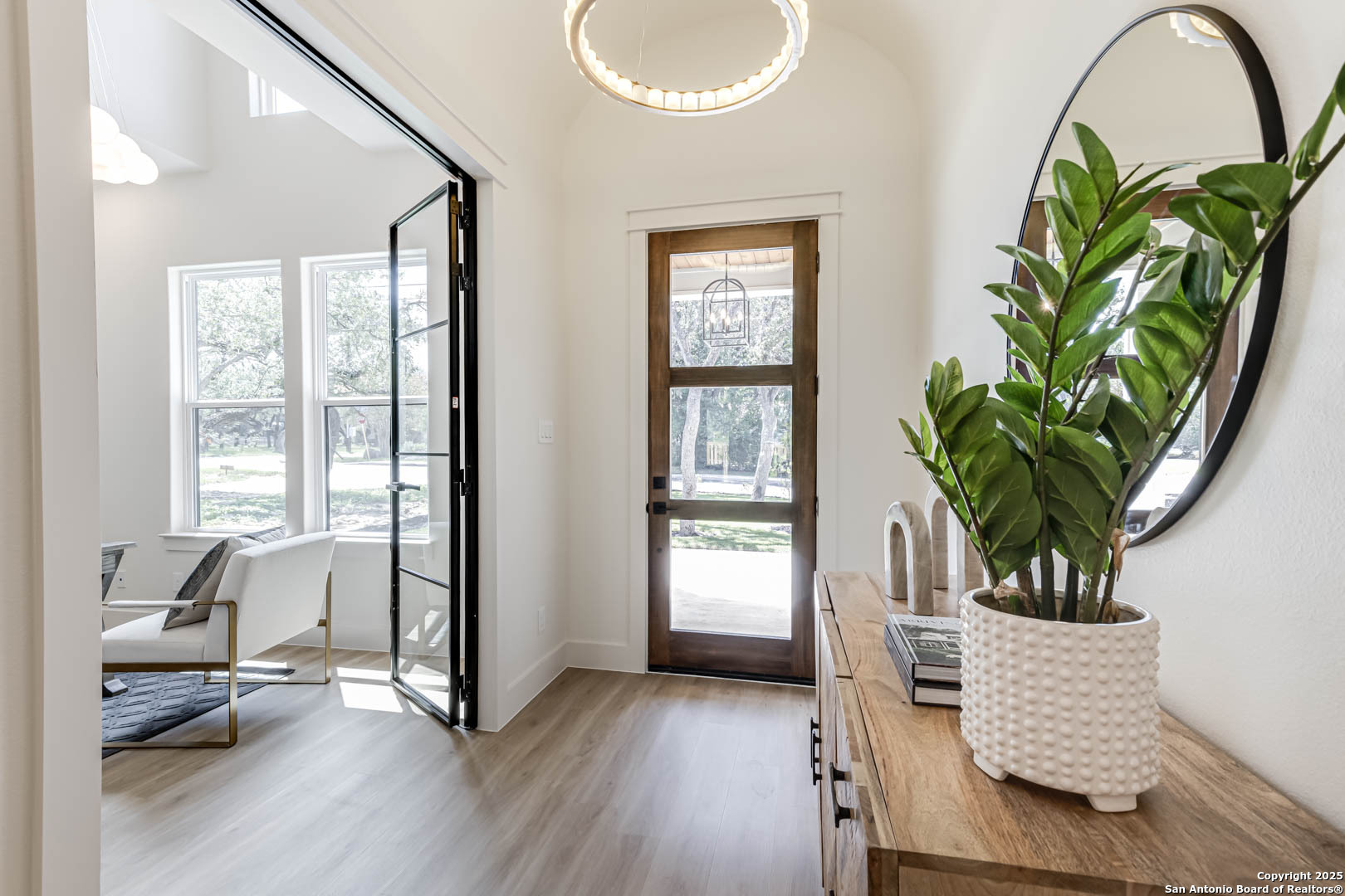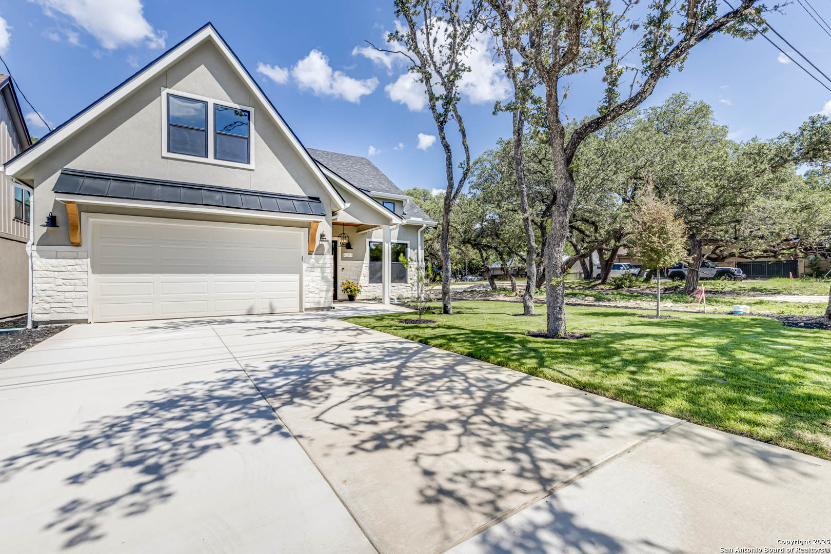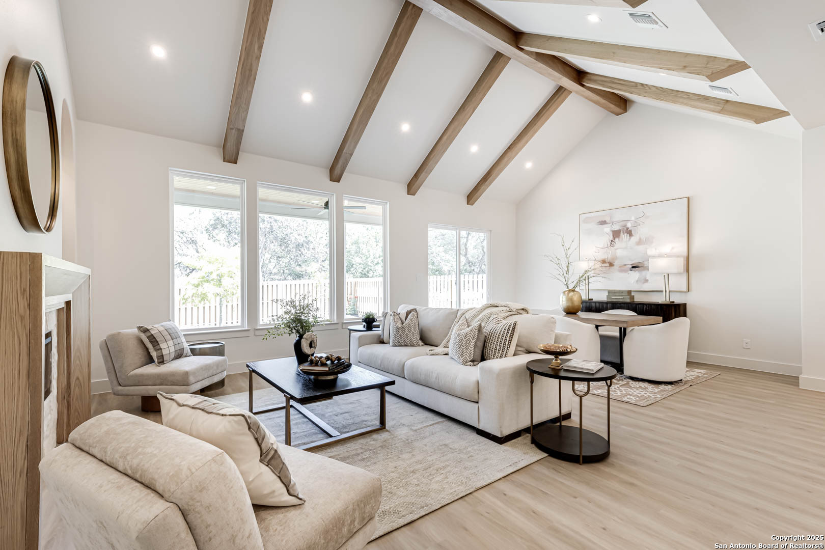 New construction 2025 with NO HOA, mature shade trees, and spaces built to entertain. Curb appeal with a wood-and-glass entry. A welcoming foyer leads to a vaulted living room with wood beams and open dining. The showpiece kitchen delivers custom cabinetry, upgraded quartz, a large island, custom vent hood, and a butler's pantry beyond the arched hall. Dedicated office with double iron French doors. Smart split layout with the primary suite downstairs; secondary bedrooms, each with walk-in closets, are set apart for privacy. The primary bath features a dual-sink vanity, freestanding soaking tub, large glass shower, and an oversized built-in closet. Wide-plank floors and upgraded fixtures throughout. Outside: oversized covered patio with stained tongue-and-groove ceiling and dual fans overlooking a private, landscaped yard with full irrigation. Energy Efficient home is Minutes to I-10/1604, The Shops at La Cantera, The Rim, and an easy 10 minutes to the Medical Center. 2-10 builder's warranty.