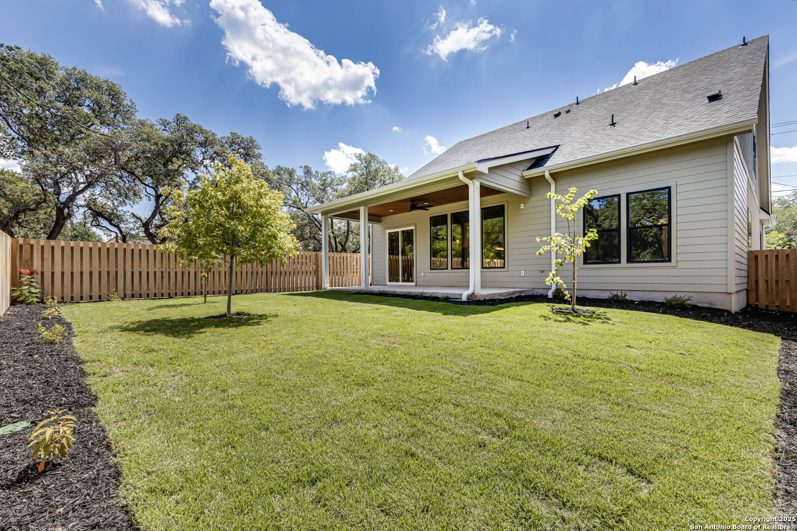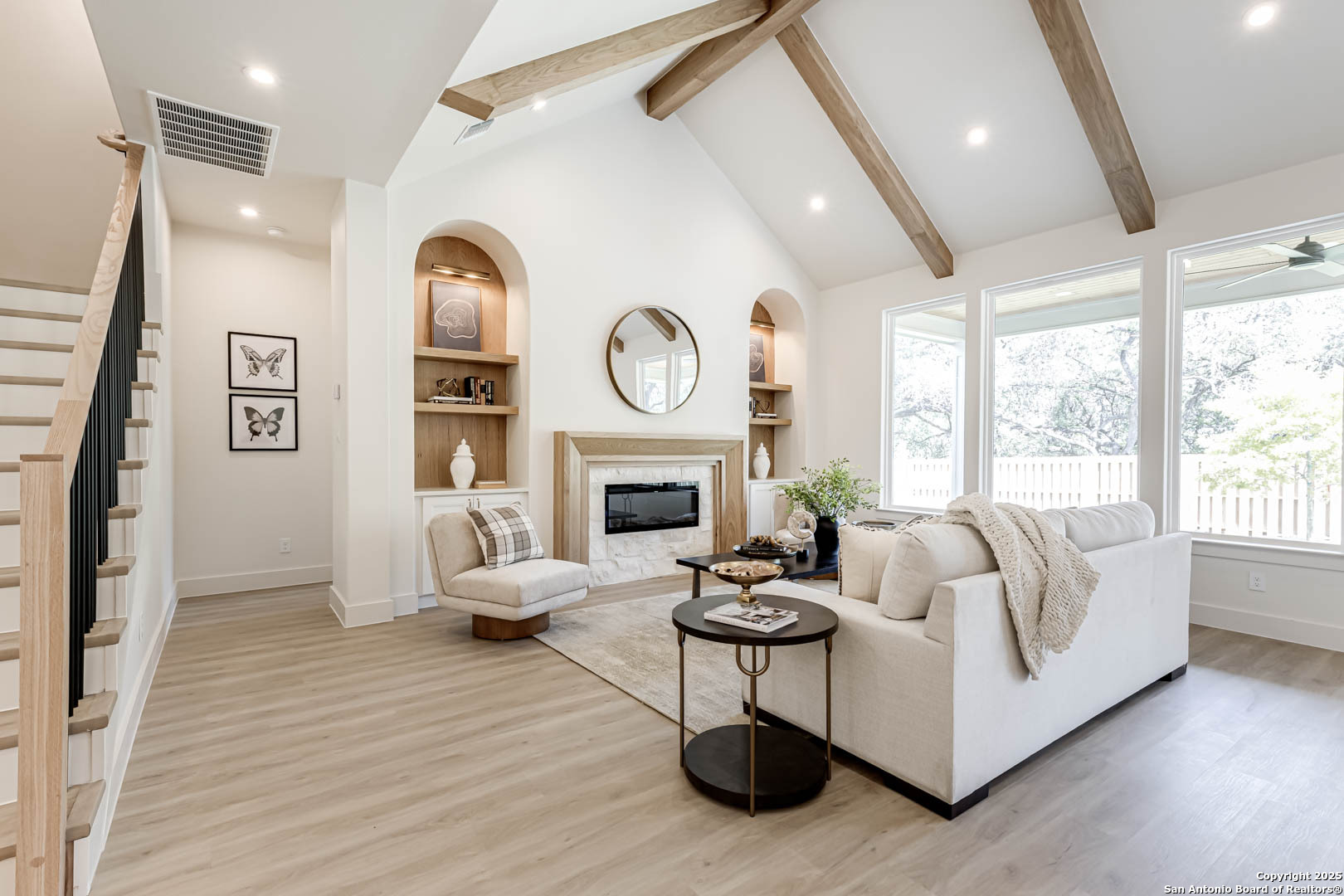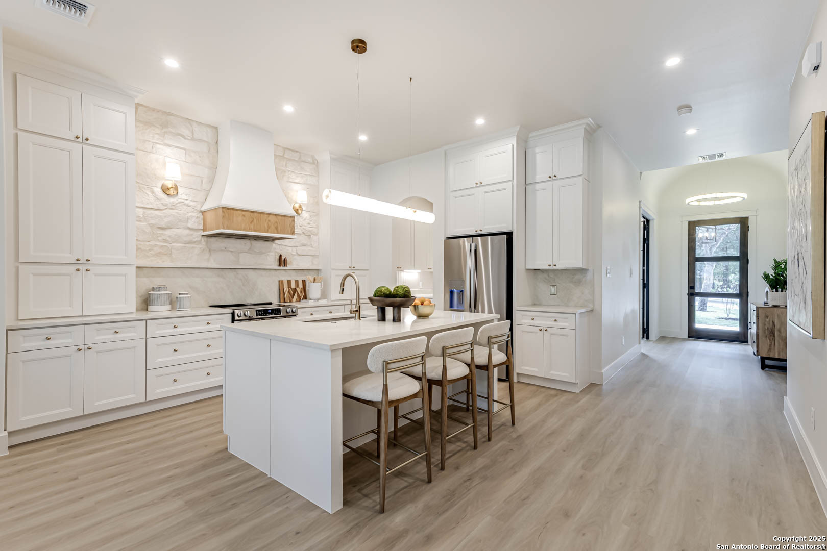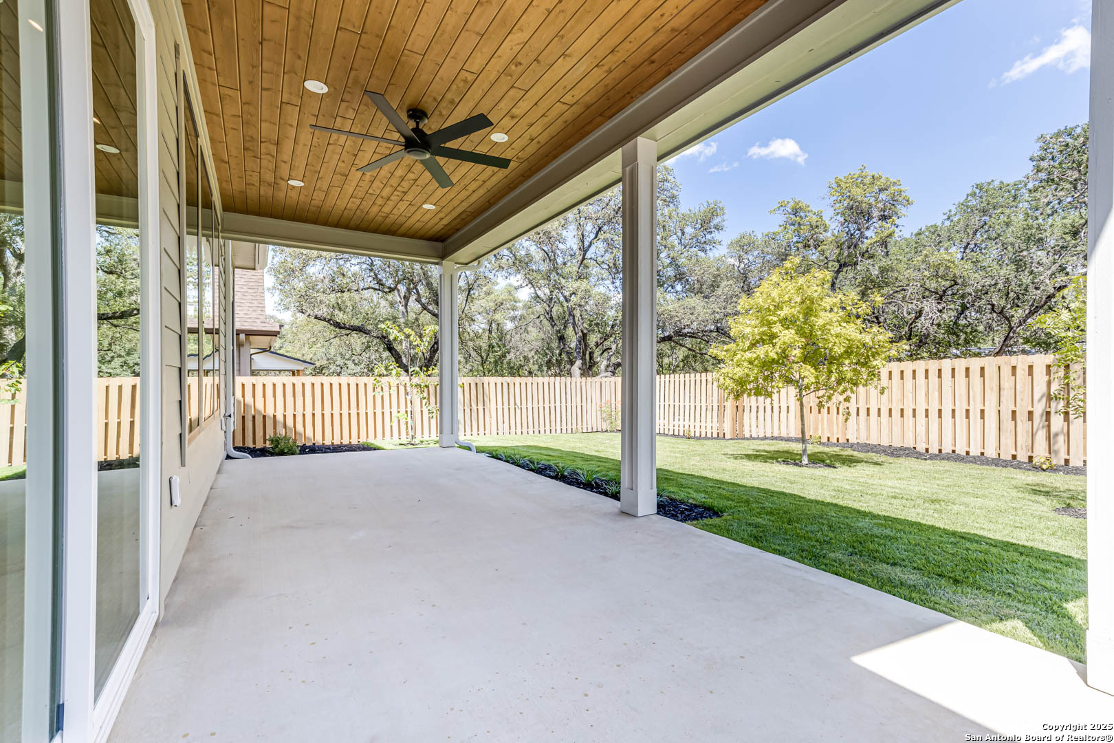 New construction 2025 with NO HOA, mature shade trees, and spaces built to entertain. Curb appeal with a wood-and-glass entry. A welcoming foyer leads to a vaulted living room with wood beams and open dining. The showpiece kitchen delivers custom cabinetry, upgraded quartz, a large island, custom vent hood, and a butler's pantry beyond the arched hall. Dedicated office with double iron French doors. Smart split layout with the primary suite downstairs; secondary bedrooms, each with walk-in closets, are set apart for privacy. The primary bath features a dual-sink vanity, freestanding soaking tub, large glass shower, and an oversized built-in closet. Wide-plank floors and upgraded fixtures throughout. Outside: oversized covered patio with stained tongue-and-groove ceiling and dual fans overlooking a private, landscaped yard with full irrigation. Energy Efficient home is Minutes to I-10/1604, The Shops at La Cantera, The Rim, and an easy 10 minutes to the Medical Center. 2-10 builder's warranty.