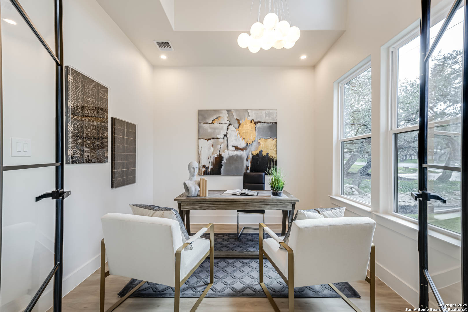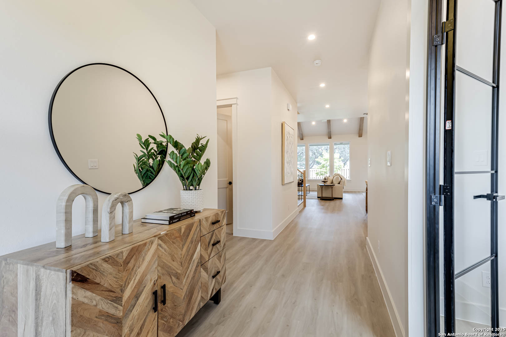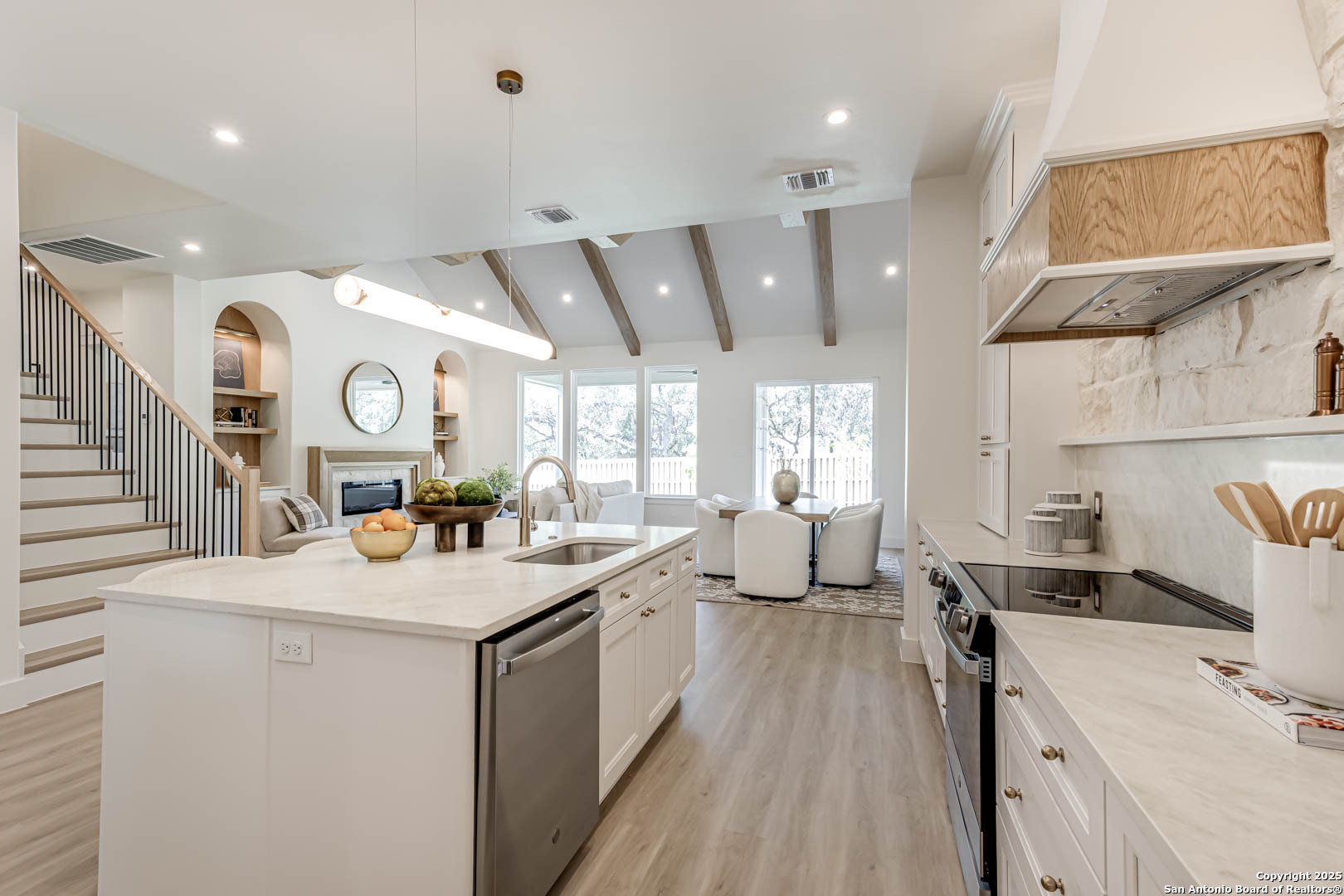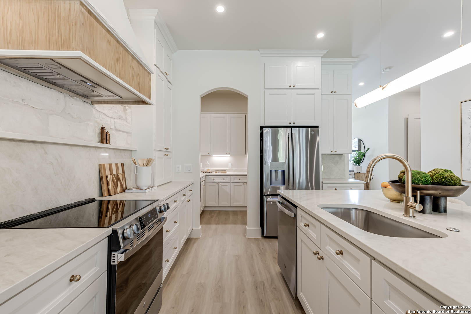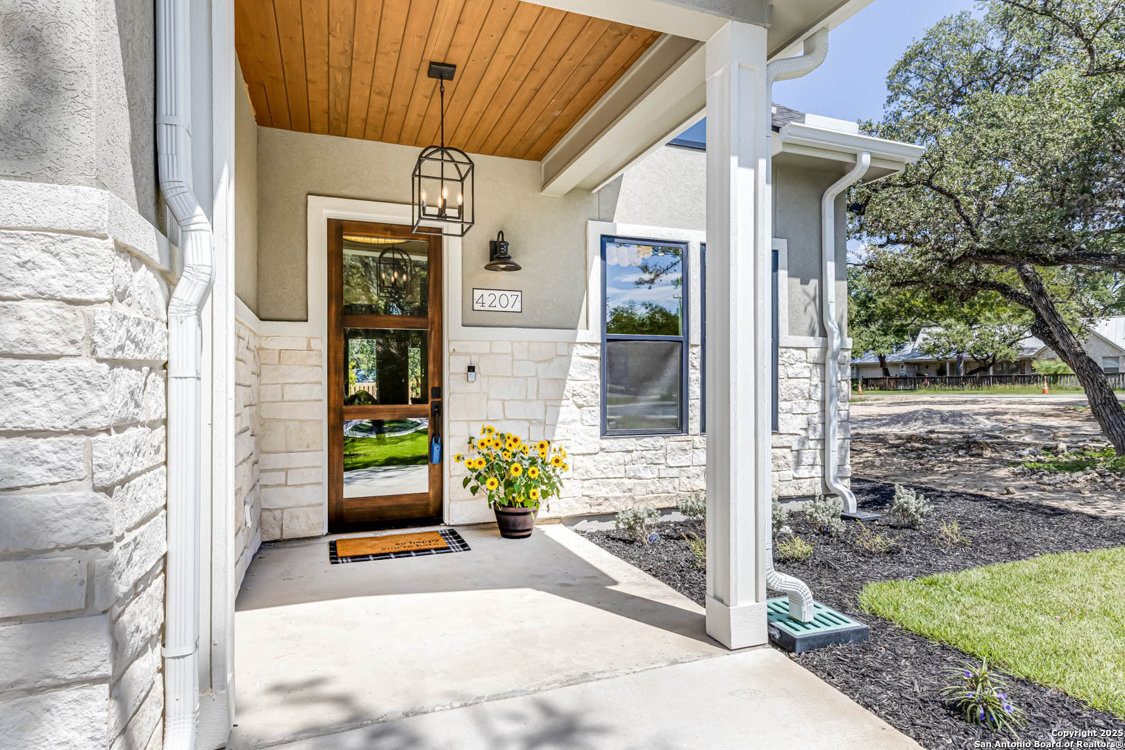 New construction 2025 with NO HOA, mature shade trees, and spaces built to entertain. Curb appeal with a wood-and-glass entry. A welcoming foyer leads to a vaulted living room with wood beams and open dining. The showpiece kitchen delivers custom cabinetry, upgraded quartz, a large island, custom vent hood, and a butler's pantry beyond the arched hall. Dedicated office with double iron French doors. Smart split layout with the primary suite downstairs; secondary bedrooms, each with walk-in closets, are set apart for privacy. The primary bath features a dual-sink vanity, freestanding soaking tub, large glass shower, and an oversized built-in closet. Wide-plank floors and upgraded fixtures throughout. Outside: oversized covered patio with stained tongue-and-groove ceiling and dual fans overlooking a private, landscaped yard with full irrigation. Energy Efficient home is Minutes to I-10/1604, The Shops at La Cantera, The Rim, and an easy 10 minutes to the Medical Center. 2-10 builder's warranty.