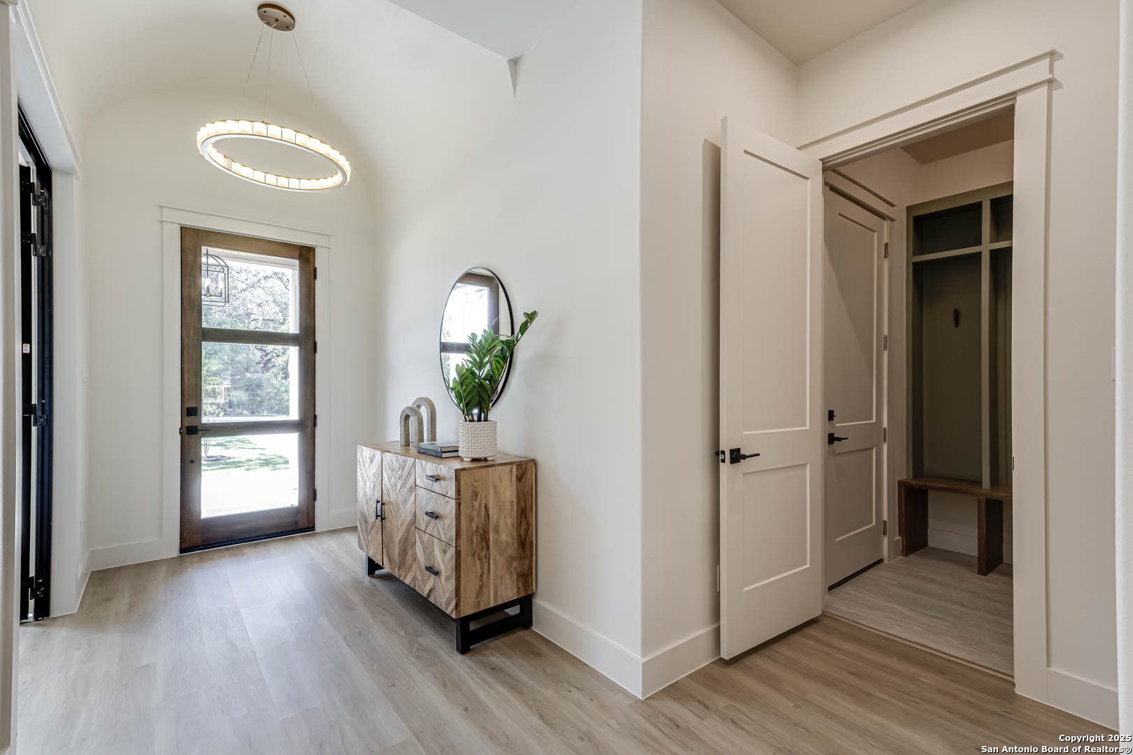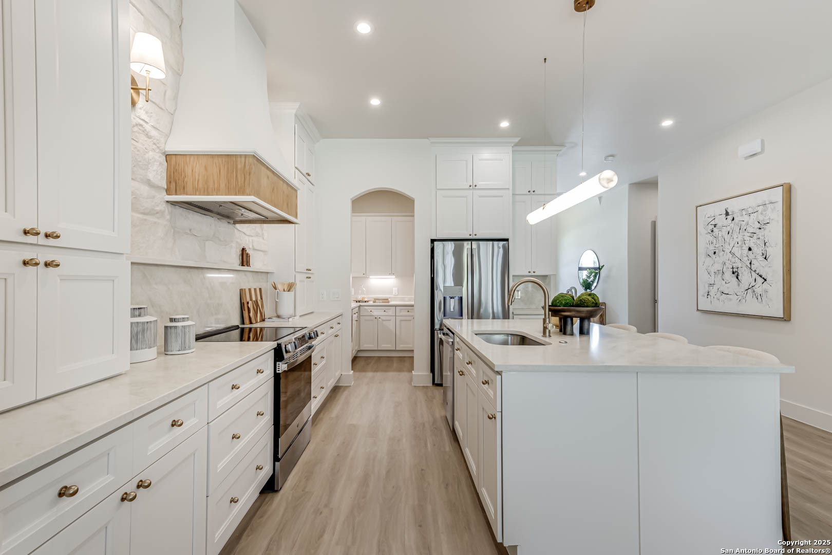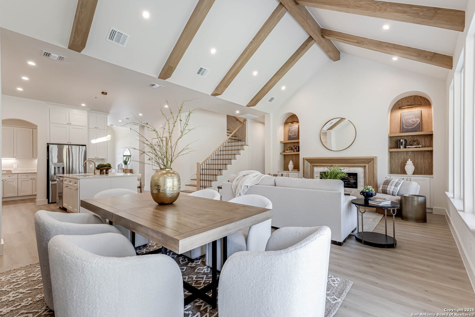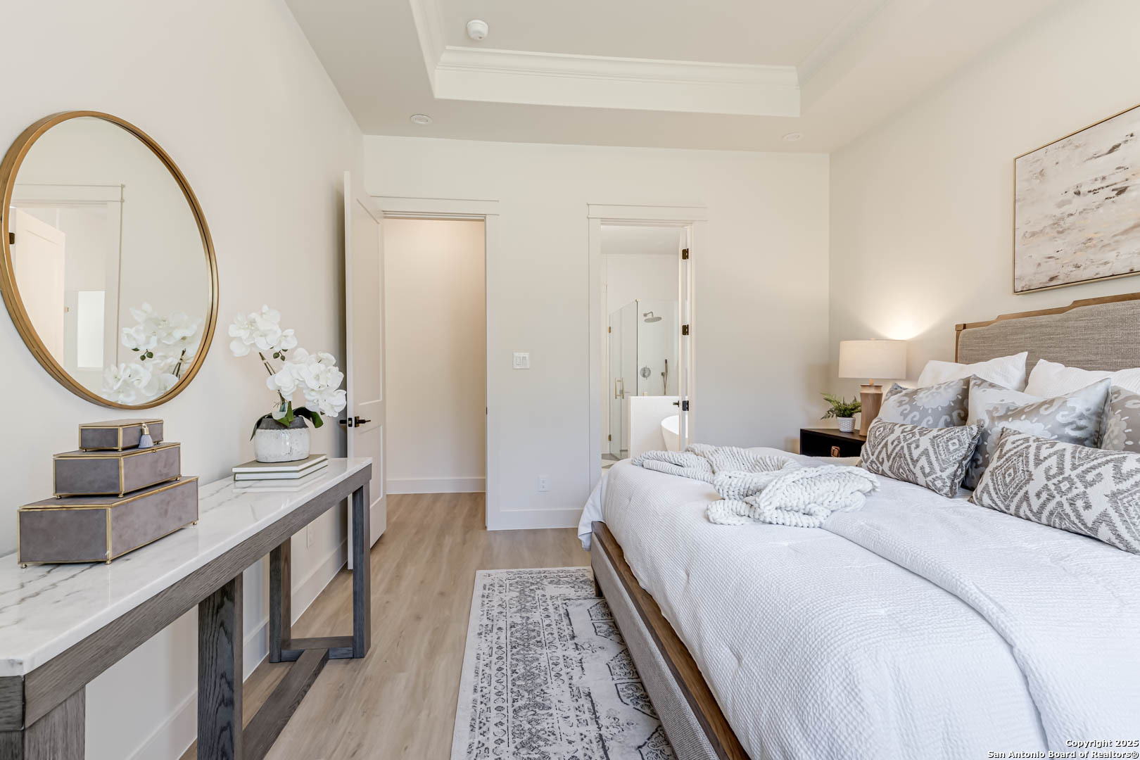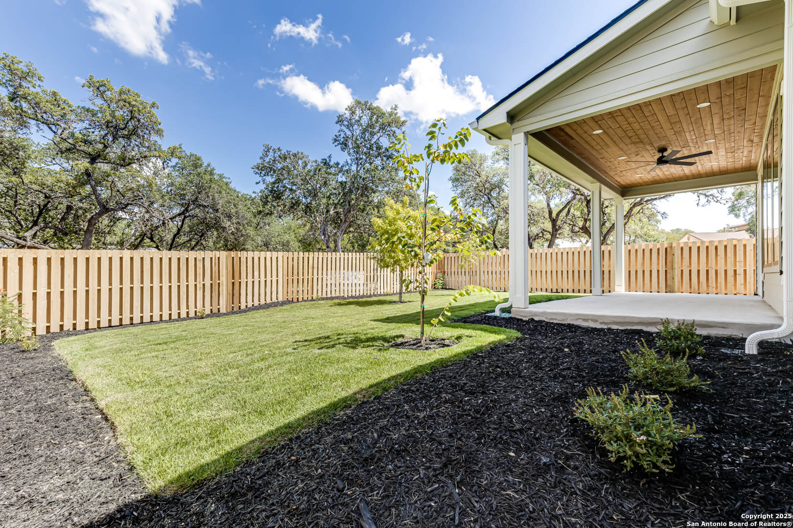 New construction 2025 with NO HOA, mature shade trees, and spaces built to entertain. Curb appeal with a wood-and-glass entry. A welcoming foyer leads to a vaulted living room with wood beams and open dining. The showpiece kitchen delivers custom cabinetry, upgraded quartz, a large island, custom vent hood, and a butler's pantry beyond the arched hall. Dedicated office with double iron French doors. Smart split layout with the primary suite downstairs; secondary bedrooms, each with walk-in closets, are set apart for privacy. The primary bath features a dual-sink vanity, freestanding soaking tub, large glass shower, and an oversized built-in closet. Wide-plank floors and upgraded fixtures throughout. Outside: oversized covered patio with stained tongue-and-groove ceiling and dual fans overlooking a private, landscaped yard with full irrigation. Energy Efficient home is Minutes to I-10/1604, The Shops at La Cantera, The Rim, and an easy 10 minutes to the Medical Center. 2-10 builder's warranty.