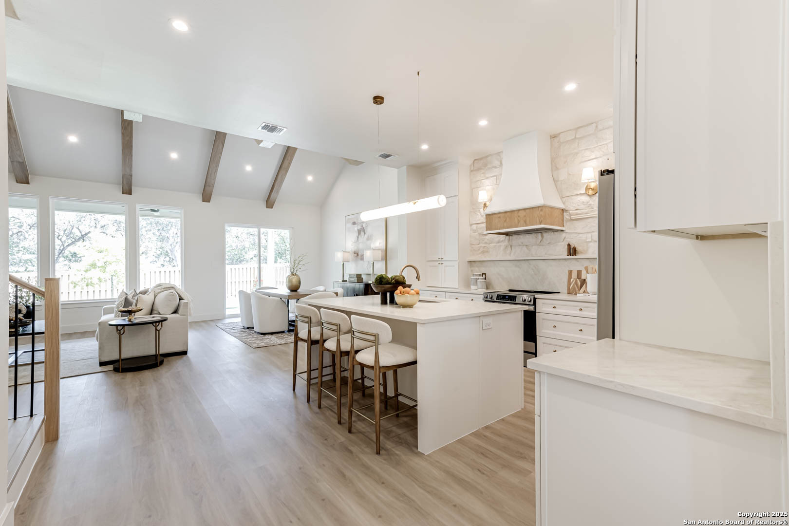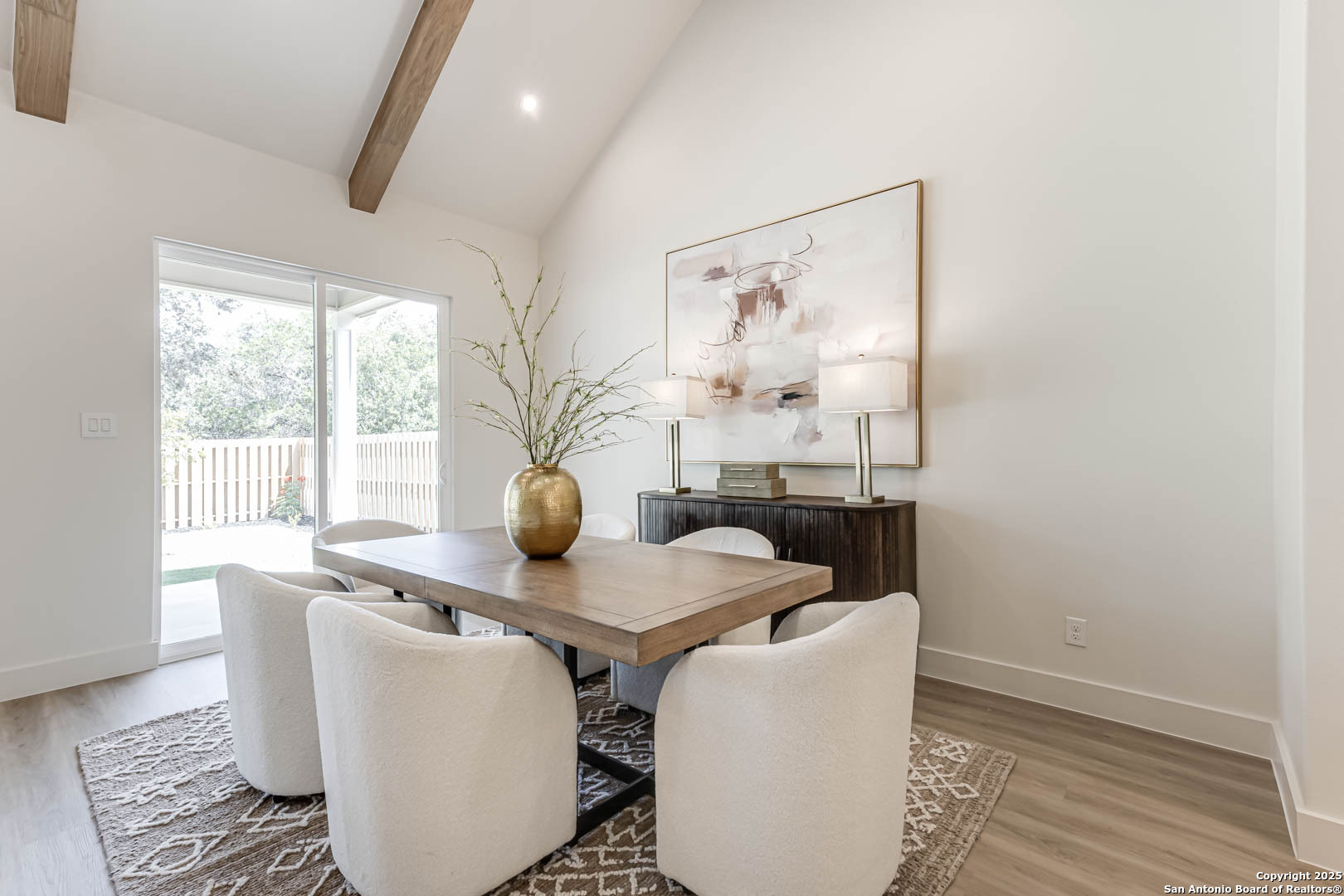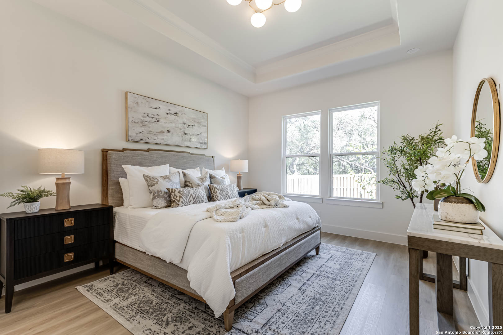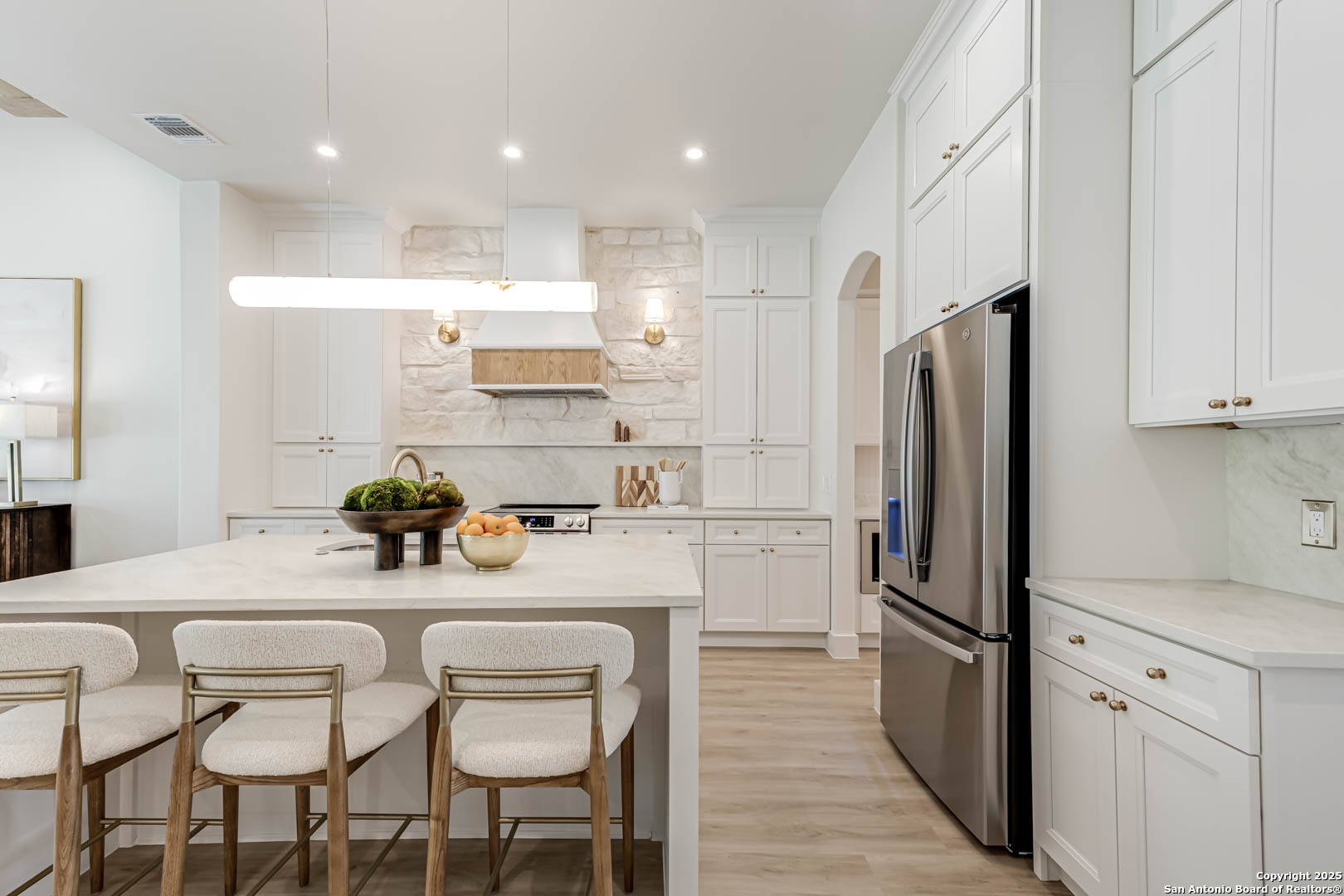 New construction 2025 with NO HOA, mature shade trees, and spaces built to entertain. Curb appeal with a wood-and-glass entry. A welcoming foyer leads to a vaulted living room with wood beams and open dining. The showpiece kitchen delivers custom cabinetry, upgraded quartz, a large island, custom vent hood, and a butler's pantry beyond the arched hall. Dedicated office with double iron French doors. Smart split layout with the primary suite downstairs; secondary bedrooms, each with walk-in closets, are set apart for privacy. The primary bath features a dual-sink vanity, freestanding soaking tub, large glass shower, and an oversized built-in closet. Wide-plank floors and upgraded fixtures throughout. Outside: oversized covered patio with stained tongue-and-groove ceiling and dual fans overlooking a private, landscaped yard with full irrigation. Energy Efficient home is Minutes to I-10/1604, The Shops at La Cantera, The Rim, and an easy 10 minutes to the Medical Center. 2-10 builder's warranty.