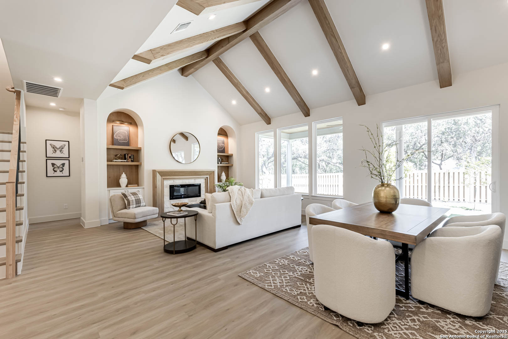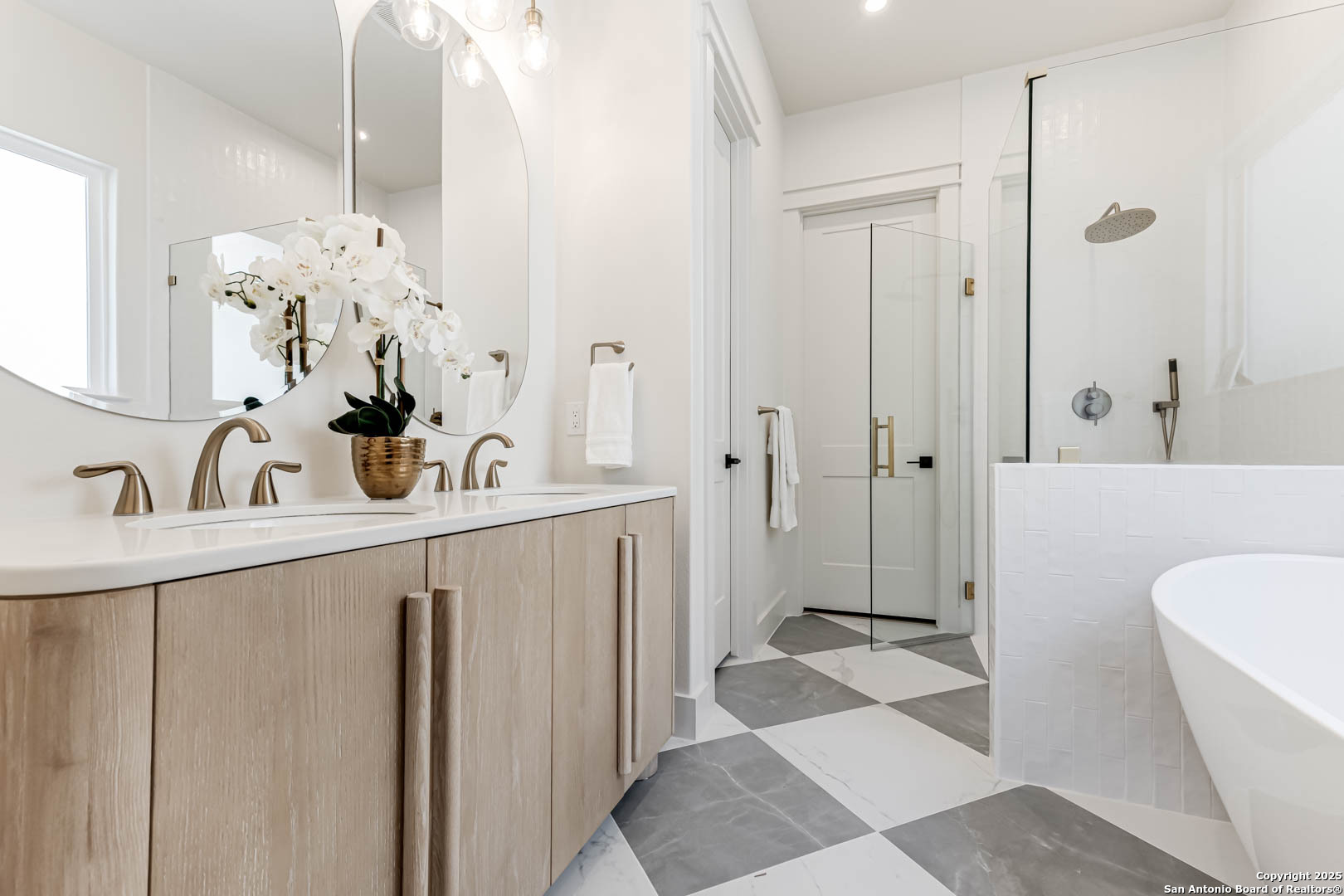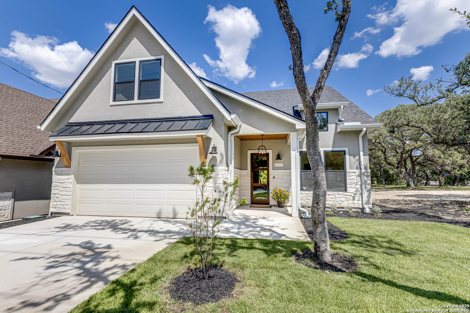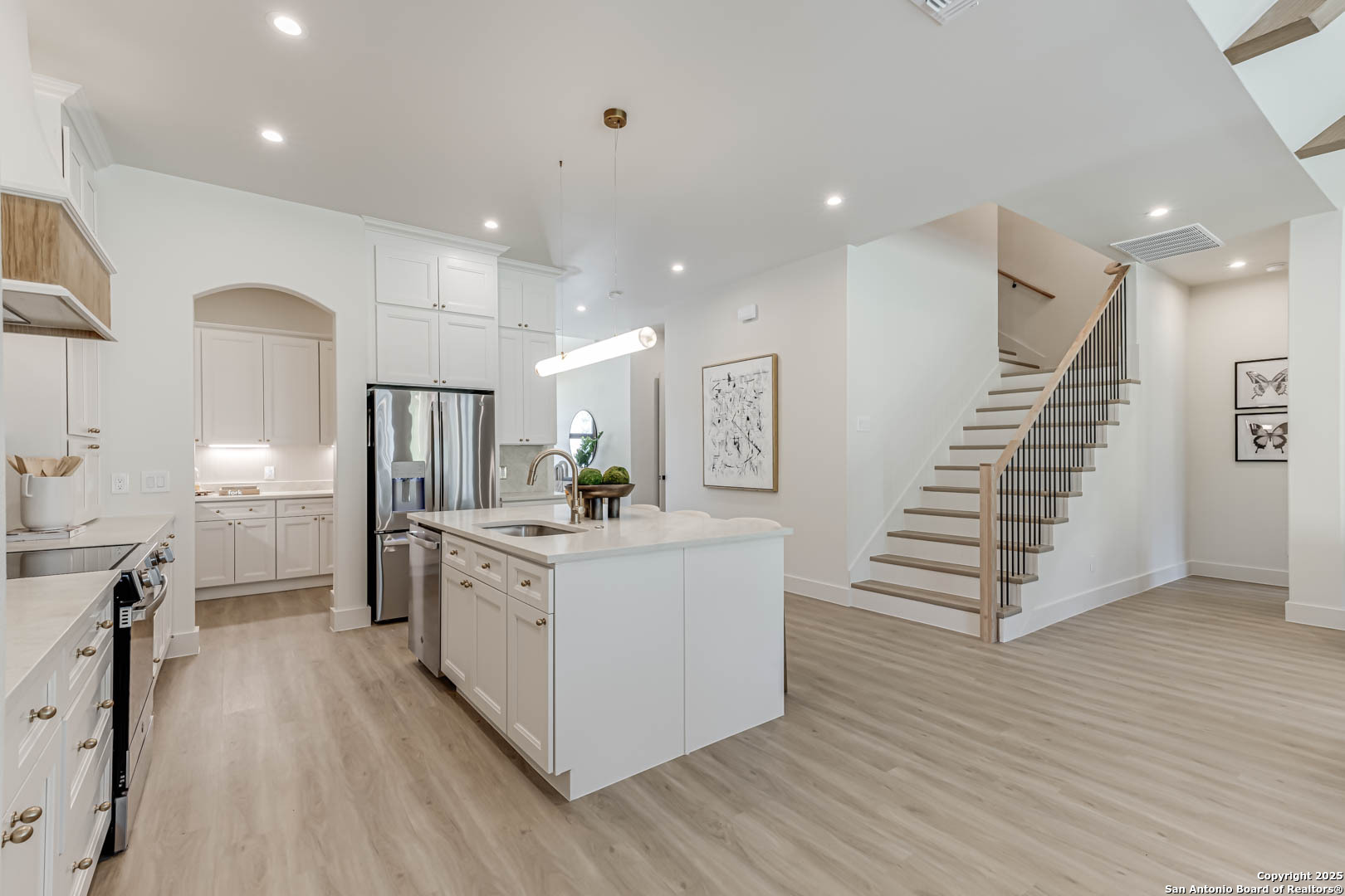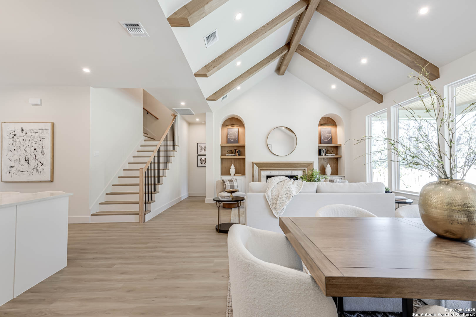 New construction 2025 with NO HOA, mature shade trees, and spaces built to entertain. Curb appeal with a wood-and-glass entry. A welcoming foyer leads to a vaulted living room with wood beams and open dining. The showpiece kitchen delivers custom cabinetry, upgraded quartz, a large island, custom vent hood, and a butler's pantry beyond the arched hall. Dedicated office with double iron French doors. Smart split layout with the primary suite downstairs; secondary bedrooms, each with walk-in closets, are set apart for privacy. The primary bath features a dual-sink vanity, freestanding soaking tub, large glass shower, and an oversized built-in closet. Wide-plank floors and upgraded fixtures throughout. Outside: oversized covered patio with stained tongue-and-groove ceiling and dual fans overlooking a private, landscaped yard with full irrigation. Energy Efficient home is Minutes to I-10/1604, The Shops at La Cantera, The Rim, and an easy 10 minutes to the Medical Center. 2-10 builder's warranty.