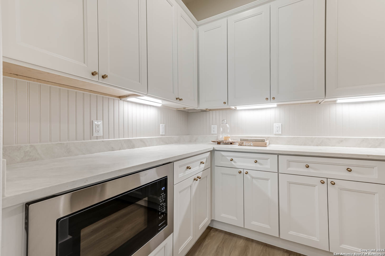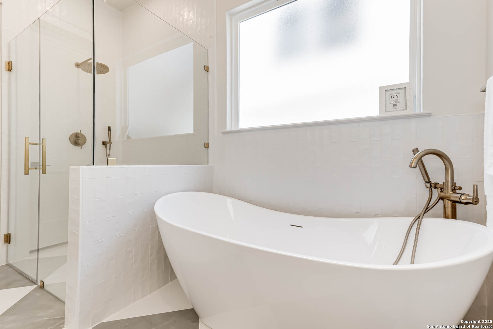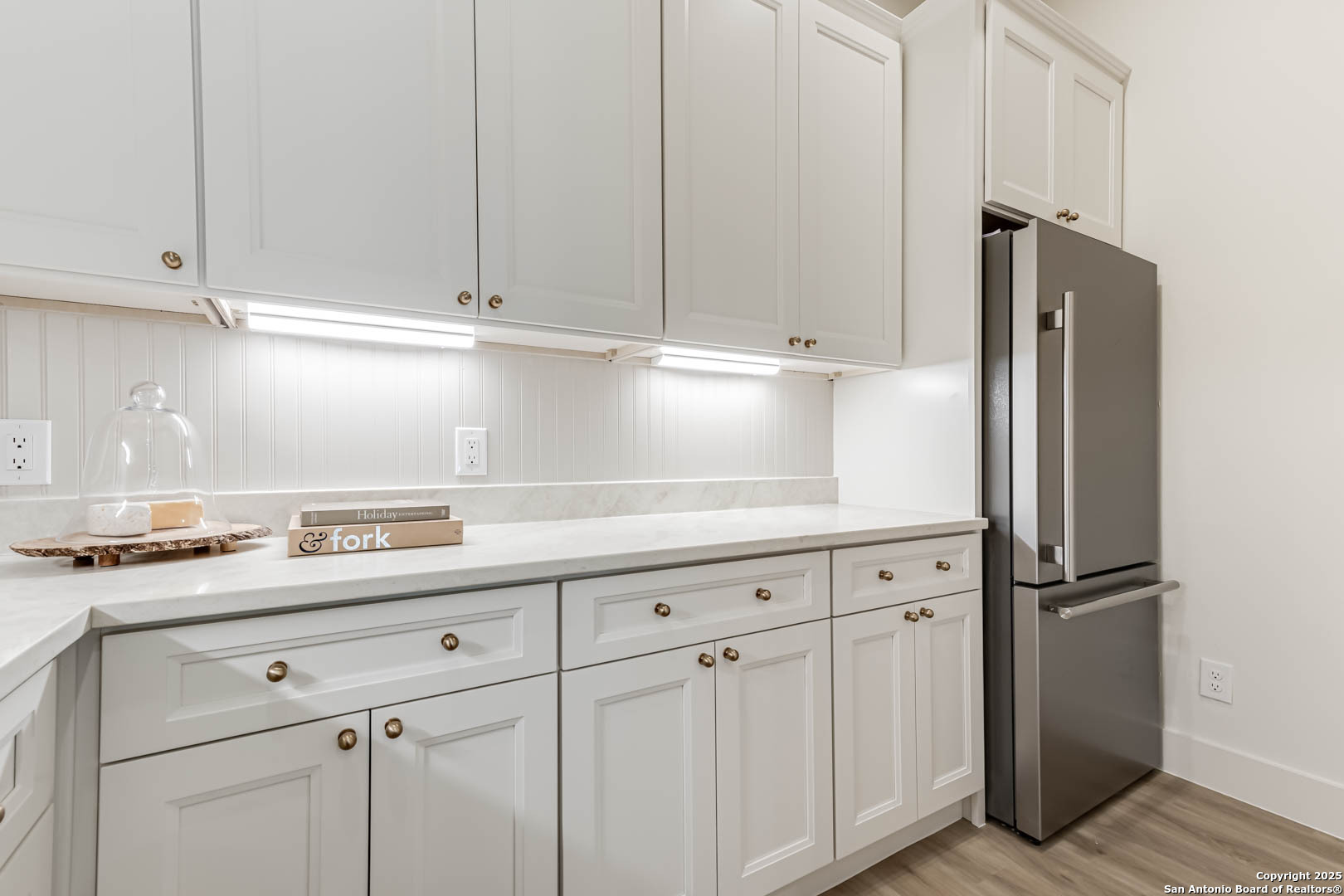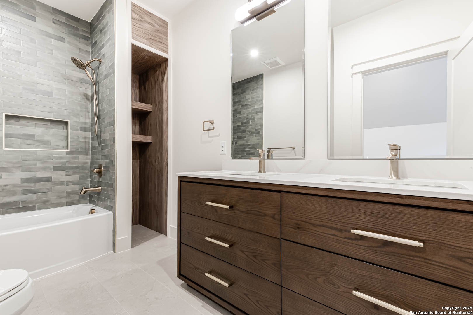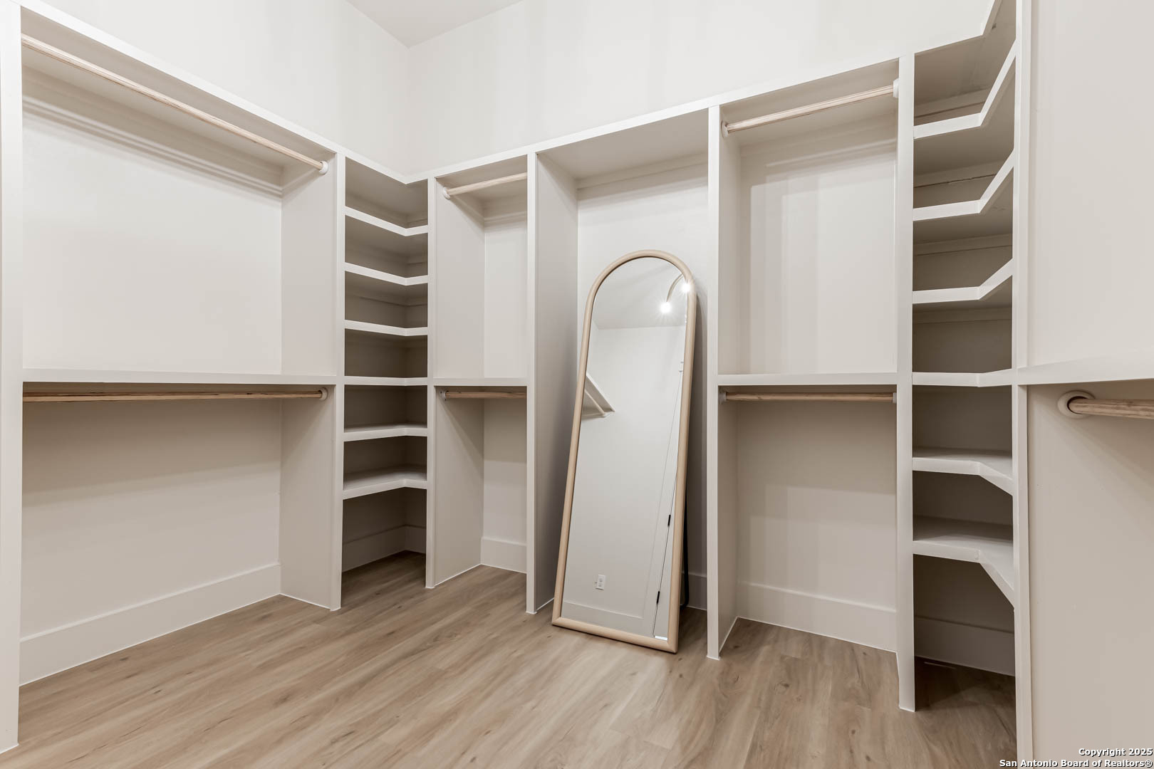 New construction 2025 with NO HOA, mature shade trees, and spaces built to entertain. Curb appeal with a wood-and-glass entry. A welcoming foyer leads to a vaulted living room with wood beams and open dining. The showpiece kitchen delivers custom cabinetry, upgraded quartz, a large island, custom vent hood, and a butler's pantry beyond the arched hall. Dedicated office with double iron French doors. Smart split layout with the primary suite downstairs; secondary bedrooms, each with walk-in closets, are set apart for privacy. The primary bath features a dual-sink vanity, freestanding soaking tub, large glass shower, and an oversized built-in closet. Wide-plank floors and upgraded fixtures throughout. Outside: oversized covered patio with stained tongue-and-groove ceiling and dual fans overlooking a private, landscaped yard with full irrigation. Energy Efficient home is Minutes to I-10/1604, The Shops at La Cantera, The Rim, and an easy 10 minutes to the Medical Center. 2-10 builder's warranty.