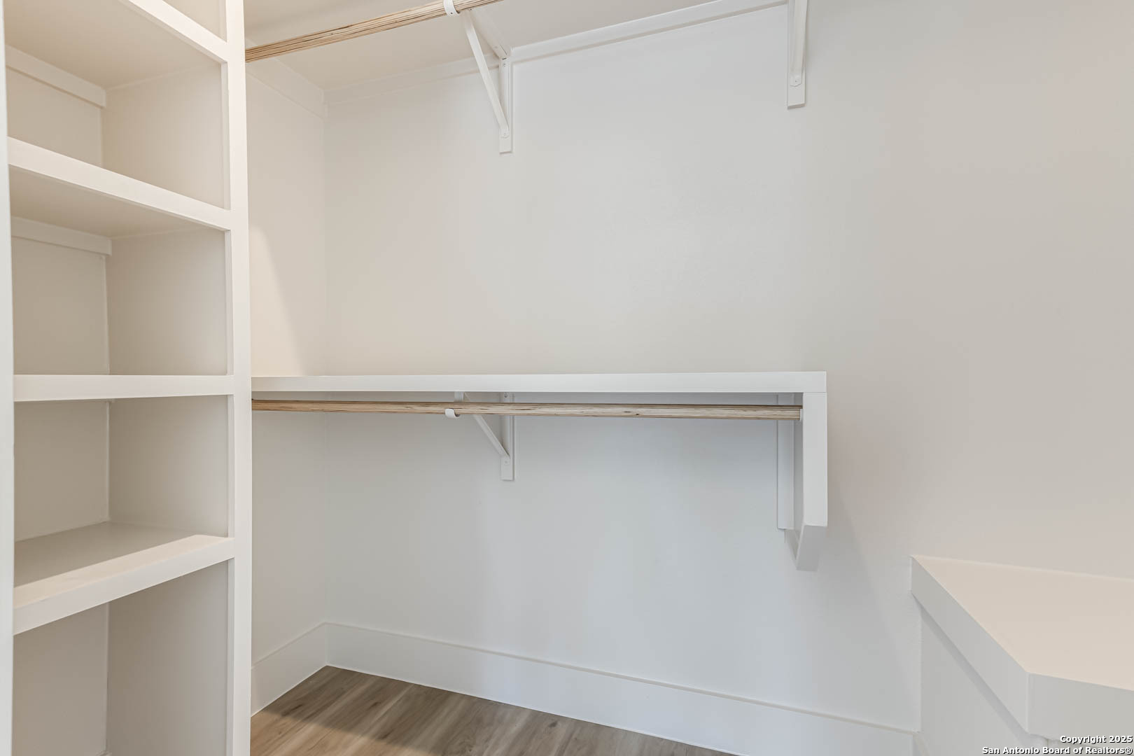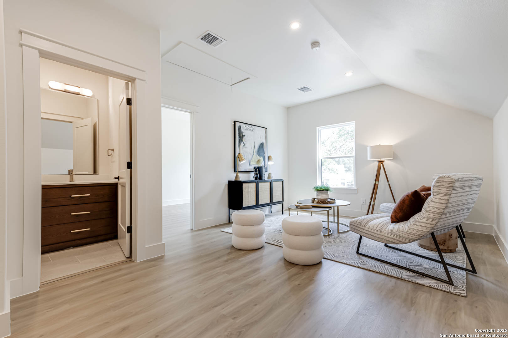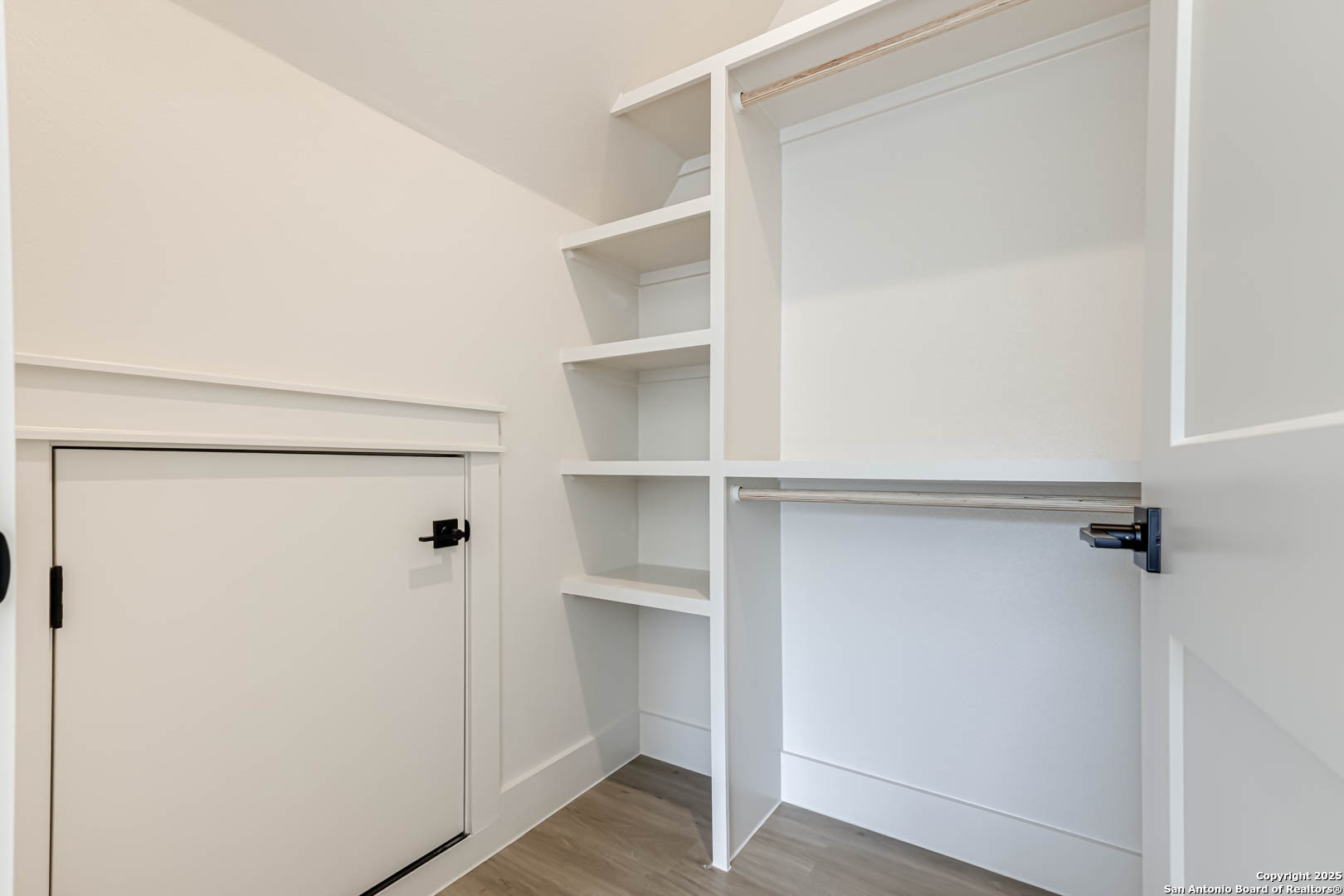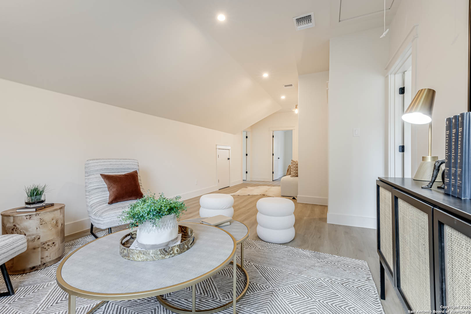 New construction 2025 with NO HOA, mature shade trees, and spaces built to entertain. Curb appeal with a wood-and-glass entry. A welcoming foyer leads to a vaulted living room with wood beams and open dining. The showpiece kitchen delivers custom cabinetry, upgraded quartz, a large island, custom vent hood, and a butler's pantry beyond the arched hall. Dedicated office with double iron French doors. Smart split layout with the primary suite downstairs; secondary bedrooms, each with walk-in closets, are set apart for privacy. The primary bath features a dual-sink vanity, freestanding soaking tub, large glass shower, and an oversized built-in closet. Wide-plank floors and upgraded fixtures throughout. Outside: oversized covered patio with stained tongue-and-groove ceiling and dual fans overlooking a private, landscaped yard with full irrigation. Energy Efficient home is Minutes to I-10/1604, The Shops at La Cantera, The Rim, and an easy 10 minutes to the Medical Center. 2-10 builder's warranty.