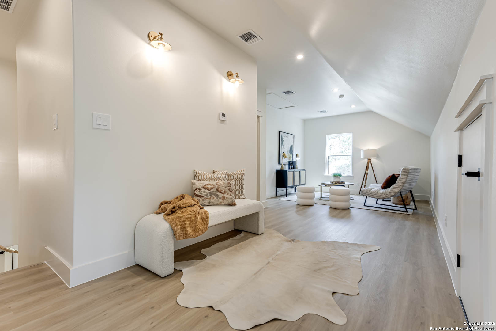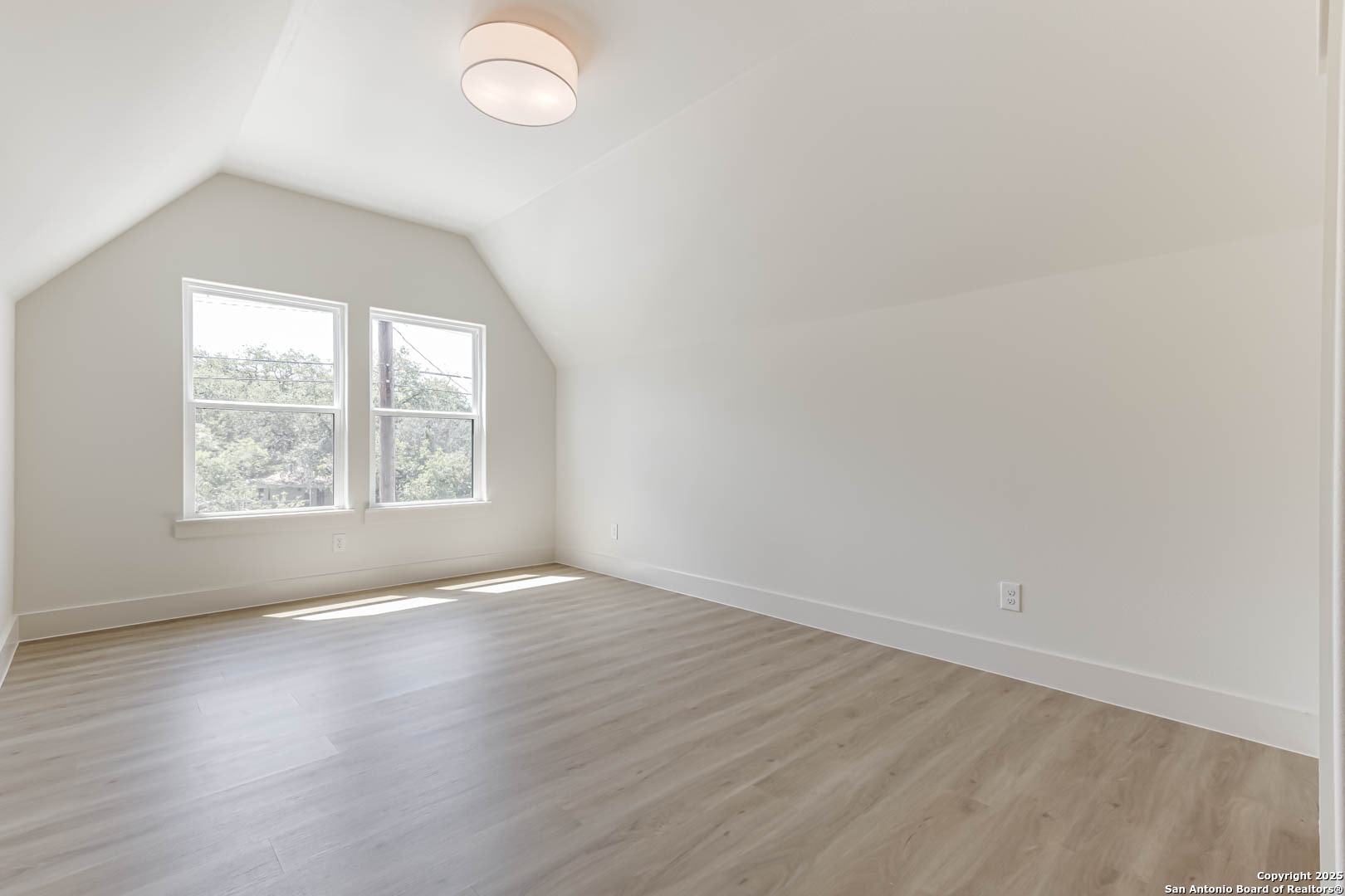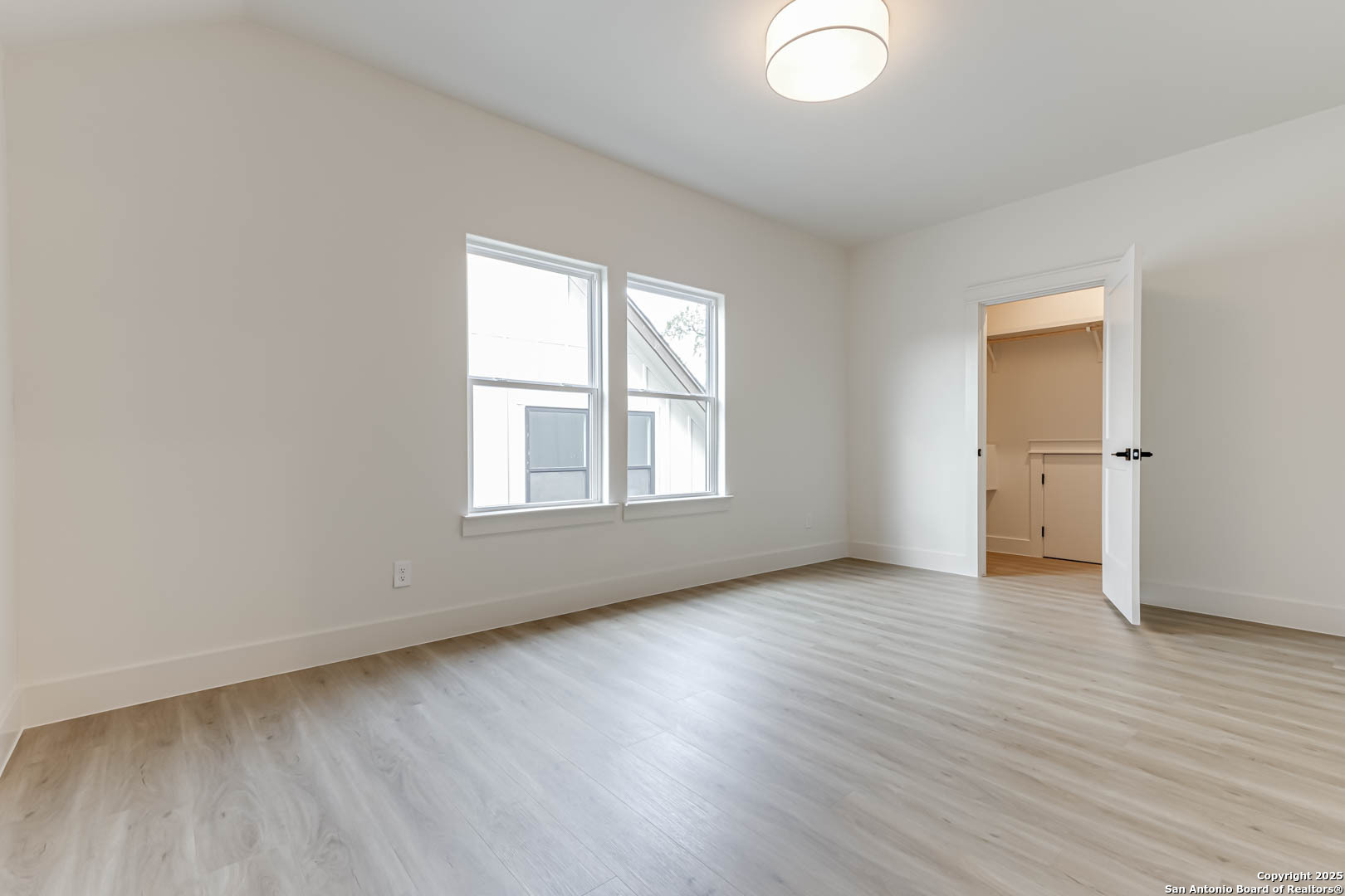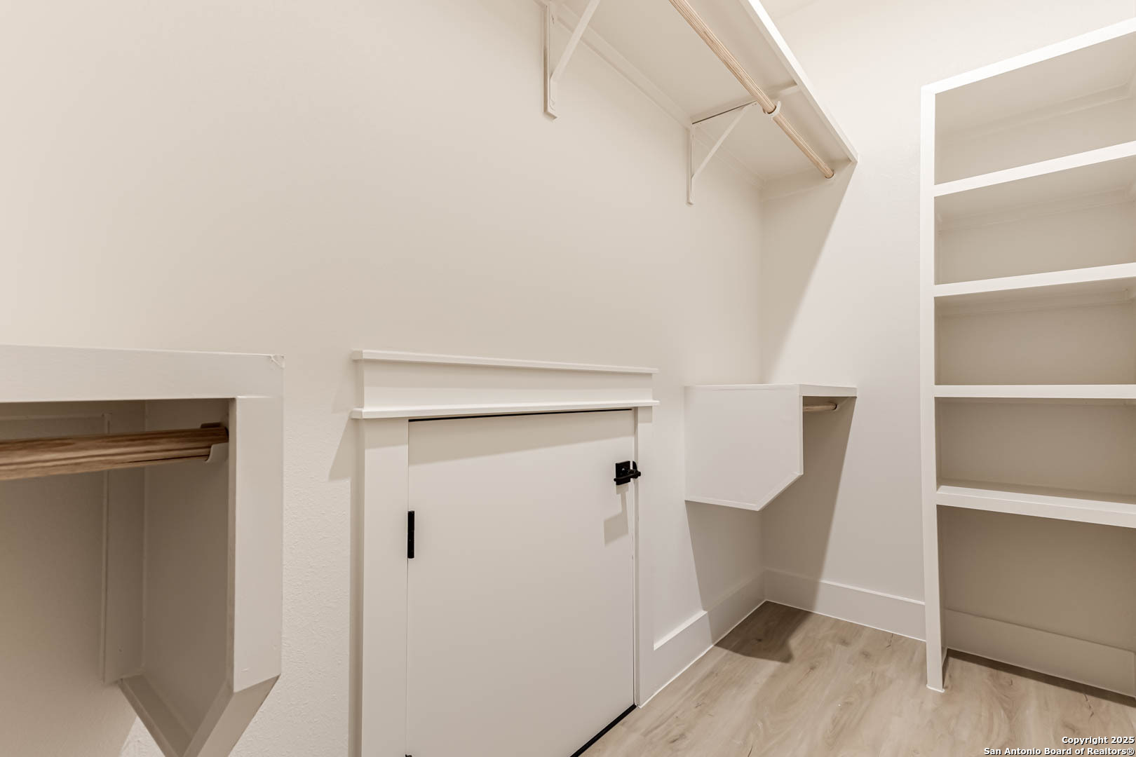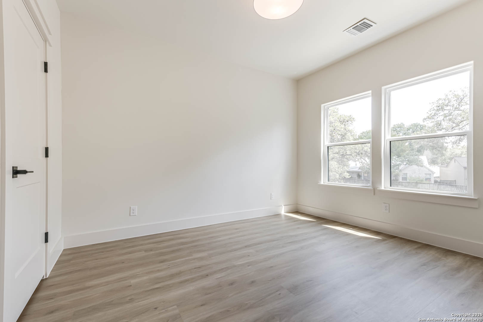 New construction 2025 with NO HOA, mature shade trees, and spaces built to entertain. Curb appeal with a wood-and-glass entry. A welcoming foyer leads to a vaulted living room with wood beams and open dining. The showpiece kitchen delivers custom cabinetry, upgraded quartz, a large island, custom vent hood, and a butler's pantry beyond the arched hall. Dedicated office with double iron French doors. Smart split layout with the primary suite downstairs; secondary bedrooms, each with walk-in closets, are set apart for privacy. The primary bath features a dual-sink vanity, freestanding soaking tub, large glass shower, and an oversized built-in closet. Wide-plank floors and upgraded fixtures throughout. Outside: oversized covered patio with stained tongue-and-groove ceiling and dual fans overlooking a private, landscaped yard with full irrigation. Energy Efficient home is Minutes to I-10/1604, The Shops at La Cantera, The Rim, and an easy 10 minutes to the Medical Center. 2-10 builder's warranty.