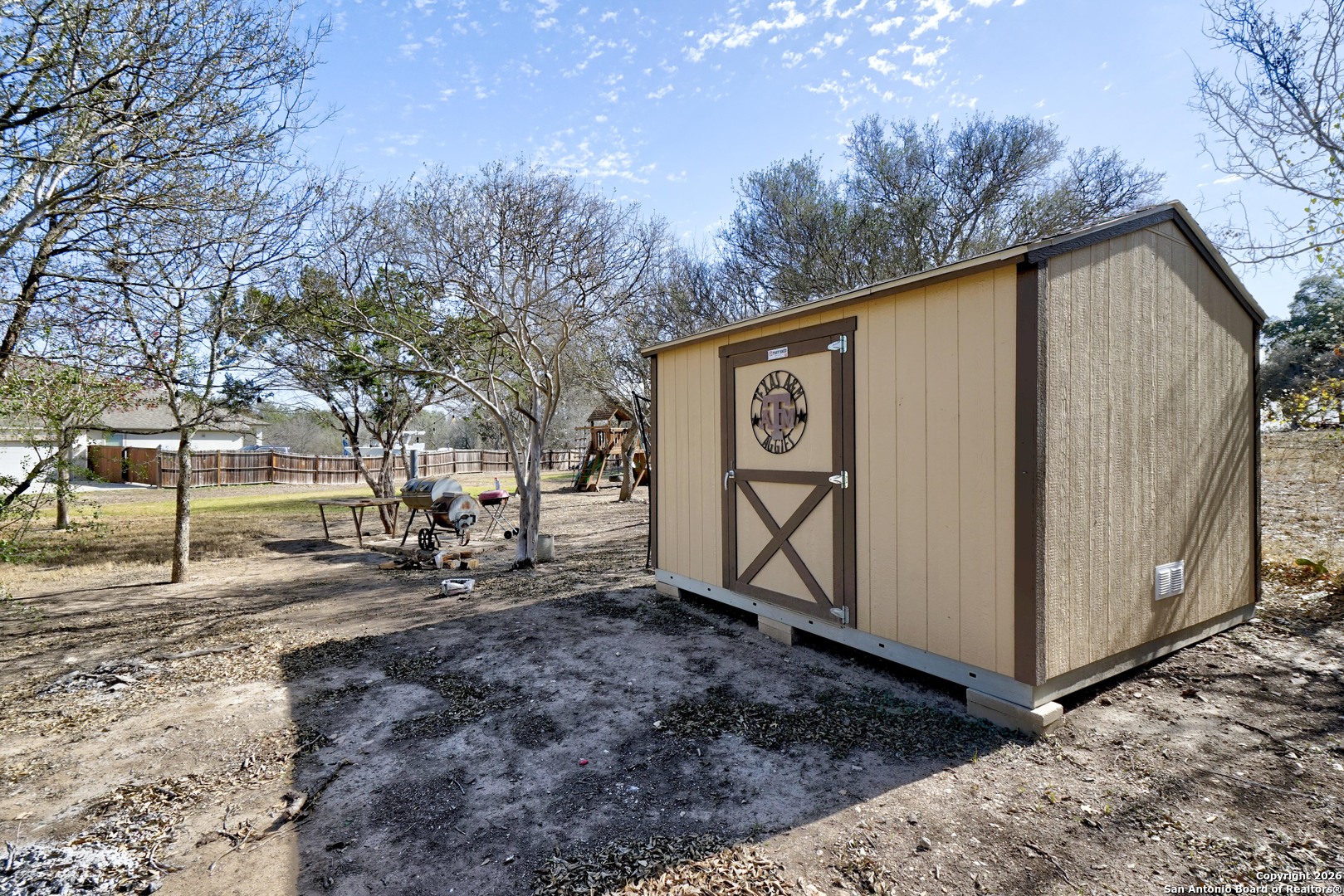 Welcome to this spacious and well-appointed 4-bedroom, 4-bath home in Saddle Creek Estates, situated on an oversized 0.576-acre corner lot in Northwest San Antonio. Built in 2017, this two-story home offers 2,770 square feet of thoughtfully designed living space featuring high ceilings, an open floor plan, and a main-level primary suite with a walk-in closet and double-vanity bath. The kitchen is ideal for everyday living and entertaining with an island, walk-in pantry, built-in appliances, smooth cooktop, and multiple dining areas. Additional highlights include a separate dining room, loft-style second living area, secondary bedroom on the main level, interior utility room, and a cozy living room fireplace. Enjoy outdoor living under the covered patio with a sprinkler system, storage shed, and plenty of room to expand or customize the backyard. A rare three-car attached garage, septic system, and corner lot positioning add to the home's appeal. Conveniently located near Loop 1604, Hwy 151, Lackland AFB, shopping, dining, and top-rated Northside ISD schools, this move-in-ready home offers space, functionality, and location at an exceptional value.