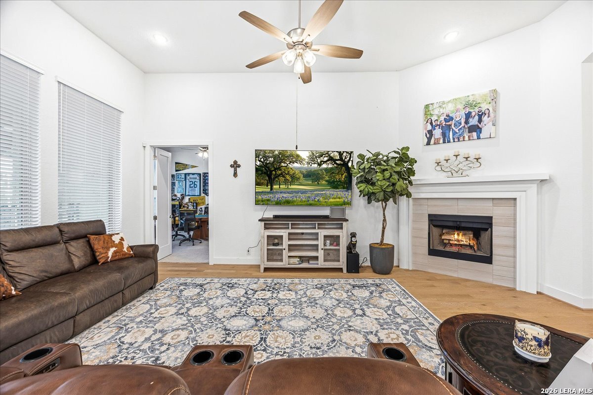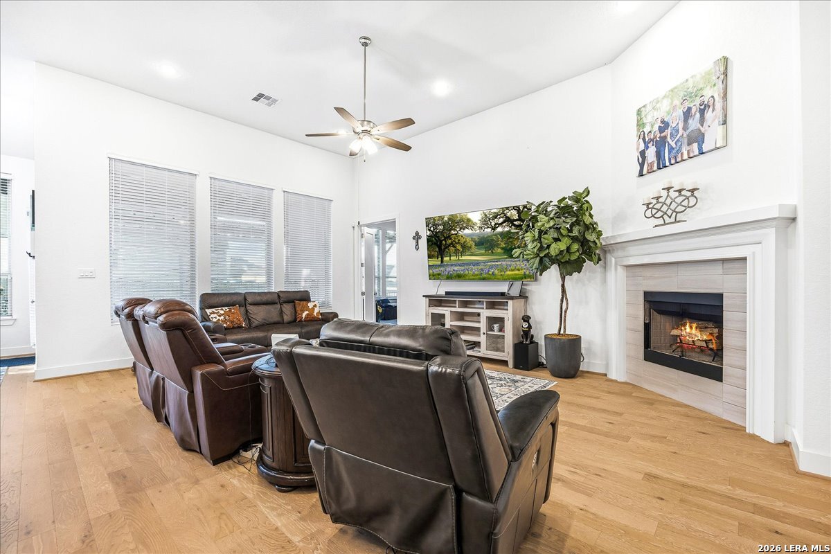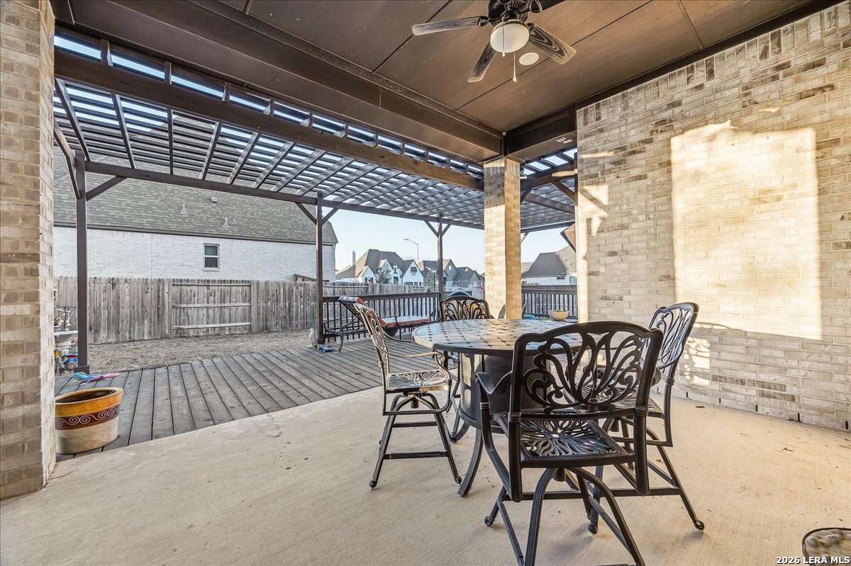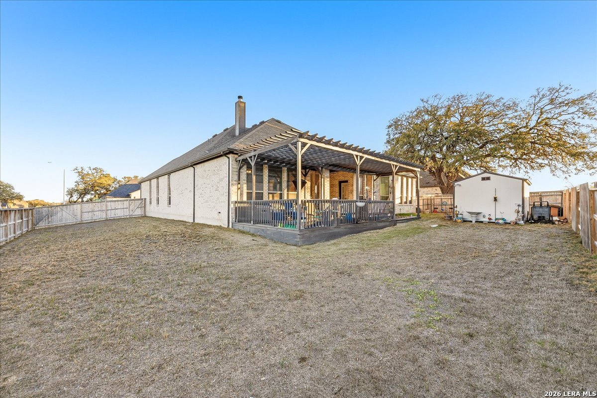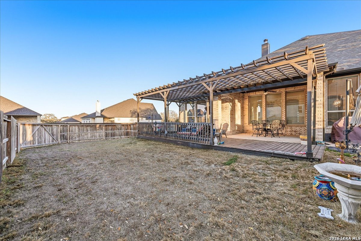 Welcome to this beautifully upgraded single-story home on a desirable corner lot in Cibolo. Offering 3,689 square feet of thoughtfully designed living space, this move-in ready property combines comfort, style, and functionality - all on one level. Since purchase, the homeowners have invested over $50,000 in additional upgrades, enhancing both the beauty and livability of the home. Inside, you'll find upgraded flooring throughout, including rich wood, tile, and plush carpeting, along with enhanced cabinetry, countertops, and a stylish backsplash that elevate the kitchen and main living areas. The bathrooms feature upgraded shower tile and flooring, creating a refined, spa-like feel. Custom 2" wood slat blinds throughout, ceiling fans in every room, and built-in internet drops in the bedrooms provide both comfort and modern convenience. Designed for flexible living and entertaining, the home includes a spacious game room plus a large private guest suite ideal for multigenerational living or extended stays. Step outside to a backyard built for enjoyment, featuring a substantial deck and pergola, permanent Astoria exterior lighting, and electrical service to both the deck and shed. Additional practical upgrades include full gutters, garage ceiling storage racks for excellent organization, and front and rear security cameras. Completing the property is a highly desirable three-car tandem garage, offering ample space for vehicles, storage, or hobbies. This exceptional home delivers extensive post-purchase upgrades, generous living space, and standout features in a prime corner-lot setting within one of Cibolo's most sought-after communities.