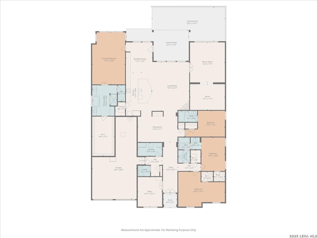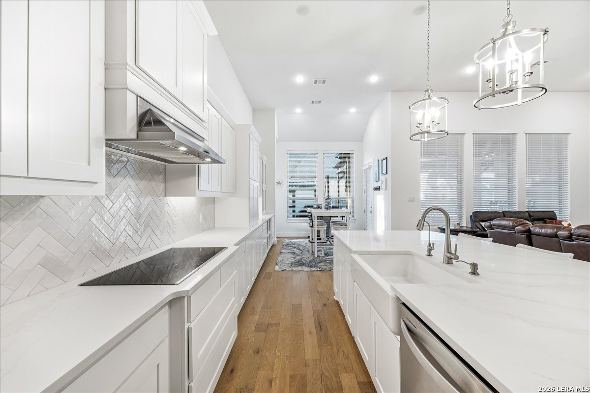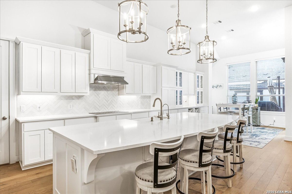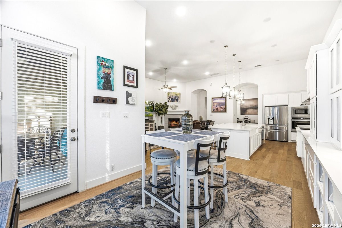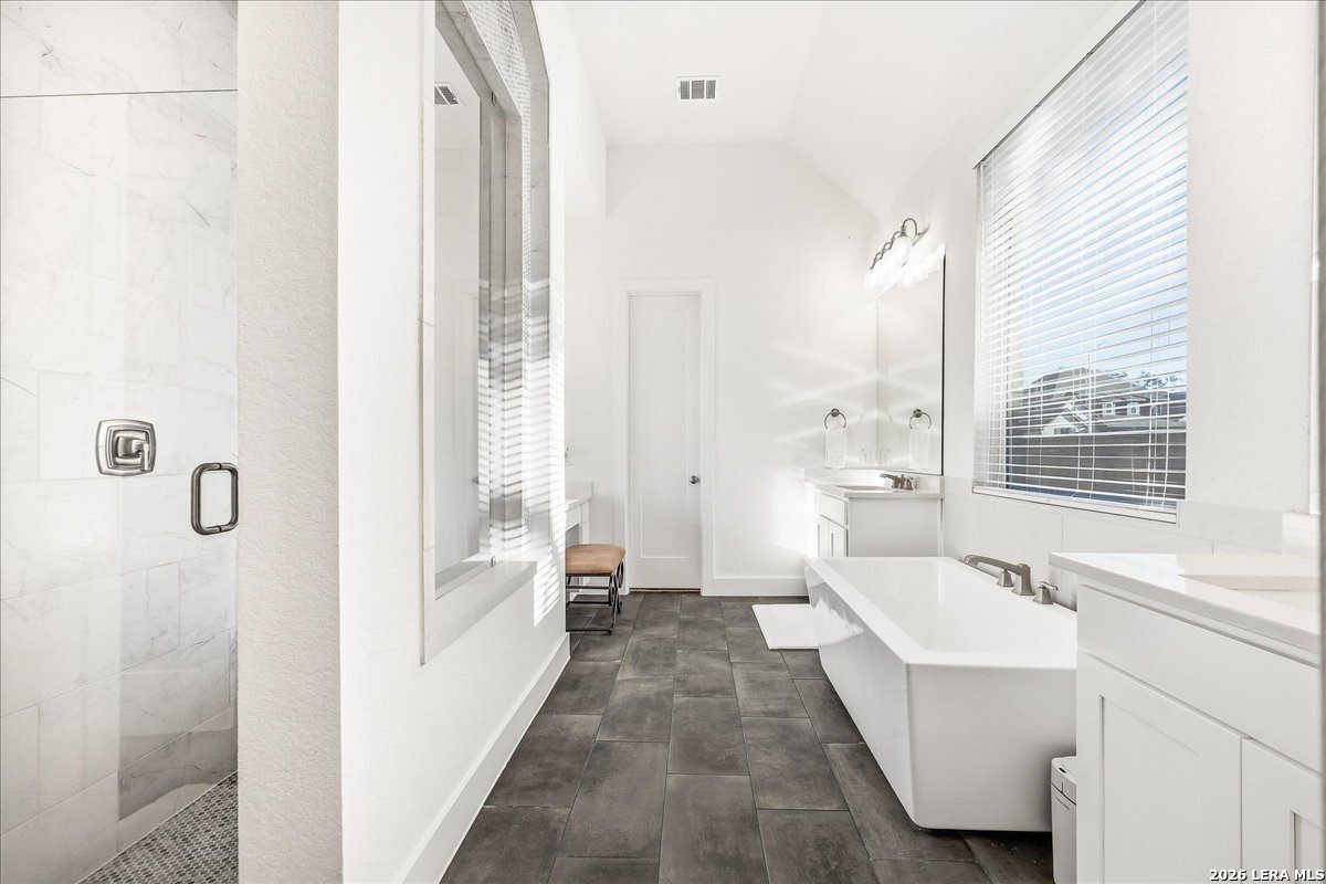 Welcome to this beautifully upgraded single-story home on a desirable corner lot in Cibolo. Offering 3,689 square feet of thoughtfully designed living space, this move-in ready property combines comfort, style, and functionality - all on one level. Since purchase, the homeowners have invested over $50,000 in additional upgrades, enhancing both the beauty and livability of the home. Inside, you'll find upgraded flooring throughout, including rich wood, tile, and plush carpeting, along with enhanced cabinetry, countertops, and a stylish backsplash that elevate the kitchen and main living areas. The bathrooms feature upgraded shower tile and flooring, creating a refined, spa-like feel. Custom 2" wood slat blinds throughout, ceiling fans in every room, and built-in internet drops in the bedrooms provide both comfort and modern convenience. Designed for flexible living and entertaining, the home includes a spacious game room plus a large private guest suite ideal for multigenerational living or extended stays. Step outside to a backyard built for enjoyment, featuring a substantial deck and pergola, permanent Astoria exterior lighting, and electrical service to both the deck and shed. Additional practical upgrades include full gutters, garage ceiling storage racks for excellent organization, and front and rear security cameras. Completing the property is a highly desirable three-car tandem garage, offering ample space for vehicles, storage, or hobbies. This exceptional home delivers extensive post-purchase upgrades, generous living space, and standout features in a prime corner-lot setting within one of Cibolo's most sought-after communities.
