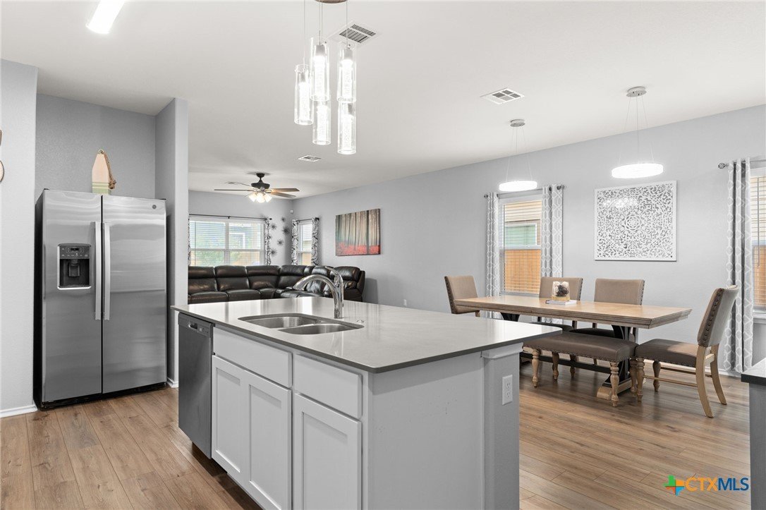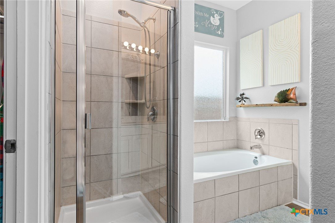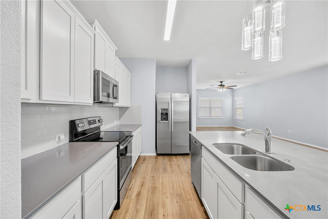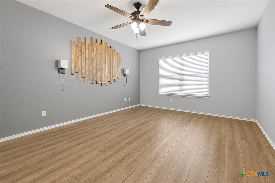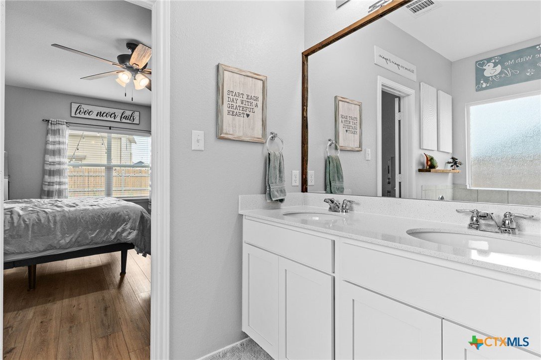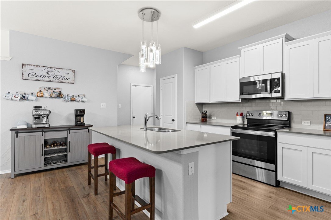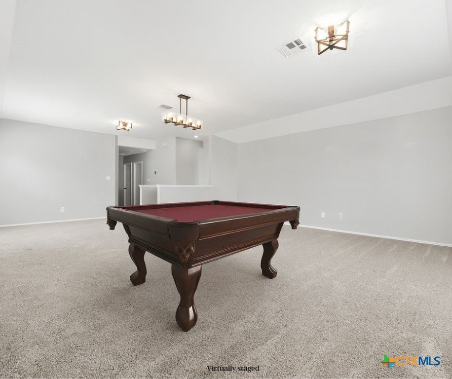 Welcome to 421 Perfect World Loop, where modern technology meets thoughtful upgrades to create a truly exceptional home. From the moment you arrive, the curb appeal sets the stage for the beauty within. Step inside and you’ll immediately notice one of this home’s standout features: crisp, clean air courtesy of a new 20 SEER HVAC system with a carbon filter and UV lighting throughout the ductwork—making this a 100% dust-free home. There is a Remi Water softener and water conditioner installed to ensure the best water for the home! This home is already equipped with modern conveniences, including wiring for a generator or Tesla charging station and smart color-changing light fixtures throughout. The open-concept main level showcases luxury vinyl plank flooring that flows seamlessly from the spacious living area to the chef-inspired kitchen with gleaming quartz countertops. The premiere suite offers a private retreat, complete with a beautifully designed ensuite and a large walk-in closet. A custom accent wall in the living room creates a perfect backdrop for entertaining. Out back, your personal oasis awaits. Professionally designed flower beds with drip irrigation ensure easy upkeep, while the soothing sounds of the waterfall feature set the tone for peaceful evenings outdoors. Upstairs, you’ll find three additional bedrooms with walk-in closets, a Texas-sized loft big enough for a pool table and couches, and plenty of space to create the lifestyle you’ve always imagined. With added touches like accent walls, stylish lighting, and a built-in dehumidifier, every detail has been considered. Owners also have access to the amenities and pools for both Cool Water and Sonterra! 421 Perfect World Loop is more than just a home—it’s a must-see haven designed for comfort, health, and style.