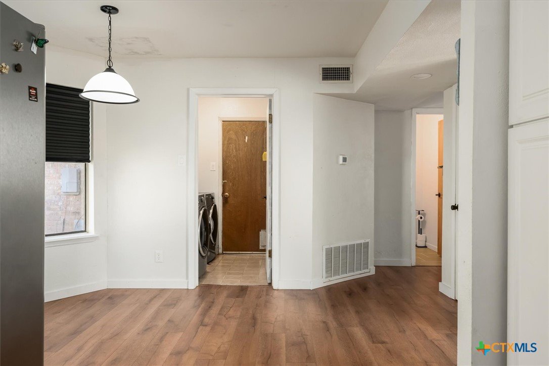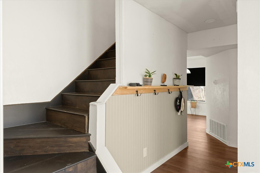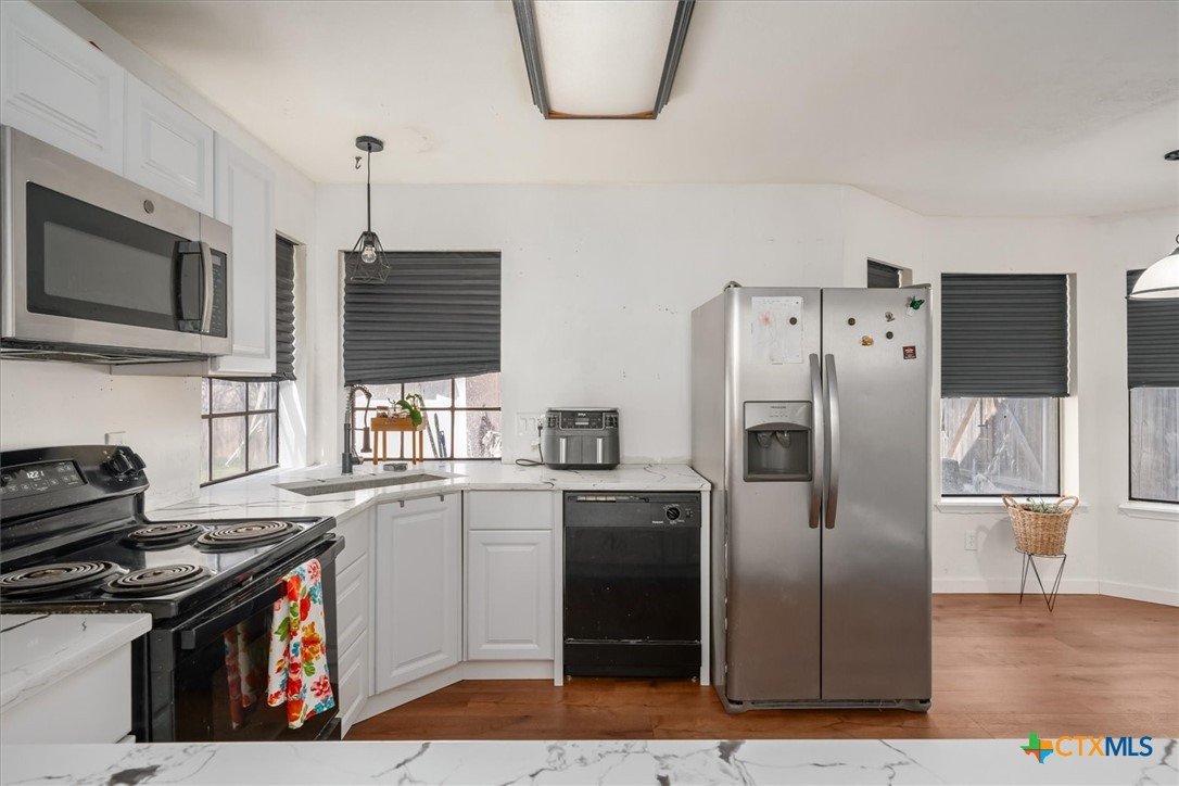 Welcome to this charming two-story home nestled in an established neighborhood off Clearfork in Lockhart! With a recently replaced roof, HVAC system, privacy fence, and foundation work, all major systems are in top-notch condition, offering peace of mind for years to come. Step inside to discover a beautifully updated interior featuring modern laminate flooring throughout, creating a seamless and stylish flow from room to room. The heart of the home is the remodeled kitchen, bathed in natural light and open to the dining area, making it the perfect space for hosting dinners and gatherings. It boasts sleek white cabinets, elegant quartz countertops, and high-end finishes, combining functionality with timeless design. Whether you're a seasoned chef or just love to entertain, this kitchen is sure to impress. Downstairs, the spacious living area features vaulted ceilings and a cozy fireplace, ideal for relaxing on cool evenings. French doors lead to the back patio and private yard, seamlessly blending indoor and outdoor living. A convenient half bathroom is located on the main level, perfect for guests. Upstairs, you'll find three bedrooms, including a tranquil master suite with an attached bathroom featuring a shower. The two secondary bedrooms share a beautifully updated hallway bathroom, complete with modern fixtures and finishes. New carpet on the stairs adds a touch of comfort and luxury. Outside, the backyard is spacious, level, and ready for your personal touch—whether it's entertaining, gardening, or even adding a pool. Located in a quiet neighborhood with no HOA, you can enjoy the freedom to make this home truly your own. Plus, the convenient location offers easy access to Toll 130, Austin, San Marcos, and Bastrop, making commuting a breeze. Don’t miss the opportunity to make this move-in-ready house your forever home, where modern updates and classic charm come together in perfect harmony!