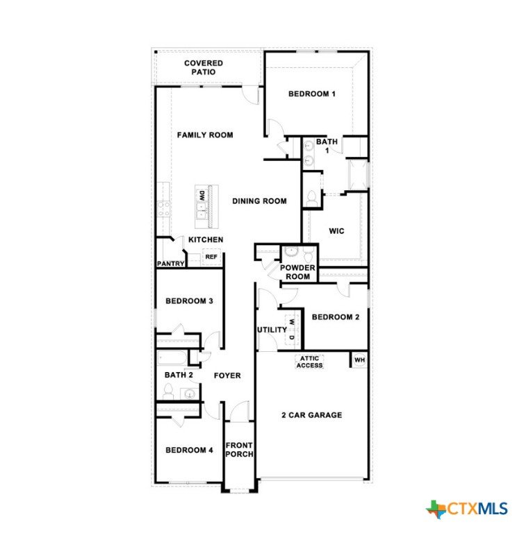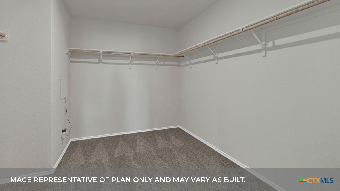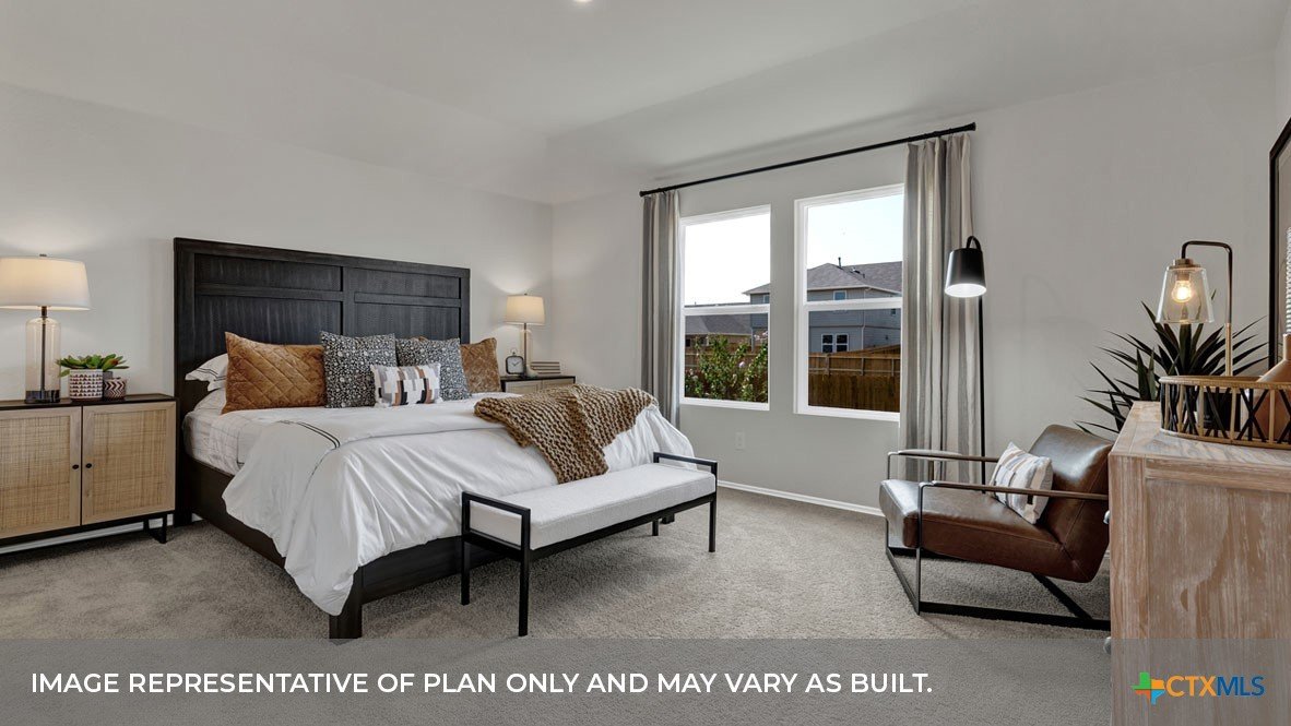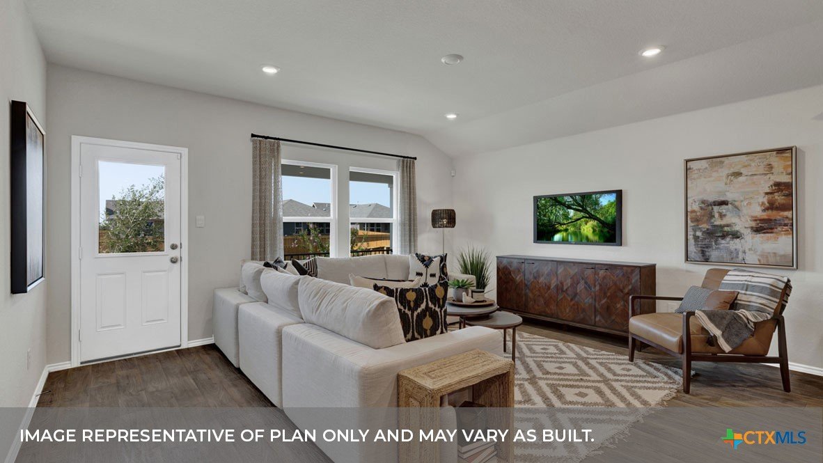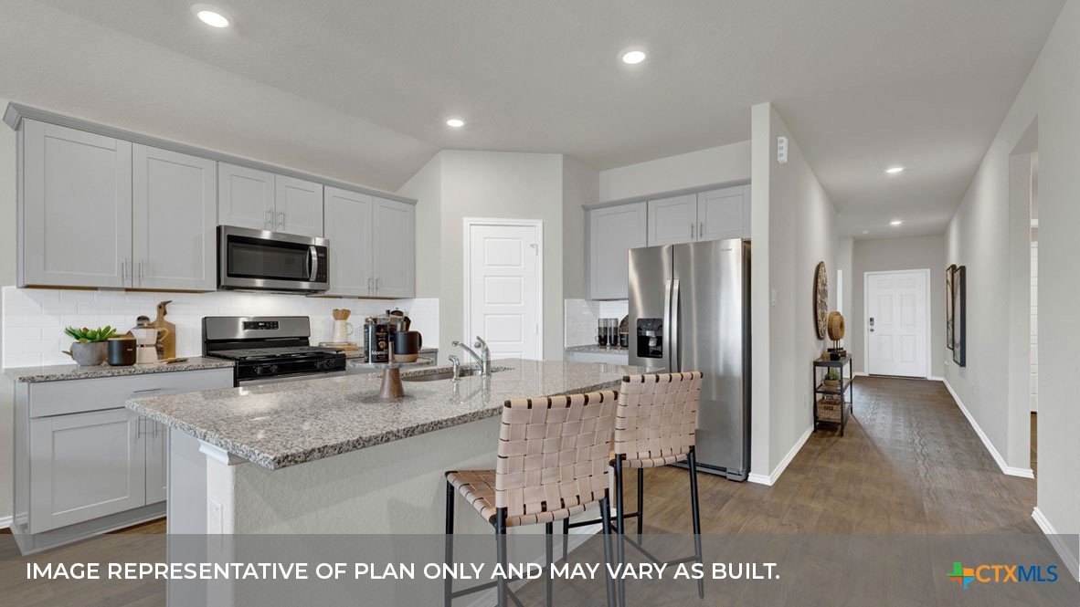 MAY/JUNE ESTIMATED COMPLETION DATE. Check out our Harris floorplan, our largest one-story plan available at Saengerhalle Meadows in New Braunfels, TX. Perfect for roommates or larger families, this 4-bedroom, 2.5-bathroom, 2 car garage home offers 1,816 square feet of comfortable living space. Our homes in Saengerhalle Meadows feature farmhouse exteriors. At the front of the home, off the foyer, you have two secondary bedrooms and a full bathroom, which includes a shower/tub combination. Moving through the foyer, down a small hall, you will find the half bathroom, utility room and another secondary bedroom. All secondary bedrooms feature a closet with shelving. Whether you use these rooms as an office, child’s room or guest room, there is plenty of space for work, sleep, and play. Making your way through the house, you’ll walk into the heart of the home, the living area. Built as an open concept, move easily between the kitchen, dining, and family room. The L-shaped kitchen includes granite countertops, a large island with an undermount sink, a corner pantry closet, stainless-steel appliances and 36’’ upper cabinets. The primary bedroom is located off the family room. This spacious bedroom will be your oasis at the end of a long day. Enjoy the private bathroom, which features a 5’ walk in shower, double vanity, separate door for the toilet and an oversized walk-in closet. The Harris includes vinyl flooring throughout the common areas of the home, and carpet in the bedrooms. All our new homes feature a covered back patio, full sod, an irrigation system in the front and back yard, and a 6’ privacy fence around the back yard. This home includes our America’s Smart Home base package, which includes the Amazon Echo Pop, Front Doorbell, Front Door Deadbolt Lock, Home Hub, Thermostat, and Deako® Smart Switches.