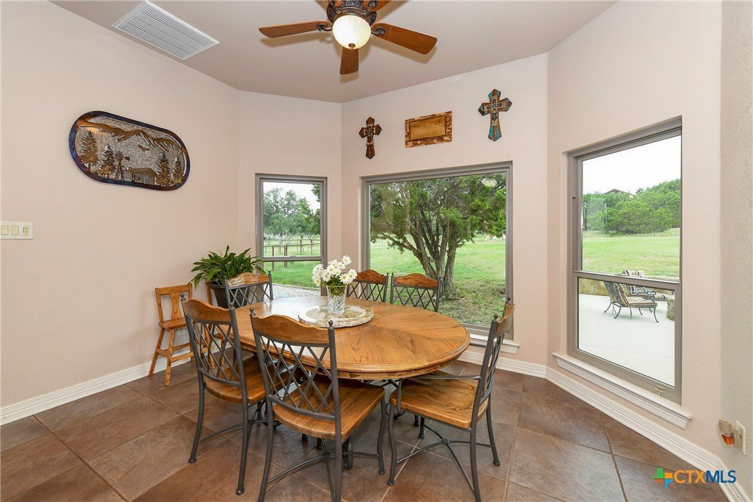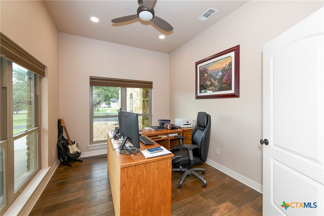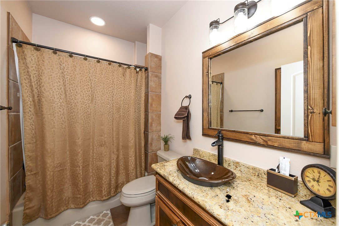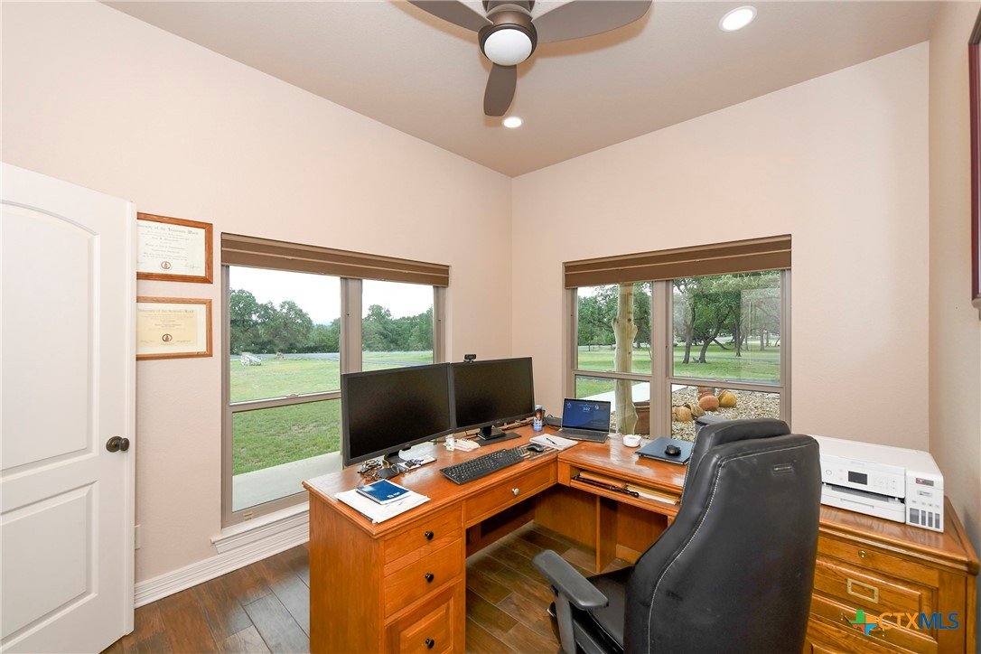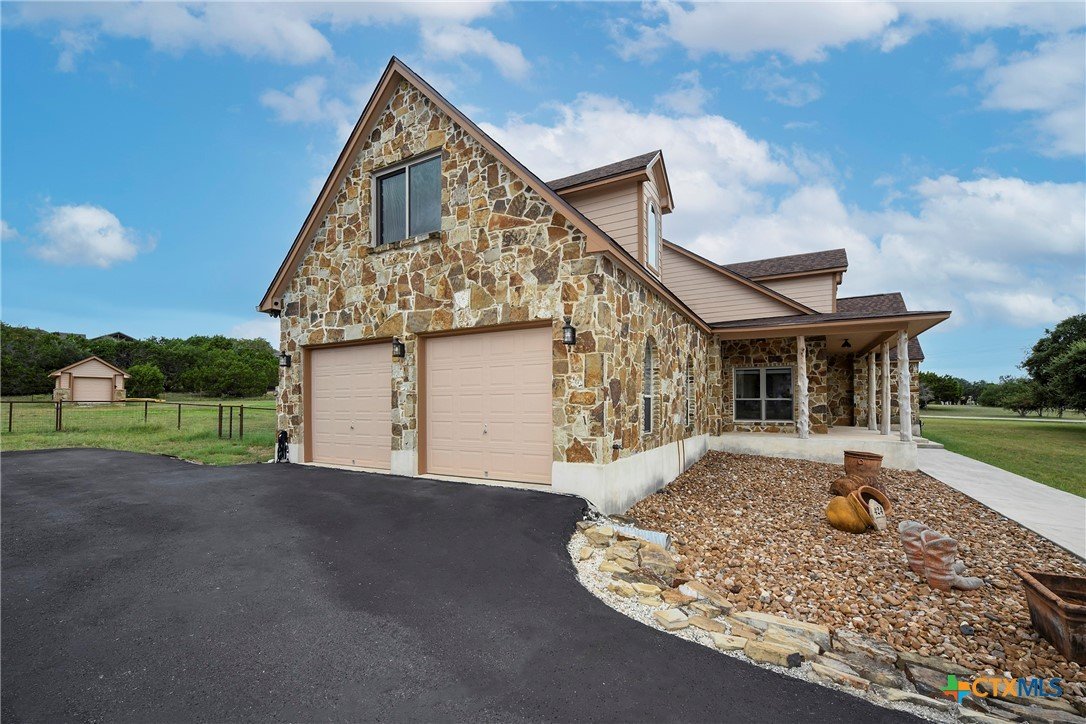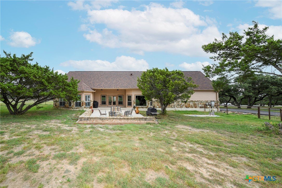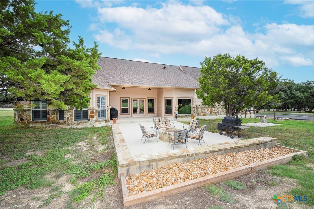Welcome home! Custom STEEL FRAME home sitting on over an acre in the Texas hill country! 3 generous bedrooms plus a home office with a view! Upstairs bonus/game room or 4th bedroom over garage! Wonderful island kitchen loaded with custom all wood cabinets topped off with gorgeous granite counter tops!! Roof shingles replaced April 2024! Covered patio, burn pit, oversized garage, water softener, gutters, storage shed and fenced back yard are other notable features! Convenient to great schools, shopping, entertainment, the Guadalupe River and Canyon Lake!! Plenty of room for a pool!! Priced right, so don't hesitate on this one!