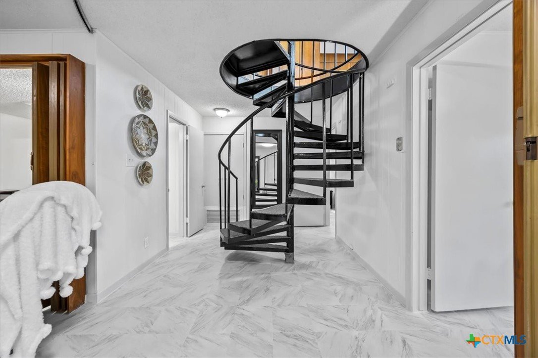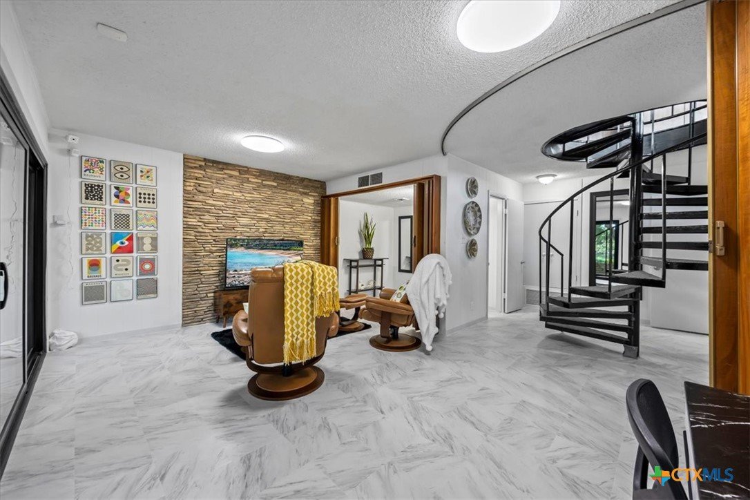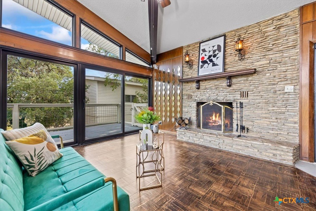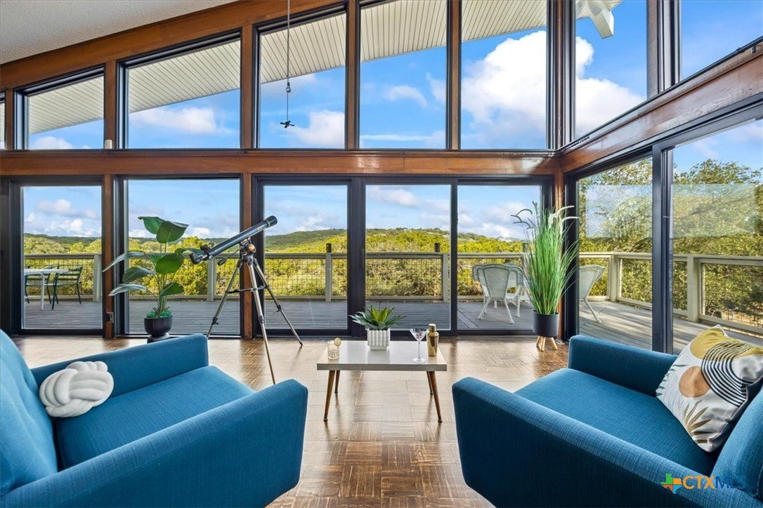 Whether you're searching for a serene primary residence or exploring potential income opportunities, this exceptional Hill Country retreat offers flexibility, character, and an unbeatable location. This one-of-a-kind mid-century home is nestled in the heart of the Texas Hill Country, blending timeless architecture with breathtaking natural surroundings. Ideally located between San Antonio and Austin, you'll enjoy easy access to beloved destinations such as Gruene and Fredericksburg. Outdoor adventure is nearby with Guadalupe River State Park and Schlitterbahn Waterpark just a short drive away. Two dramatic walls of Pella windows rise to soaring ceilings, filling the home with natural light and framing sweeping views of rolling hills, mature trees, and native vegetation. By night, the scenery transforms into a sparkling display of starlight and distant lights. Whether relaxing indoors or stepping onto the expansive wraparound deck, the connection to the landscape is peaceful and inspiring. A durable metal roof enhances the home's character while providing lasting quality. Inside, restored parquet floors grace the main level, preserving the home's iconic mid-century charm. A striking spiral staircase leads to the lower level with three bedrooms, including a versatile flex space that can be enclosed with accordion walls for added privacy. A detached garage adds functionality and includes basement storage for additional space. Residents enjoy an array of community amenities including a pool, sports courts, park, boat ramp, fishing pond, hiking trails, BBQ grills, clubhouse, and non-denominational chapel. Golf enthusiasts will appreciate being just six minutes from Rebecca Creek Golf Course. Located within the highly regarded Comal Independent School District, known for strong academics, diverse programs including AP and IB, and a supportive community culture.