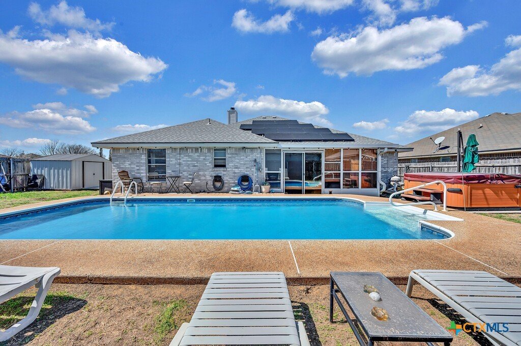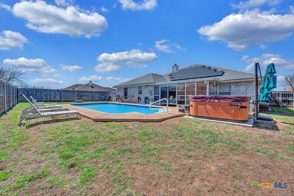 This well cared for four-bedroom, two-bathroom home offers the perfect blend of luxury and comfort. Situated on a desirable corner lot, this property boasts a private pool, making it an ideal oasis for relaxation and entertainment. The enclosed patio provides a versatile space for year-round enjoyment. Inside, the spacious layout offers ample room for family living and hosting guests, ensuring everyone feels at home. With its great location this home is a true gem for those seeking both convenience and relaxation. 2023 upgrades include new roof, solar panels, heat pump, and electric furnace. Solar panels will convert and will be paid off by seller.