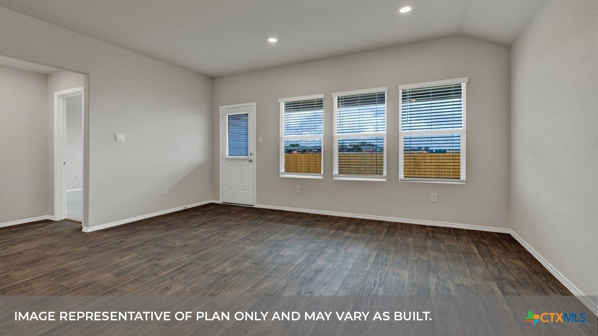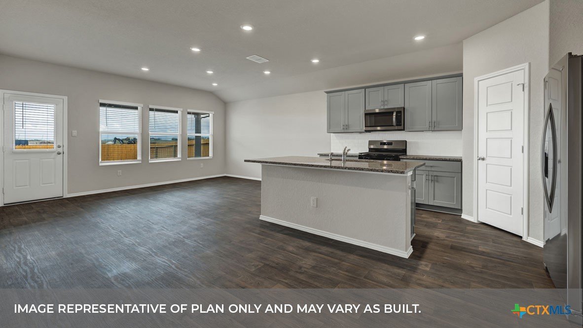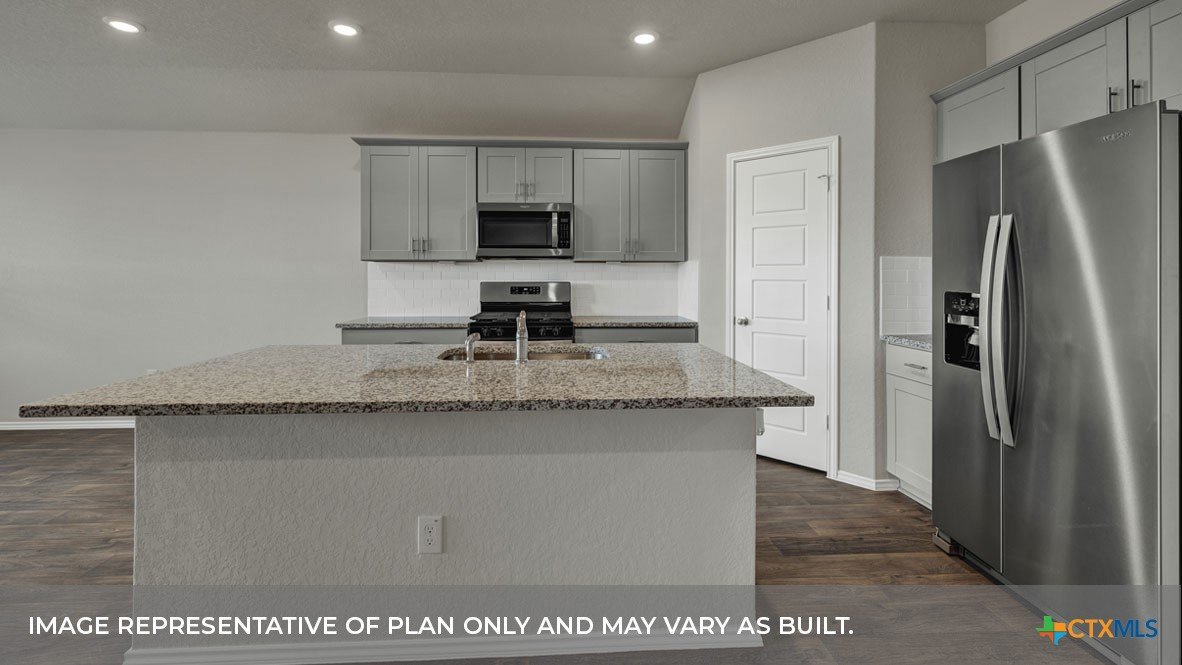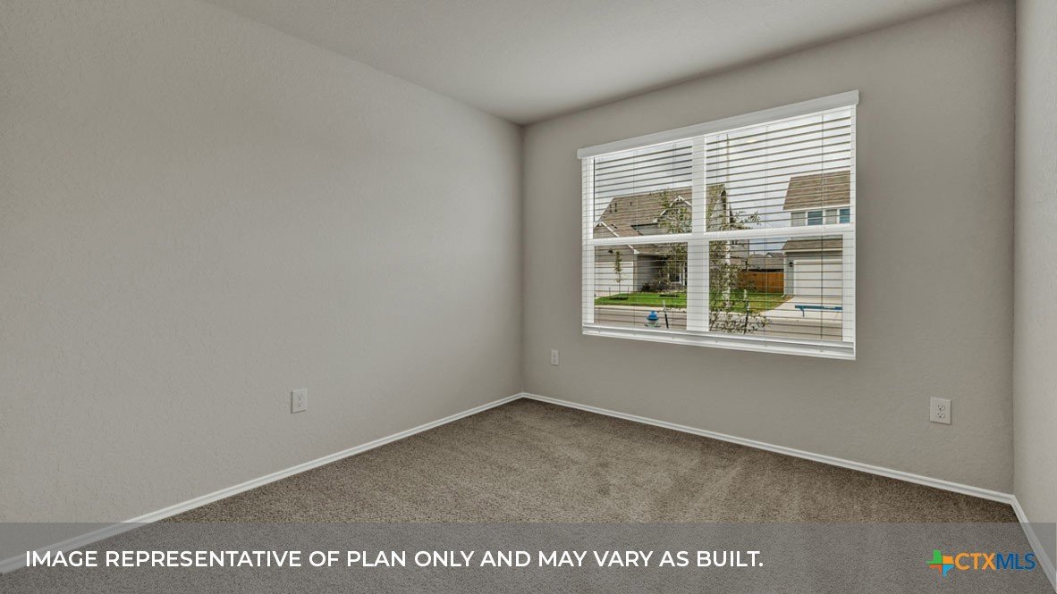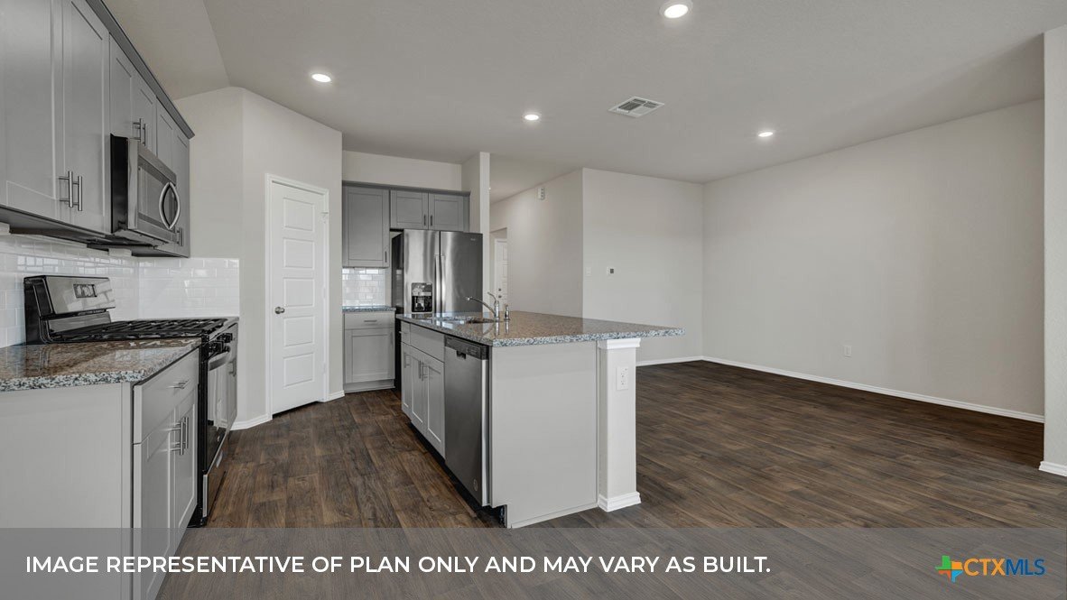 MAY COMPLETION. NO BACKYARD NEIGHBORS. Find all the space you need in our Easton floorplan at Saengerhalle Meadows, one of our communities in New Braunfels, TX. This one-story home is perfect for any family, thoughtfully designed with 4 bedrooms, 2 bathrooms, 2 car garage across 1,672 square feet. Our homes in Saengerhalle Meadows feature farmhouse exteriors. Walk through the covered entryway and make your way down the hall to the main living space. The kitchen, dining and family room are open,built to make cooking, eating, and entertaining a pleasant experience for family and friends. The L-shaped kitchen includes granite countertops, a large island with an undermount sink, a corner pantry closet, stainless-steel appliances and 36’’ upper cabinets. Enjoy the natural light with three rear windows looking out to the backyard. Off the family room is the primary bedroom, with its own attached bathroom. This relaxing bathroom space features a 5’ walk in shower, double sink vanity, separate toilet area with a door, and a walk-in closet. Stretch out and relax at the end of your day in this spacious and private ensuite. At the front of the house, you will find bedroom 3 and 4, with the secondary bathroom conveniently located between the rooms. Bathroom 2 includes a shower/tub combination. Across the foyer and down a short hall is the utility room and bedroom 2. Whether you use these rooms as an office, child’s room or guest room, there is enough space for work, sleep, and play. The Easton includes vinyl flooring throughout the common areas of the home, and carpet in the bedrooms. All our new homes feature a covered back patio, full sod, an irrigation system in the front and back yard, and a 6’ privacy fence around the back yard. This home includes our America’s Smart Home base package, which includes the Amazon Echo Pop, Front Doorbell, Front Door Deadbolt Lock, Home Hub, Thermostat, and Deako® Smart Switches.