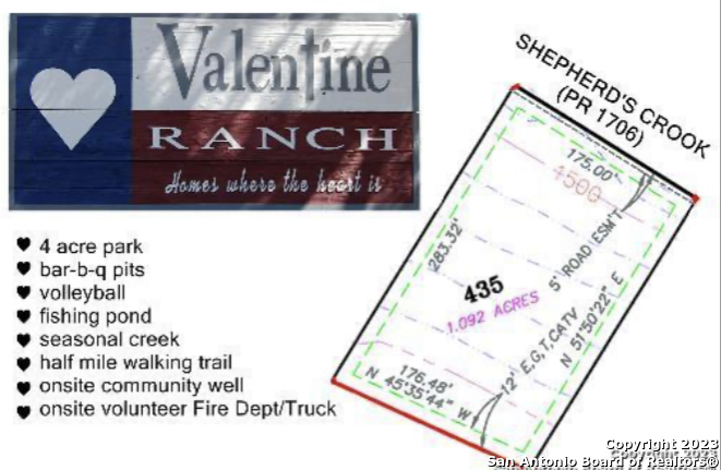 Beautiful lot available in the gated community of Valentine Ranch in Helotes area. This Hill Country 1.09-acre lot provides plenty of privacy and breathtaking views. This community offers 4 acres of nature trails, a fishing pond, a 24-hour fitness center, a park with pavilion along with a playground set/area for children to enjoy. An RV parking area you can use for a small daily rental fee and this lot has very easy access to it. This community has its own municipal water and an onsite fire truck as well. If you're looking to build your forever custom home, this is the place! You're within 20 minutes from HEB, Walmart and 1604 and only 25 minutes from Boerne, Tx. Building restrictions and aerobic skeptics are required. Please see survey in Additional Information section along with Covenants Conditions and Restrictions