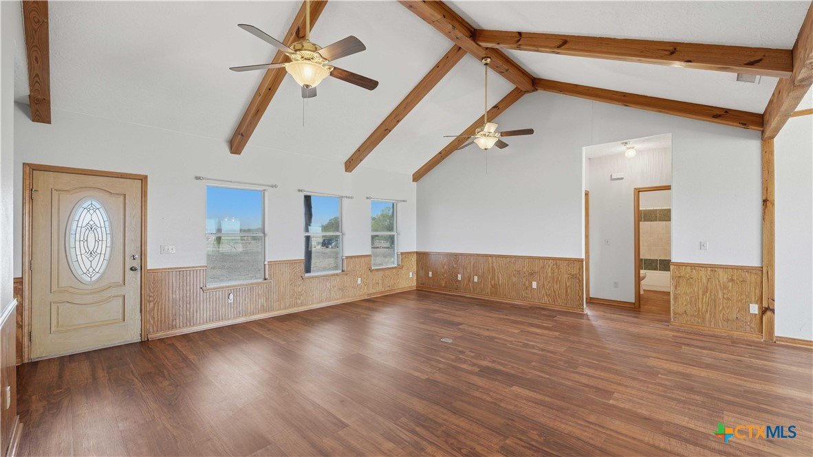 Welcome to this charming Hill Country-style home sitting atop 5.515 peaceful acres just south of Magical Martindale! This 3-bedroom, 2-bath home offers 1,719 sq ft of comfortable living with an open floor plan, soaring beamed ceilings, and recent vinyl flooring throughout. The kitchen features an island with breakfast bar, solid countertops, pantry, and opens to two dining areas — perfect for entertaining. The primary suite includes a walk-in closet, separate shower, and double vanity. The land is a blank slate, with only the perimeter ranch-fenced with an automatic gate. Additional highlights include a 2-car garage, new metal roof, stone and Hardiplank exterior, aerobic septic, co-op water and electric, and access to a shared well for livestock. No HOA, no floodplain - just wide open Texas living! Schedule your showing today!