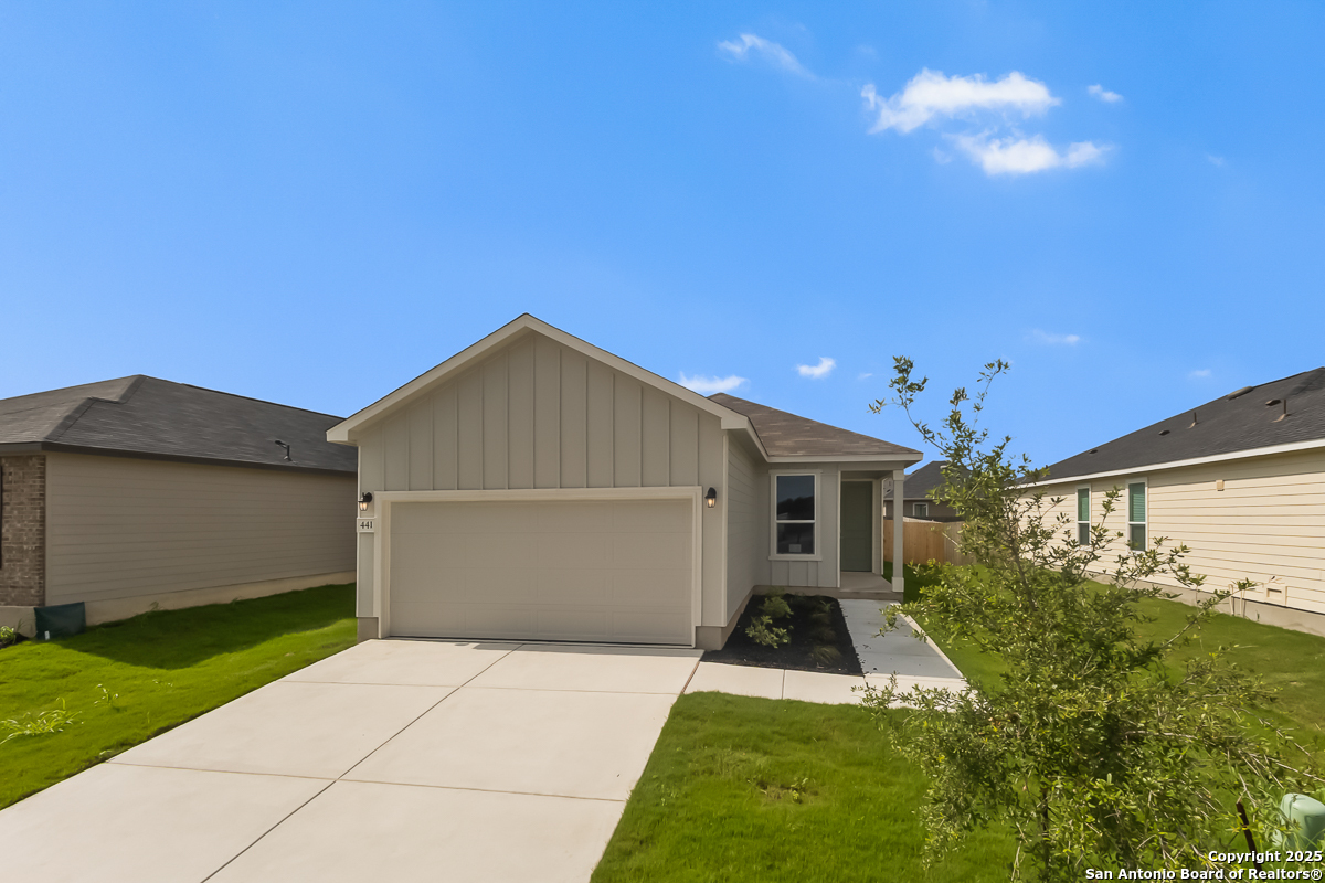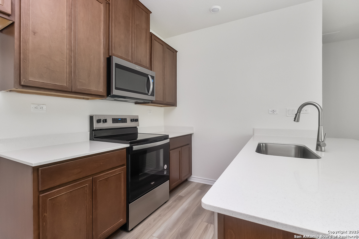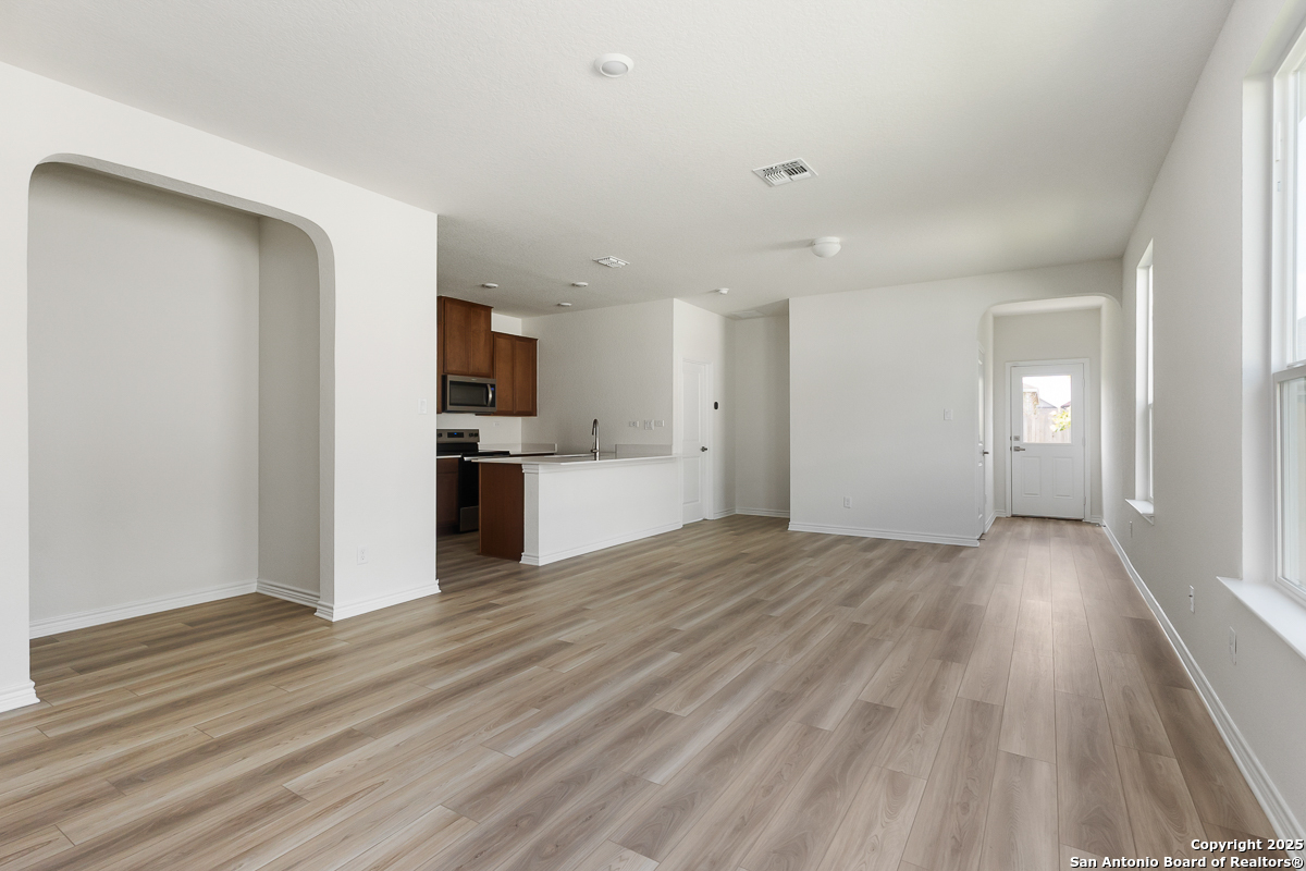 Discover the charm of this inviting home featuring 9-ft. first-floor ceilings and an open, airy design. The kitchen boasts Whirlpool stainless steel appliances, elegant Woodmont Cody 42-in. upper cabinets, an extended breakfast bar, and a Moen Sleek high arc faucet. Relax in the primary bath with upgraded cabinets and a 42-in. garden tub/shower combo. Stylish touches include a Carrara-style entry door and durable vinyl plank flooring in the great room, kitchen, and primary bedroom. Additional highlights include a soft water loop, wireless security system, and an automatic sprinkler system for outdoor convenience.