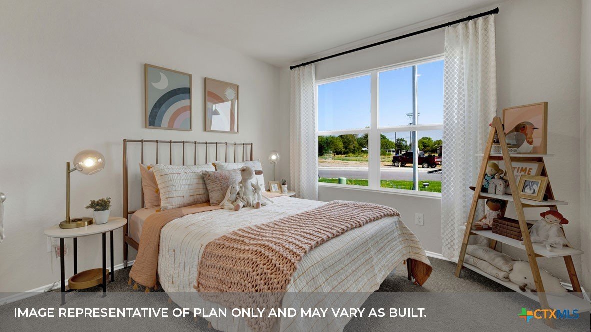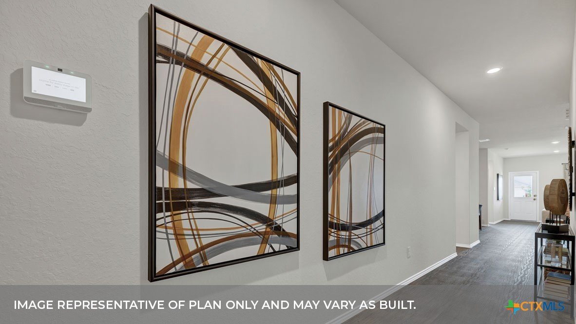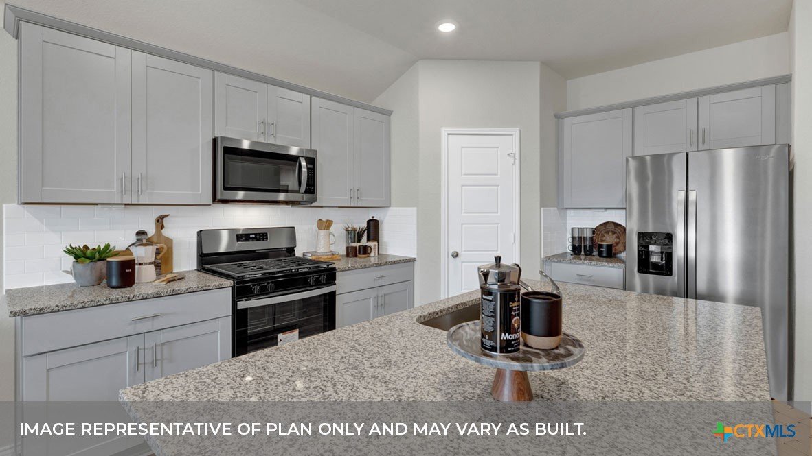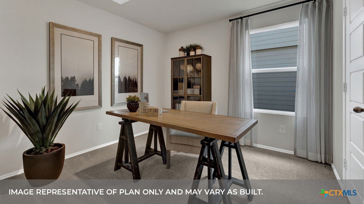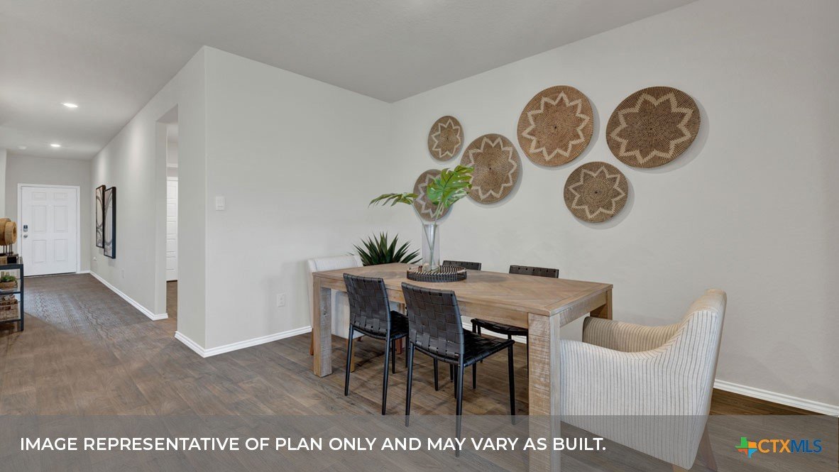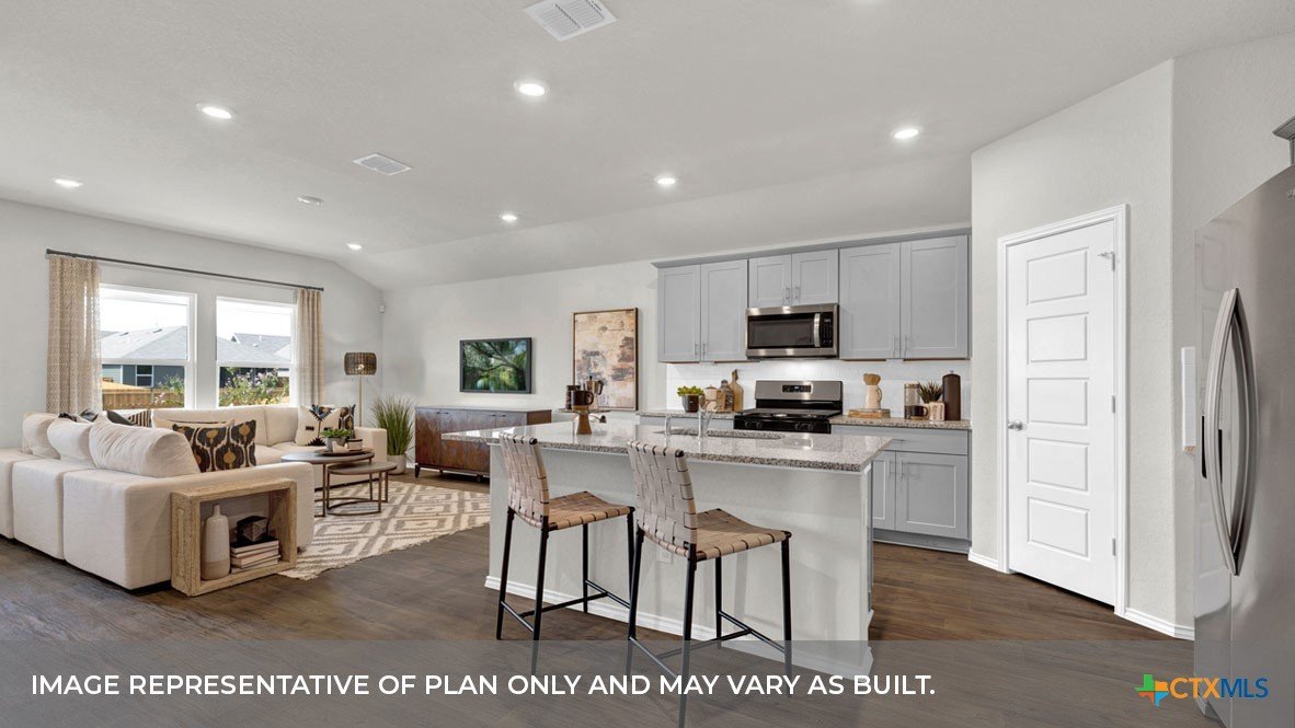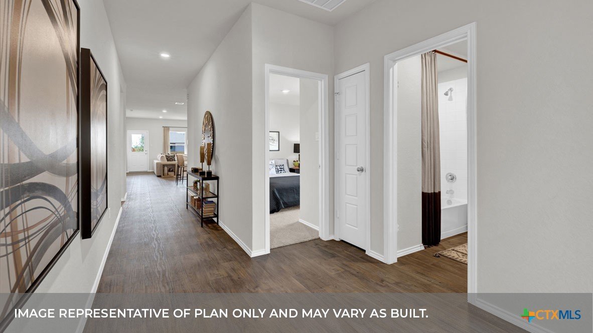 MOVE IN READY! CORNER LOT! Check out our Harris floorplan, our largest one-story plan available at Saengerhalle Meadows in New Braunfels, TX. Perfect for roommates or larger families, this 4-bedroom, 2.5-bathroom, 2 car garage home offers 1,816 square feet of comfortable living space. Our homes in Saengerhalle Meadows feature farmhouse exteriors and the Harris plan is available in multiple exterior colors. At the front of the home, off the foyer, you have two secondary bedrooms and a full bathroom, which includes a shower/tub combination. Moving through the foyer, down a small hall, you will find the half bathroom, utility room and another secondary bedroom. All secondary bedrooms feature a closet with shelving. Whether you use these rooms as an office, child’s room or guest room, there is plenty of space for work, sleep, and play. Making your way through the house, you’ll walk into the heart of the home, the living area. Built as an open concept, move easily between the kitchen, dining, and family room. The L-shaped kitchen includes granite countertops, a large island with an undermount sink, a corner pantry closet, stainless-steel appliances and 36’’ upper cabinets. The primary bedroom is located off the family room. This spacious bedroom will be your oasis at the end of a long day. Enjoy the private bathroom, which features a 5’ walk in shower, double vanity, separate door for the toilet and an oversized walk-in closet. The Harris includes vinyl flooring throughout the common areas of the home, and carpet in the bedrooms. All our new homes feature a covered back patio, full sod, an irrigation system in the front and back yard, and a 6’ privacy fence around the back yard. This home includes our America’s Smart Home base package, which includes the Front Doorbell, Front Door Deadbolt Lock, Home Hub, Thermostat, and Deako® Smart Switches.