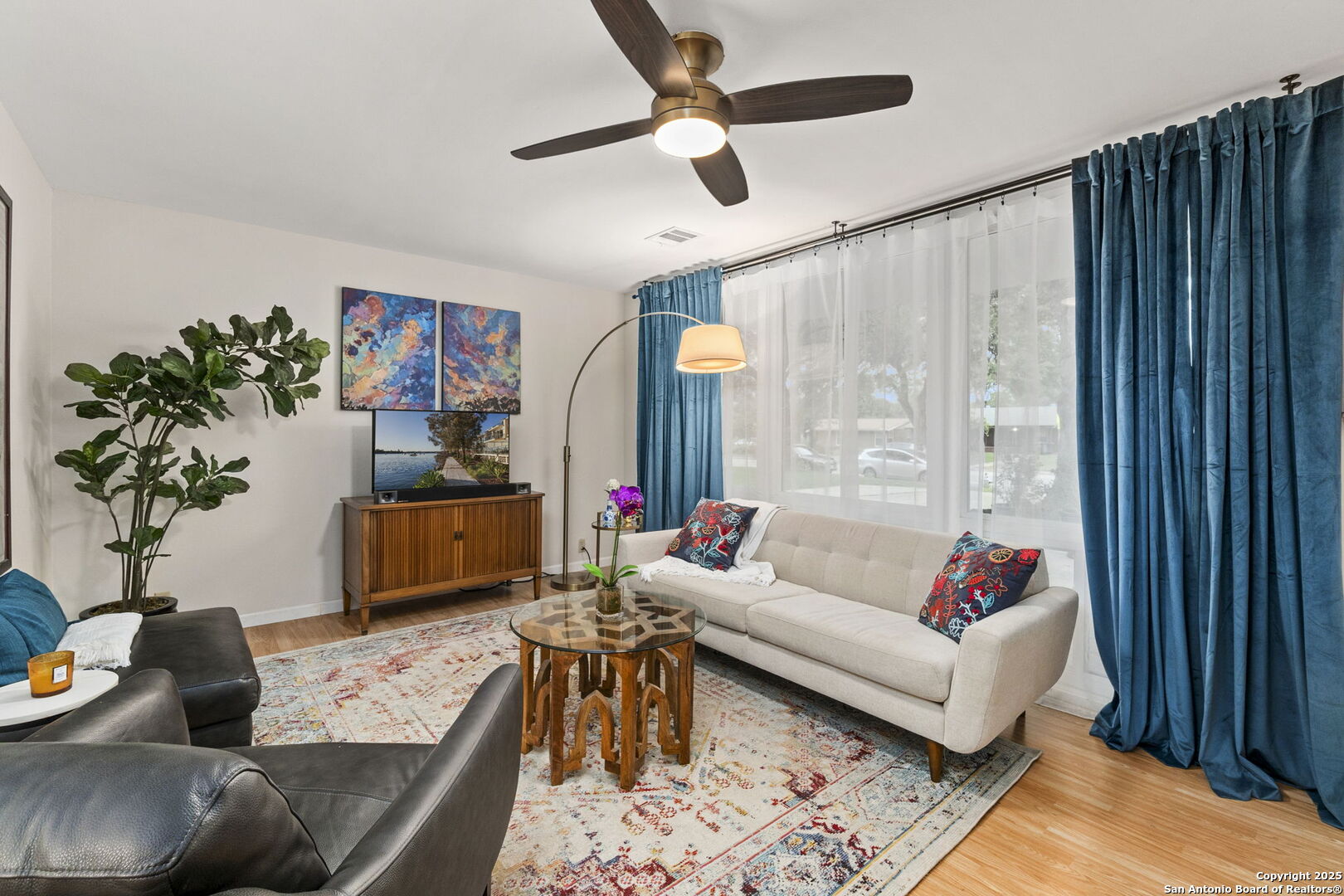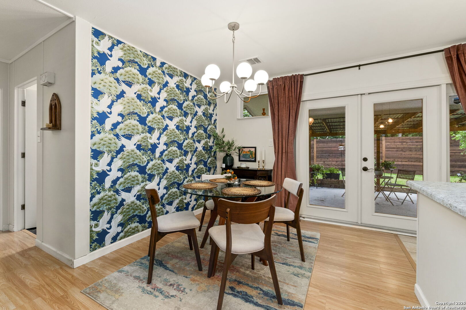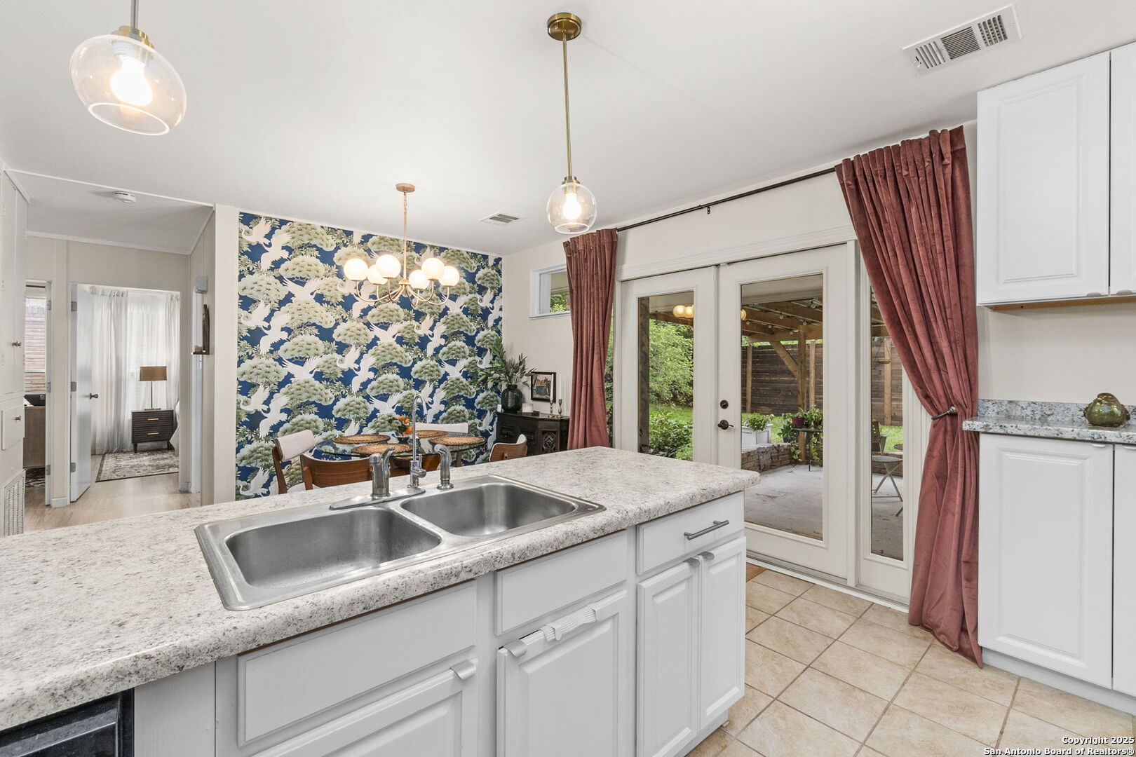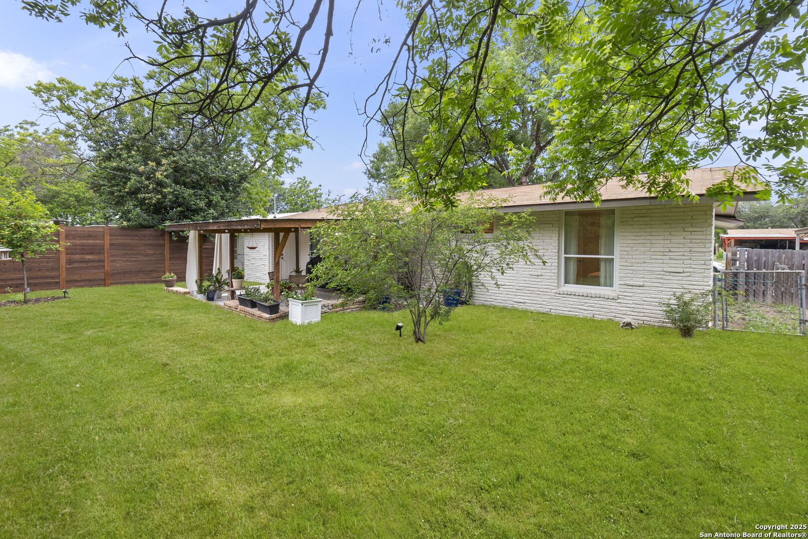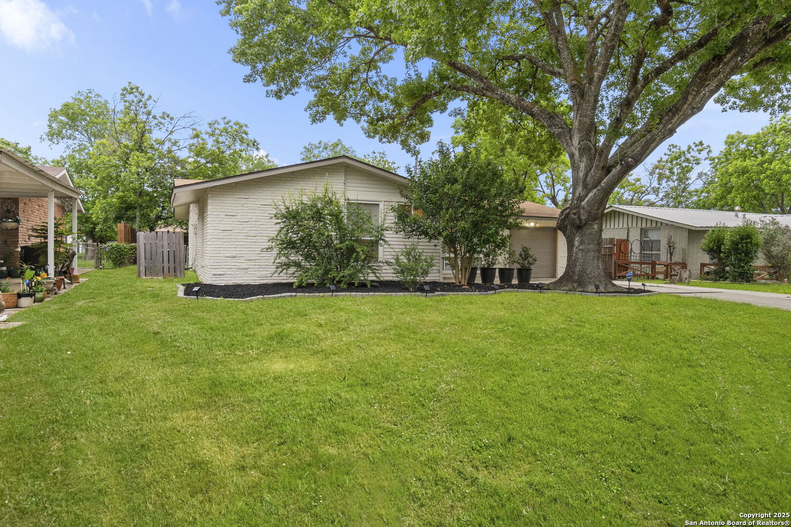 Nestled in the heart of East Terrell Hills, this charming 3-bedroom, 2-bath home effortlessly blends style, comfort, and convenience. From the moment you arrive, the serene painted brick exterior and a majestic heritage oak tree create undeniable curb appeal and a welcoming first impression. Inside, the efficient layout offers a seamless flow that instantly feels cozy and inviting beginning with the open living room which bathed in natural light thanks to floor-to-ceiling windows. The thoughtfully designed kitchen features abundant cabinetry, recent lighting upgrades, and opens onto a beautifully styled dining area adorned with designer lighting and elegant wallpaper. French doors lead to a fantastic covered patio, ideal for relaxing in the shade or entertaining guests in the private, spacious backyard. All three bedrooms are generously sized, filled with natural light, and have been freshly repainted and fitted with new ceiling fans. Thoughtfully set back from the road, this well-cared-for home offers a serene escape, yet is just minutes from Alamo Heights, The Pearl, Ft. Sam Houston, the San Antonio Airport, and more. A one-car garage and an extended driveway with a parking pad add extra convenience to this gem of property.