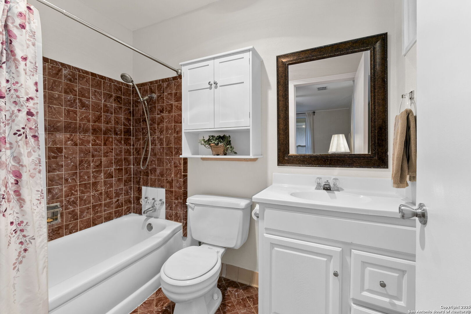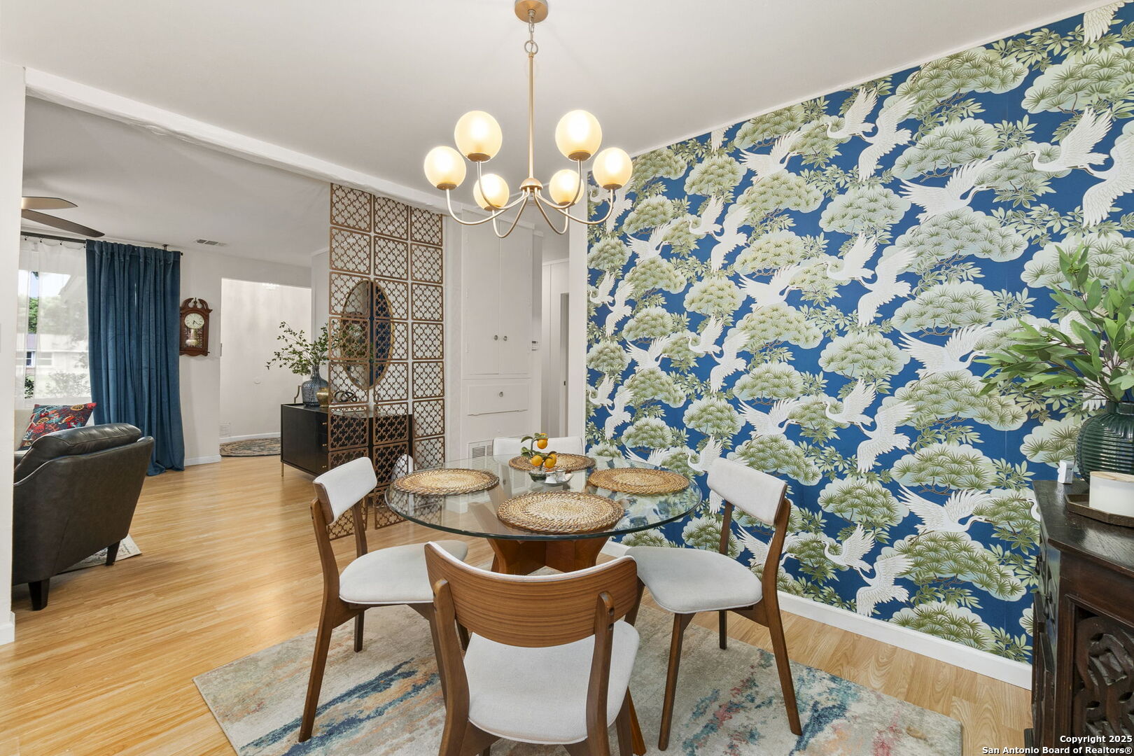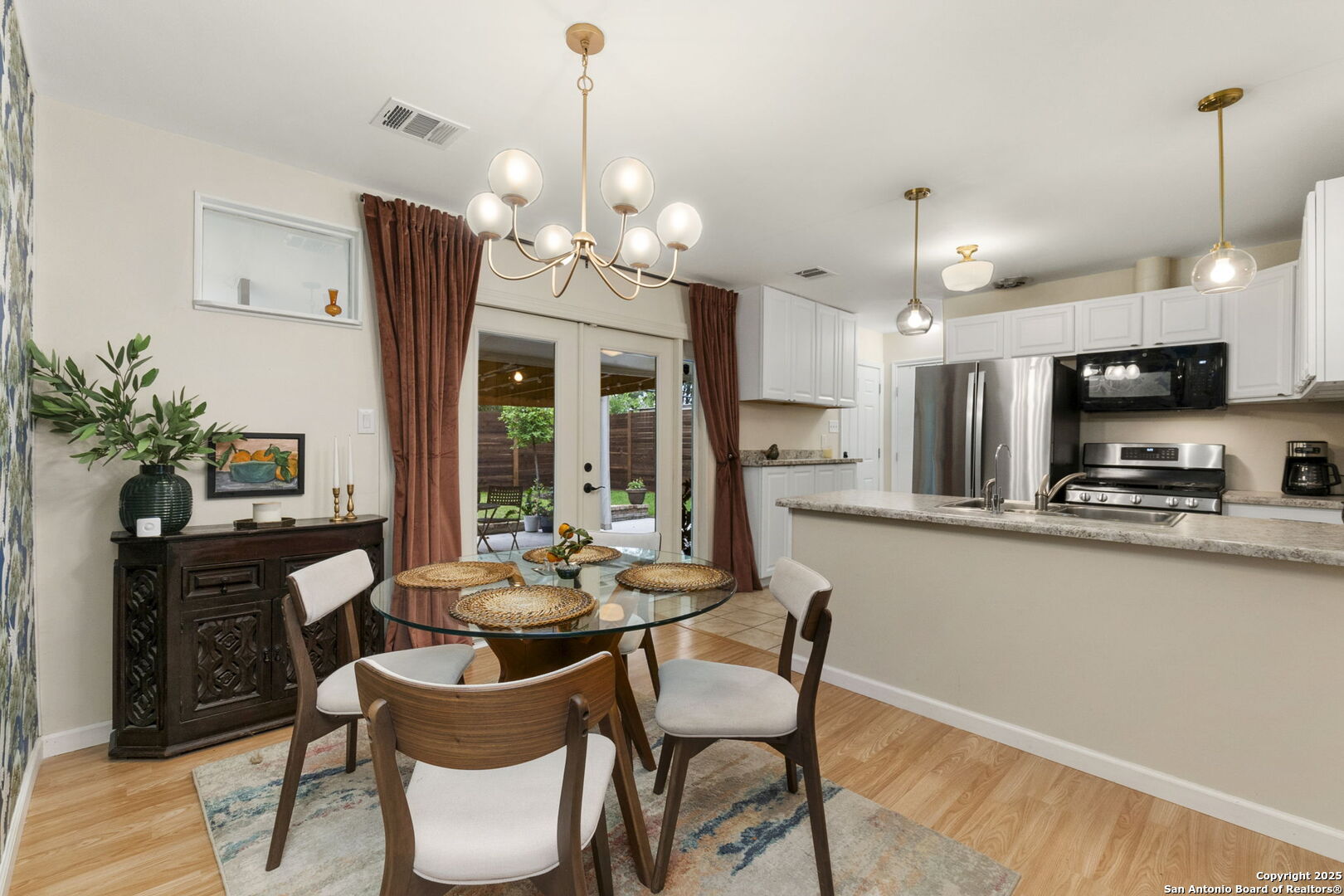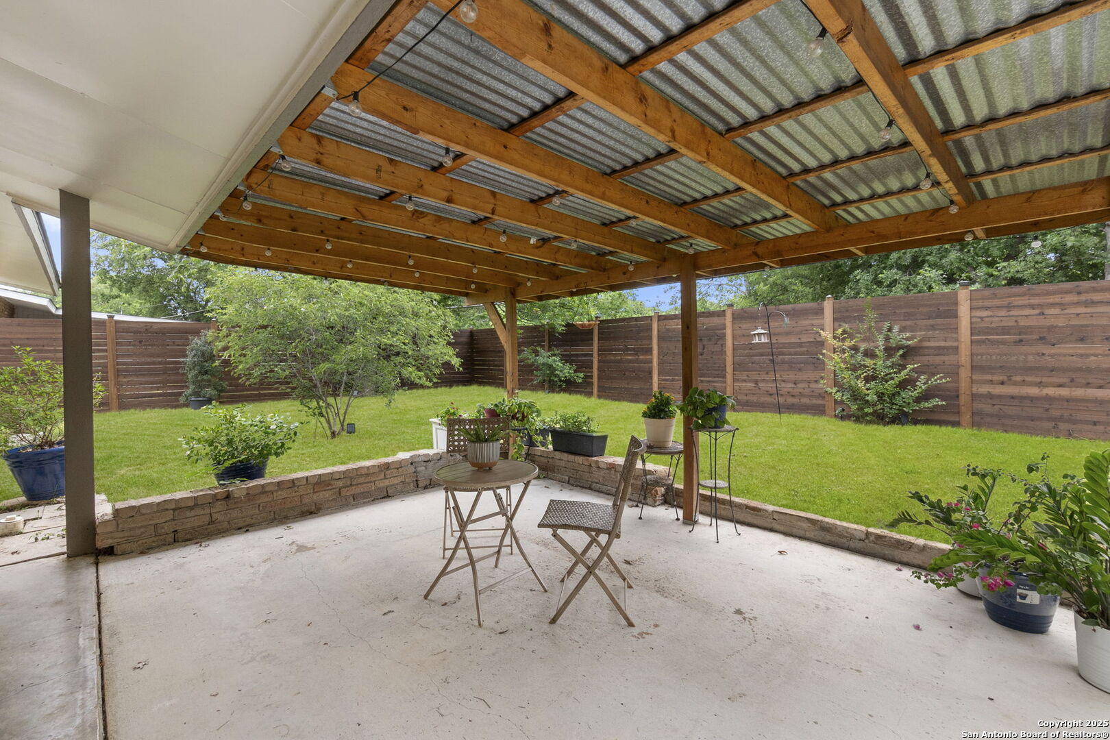 Nestled in the heart of East Terrell Hills, this charming 3-bedroom, 2-bath home effortlessly blends style, comfort, and convenience. From the moment you arrive, the serene painted brick exterior and a majestic heritage oak tree create undeniable curb appeal and a welcoming first impression. Inside, the efficient layout offers a seamless flow that instantly feels cozy and inviting beginning with the open living room which bathed in natural light thanks to floor-to-ceiling windows. The thoughtfully designed kitchen features abundant cabinetry, recent lighting upgrades, and opens onto a beautifully styled dining area adorned with designer lighting and elegant wallpaper. French doors lead to a fantastic covered patio, ideal for relaxing in the shade or entertaining guests in the private, spacious backyard. All three bedrooms are generously sized, filled with natural light, and have been freshly repainted and fitted with new ceiling fans. Thoughtfully set back from the road, this well-cared-for home offers a serene escape, yet is just minutes from Alamo Heights, The Pearl, Ft. Sam Houston, the San Antonio Airport, and more. A one-car garage and an extended driveway with a parking pad add extra convenience to this gem of property.
