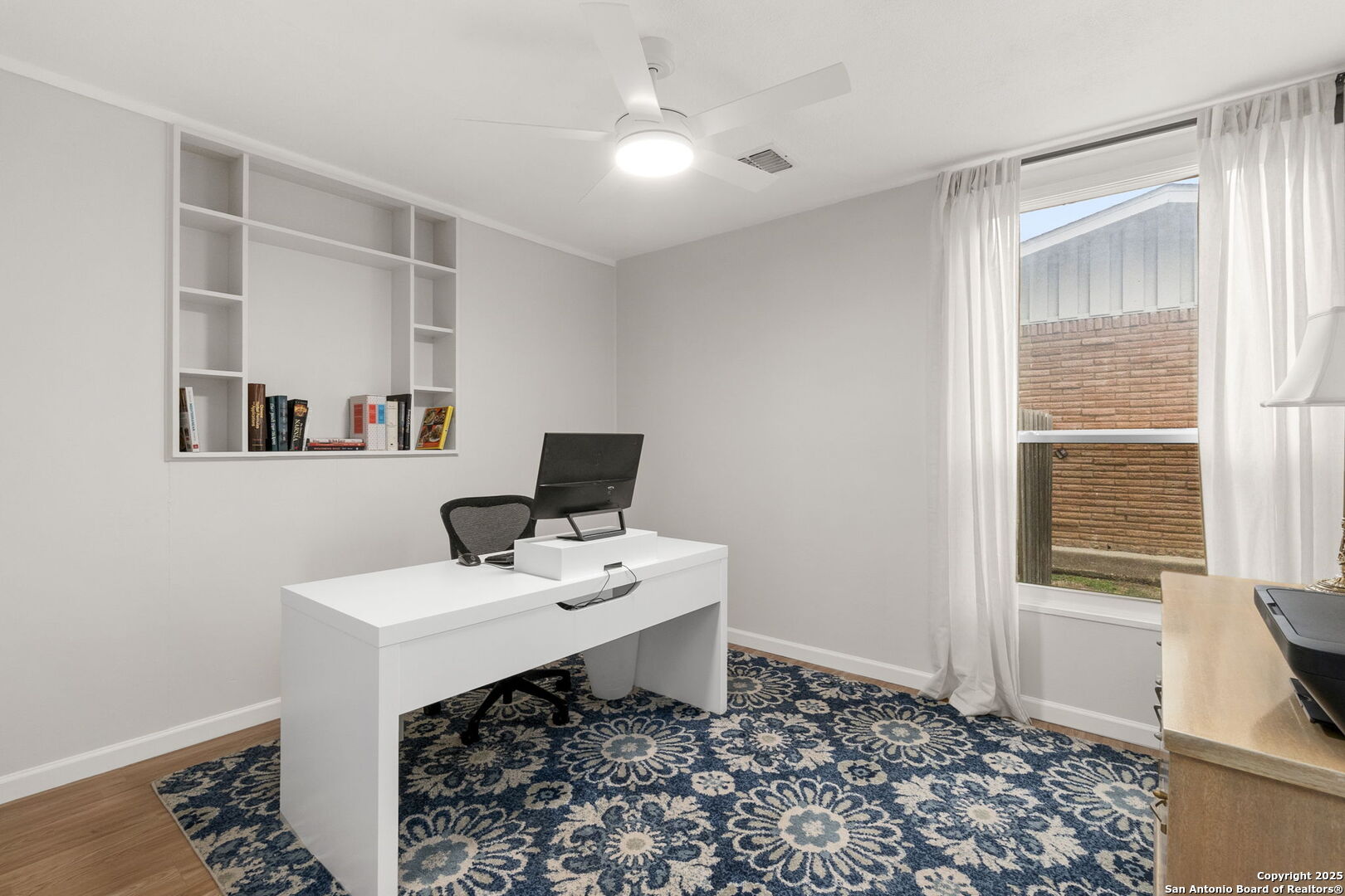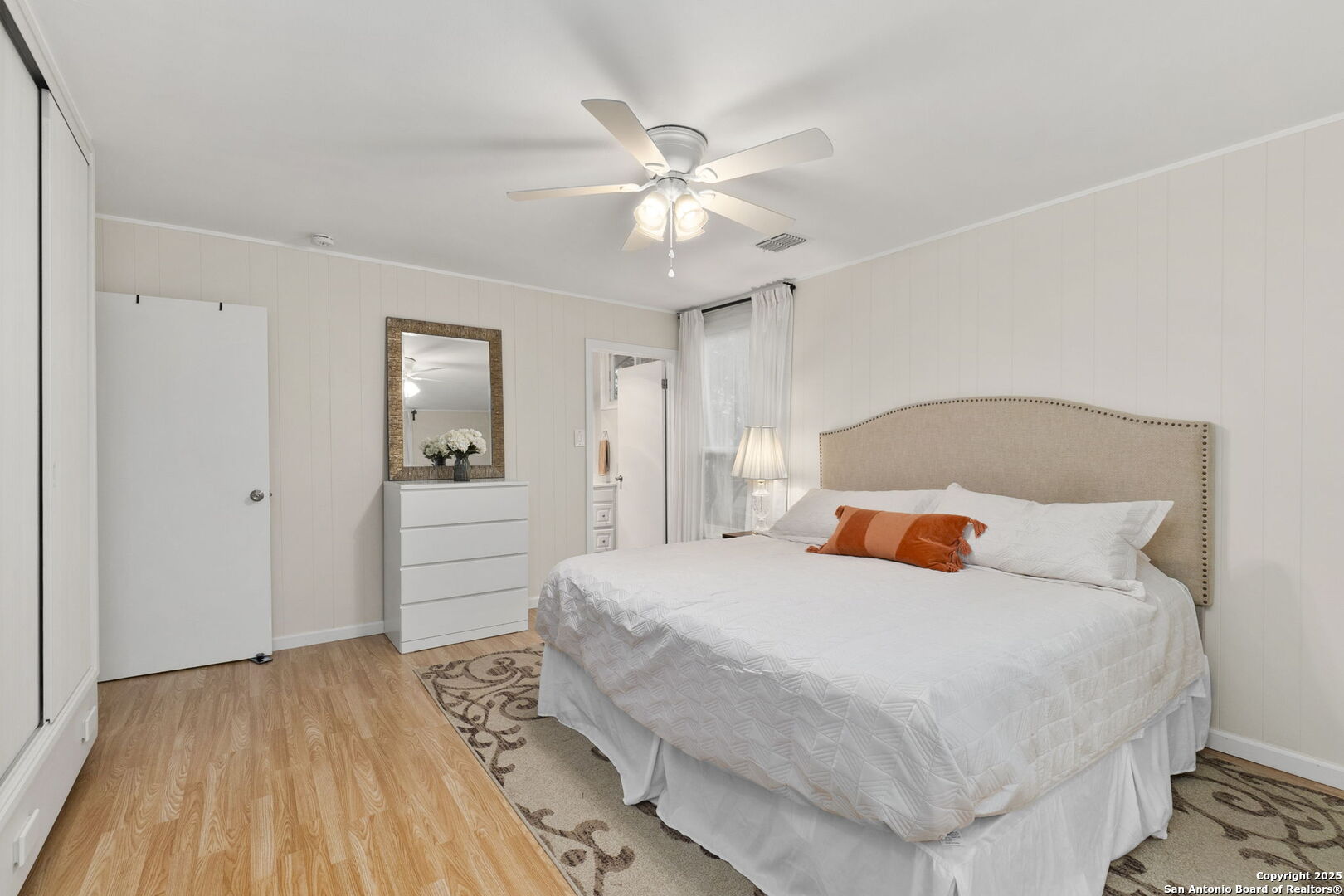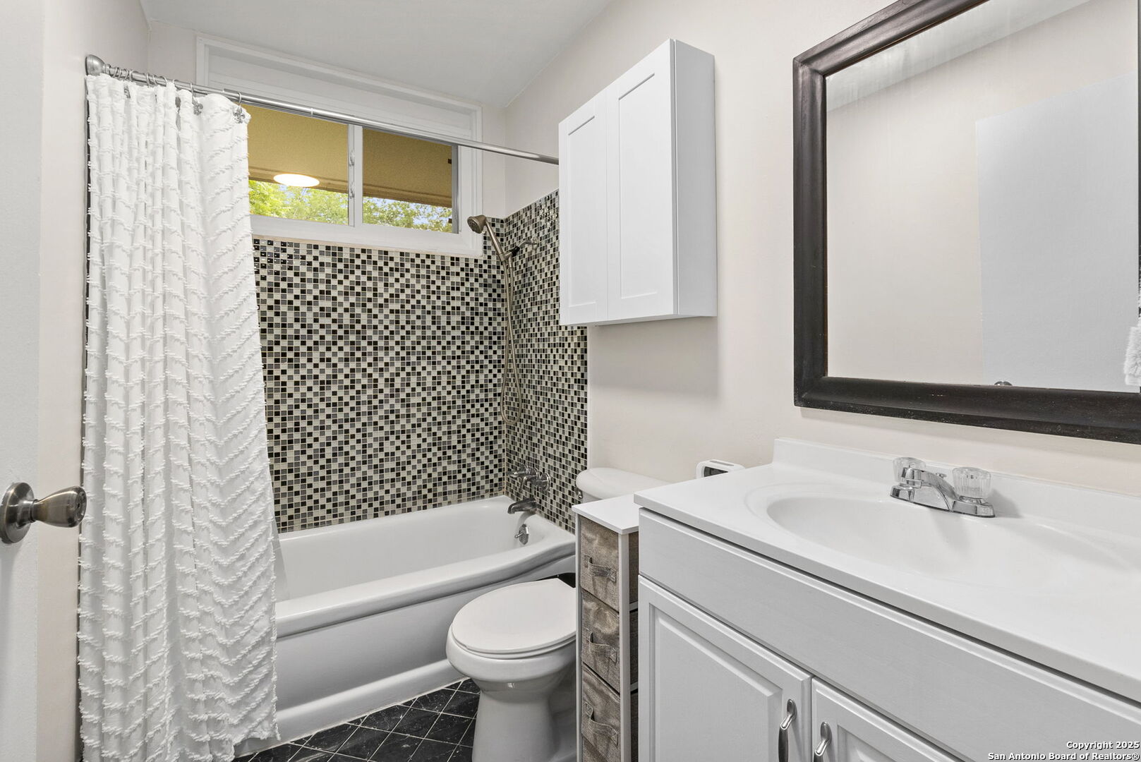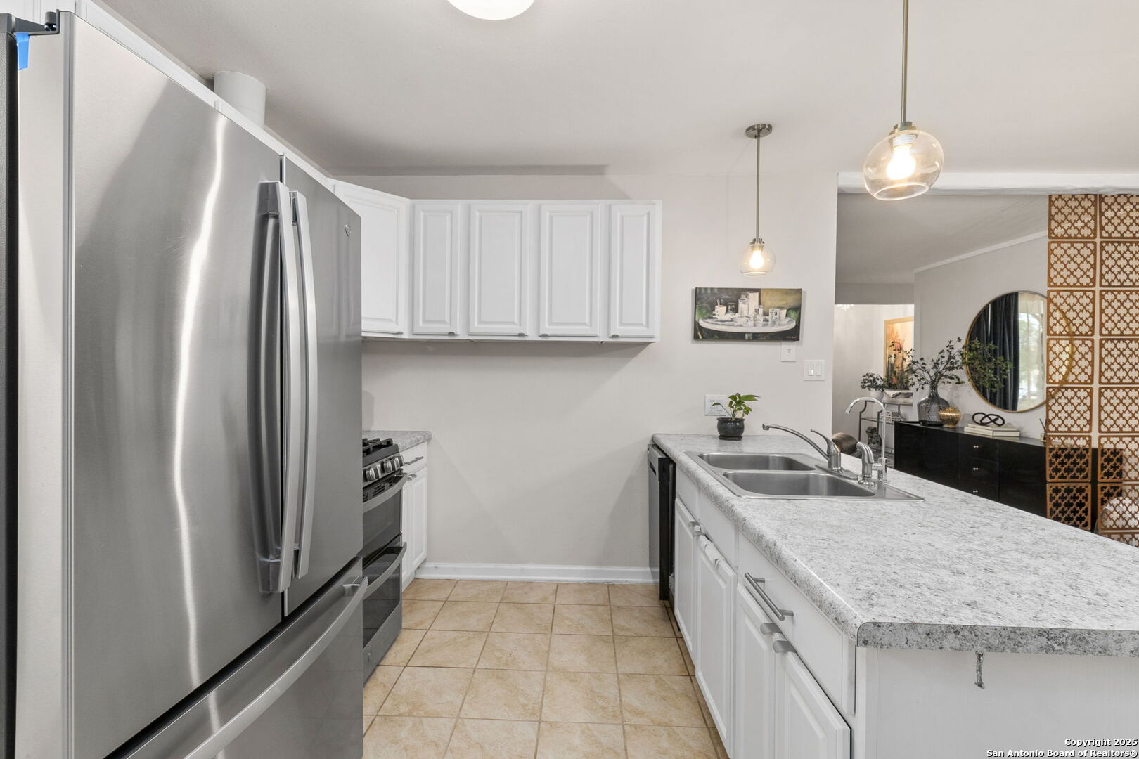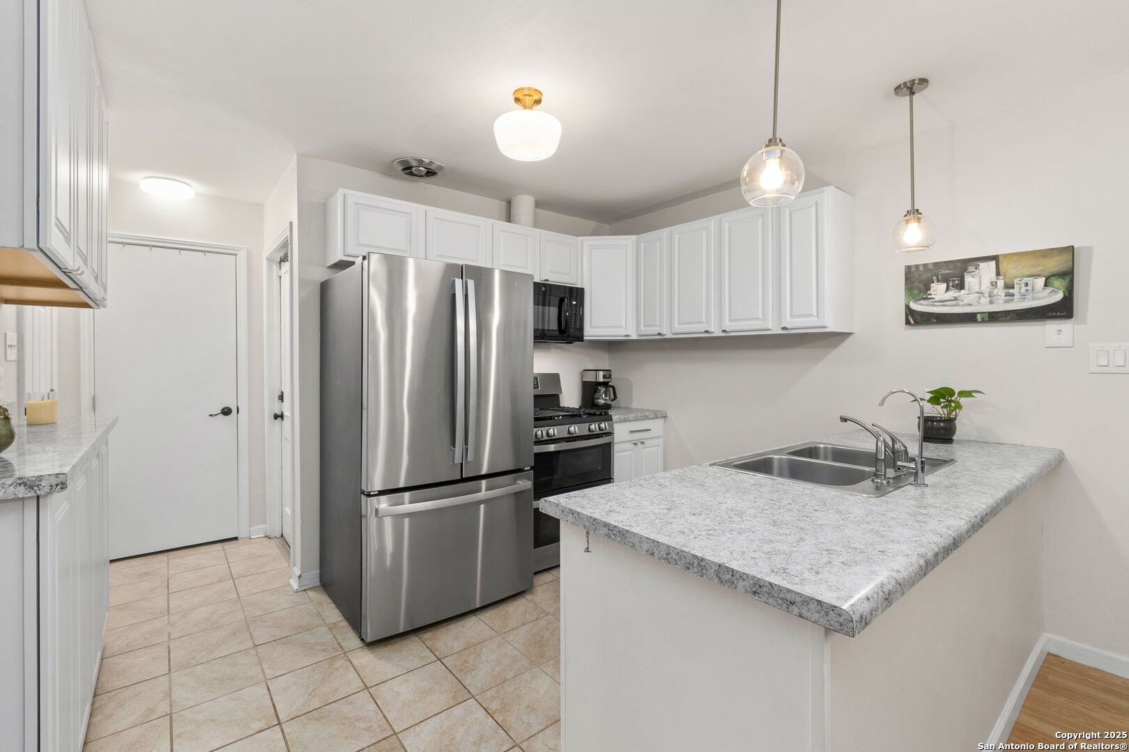 Nestled in the heart of East Terrell Hills, this charming 3-bedroom, 2-bath home effortlessly blends style, comfort, and convenience. From the moment you arrive, the serene painted brick exterior and a majestic heritage oak tree create undeniable curb appeal and a welcoming first impression. Inside, the efficient layout offers a seamless flow that instantly feels cozy and inviting beginning with the open living room which bathed in natural light thanks to floor-to-ceiling windows. The thoughtfully designed kitchen features abundant cabinetry, recent lighting upgrades, and opens onto a beautifully styled dining area adorned with designer lighting and elegant wallpaper. French doors lead to a fantastic covered patio, ideal for relaxing in the shade or entertaining guests in the private, spacious backyard. All three bedrooms are generously sized, filled with natural light, and have been freshly repainted and fitted with new ceiling fans. Thoughtfully set back from the road, this well-cared-for home offers a serene escape, yet is just minutes from Alamo Heights, The Pearl, Ft. Sam Houston, the San Antonio Airport, and more. A one-car garage and an extended driveway with a parking pad add extra convenience to this gem of property.