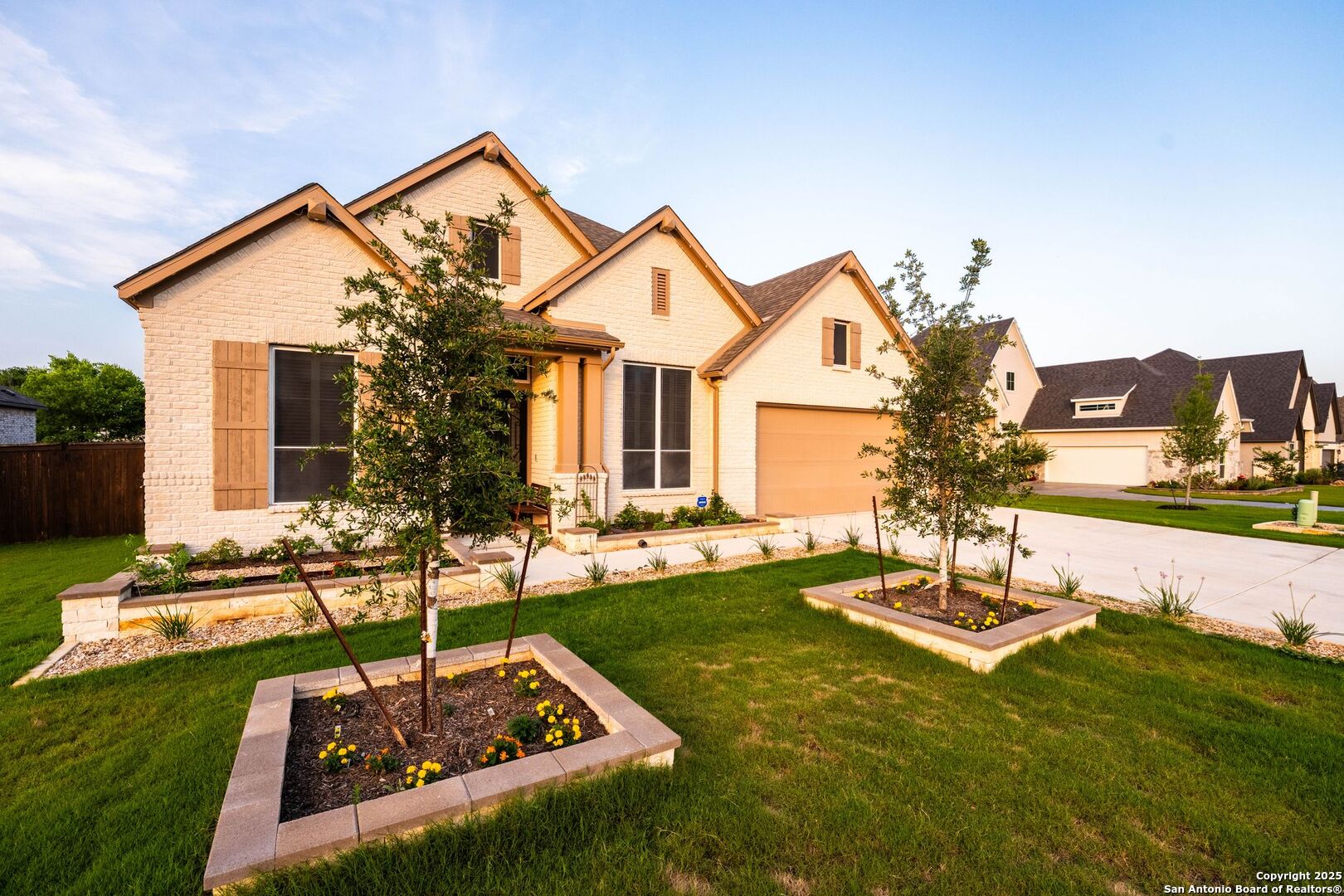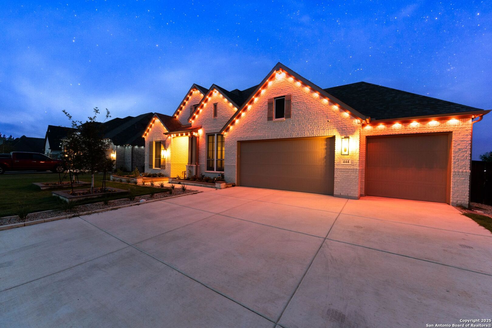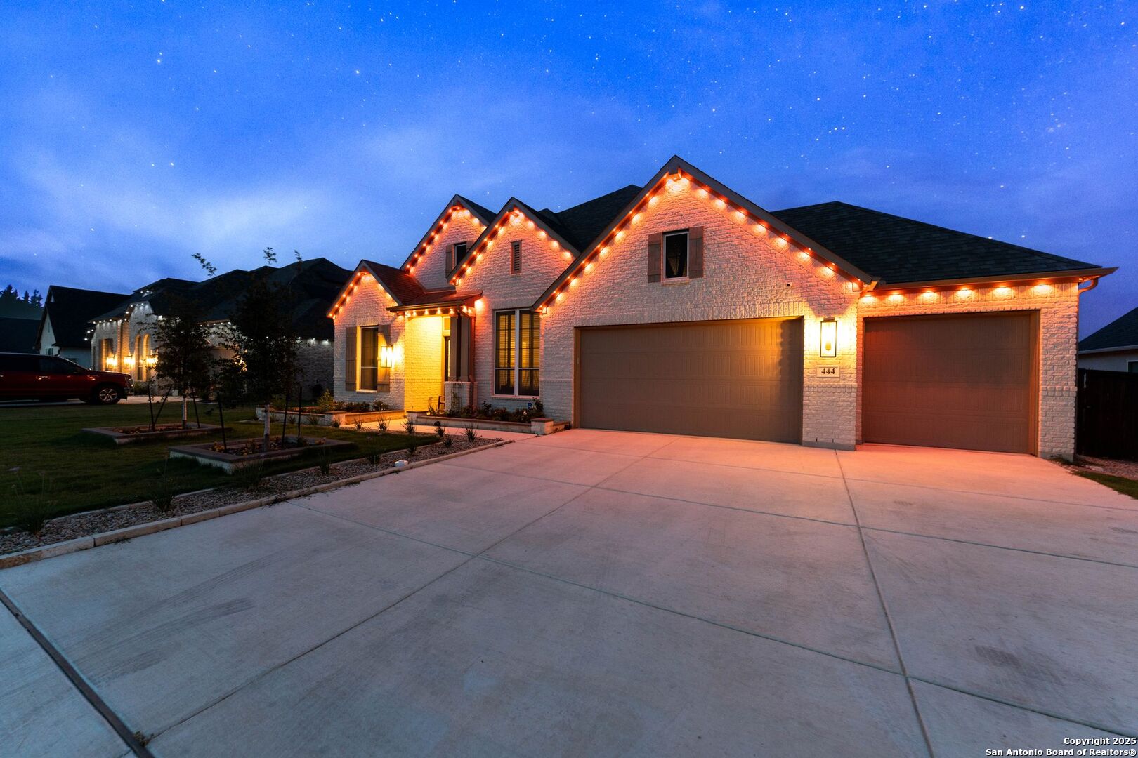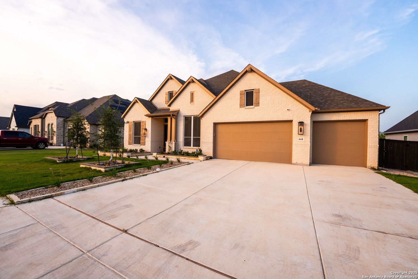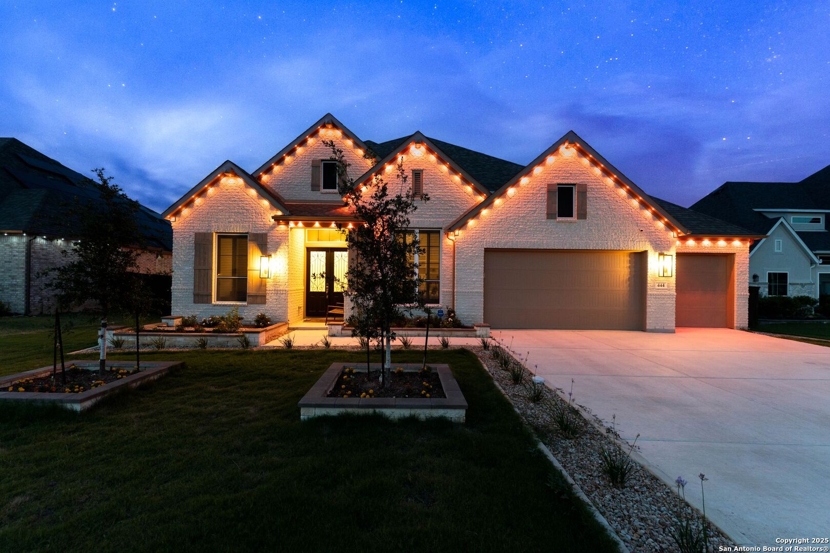 Welcome to 444 Westmont your luxury dream home thoughtfully designed! Step into the most voted 216 floorplan by Highland Homes, located in the prestigious Mesa Western subdivision. This like-new, one-story residence spans 3,220 sq ft and features 4 bedrooms, 3.5 bathrooms, media room, a study/office and a 3-car garage with extended height additional conveniences include a high-voltage smart car connection. This home is beautifully enhanced with an abundance of premium builder upgrades. From the moment you arrive, you're welcomed by a grand 8-foot double front door that opens into a spacious layout with gorgeous ceramic wood like flooring throughout the main areas, high ceilings and natural light pouring in through oversized windows. The gourmet kitchen is a dream, boasting a double XL island, high-end KitchenAid appliances, upgraded cabinetry, and a designer backsplash, all seamlessly connecting to the living and dining areas.The extended primary suite offers a luxurious retreat with a spa-like bath featuring dual vanities, a walk-in shower, a drop-in soaking tub, and a custom walk-in closet. Additional upgrades include an oversized laundry room with custom cabinetry and an upgraded walk-in secondary pantry, plantation shutters throughout, and a pre-wired media room with a 120" projector setup. The home also includes a water softener system, upgraded outdoor lighting for added ambiance and curb appeal, and an extended covered patio overlooking a spacious backyard with beautifully landscaped garden.Ideally located between San Antonio and Austin, this home offers easy access to JBSA-Randolph, a variety of shopping and dining options, and is zoned to the top rated SCUCISD school district. Don't miss this rare opportunity to own a luxury Highland Home in one of the area's most desirable communities. Welcome home!