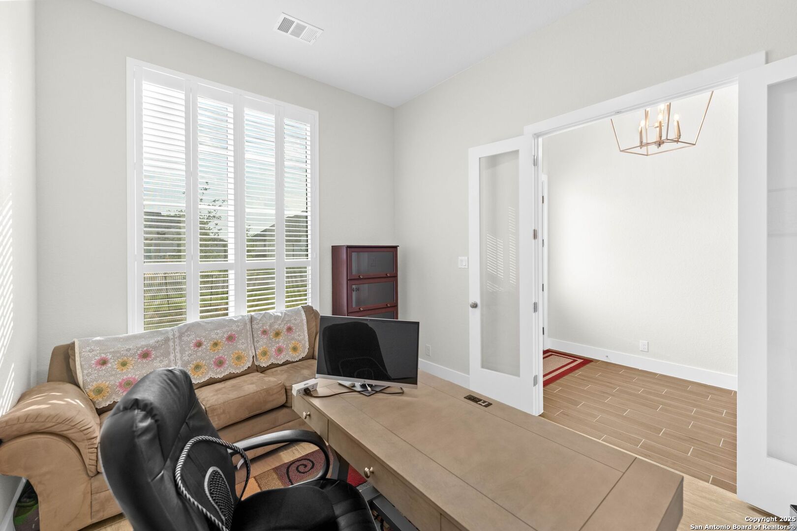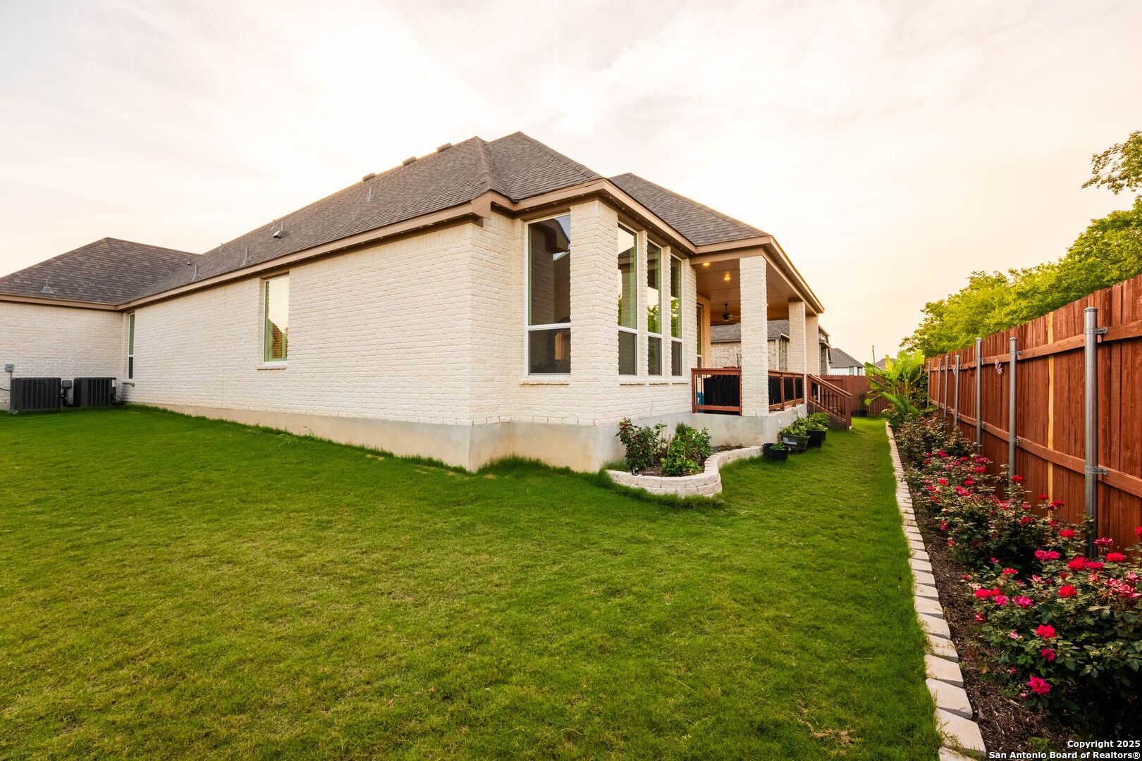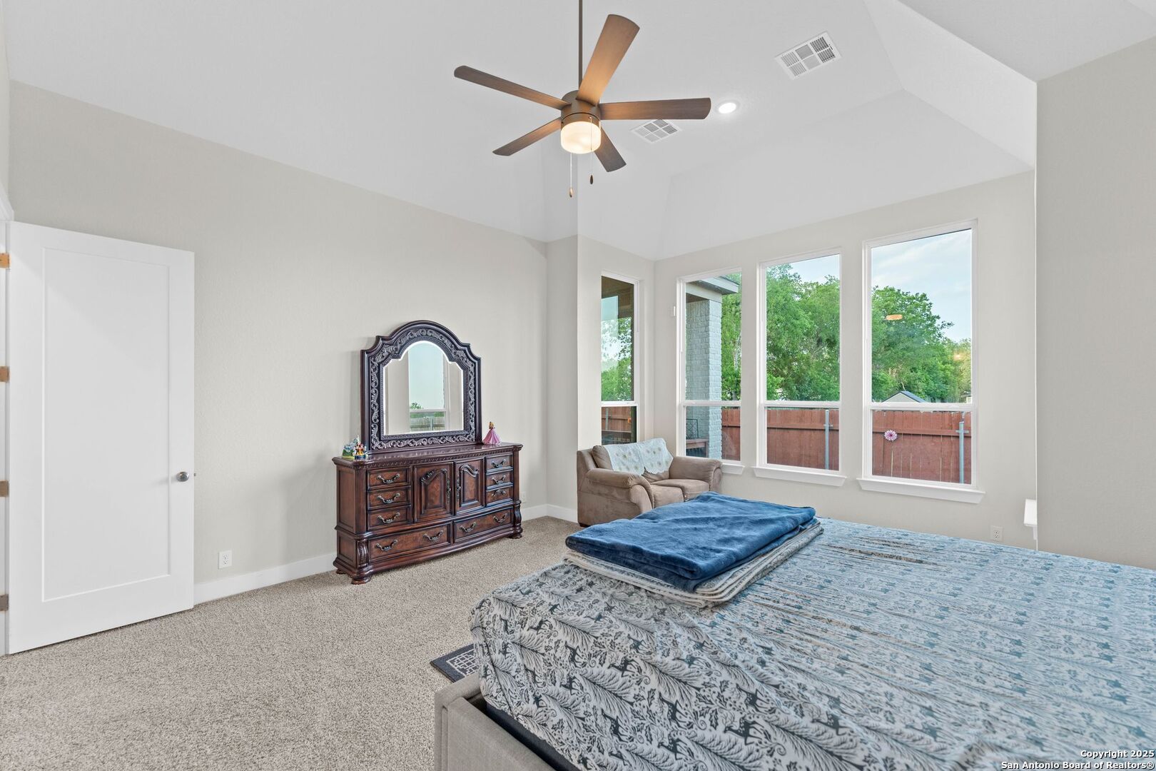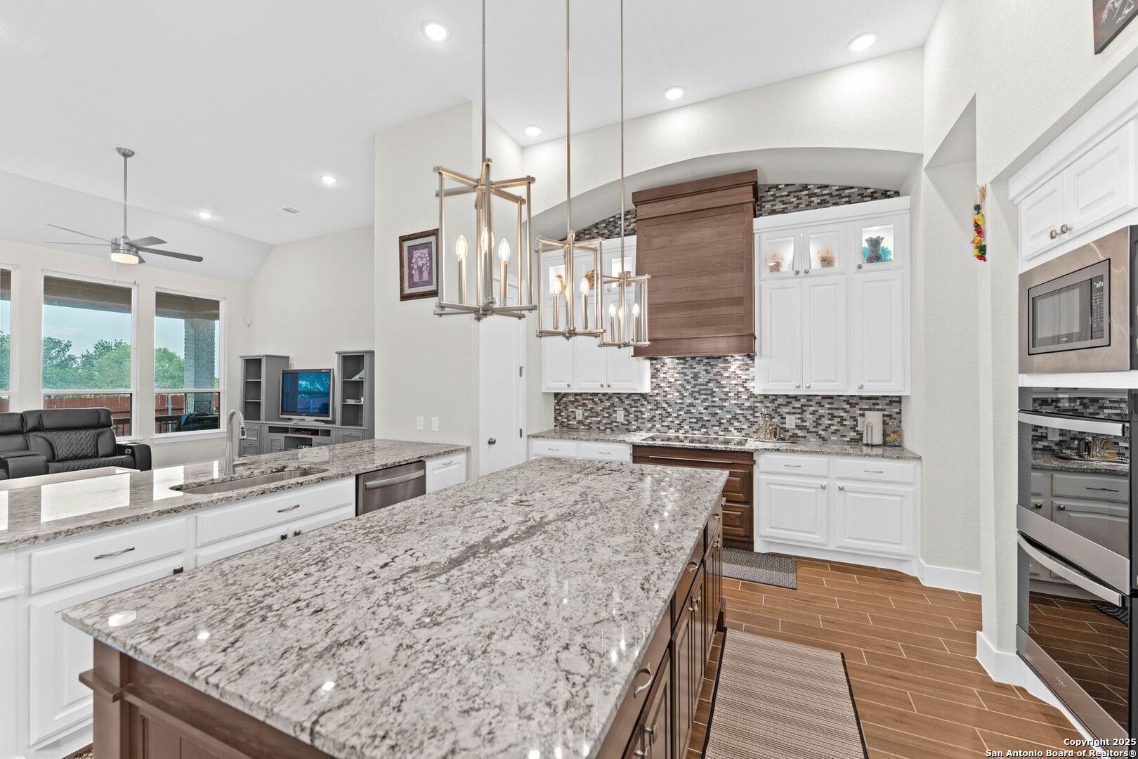 Welcome to 444 Westmont your luxury dream home thoughtfully designed! Step into the most voted 216 floorplan by Highland Homes, located in the prestigious Mesa Western subdivision. This like-new, one-story residence spans 3,220 sq ft and features 4 bedrooms, 3.5 bathrooms, media room, a study/office and a 3-car garage with extended height additional conveniences include a high-voltage smart car connection. This home is beautifully enhanced with an abundance of premium builder upgrades. From the moment you arrive, you're welcomed by a grand 8-foot double front door that opens into a spacious layout with gorgeous ceramic wood like flooring throughout the main areas, high ceilings and natural light pouring in through oversized windows. The gourmet kitchen is a dream, boasting a double XL island, high-end KitchenAid appliances, upgraded cabinetry, and a designer backsplash, all seamlessly connecting to the living and dining areas.The extended primary suite offers a luxurious retreat with a spa-like bath featuring dual vanities, a walk-in shower, a drop-in soaking tub, and a custom walk-in closet. Additional upgrades include an oversized laundry room with custom cabinetry and an upgraded walk-in secondary pantry, plantation shutters throughout, and a pre-wired media room with a 120" projector setup. The home also includes a water softener system, upgraded outdoor lighting for added ambiance and curb appeal, and an extended covered patio overlooking a spacious backyard with beautifully landscaped garden.Ideally located between San Antonio and Austin, this home offers easy access to JBSA-Randolph, a variety of shopping and dining options, and is zoned to the top rated SCUCISD school district. Don't miss this rare opportunity to own a luxury Highland Home in one of the area's most desirable communities. Welcome home!