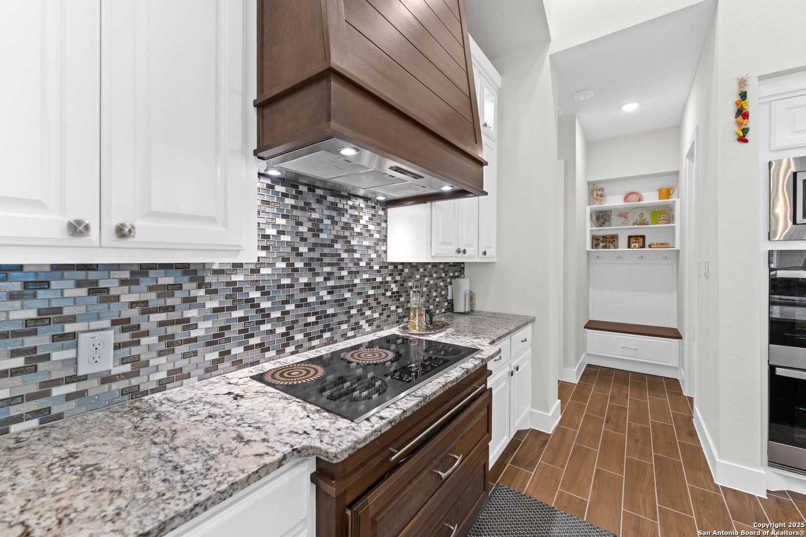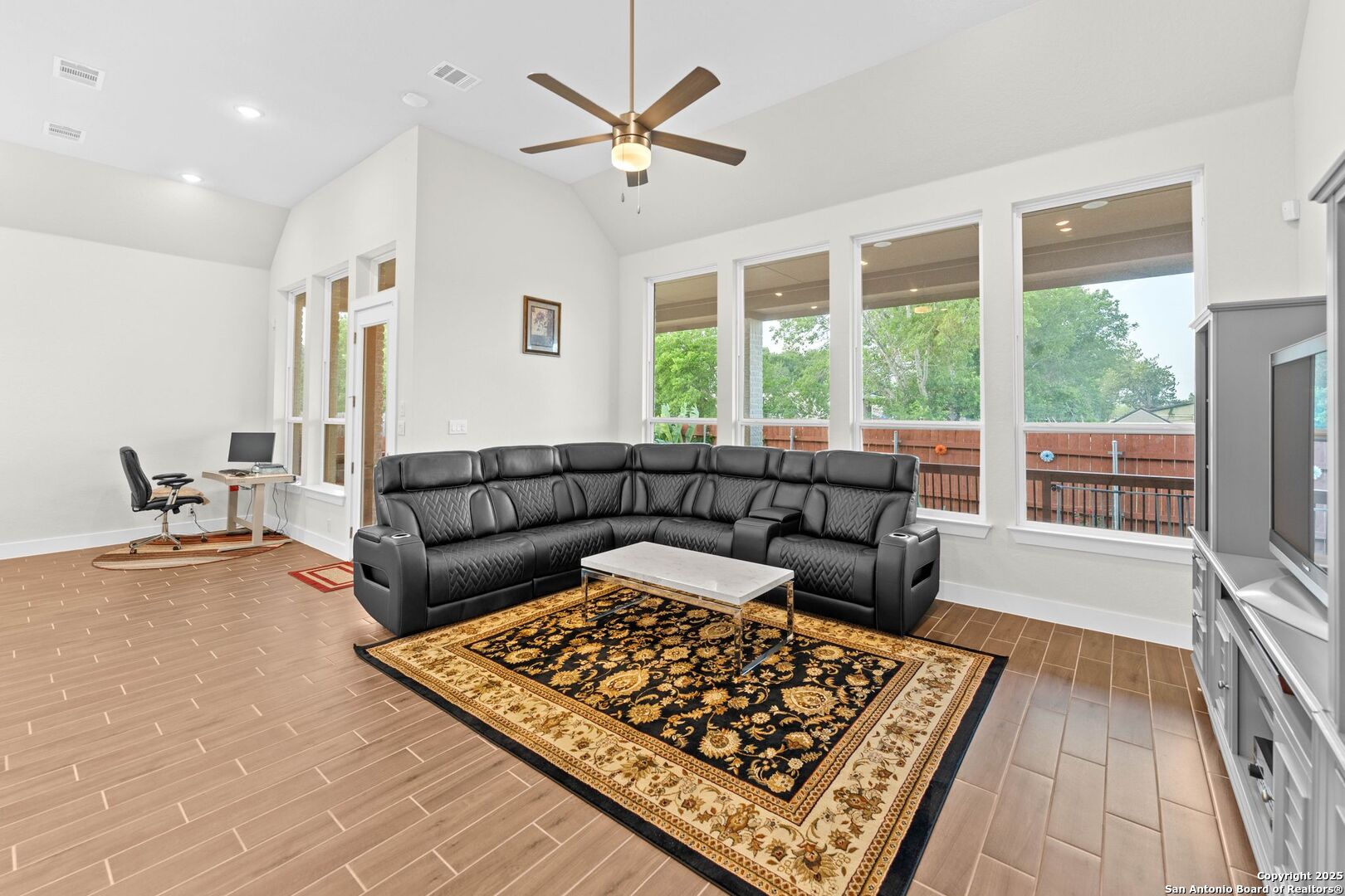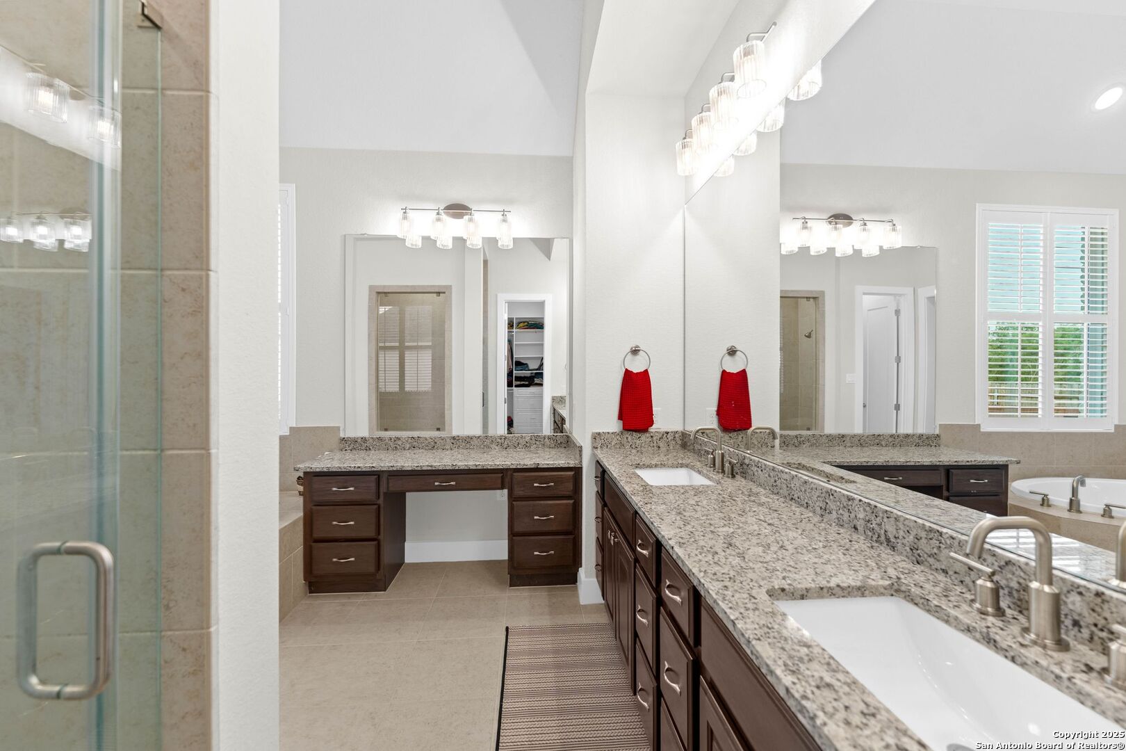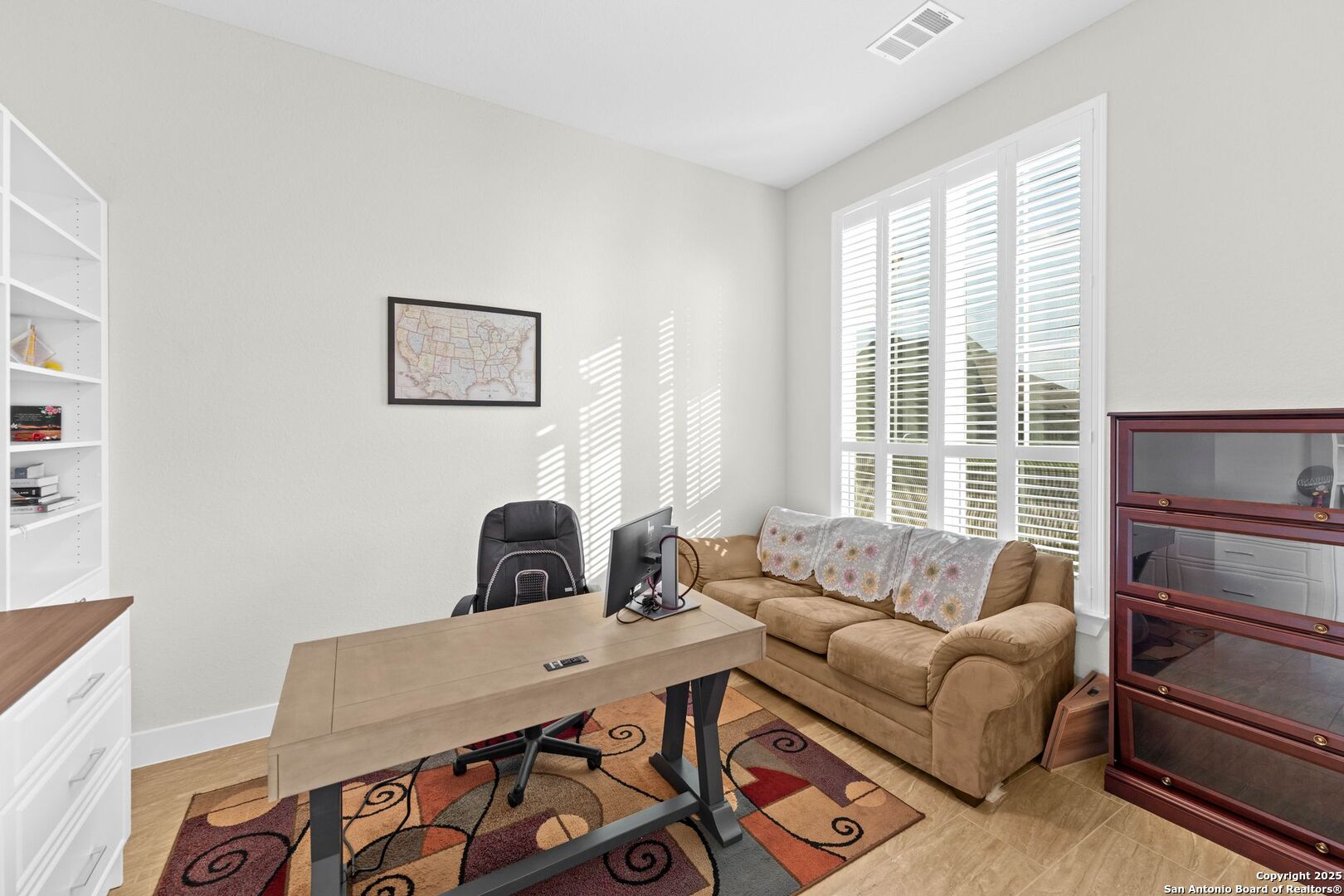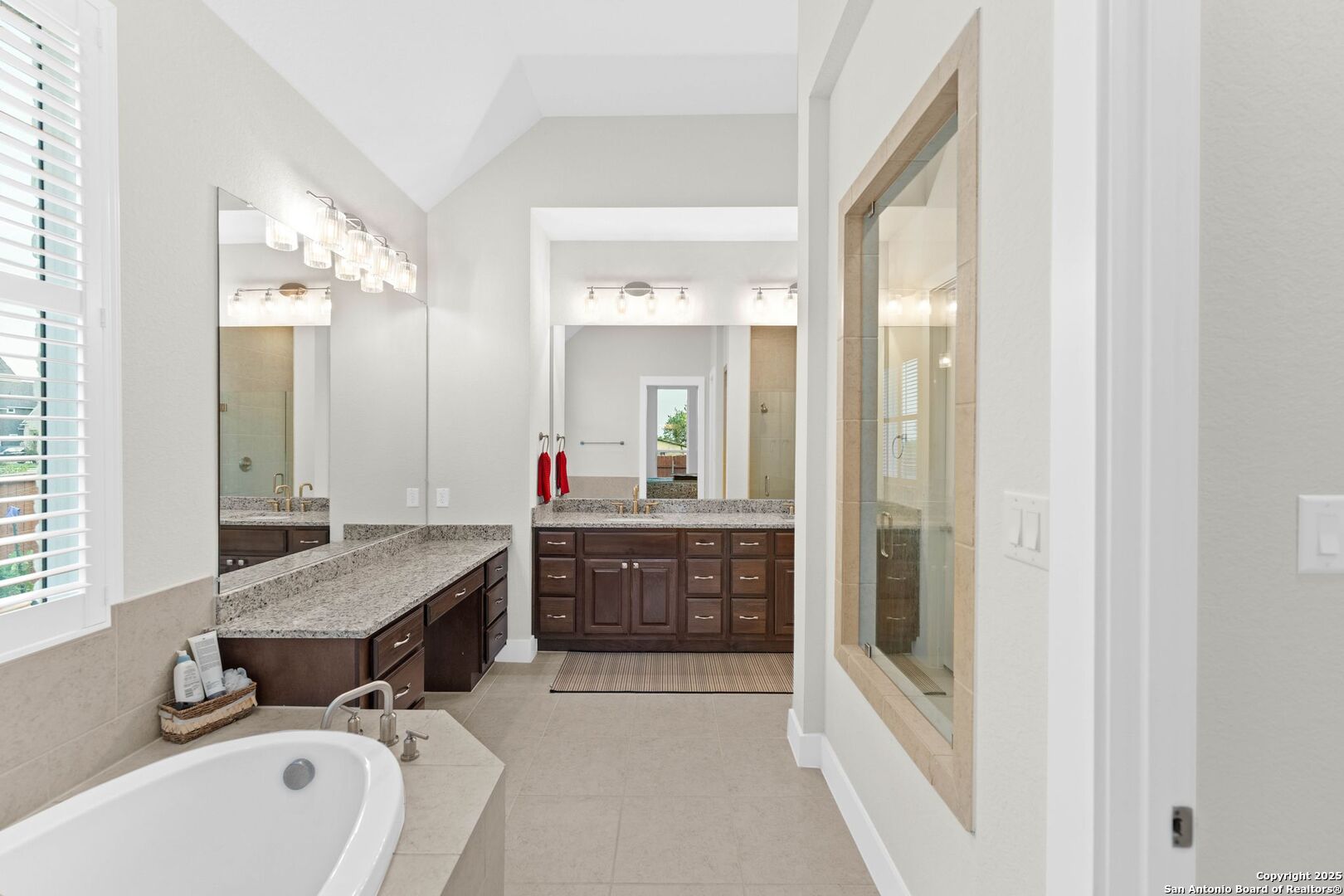 Welcome to 444 Westmont your luxury dream home thoughtfully designed! Step into the most voted 216 floorplan by Highland Homes, located in the prestigious Mesa Western subdivision. This like-new, one-story residence spans 3,220 sq ft and features 4 bedrooms, 3.5 bathrooms, media room, a study/office and a 3-car garage with extended height additional conveniences include a high-voltage smart car connection. This home is beautifully enhanced with an abundance of premium builder upgrades. From the moment you arrive, you're welcomed by a grand 8-foot double front door that opens into a spacious layout with gorgeous ceramic wood like flooring throughout the main areas, high ceilings and natural light pouring in through oversized windows. The gourmet kitchen is a dream, boasting a double XL island, high-end KitchenAid appliances, upgraded cabinetry, and a designer backsplash, all seamlessly connecting to the living and dining areas.The extended primary suite offers a luxurious retreat with a spa-like bath featuring dual vanities, a walk-in shower, a drop-in soaking tub, and a custom walk-in closet. Additional upgrades include an oversized laundry room with custom cabinetry and an upgraded walk-in secondary pantry, plantation shutters throughout, and a pre-wired media room with a 120" projector setup. The home also includes a water softener system, upgraded outdoor lighting for added ambiance and curb appeal, and an extended covered patio overlooking a spacious backyard with beautifully landscaped garden.Ideally located between San Antonio and Austin, this home offers easy access to JBSA-Randolph, a variety of shopping and dining options, and is zoned to the top rated SCUCISD school district. Don't miss this rare opportunity to own a luxury Highland Home in one of the area's most desirable communities. Welcome home!