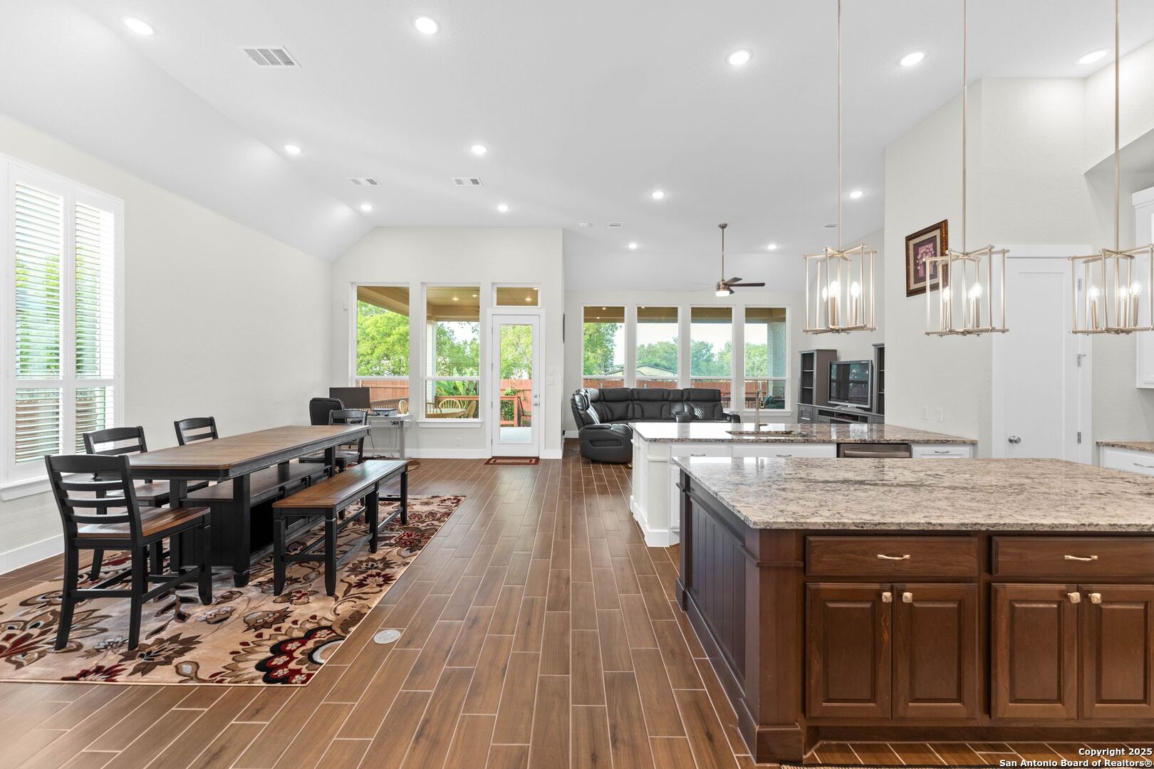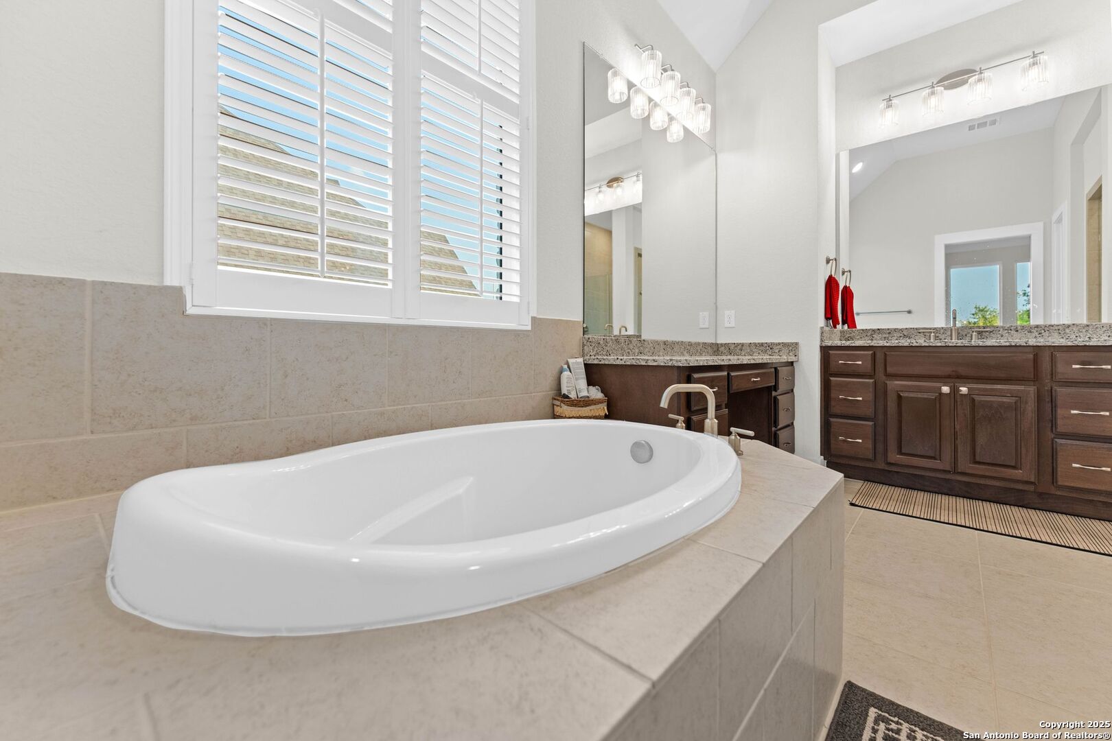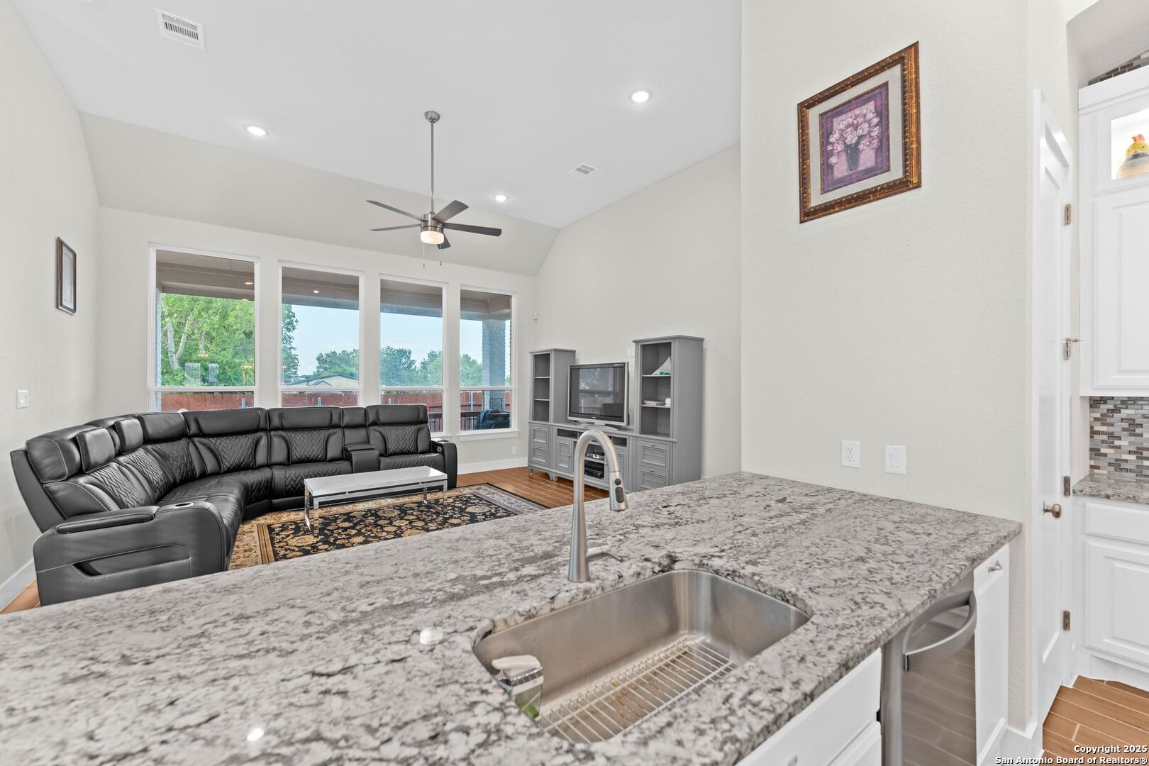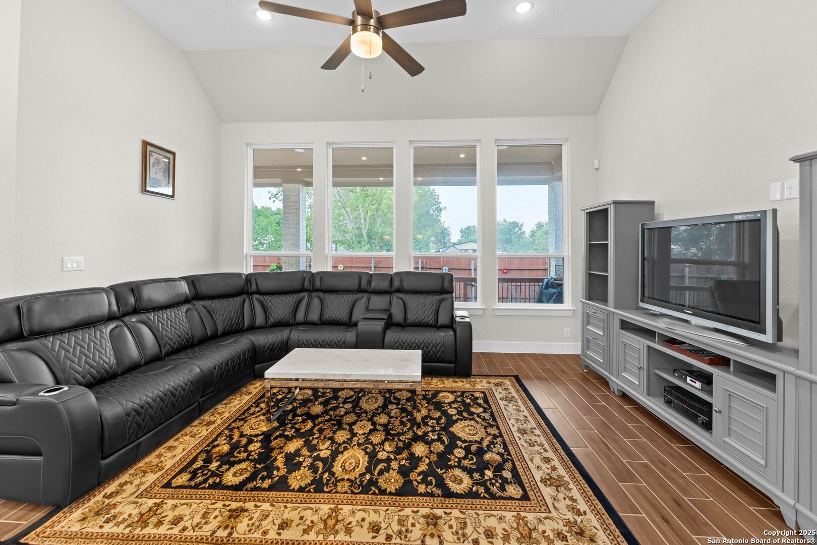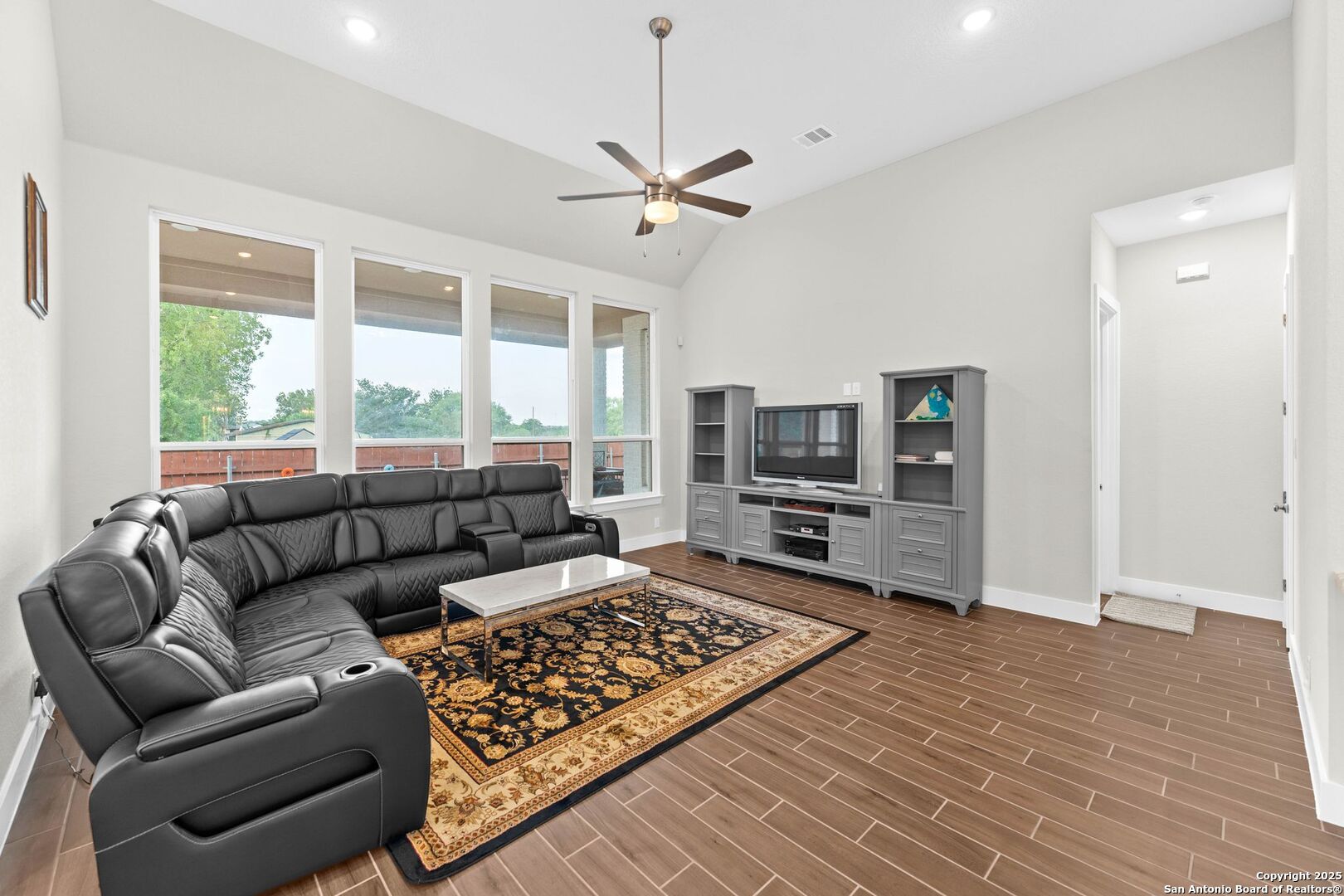 Welcome to 444 Westmont your luxury dream home thoughtfully designed! Step into the most voted 216 floorplan by Highland Homes, located in the prestigious Mesa Western subdivision. This like-new, one-story residence spans 3,220 sq ft and features 4 bedrooms, 3.5 bathrooms, media room, a study/office and a 3-car garage with extended height additional conveniences include a high-voltage smart car connection. This home is beautifully enhanced with an abundance of premium builder upgrades. From the moment you arrive, you're welcomed by a grand 8-foot double front door that opens into a spacious layout with gorgeous ceramic wood like flooring throughout the main areas, high ceilings and natural light pouring in through oversized windows. The gourmet kitchen is a dream, boasting a double XL island, high-end KitchenAid appliances, upgraded cabinetry, and a designer backsplash, all seamlessly connecting to the living and dining areas.The extended primary suite offers a luxurious retreat with a spa-like bath featuring dual vanities, a walk-in shower, a drop-in soaking tub, and a custom walk-in closet. Additional upgrades include an oversized laundry room with custom cabinetry and an upgraded walk-in secondary pantry, plantation shutters throughout, and a pre-wired media room with a 120" projector setup. The home also includes a water softener system, upgraded outdoor lighting for added ambiance and curb appeal, and an extended covered patio overlooking a spacious backyard with beautifully landscaped garden.Ideally located between San Antonio and Austin, this home offers easy access to JBSA-Randolph, a variety of shopping and dining options, and is zoned to the top rated SCUCISD school district. Don't miss this rare opportunity to own a luxury Highland Home in one of the area's most desirable communities. Welcome home!