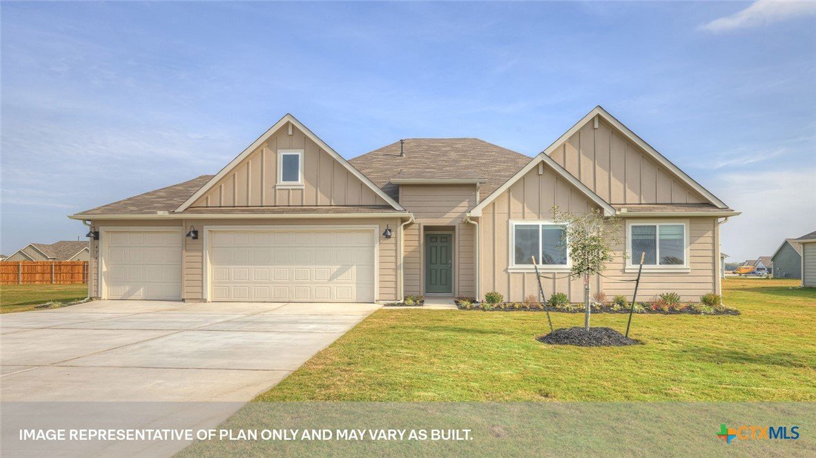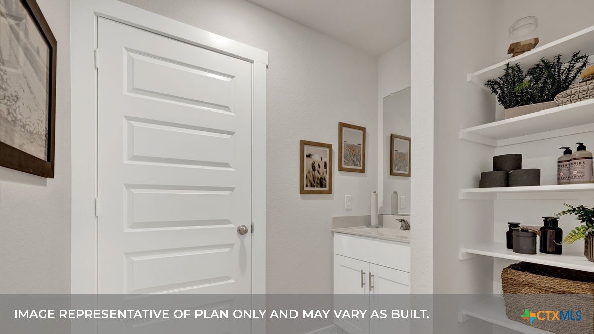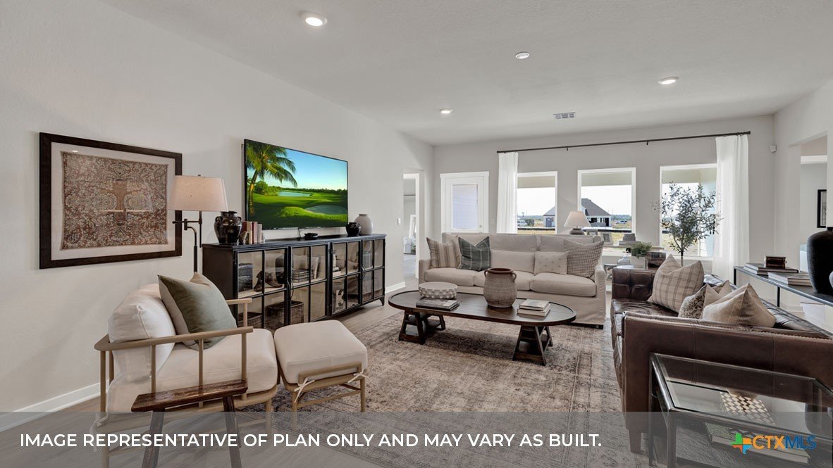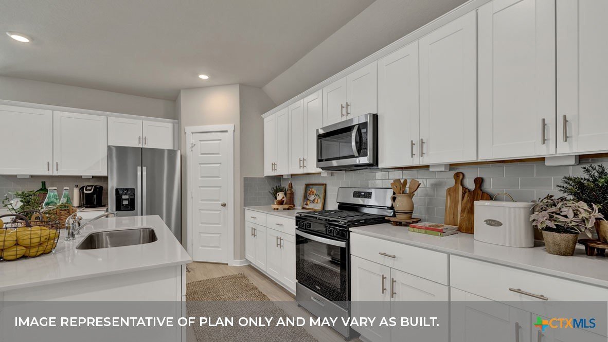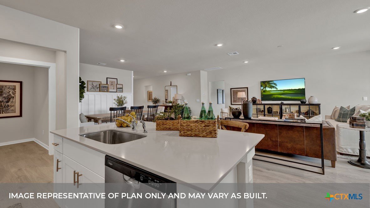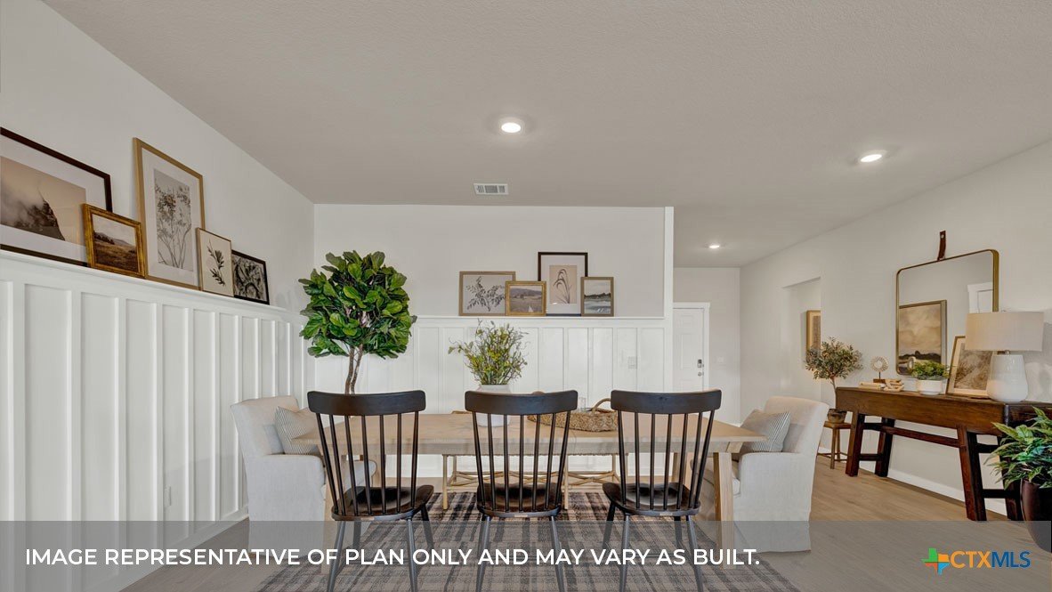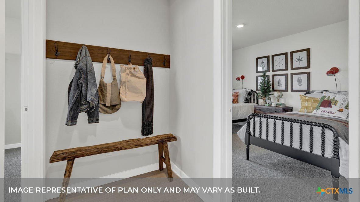 MARCH ESTIMATED COMPLETION DATE. The Irving is one of our most popular floorplans. This one-story home includes 5 bedrooms, 3 bathrooms, and a study within 2,592 square feet of living space and 3 car garage. As you enter the home you’ll cross the foyer to the dining room, family room and kitchen. This large open concept space is perfect for entertaining and everyday living. The kitchen includes an island with undermount sink, quartz countertops, decorative tile backsplash, a corner pantry closet, stainless-steel appliances and 36’’ upper cabinets. The utility room with an extra closet is located just off the kitchen. Check out the primary bedroom, located at the back of the home. This oversized bedroom will become your oasis at the end of the day. Enjoy the 5’ walk in shower, raised cultured marble vanity with double sinks and toilet area with a separate door. A walk-in closet with generous shelving is connected to the bathroom. In the opposite rear corner of the home, you’ll find Bedroom 2 and Bath 2. This private space could be perfect for your guests or any family member that needs their own space. At the front of the home, you’ll find the additional 3 bedrooms and Bath 3. Each secondary bedroom includes a closet with shelving, and the secondary bathrooms include a shower/tub combination and shelving for extra storage or décor. The study is off the family room and features a closet as well. With all the space the Irving offers, your family is sure to love this plan. The Irving includes vinyl flooring throughout the common areas of the home and the primary bedroom, and carpet in the secondary bedrooms. All our new homes feature a covered back patio, full sod, an irrigation system in the front and back yard, and full gutters. This home features our America’s Smart Home base package, which includes the Video Front Doorbell, Front Door Deadbolt Lock, Home Hub, Thermostat, and Deako® Smart Switches.
