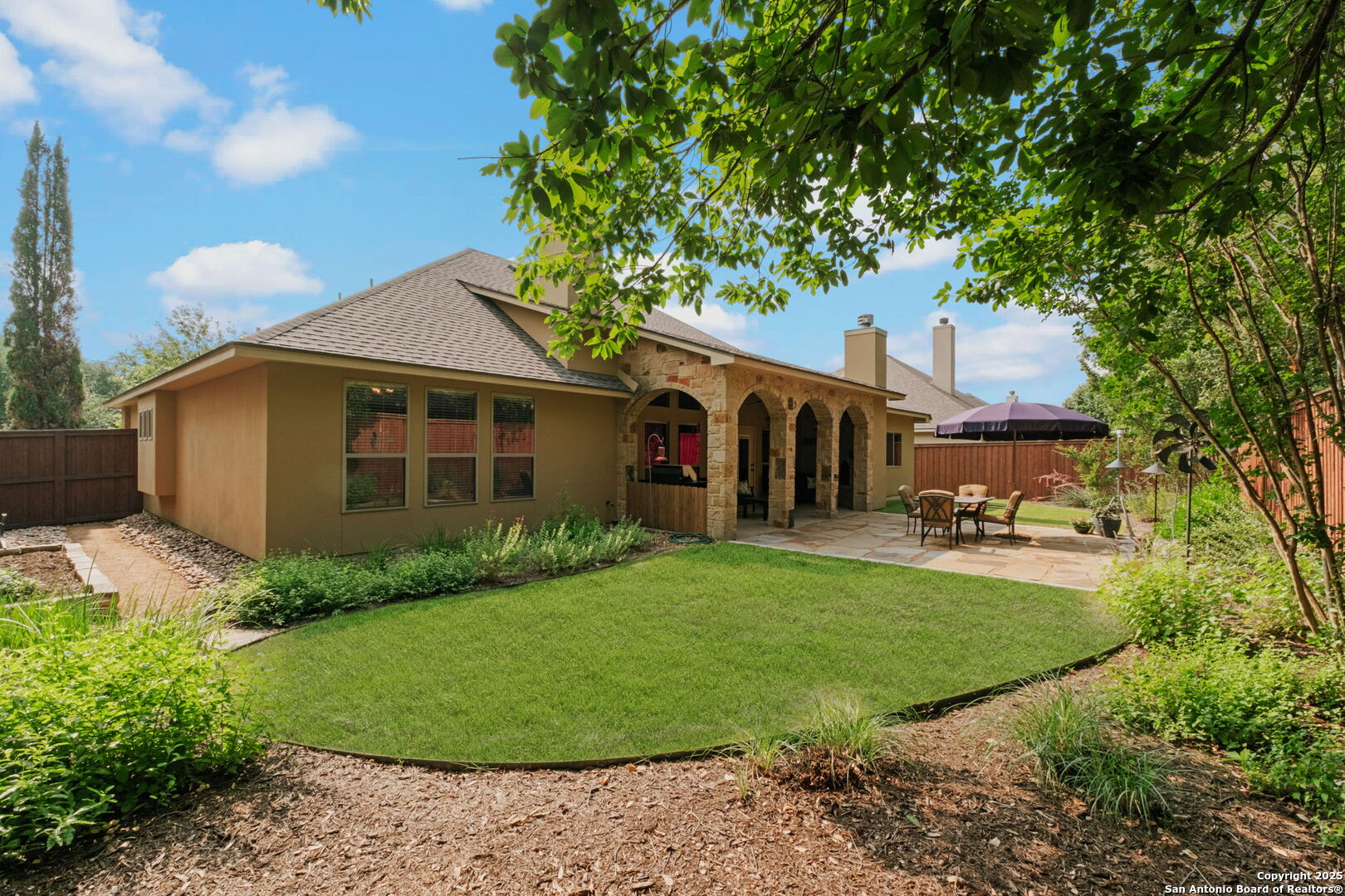 This custom former model home in desirable English Oaks is a beauty! Welcome Home as you walk up the sidewalk and step into the warm entry greeted by a formal dining room with pretty tray ceilings, built in china cabinet, and wood floors. Be wowed at the grand living room with an elegant floor to ceiling stone fireplace, plentiful windows to view the lush backyard, and decorative wood beams across the ceiling. The spacious kitchen has granite counters, an island, and plentiful cabinetry. The en-suite bedroom and bath has a separate shower and soaking tub. Granite in all baths. Three secondary bedrooms, one which is currently used as a study, makes this a great floor plan with lots of space and flexibility. You will fall in love with the back yard space! The stone patio with flagstone floors and outdoor fireplace is a perfect place to spend the summer evenings. The backyard is lush and private. Walking distance to Boerne High school and Curington Elementary. Gorgeous home! Weather station on back patio does not convey.