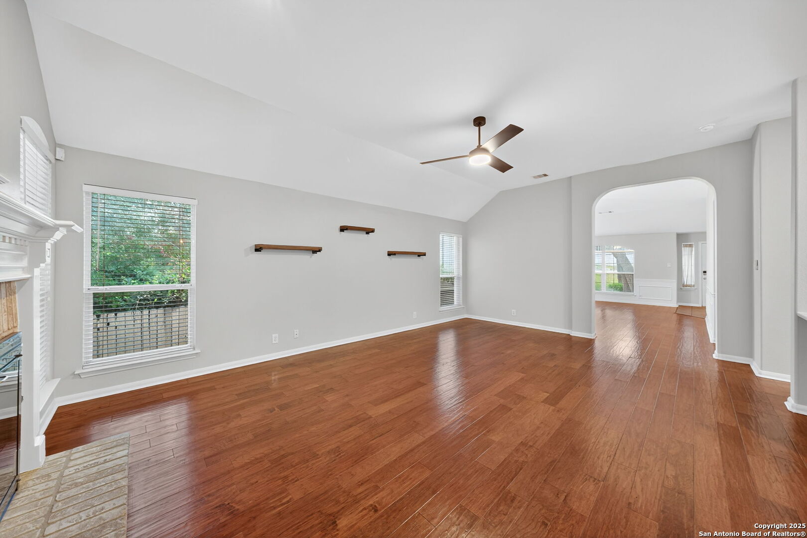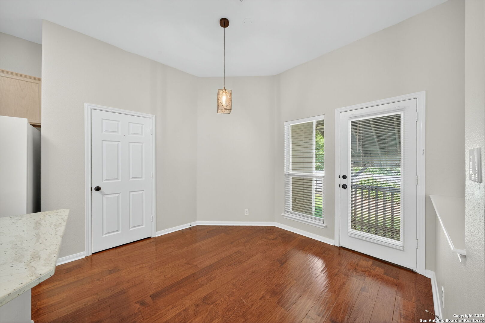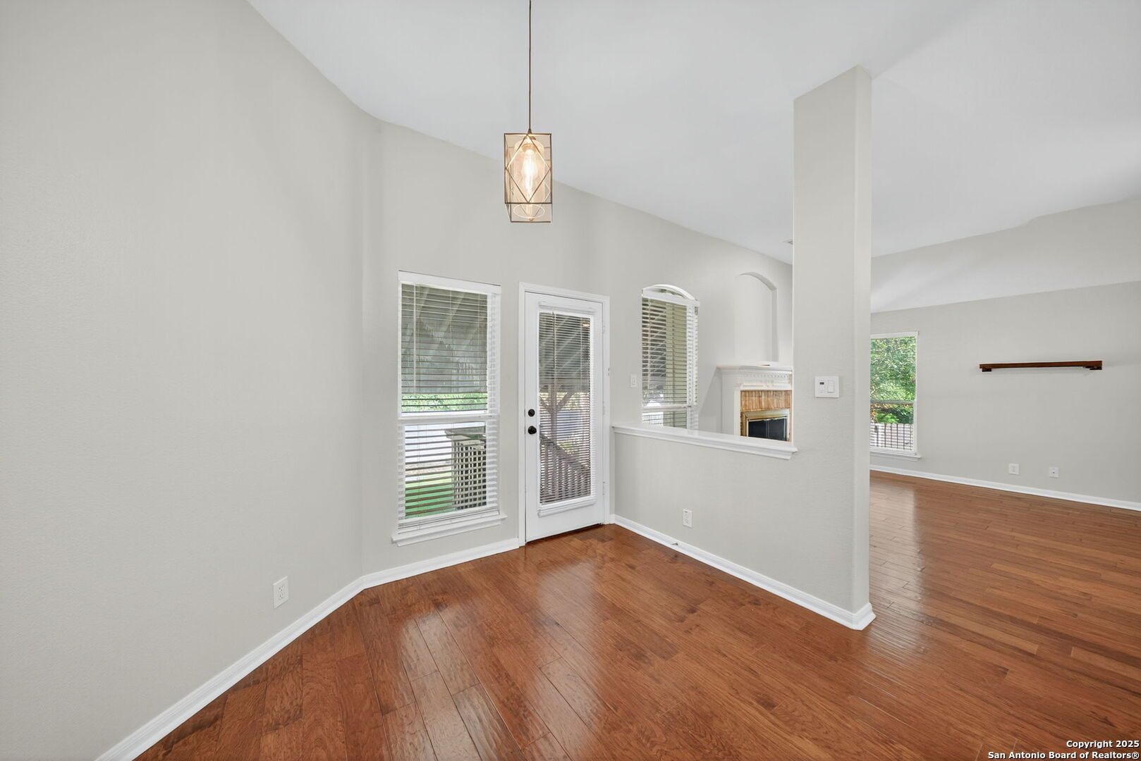 Discover this beautifully maintained single-story home in the gated community of Finesilver. Offering 4 spacious bedrooms and 2 full baths, the home features an open floor plan with hardwood floors, a cozy fireplace, and abundant natural light throughout. The kitchen includes a brand-new stove and refrigerator, with seamless flow into the living space for easy entertaining. A charming breakfast nook and a separate formal dining room provide versatile dining options. Step outside to a private backyard that backs to a serene greenbelt, offering peaceful views and added privacy. Conveniently located near shopping, dining, and highly regarded schools, this property blends comfort, style, and location.