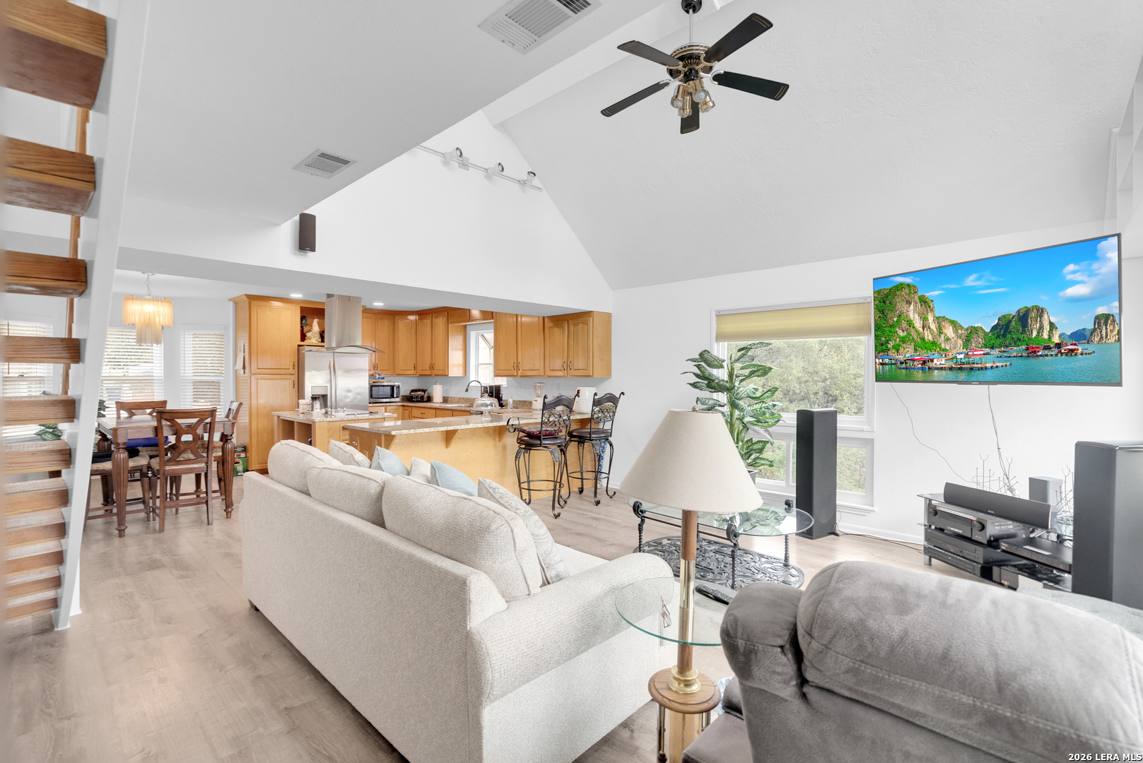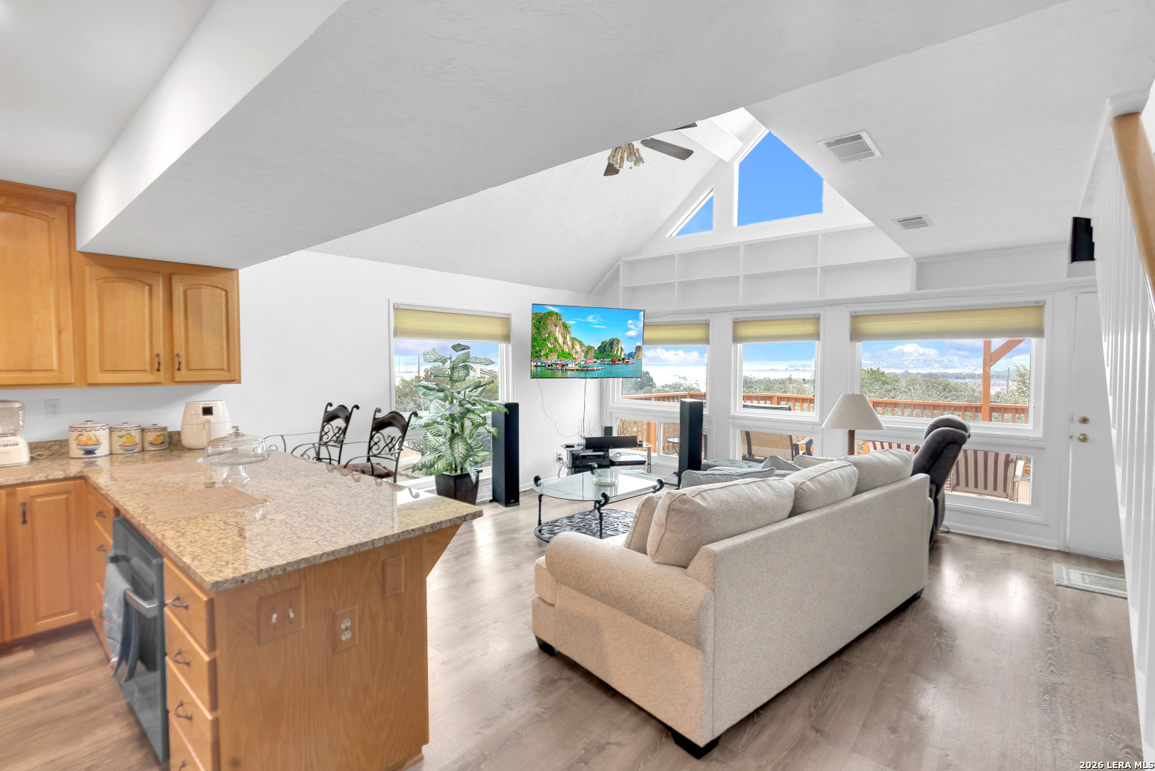Get ready to immerse in this Canyon Lake Oasis with a stunning lake view! This could be a great retreat or full time residence. Fall in love with the 3/2.5 on .5 of an acre. In the home you'll be captivated by the beautiful water views & abundance of natural light, large windows that offer the open floor plan with island kitchen w/stainless appliances, granite counters & bar seating, and a spacious dining area. Come out to the expansive 200 sf deck, accessible from the main level great room & the primary suite. With another 100sf deck offers shade & is accessible from the upper-level hall & 1 of the 2 guest bedrooms which share access to the guest bathroom w/dbl vanity & tub/shower combo. Primary bath also features a dbl vanity, shower & tons of storage. There's storage galore in this home and underneath. A dbl gate allows easy access to the fenced side and rear yard, where a parking/storage area under the house awaits, ideal for yard equipment or your beloved boat or RV. You are sure to enjoy the large greenhouse & the tranquil water fountain. Summer swimming and fishing days await you and the family!
