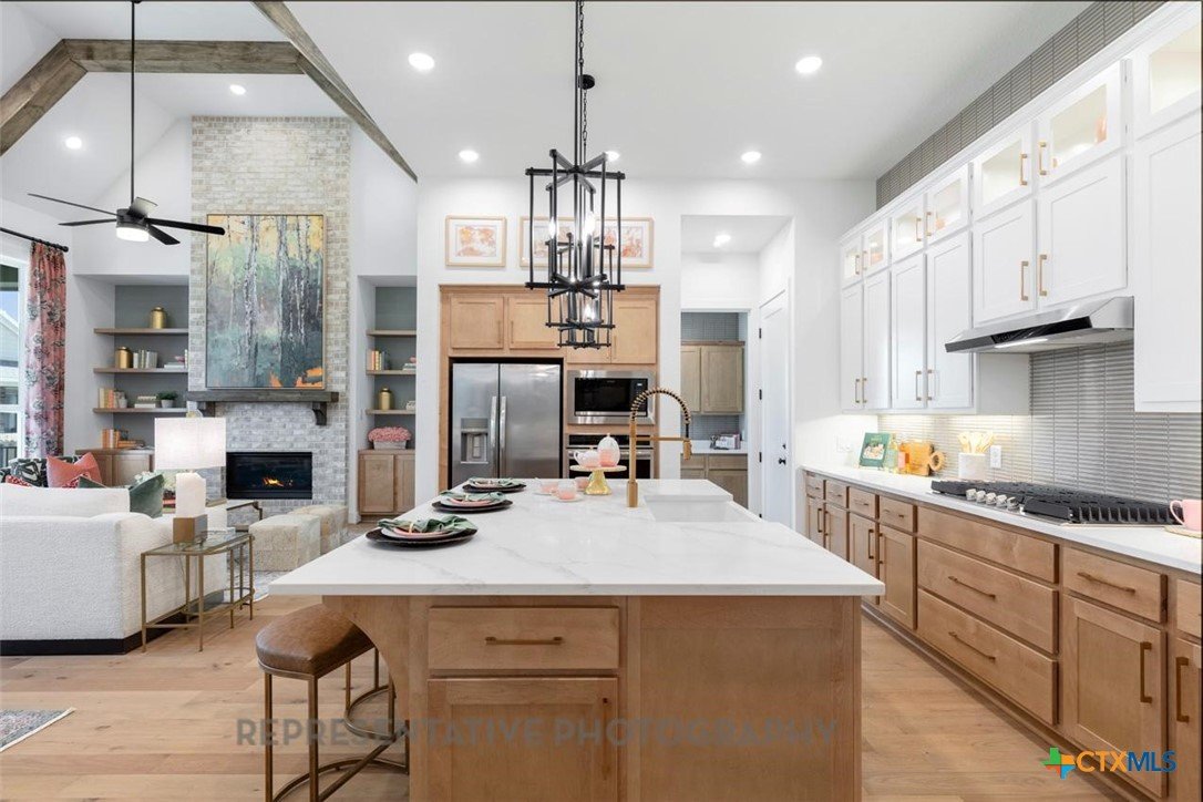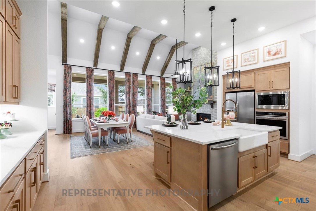 One of Highland Homes newest communities, Mont Blanc, is located in Schertz. The Birchwood floor plan blends spacious design with modern comfort in a beautifully crafted single-story layout. An inviting open concept living area forms the heart of the home, where soaring high ceilings and abundant natural light create an airy, welcoming atmosphere. The family room features a striking fireplace that anchors the space and flows seamlessly into the gourmet kitchen and dining area—perfect for gatherings and everyday living. Designed with indoor-outdoor living in mind, the Birchwood includes an extended outdoor living area, ideal for relaxation, dining, or entertaining. The private primary suite is a true retreat, enhanced by a charming bay window that adds both elegance and extra space. The luxurious primary bath that features a freestanding tub and walk-in closet complete the suite’s tranquil feel. With four bedrooms and three and a half baths, this floor plan provides impressive flexibility. A three-car tandem garage offers ample storage and parking, accommodating vehicles, hobbies, or seasonal items with ease. The Birchwood combines thoughtful design, premium features, and effortless flow, making it a perfect choice for those seeking refined single-story living.