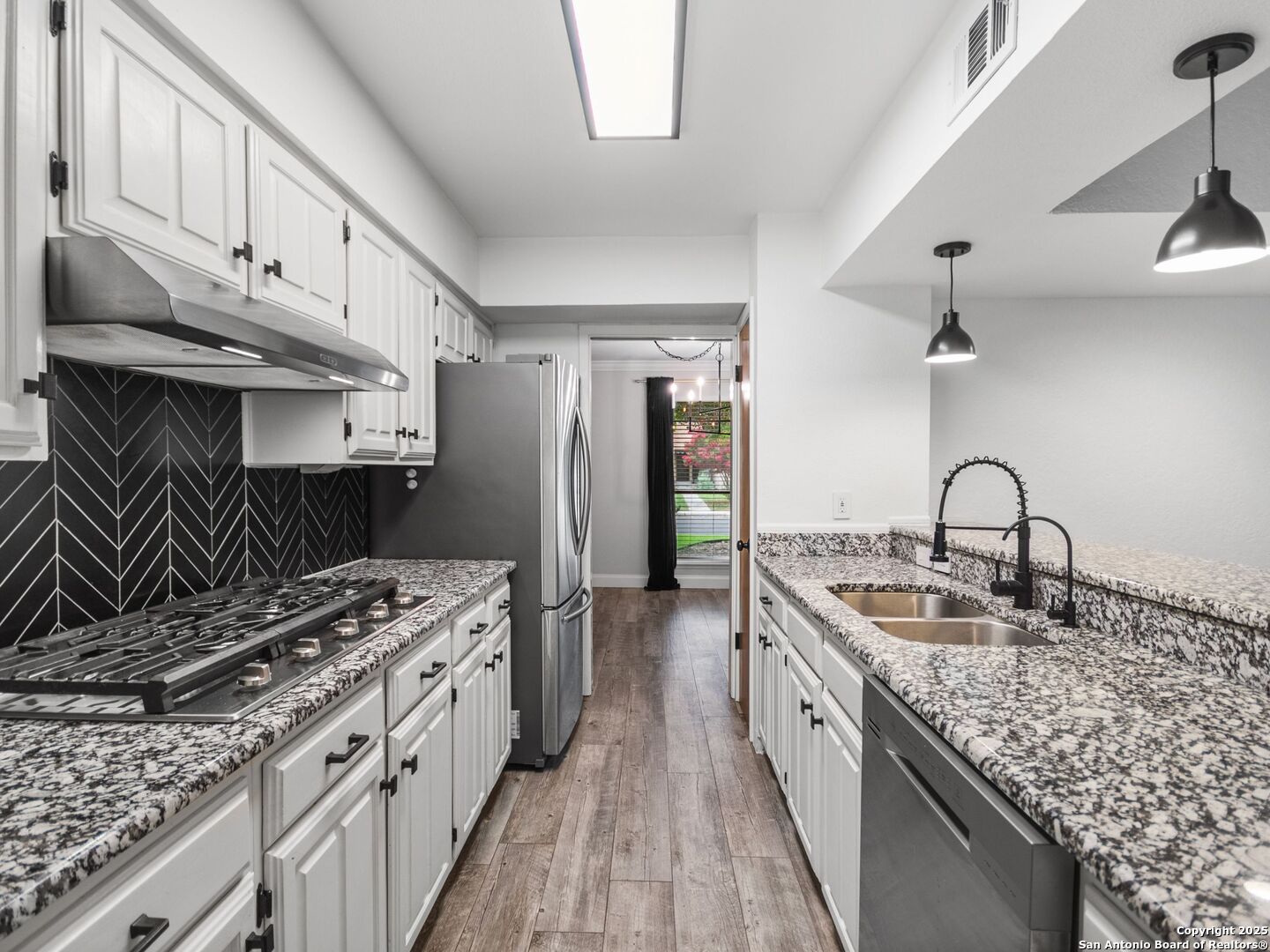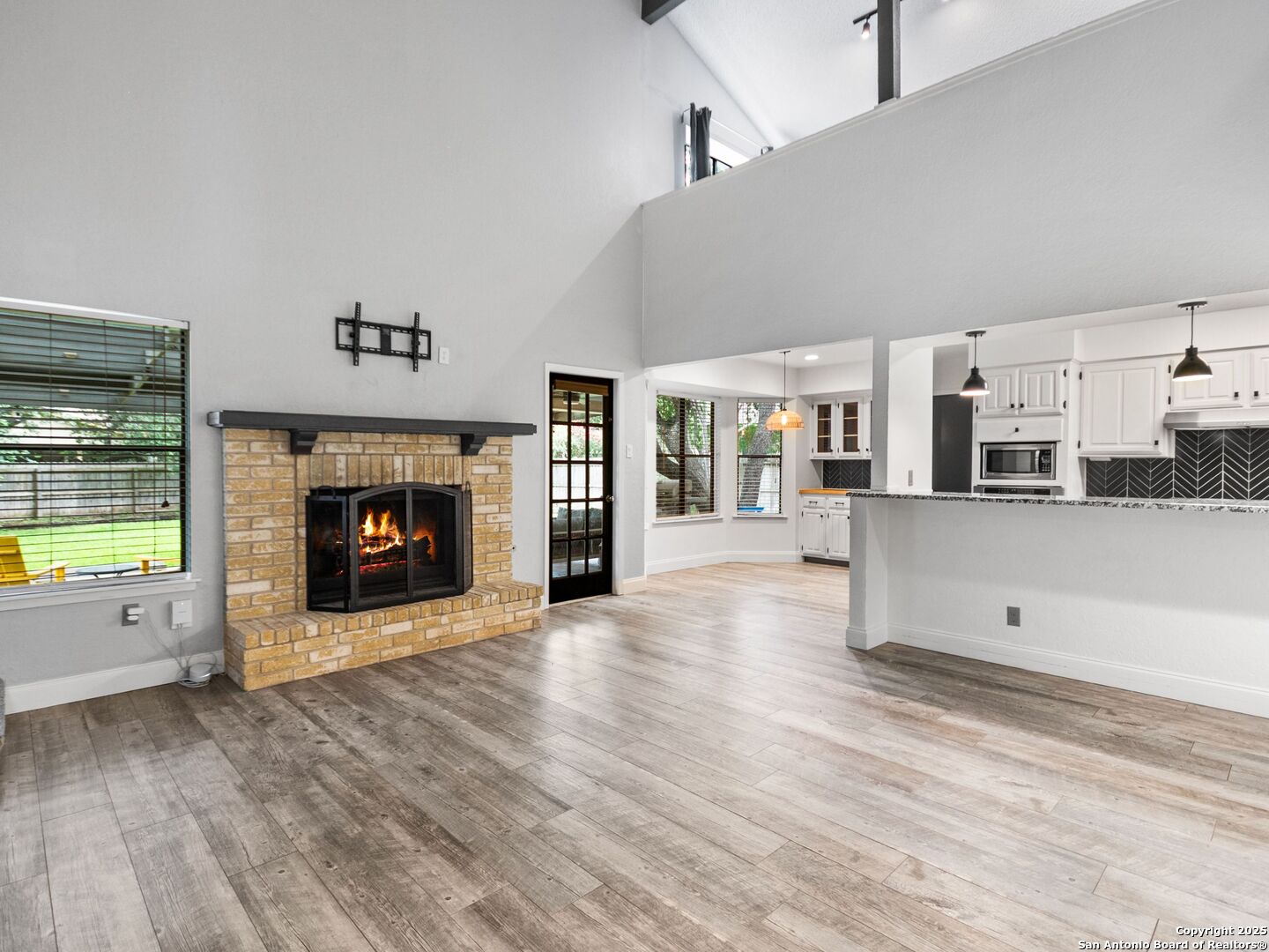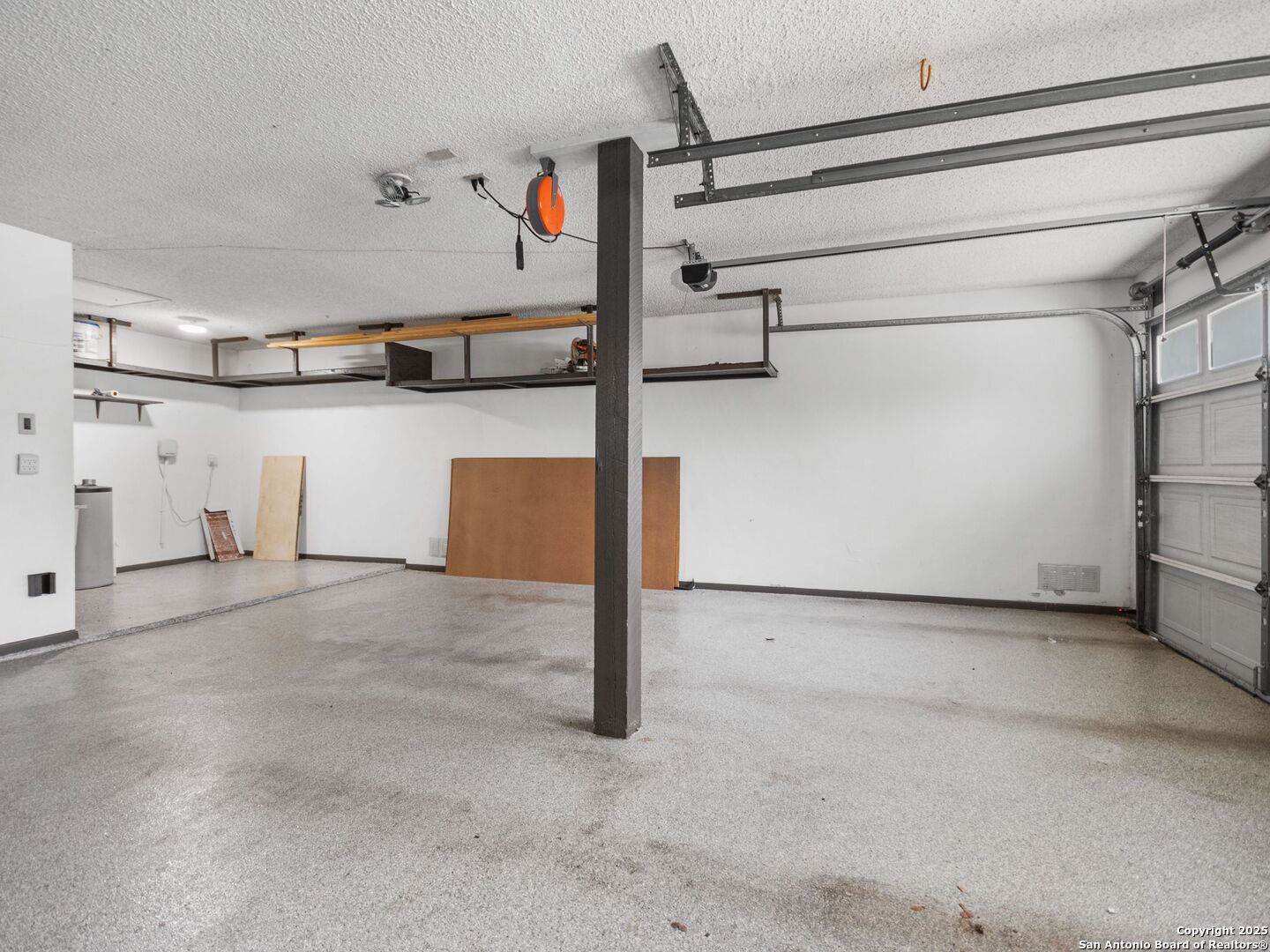 This beautifully updated property is perfectly situated in a well-established, tree-lined neighborhood with easy access to I-10 and Loop 1604. Enjoy the best of both worlds-peaceful residential living just minutes from major employers and amenities, including the Medical Center, USAA, Valero, UTSA, top-rated NISD schools, dining, and shopping. Inside, you're greeted by soaring 25-foot ceilings in the spacious living room, creating an open and airy feel. The home features a flexible floor plan designed to adapt to your lifestyle-ideal for growing families, remote work, or multi-use living spaces. The main living areas are outfitted with stylish wood-look ceramic tile flooring, combining durability with a warm, modern aesthetic. The kitchen is a chef's delight, featuring granite countertops, updated stainless steel appliances, ample cabinet space, and a layout perfect for entertaining or casual dining. The open-concept design allows easy flow from the kitchen to the living and dining areas. Additional updates include a new HVAC system installed in 2024, ensuring comfort and energy efficiency year-round. The finished garage offers a pristine epoxy floor, additional storage, and dedicated shop space-perfect for hobbies, home projects, or a fitness area. Step outside to a generously sized backyard with endless potential. There's ample room to install a pool, create an outdoor kitchen, or expand your garden. A large patio offers the perfect spot for gatherings, barbecues, or relaxing under the stars. The sprinkler system keeps your lawn and garden thriving with ease. The roof was replaced in 2016, adding long-term value and peace of mind. Every detail of this home has been lovingly maintained and thoughtfully upgraded. Whether you're looking for location, space, or quality upgrades, this home checks all the boxes. Don't miss this rare opportunity to own a move-in-ready gem in one of San Antonio's most convenient and established neighborhoods.