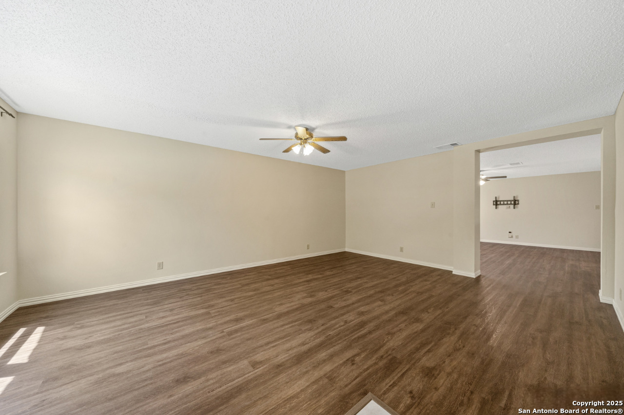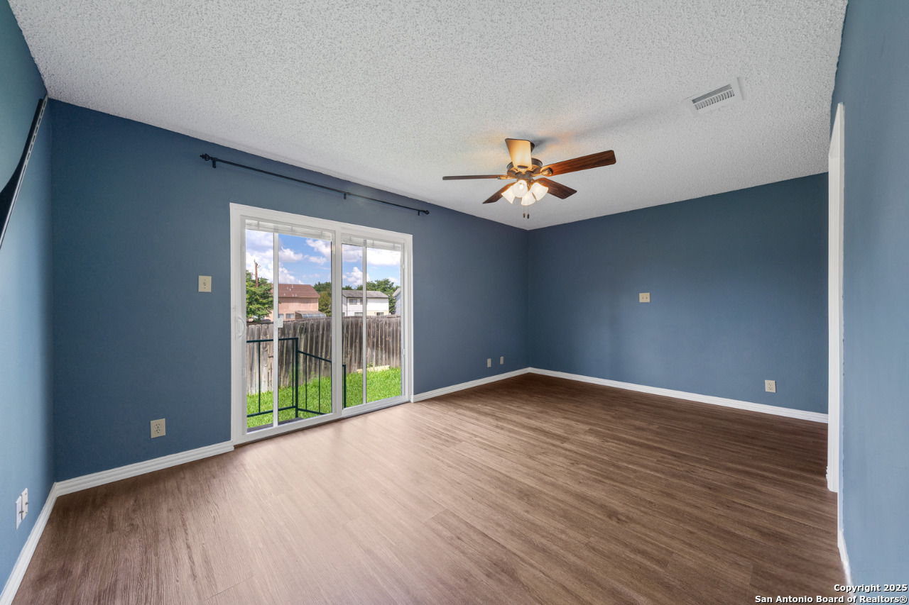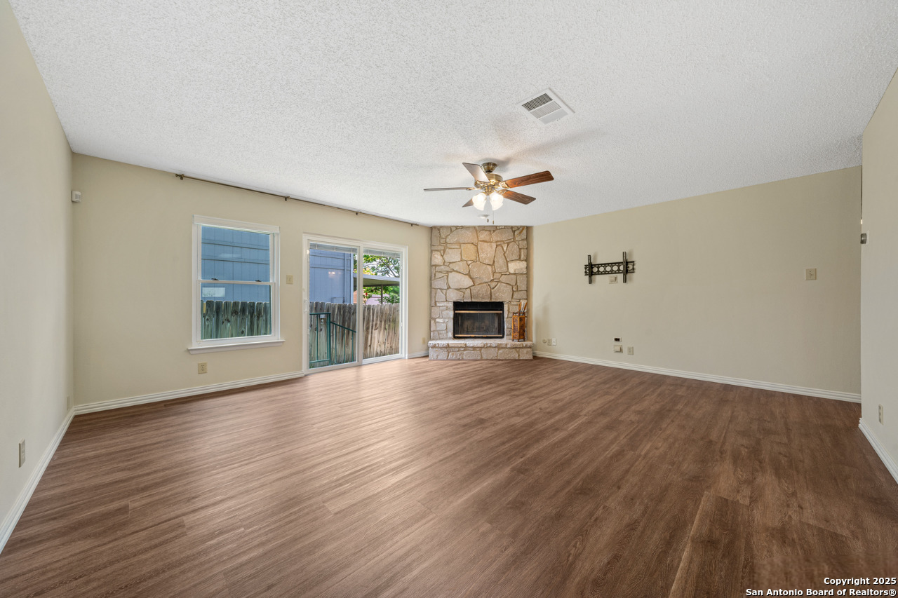 This beautiful home looks like it has never been lived in! Immaculate from the front door through to the outside, the attention to detail includes beautiful wood laminate flooring, a pretty tiled kitchen and baths (allergy-free - no carpeting), and decorator colors in the bedrooms. The floorplan offers two large living areas; the front room is large enough for a living/dining area; the second living space has a fireplace and outside access. The open concept floor plan includes an eat-in kitchen off the family room with an entertainment/breakfast bar, and even a rolling workstation for the cook in the family. The refrigerator, washer, and dryer are also there for you. The large master suite has a nice full bath with a new vanity plus outside access to the backyard. This home sits on a secluded cul-de-sac lot and greenbelt. AVAILABLE NOW! Don't miss it!