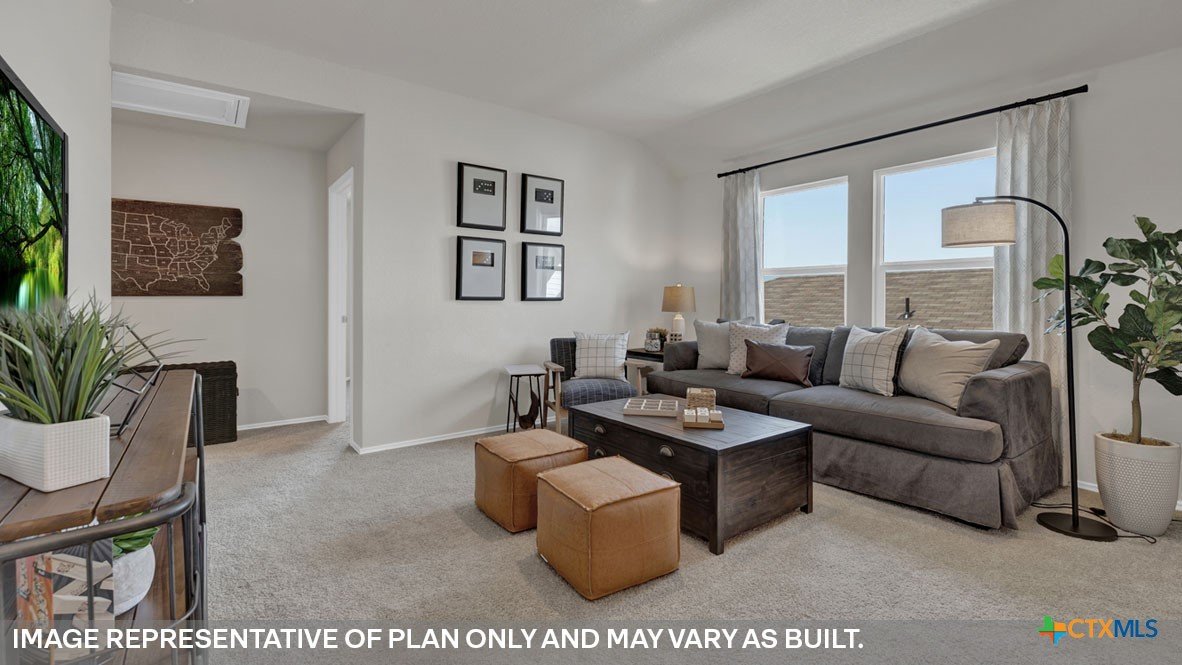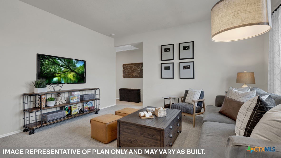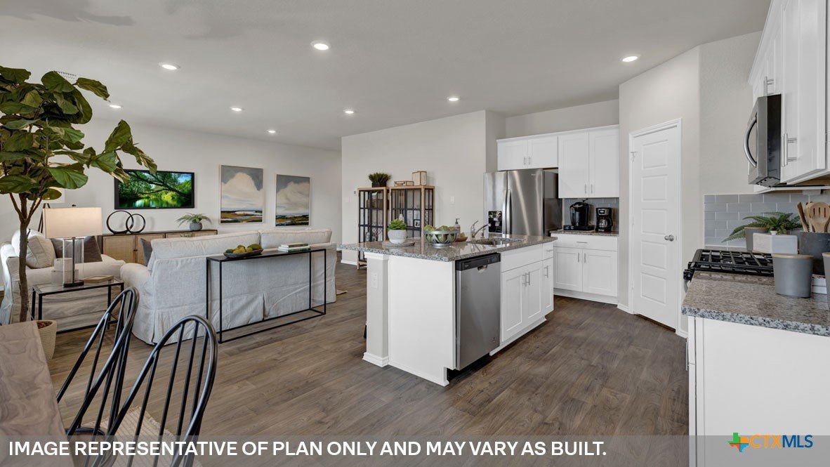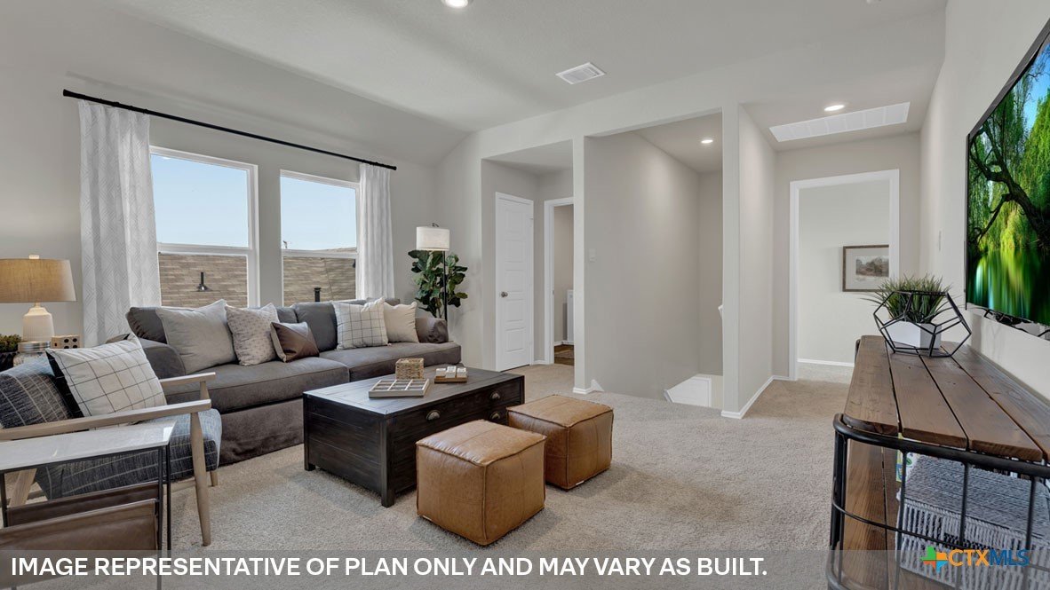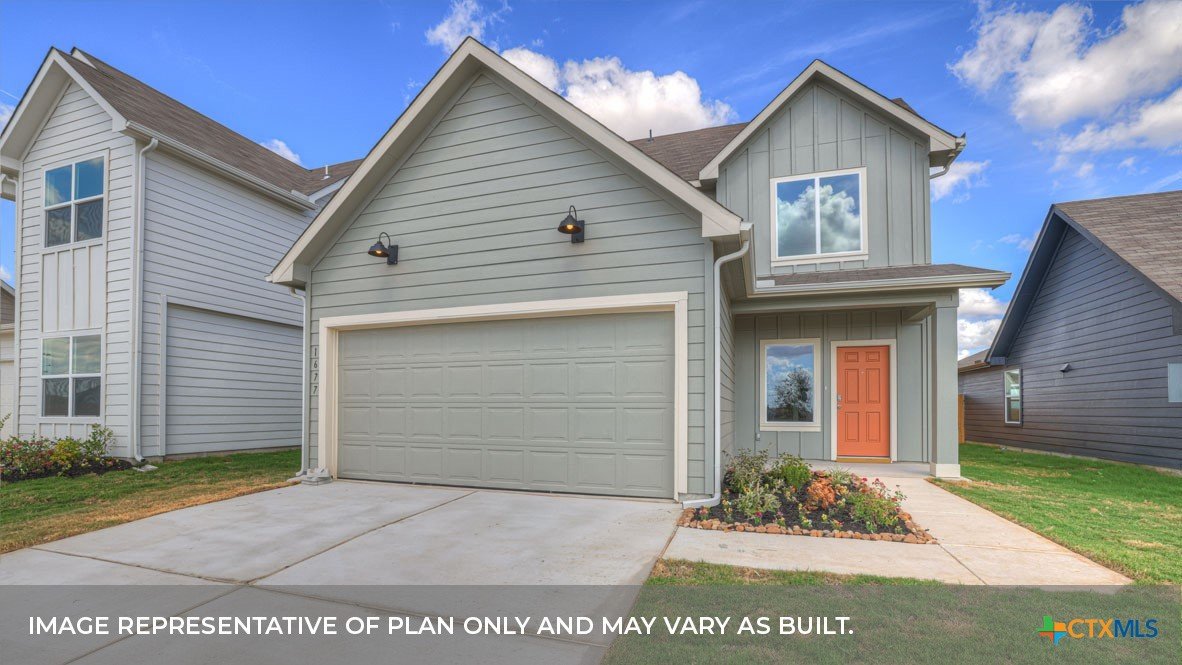 JUNE ESTIMATED COMPLETION. The Nicole is our largest floorplan available at our Saengerhalle Meadows community. This two-story home offers 4 bedrooms, 3 bathrooms, a gameroom, and 2 car garage all within 2,473 square feet of comfortable living space. Entering the home and find a short hallway to the downstairs secondary bedroom and a full bathroom. Passing the stairwell, continue through the foyer to the heart of the home, the living area. The family room, dining area, and kitchen are open, making entertaining and everyday living a shareable experience for family and friends. The kitchen features granite countertops, a large island with undermount sink, a corner pantry closet, stainless-steel appliances and 36’’ upper cabinets. Moving upstairs, you’ll enter the gameroom, the center of the upstairs space. The oversized primary bedroom is tucked away from the gameroom. Stretch out and relax at the end of your day in this spacious and private ensuite. The primary bathroom features a 5’ walk in shower, double sink vanity, separate toilet area with a door, and an enormous walk-in closet. This will be the closet of your dreams, spacious enough to add a dressing island or chaise lounge for a full luxurious experience. The additional upstairs bedrooms and bathroom are located opposite the primary bedroom. The bedrooms feature walk in closets with shelving. Both secondary bathrooms include a shower/tub combination. The utility room rounds out the upstairs space, making laundry chores a breeze. The Nicole includes vinyl flooring throughout the common areas of the home, and carpet in the bedrooms, gameroom and stairwell. All our new homes feature a covered back patio, full sod, an irrigation system in the front and back yard, and a 6’ privacy fence around the back yard. This home includes our America’s Smart Home base package, which includes the Amazon Echo Pop, Front Doorbell, Front Door Deadbolt Lock, Home Hub, Thermostat, and Deako® Smart Switches.