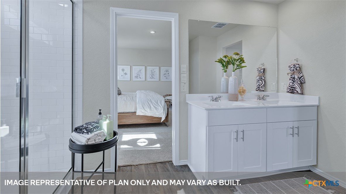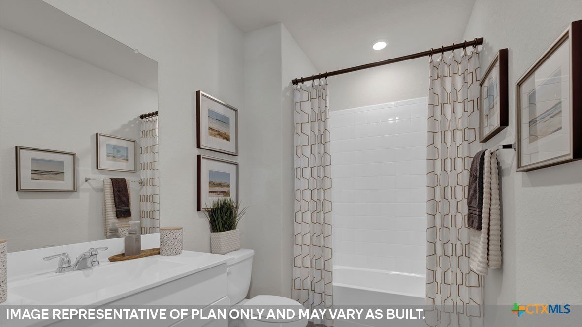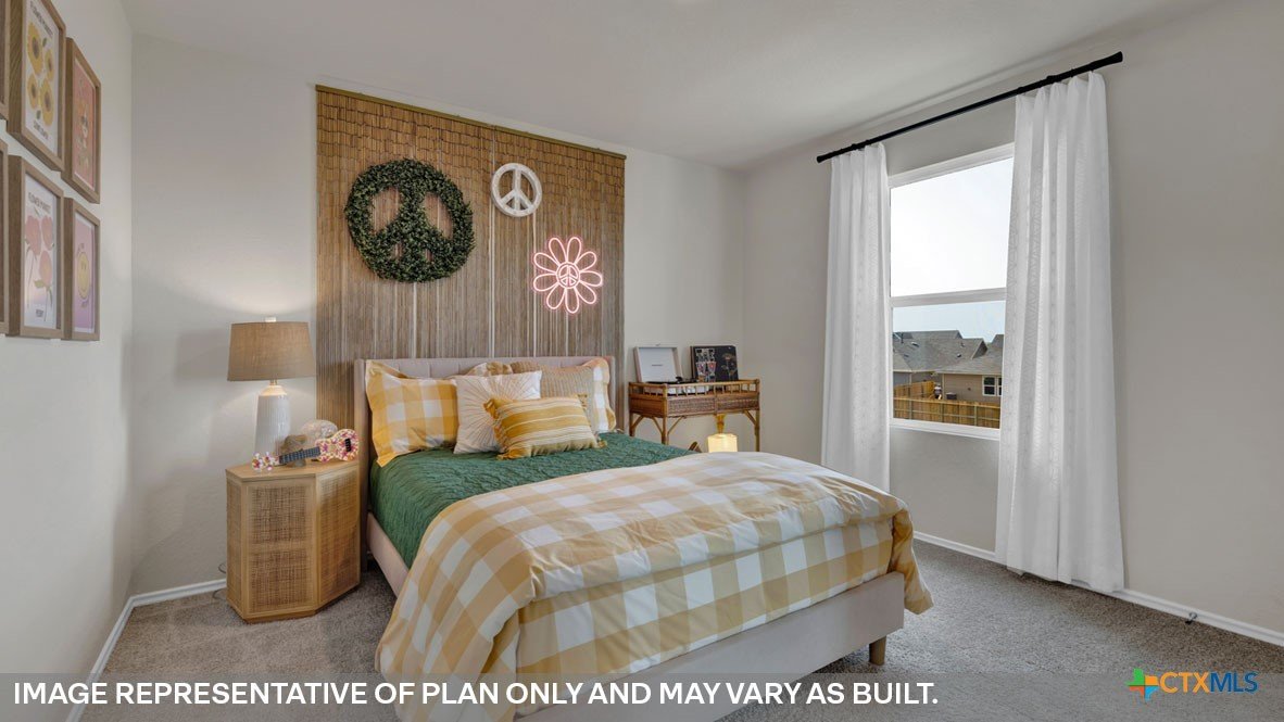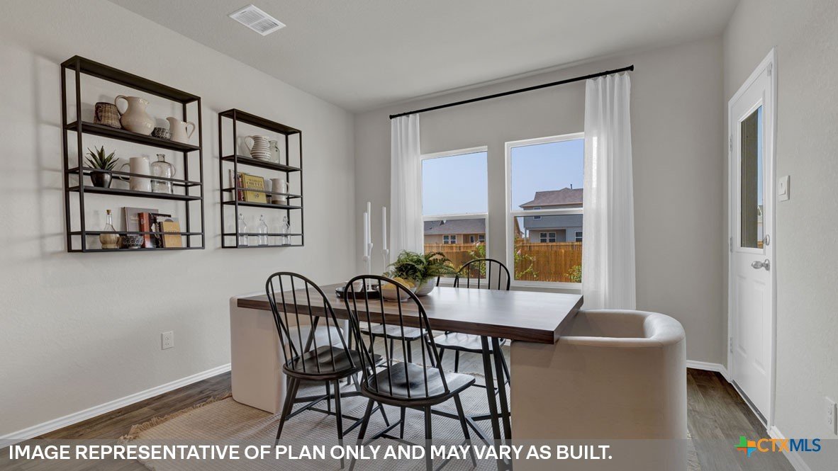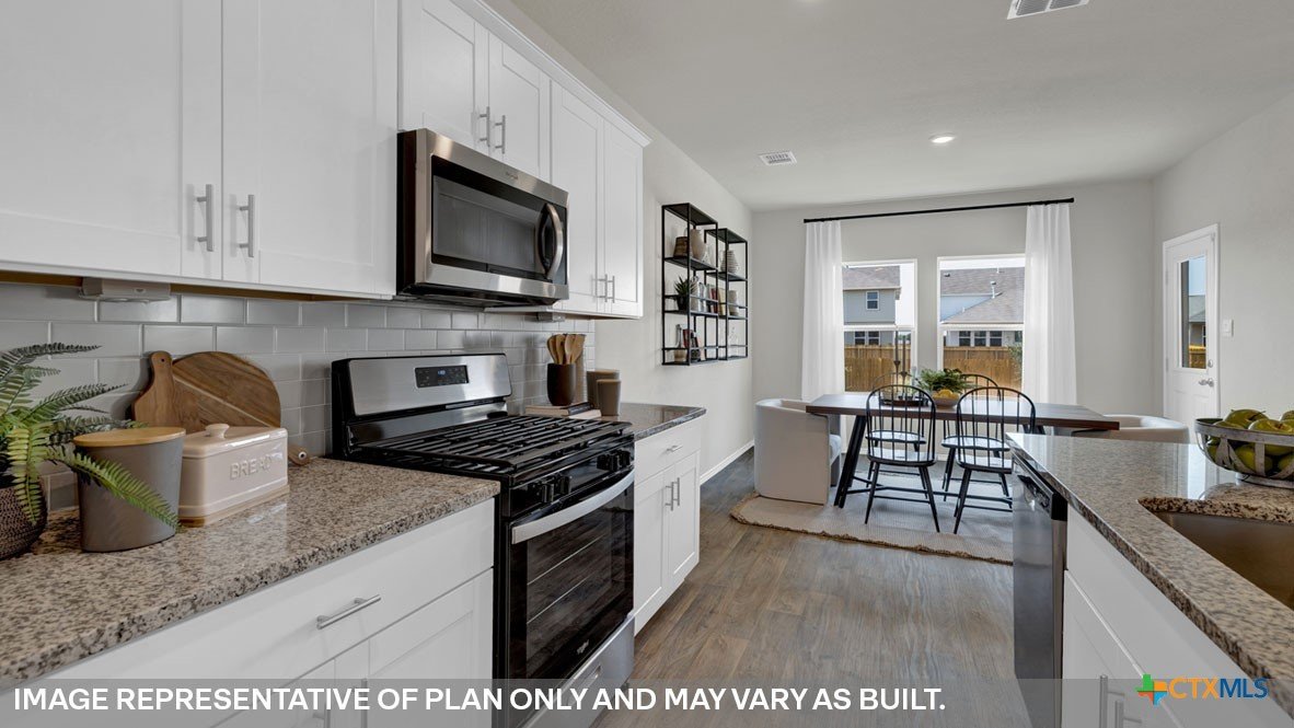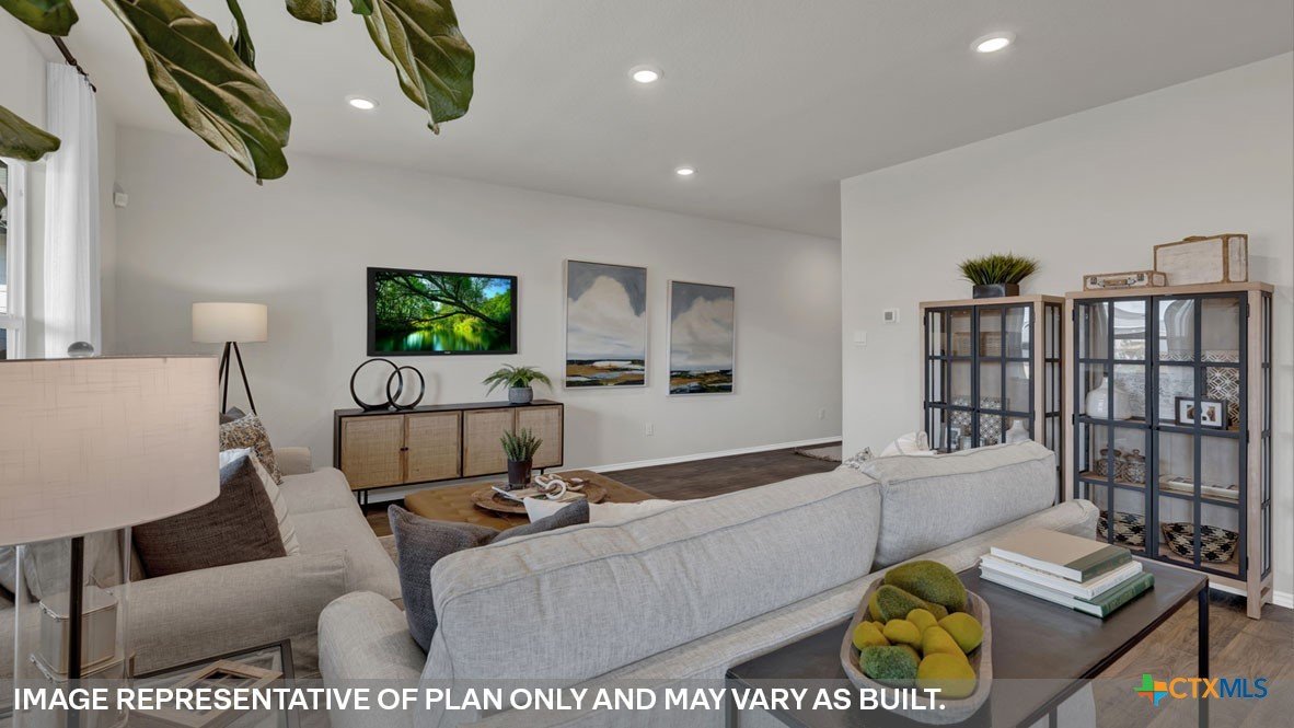 JUNE ESTIMATED COMPLETION. The Nicole is our largest floorplan available at our Saengerhalle Meadows community. This two-story home offers 4 bedrooms, 3 bathrooms, a gameroom, and 2 car garage all within 2,473 square feet of comfortable living space. Entering the home and find a short hallway to the downstairs secondary bedroom and a full bathroom. Passing the stairwell, continue through the foyer to the heart of the home, the living area. The family room, dining area, and kitchen are open, making entertaining and everyday living a shareable experience for family and friends. The kitchen features granite countertops, a large island with undermount sink, a corner pantry closet, stainless-steel appliances and 36’’ upper cabinets. Moving upstairs, you’ll enter the gameroom, the center of the upstairs space. The oversized primary bedroom is tucked away from the gameroom. Stretch out and relax at the end of your day in this spacious and private ensuite. The primary bathroom features a 5’ walk in shower, double sink vanity, separate toilet area with a door, and an enormous walk-in closet. This will be the closet of your dreams, spacious enough to add a dressing island or chaise lounge for a full luxurious experience. The additional upstairs bedrooms and bathroom are located opposite the primary bedroom. The bedrooms feature walk in closets with shelving. Both secondary bathrooms include a shower/tub combination. The utility room rounds out the upstairs space, making laundry chores a breeze. The Nicole includes vinyl flooring throughout the common areas of the home, and carpet in the bedrooms, gameroom and stairwell. All our new homes feature a covered back patio, full sod, an irrigation system in the front and back yard, and a 6’ privacy fence around the back yard. This home includes our America’s Smart Home base package, which includes the Amazon Echo Pop, Front Doorbell, Front Door Deadbolt Lock, Home Hub, Thermostat, and Deako® Smart Switches.